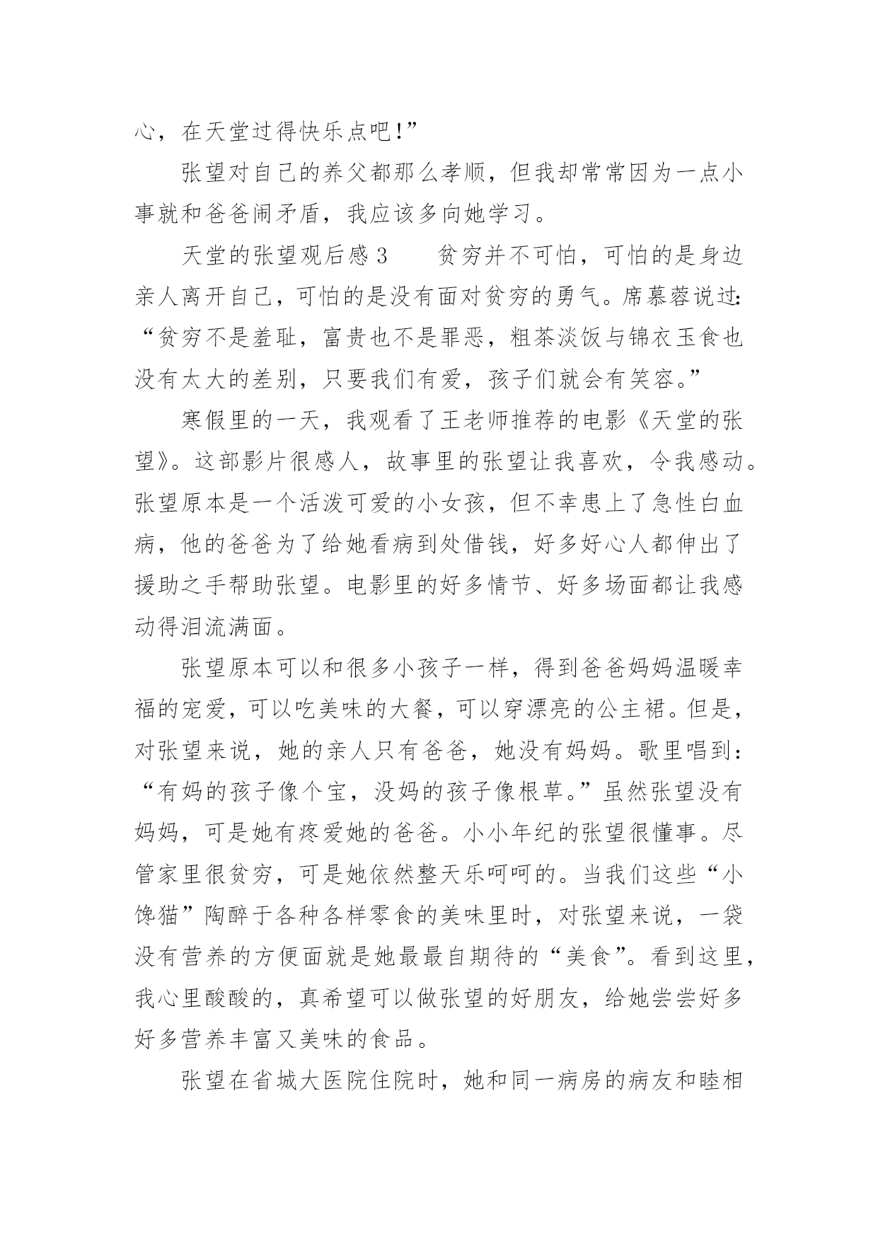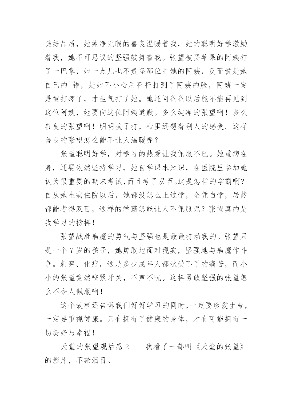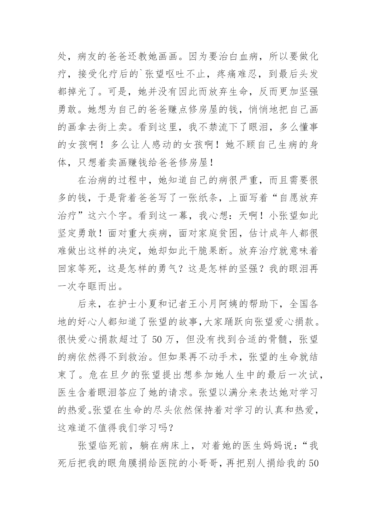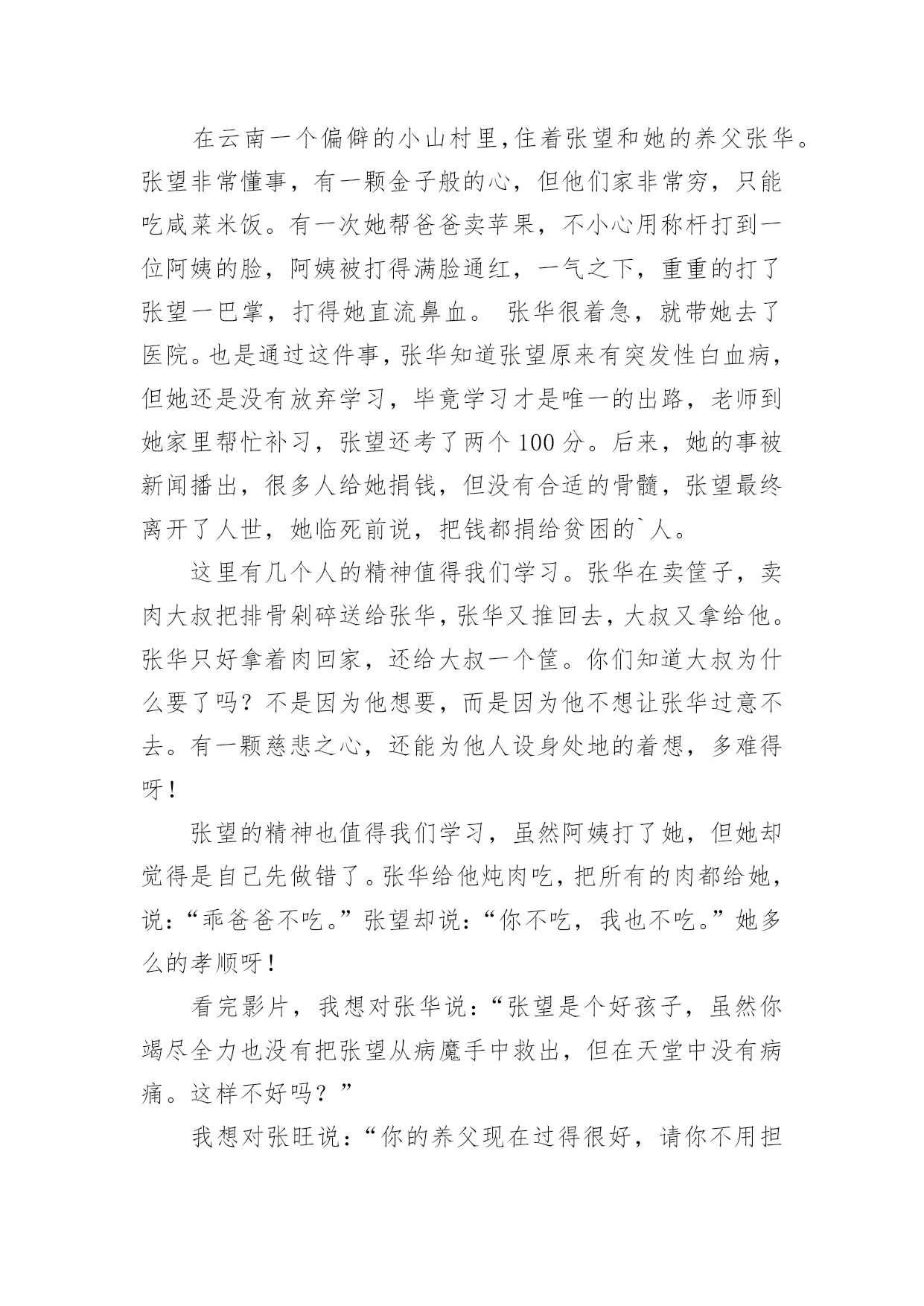 天堂的张望观后感最新天堂的张望观后感品味完一部作品后,想必你有不少可以分享的东西,不能光会看哦,写一篇观后感吧。那么你会写观后感吗?以下是小编为大家整理的最新天堂的张望观后感,希望对大家有所帮助。天堂的张望观后感1假期间我看了一部感人的电影——《天堂的张望》。影片主要讲述了张望短暂又坚强的一生。张望是一个被父亲捡来的孩子,她活泼可爱,既善良又懂事。7岁的她不幸患上了急性白血病,治病的费用是30万左右。而张望家穷得连屋子上的漏洞都补不起,张望的父亲只好借钱。村里每一家都借遍了,只借到一万多元,差的实在太远了。张望父亲冒险去向老板借钱,结果,不但没有借到钱,反而遭到了一顿毒打。张望父亲为了筹钱给张望治病,差点儿都把肾卖了。张望指导自己家很穷,也明白爸爸的难处,她决定放弃治疗。张望的故事深深地打动了护士小夏和报社记者小月。小月把张望的故事刊登在了报纸上,很多好心人看到了张望的故事,都纷纷捐款给张望。很快,张望的治疗费筹集够了。可是最后因为等不到匹配的骨髓,张望病情恶化,最终还是离开了世界。这部影片给我很多感触,最让我感动的就是张望身上的美好品质,她纯净无暇的善良温暖着我,她的聪明好学激励着我,她不可思议的坚强鼓舞着我。张望被买苹果的阿姨打了一巴掌,她一点儿也不责怪那位打她的阿姨,反而说是她自己的`错,是她不小心用秤杆打到了阿姨的脸,阿姨一定是被打疼了,才生气打了她。她还问爸爸以后能不能再见到这位阿姨,她要向这位阿姨道歉。多么纯净的张望啊!多么善良的张望啊!明明挨了打,心里还想着别人的感受。这样善良的张望怎么能不让人温暖呢?张望聪明好学,对学习的热爱让我佩服不已。她重病在身,还要依然坚持学习,她自学课本知识,在医院里参加她认为很重要的期末考试,而且考了双百。这是怎样的学霸啊?自从她生病住院以后,她都没怎么上过学,全凭自学,居然都能考得双百,这样的学霸怎能让人不佩服呢?张望真的是我学习的榜样!张望战胜病魔的勇气与坚强也是最最打动我的。张望只是一个7岁的孩子,她勇敢地面对现实,坚强地与病魔作斗争。刺穿、化疗,这是多少成年人都承受不了的痛苦,而小小的张望竟然咬紧牙关,不声不吭。这样勇敢坚强的张望怎么不令人佩服啊!这个故事还告诉我们好好学习的同时,一定要珍爱生命,一定要重视健康。只有拥有了健康的身体,才有可能拥有一切美好与幸福!天堂的张望观后感2我看了一部叫《天堂的张望》的影片,不禁泪目。在云南一个偏僻的小山村里,住着张望和她的养父张华。张望非常懂事,有一颗金子般的心,但他们家非常穷,只能吃咸菜米饭。有一次她帮爸爸卖苹果,不小心用称杆打到一位阿姨的脸,阿姨被打得满脸通红,一气之下,重重的打了张望一巴掌,打得她直流鼻血。张华很着急,就带她去了医院。也是通过这件事,张华知道张望原来有突发性白血病,但她还是没有放弃学习,毕竟学习才是唯一的出路,老师到她家里帮忙补习,张望还考了两个100分。后来,她的事被新闻播出,很多人给她捐钱,但没有合适的骨髓,张望最终离开了人世,她临死前说,把钱都捐给贫困的`人。这里有几个人的精神值得我们学习。张华在卖筐子,卖肉大叔把排骨剁碎送给张华,张华又推回去,大叔又拿给他。张华只好拿着肉回家,还给大叔一个筐。你们知道大叔为什么要了吗?不是因为他想要,而是因为他不想让张华过意不去。有一颗慈悲之心,还能为他人设身处地的着想,多难得呀!张望的精神也值得我们学习,虽然阿姨打了她,但她却觉得是自己先做错了。张华给他炖肉吃,把所有的肉都给她,说:“乖爸爸不吃。”张望却说:“你不吃,我也不吃。”她多么的孝顺呀!看完影片,我想对张华说:“张望是个好孩子,虽然你竭尽全力也没有把张望从病魔手中救出,但在天堂中没有病痛。这样不好吗?”我想对张旺说:“你的养父现在过得很好,请你不用担心,在天堂过得快乐点吧!”张望对自己的养父都那么孝顺,但我却常常因为一点小事就和爸爸闹矛盾,我应该多向她学习。天堂的张望观后感3贫穷并不可怕,可怕的是身边亲人离开自己,可怕的是没有面对贫穷的勇气。席慕蓉说过:“贫穷不是羞耻,富贵也不是罪恶,粗茶淡饭与锦衣玉食也没有太大的差别,只要我们有爱,孩子们就会有笑容。”寒假里的一天,我观看了王老师推荐的电影《天堂的张望》。这部影片很感人,故事里的张望让我喜欢,令我感动。张望原本是一个活泼可爱的小女孩,但不幸患上了急性白血病,他的爸爸为了给她看病到处借钱,好多好心人都伸出了援助之手帮助张望。电影里的好多情节、好多场面都让我感动得泪流满面。张望原本可以和很多小孩子一样,得到爸爸妈妈温暖幸福的宠爱,可以吃美味的大餐,可以穿漂亮的公主裙。但是,对张望来说,她的亲人只有爸爸,她没有妈妈。歌里唱到:“有妈的孩子像个宝,没妈的孩子像根草。”虽然张望没有妈妈,可是她有疼爱她的爸爸。小小年纪的张望很懂事。尽管家里很贫穷,可是她依然整天乐呵呵的
