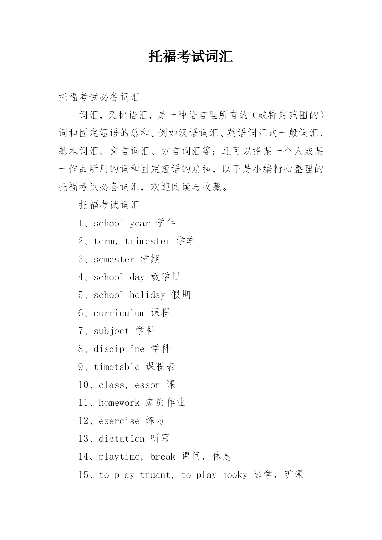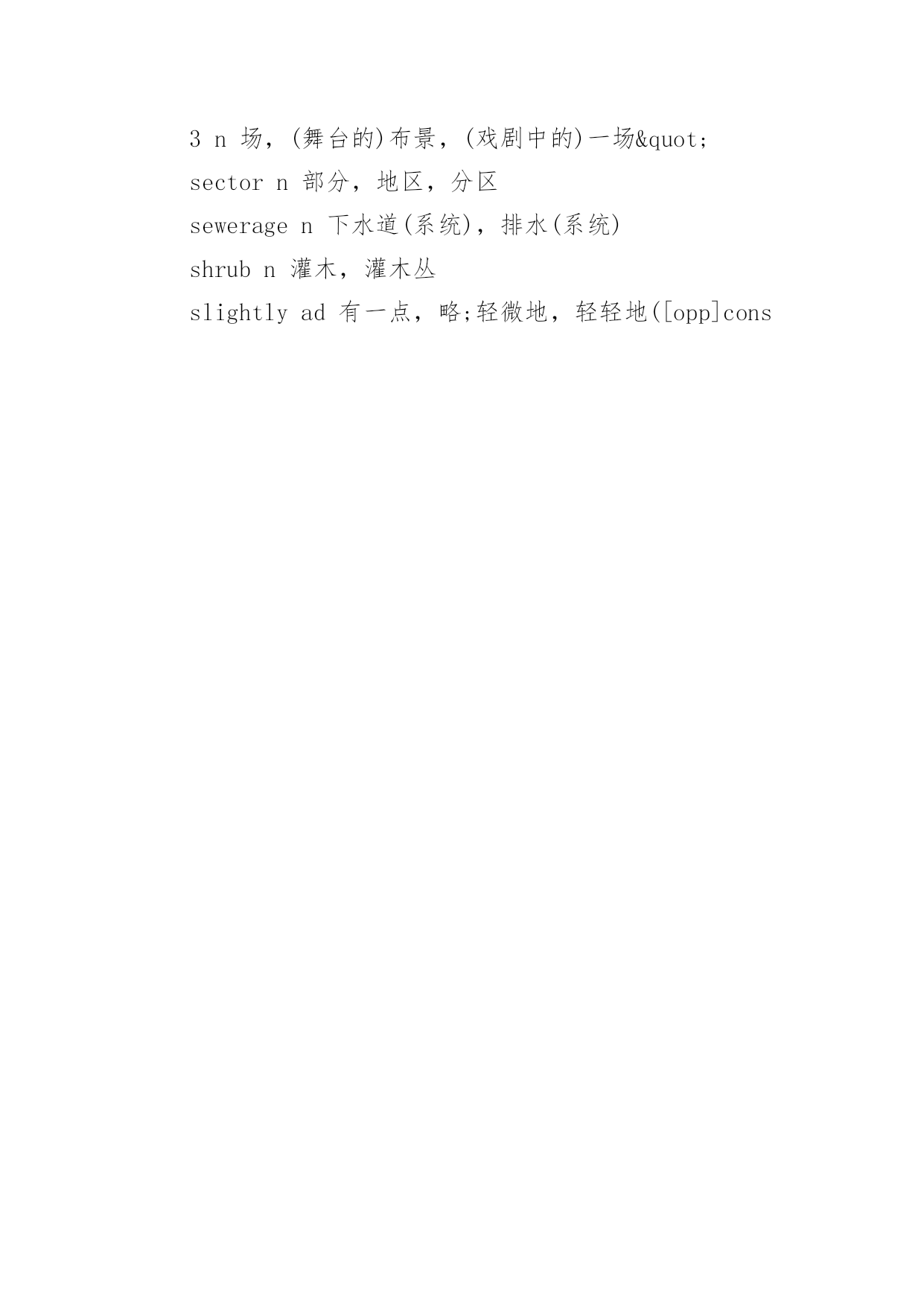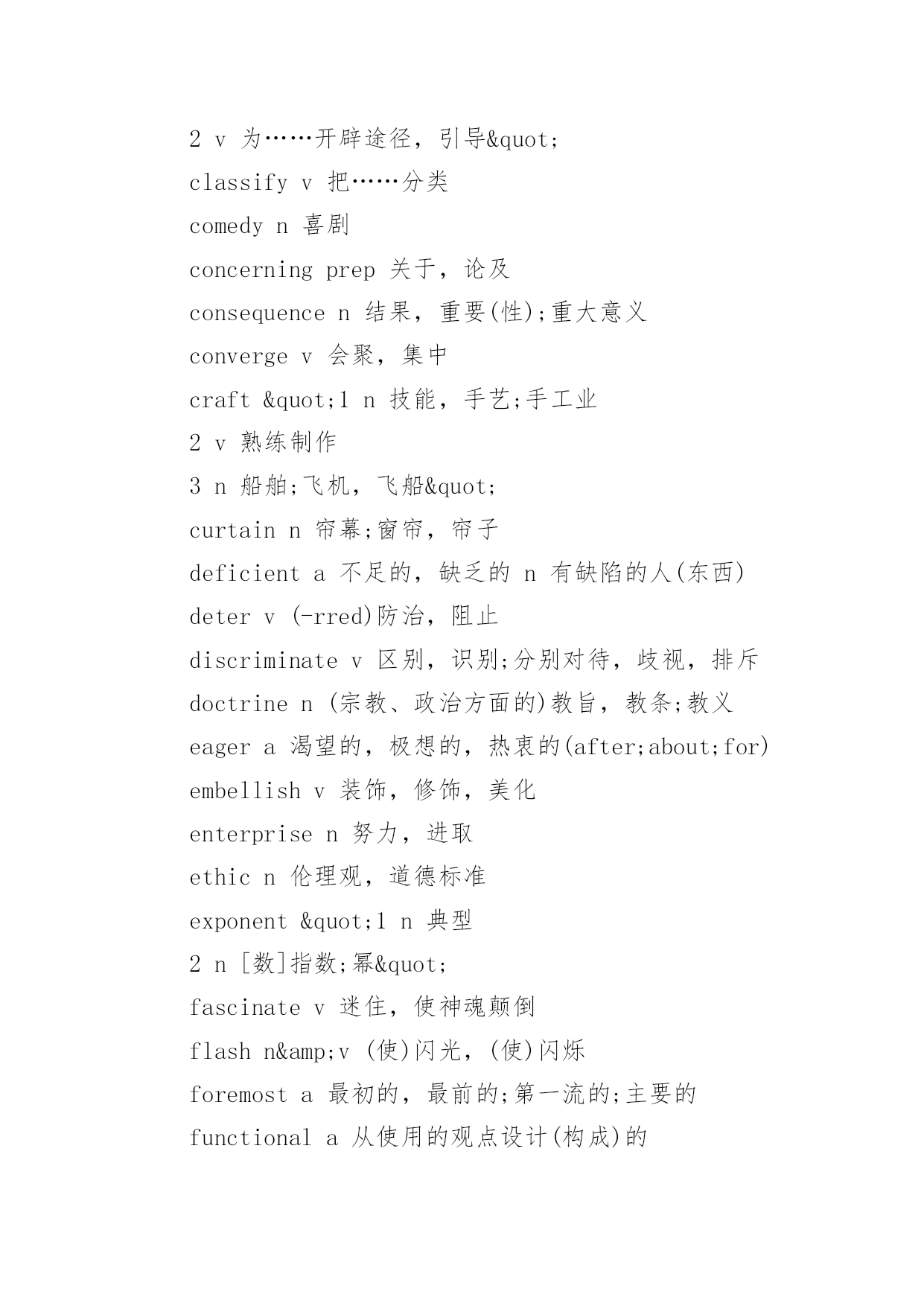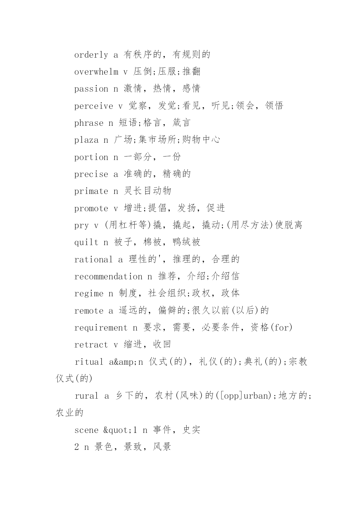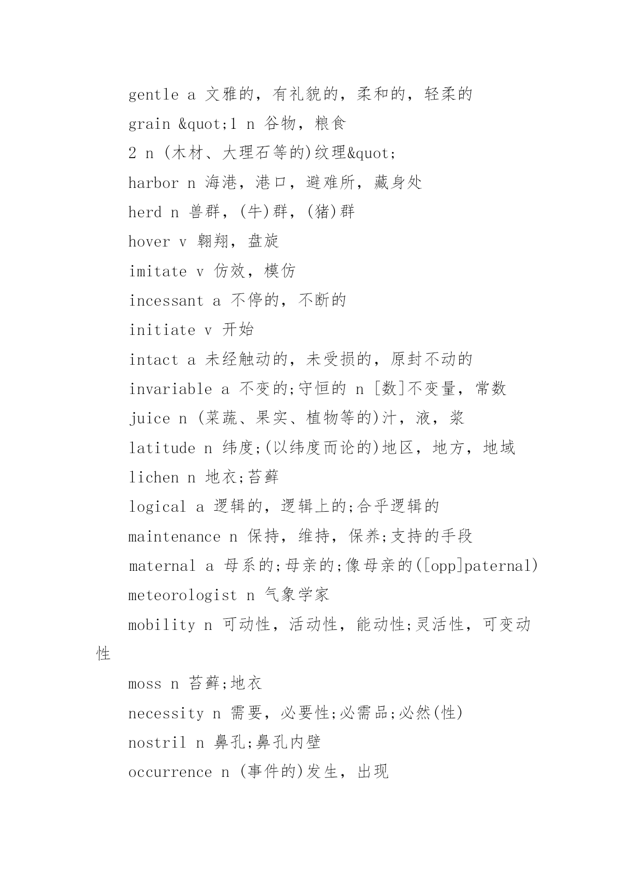 词汇托福考试词汇托福考试托福考试词汇是必须要掌握的,但是众所周知雅思阅读词汇量大,范围相当广泛。以下是网小编整理的关于托福考试重点词汇总结,供大家备考。单词释义abhorv(-horred;-horring)憎恶,厌恶,嫌弃accusev控告(告发)某人犯某罪(of);把谋事归罪于某人(for)advocaten拥护者,鼓吹者,提倡者v拥护;鼓吹;提倡;主张;辩护ambitionn抱负,志气,雄心approximatelyad近似,约计assertv主张,硬说;断言,声明awarea[用作表语]知道,晓得,发觉,觉得basementn建筑物的底部,[建筑]底层;地下室biologistn生物学者bouncev弹起,反跳,弹回bulkn体积,容积,大小canaln运河;沟渠categoryn类型,种类channel"1n水道,渠,沟2v为……开辟途径,引导"classifyv把……分类comedyn喜剧concerningprep关于,论及consequencen结果,重要(性);重大意义convergev会聚,集中craft"1n技能,手艺;手工业2v熟练制作3n船舶;飞机,飞船"curtainn帘幕;窗帘,帘子deficienta不足的,缺乏的n有缺陷的人(东西)deterv(-rred)防治,阻止discriminatev区别,识别;分别对待,歧视,排斥doctrinen(宗教、政治方面的)教旨,教条;教义eagera渴望的,极想的,热衷的(after;about;for)embellishv装饰,修饰,美化enterprisen努力,进取ethicn伦理观,道德标准exponent"1n典型2n[数]指数;幂"fascinatev迷住,使神魂颠倒flashn&v(使)闪光,(使)闪烁foremosta最初的,最前的;第一流的;主要的functionala从使用的观点设计(构成)的gentlea文雅的,有礼貌的,柔和的,轻柔的grain"1n谷物,粮食2n(木材、大理石等的)纹理"harborn海港,港口,避难所,藏身处herdn兽群,(牛)群,(猪)群hoverv翱翔,盘旋imitatev仿效,模仿incessanta不停的,不断的initiatev开始intacta未经触动的,未受损的,原封不动的invariablea不变的;守恒的n[数]不变量,常数juicen(菜蔬、果实、植物等的)汁,液,浆latituden纬度;(以纬度而论的)地区,地方,地域lichenn地衣;苔藓logicala逻辑的,逻辑上的;合乎逻辑的maintenancen保持,维持,保养;支持的手段maternala母系的;母亲的;像母亲的([opp]paternal)meteorologistn气象学家mobilityn可动性,活动性,能动性;灵活性,可变动性mossn苔藓;地衣necessityn需要,必要性;必需品;必然(性)nostriln鼻孔;鼻孔内壁occurrencen(事件的)发生,出现orderlya有秩序的,有规则的overwhelmv压倒;压服;推翻passionn激情,热情,感情perceivev觉察,发觉;看见,听见;领会,领悟phrasen短语;格言,箴言plazan广场;集市场所;购物中心portionn一部分,一份precisea准确的,精确的primaten灵长目动物promotev增进;提倡,发扬,促进pryv(用杠杆等)撬,撬起,撬动;(用尽方法)使脱离quiltn被子,棉被,鸭绒被rationala理性的',推理的,合理的recommendationn推荐,介绍;介绍信regimen制度,社会组织;政权,政体remotea遥远的,偏僻的;很久以前(以后)的requirementn要求,需要,必要条件,资格(for)retractv缩进,收回rituala&n仪式(的),礼仪(的);典礼(的);宗教仪式(的)rurala乡下的,农村(风味)的([opp]urban);地方的;农业的scene"1n事件,史实2n景色,景致,风景3n场,(舞台的)布景,(戏剧中的)一场"sectorn部分,地区,分区seweragen下水道(系统),排水(系统)shrubn灌木,灌木丛slightlyad有一点,略;轻微地,轻轻地([opp]cons