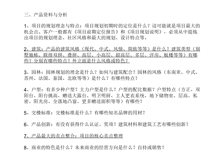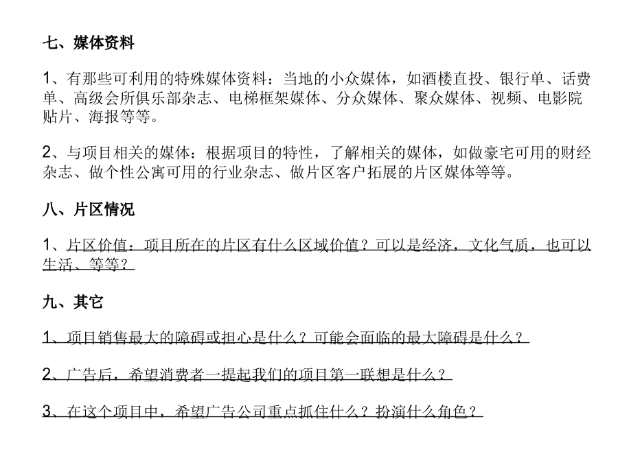 问卷及资料整理一、项目基本资料项目容积率、建筑密度、绿化率、总户数、车位比、商业面积是多少?二、营销层面的资料与分析1、销售任务:2011年要完成的销售任务是多少?我们项目的愿景是什么?2、售价:项目销售均价是多少?各类不同物业类型的售价分别是多少?定价策略是什么?3、推盘节奏与策略:项目分阶段的推盘节奏是如何安排?每个阶段的推售量是多少?销售策略是什么?4、挑战与难点分析:项目的硬伤是什么?每个阶段的要面临的销售难点是什么?是溢价的要求?还是销售速度的要求?只有找对了问题,才有可能发展正确的广告策略。三、产品资料与分析1、项目的规划理念与特点:项目规划初期时的定位是什么?这可能就是项目最大的机会点。客户一般都有《项目前期定位报告》和《项目规划说明》,必须从中提炼出项目的规划理念、社区风格和最大的规划、设计特点等。2、建筑:产品的建筑风格(现代、中式、风情、简欧等等)是什么?建筑类型(别墅独栋、联排双拼、叠拼、高层、小高层、超高层、多层、洋房、板楼等等)有哪些?分别有哪些特点?外立面是什么风格或特色?3、园林:园林规划的理念是什么?如何与建筑配合?园林的风格(东南亚、中式、苏州、法国、泰国、北欧等等)是什么?有哪些特点?4、户型:有多少种户型?主力户型是什么?户型的配比数据?户型特点(方正、双阳台、阳台挑高、赠送大露台、明卫明厨、主人更衣系统、地下储物室、层高、私密、阳光房、全落地凸窗、更多赠送面积等等)有哪些?5、交楼标准:交楼标准是什么?有哪些知名品牌的用材?6、产品创新:有没有获得什么认证、奖项?建筑材料和建筑工艺有哪些创新?7、产品最大的卖点整合:项目的核心卖点整理8、商业的特色是什么?未来商业的经营方向是什么?自持或销售?四、消费者资料与分析1、目标客户的基本资料:物理属性层面的分析:年龄、家庭组成、职业、居住区域、工作区域、家庭收入等等。2、心理特点描述:目标客户的性格特点、心理特点、社会特点等等。3、相关洞察:找到目标消费者的人性洞察和写真。五、竞争市场资料与分析1、竞争对手基本资料:有哪些竞争楼盘?像了解本项目一样了解竞争对手的基础资料。2、竞争对手的卖点分析:对手卖什么?与我们相比,各自的优势与弱势分别是什么?3、竞争对手的主要诉求:在广告传播上,竞争对手在讲什么?做什么活动?六、合作团队资料1、合作团队的基本资料:规划公司、园林公司、代理公司(全程代理、营销顾问)、建筑公司等等。2、合作团队主创设计师的资料背景:有些大师是可以用来支持项目卖多点钱的。七、媒体资料1、有那些可利用的特殊媒体资料:当地的小众媒体,如酒楼直投、银行单、话费单、高级会所俱乐部杂志、电梯框架媒体、分众媒体、聚众媒体、视频、电影院贴片、海报等等。2、与项目相关的媒体:根据项目的特性,了解相关的媒体,如做豪宅可用的财经杂志、做个性公寓可用的行业杂志、做片区客户拓展的片区媒体等等。八、片区情况1、片区价值:项目所在的片区有什么区域价值?可以是经济,文化气质,也可以生活、等等?九、其它1、项目销售最大的障碍或担心是什么?可能会面临的最大障碍是什么?2、广告后,希望消费者一提起我们的项目第一联想是什么?3、在这个项目中,希望广告公司重点抓住什么?扮演什么角色?