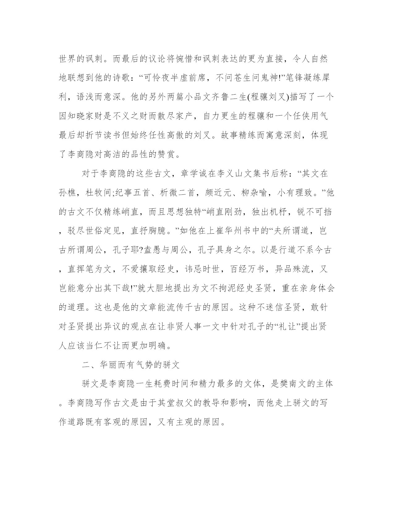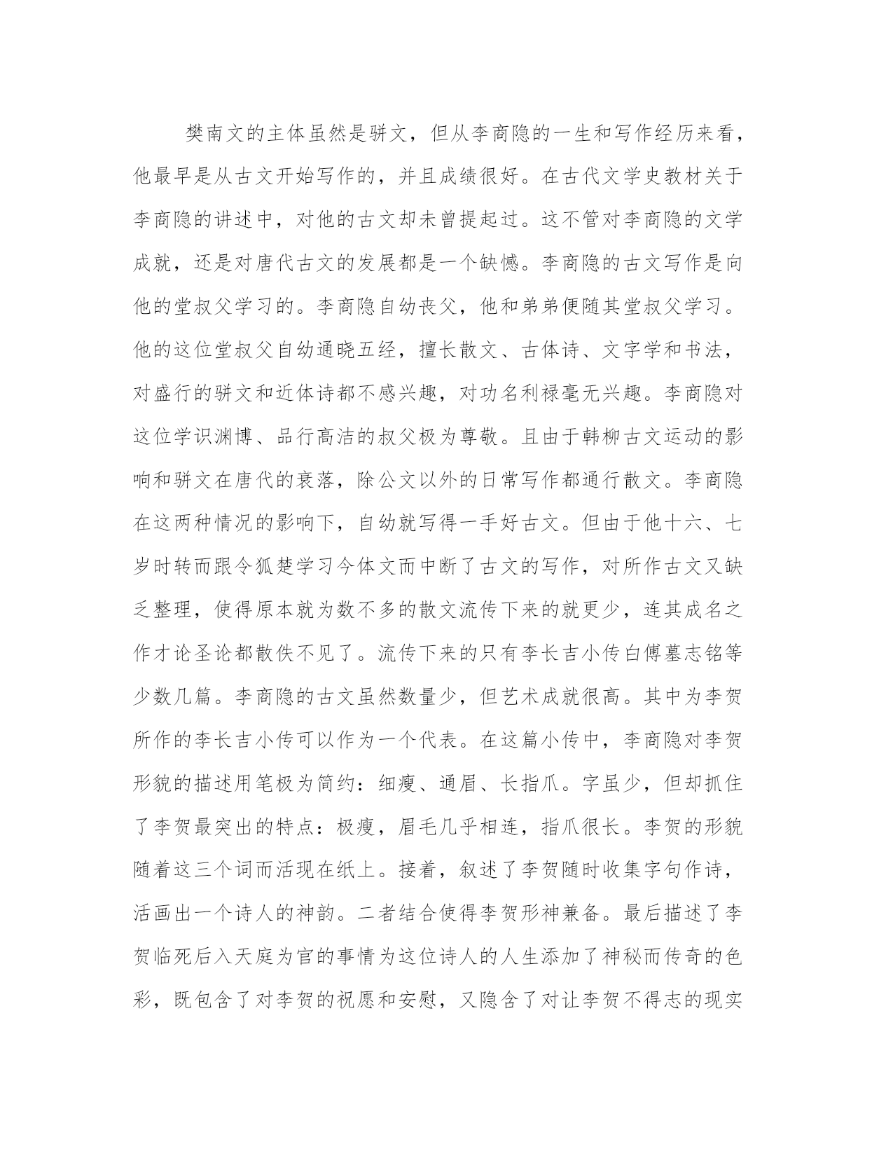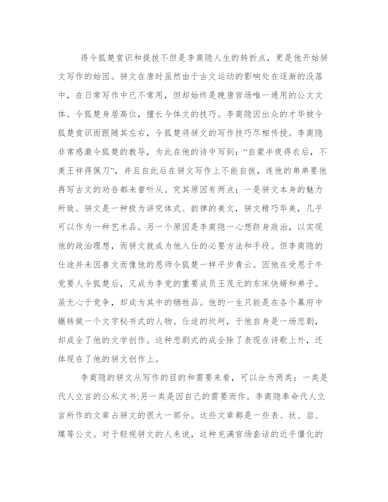 李商隐的文章艺术李商隐,字义山,号玉溪生,又号樊南生,怀州河内人。“或言英国公世积之孙”,他也自称“我系本王孙”。然而,源自皇室的尊贵血统并没有让他的人生仕途一帆风顺。他身怀经世治国的雄心大志,然而仕途不顺,虽早年得到朝廷重臣令狐楚的赏识,“奇其文,使与诸子游”,又“岁给资装,令随计上都”,后又得王茂元喜爱,成为爱婿。由于令狐楚、王茂元二人各为牛李两党要人,处于二者之间的李商隐虽无心党争却无辜受累,导致其一生都在各个幕府间以幕僚的身份辗转流徙,“名宦不进,坎坷终身”,满腹经纶终只是“为他人作嫁衣裳”。他虽两次入京为官,但秘书省校书郎和太学博士与他在幕府中担任掌书记的工作并没有什么区别。他以文入仕,以文终仕。他将不得志的苦闷愁情倾泻在所写的文章中,一生写了无数的文章,却大半“火灼墨污,半有堕落”。但他的文章带有他个人的生命痕迹和独特的艺术魅力,成为他艺术生命的重要成分,值得后人仔细分析。李商隐的文章大部分是骈文,是他在幕僚生涯中应他人要求或出于自己的需要而创作的;而他的古文只有极少数,但“樊南生十六,能著才论圣论,以古文出诸公间”,所以古文也具有很重的分量。但历代以来的分析者大都重诗而轻文,造成后人只知有“玉溪诗”而不知有“樊南文”的状况。一、刚劲、独特的散文(古文)樊南文的主体虽然是骈文,但从李商隐的一生和写作经历来看,他最早是从古文开始写作的,并且成绩很好。在古代文学史教材关于李商隐的讲述中,对他的古文却未曾提起过。这不管对李商隐的文学成就,还是对唐代古文的发展都是一个缺憾。李商隐的古文写作是向他的堂叔父学习的。李商隐自幼丧父,他和弟弟便随其堂叔父学习。他的这位堂叔父自幼通晓五经,擅长散文、古体诗、文字学和书法,对盛行的骈文和近体诗都不感兴趣,对功名利禄毫无兴趣。李商隐对这位学识渊博、品行高洁的叔父极为尊敬。且由于韩柳古文运动的影响和骈文在唐代的衰落,除公文以外的日常写作都通行散文。李商隐在这两种情况的影响下,自幼就写得一手好古文。但由于他十六、七岁时转而跟令狐楚学习今体文而中断了古文的写作,对所作古文又缺乏整理,使得原本就为数不多的散文流传下来的就更少,连其成名之作才论圣论都散佚不见了。流传下来的只有李长吉小传白傅墓志铭等少数几篇。李商隐的古文虽然数量少,但艺术成就很高。其中为李贺所作的李长吉小传可以作为一个代表。在这篇小传中,李商隐对李贺形貌的描述用笔极为简约:细瘦、通眉、长指爪。字虽少,但却抓住了李贺最突出的特点:极瘦,眉毛几乎相连,指爪很长。李贺的形貌随着这三个词而活现在纸上。接着,叙述了李贺随时收集字句作诗,活画出一个诗人的神韵。二者结合使得李贺形神兼备。最后描述了李贺临死后入天庭为官的事情为这位诗人的人生添加了神秘而传奇的色彩,既包含了对李贺的祝愿和安慰,又隐含了对让李贺不得志的现实世界的讽刺。而最后的议论将惋惜和讽刺表达的更为直接,令人自然地联想到他的诗歌:“可怜夜半虚前席,不问苍生问鬼神!”笔锋凝练犀利,语浅而意深。他的另外两篇小品文齐鲁二生(程骧刘叉)描写了一个因知晓家财是不义之财而散尽家产,自力更生的程骧和一个任侠用气最后却折节读书但始终任性高傲的刘叉。故事精练而寓意深刻,体现了李商隐对高洁的品性的赞赏。对于李商隐的这些古文,章学诚在李义山文集书后称:“其文在孙樵,杜牧间;纪事五首、析微二首,颇近元、柳杂喻,小有理致。”他的古文不仅精练峭直,而且思想独特“峭直刚劲,独出机杼,锐不可挡,驳尽世俗定见,直抒胸臆。”如他在上崔华州书中的“夫所谓道,岂古所谓周公,孔子耶?盍愚与周公,孔子具身之尔。以是行道不系今古,直挥笔为文,不爱攘取经史,讳忌时世,百经万书,异品殊流,又岂能意分出其下哉!”就大胆地提出为文不拘泥经史圣贤,重在亲身体会的道理。这也是他的文章能流传千古的原因。这种不迷信圣贤,敢针对圣贤提出异议的观点在让非贤人事一文中针对孔子的“礼让”提出贤人应该当仁不让而更加明确。二、华丽而有气势的骈文骈文是李商隐一生耗费时间和精力最多的文体,是樊南文的主体。李商隐写作古文是由于其堂叔父的教导和影响,而他走上骈文的写作道路既有客观的原因,又有主观的原因。得令狐楚赏识和提拔不但是李商隐人生的转折点,更是他开始骈文写作的始因。骈文在唐时虽然由于古文运动的影响处在逐渐的没落中,在日常写作中已不常用,但却始终是晚唐官场唯一通用的公文文体。令狐楚身居高位,擅长今体文的技巧。李商隐因出众的才华被令狐楚赏识而跟随其左右,令狐楚将骈文的写作技巧尽相传授。李商隐非常感激令狐楚的教导,为此在他的诗中写到:“自蒙半夜得衣后,不羡王祥得佩刀”,并且自此后在骈文写作上不能自拔,连他的弟弟要他再写古文的劝告都未曾听从。究其原因有两点:一是骈文本身的魅力所致。骈文是一种极为讲究体式、韵律的美文,骈文精巧华美,几乎可以作为一种艺
