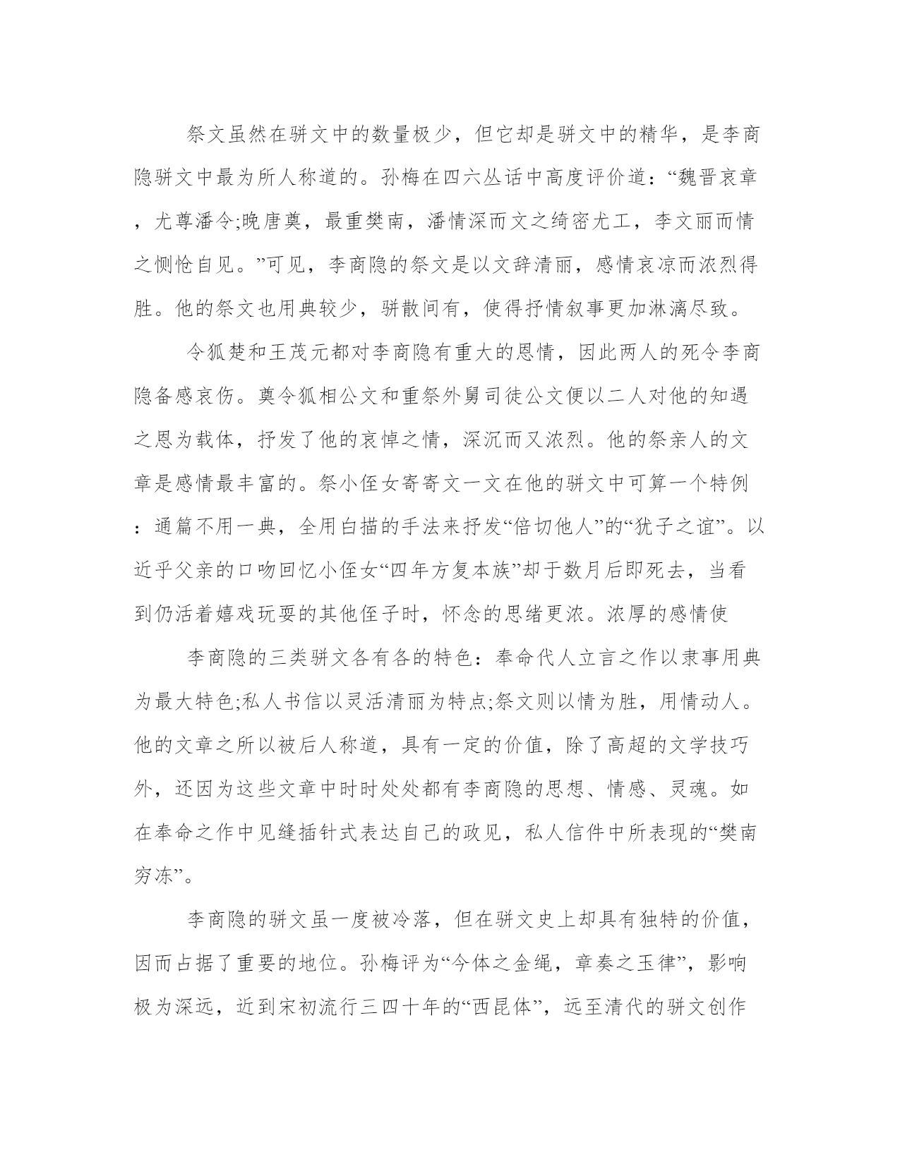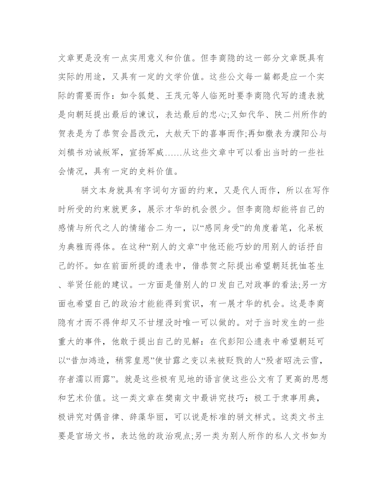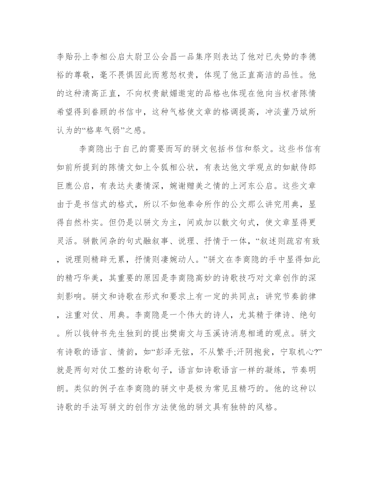 李商隐的文章艺术李商隐,字义山,号玉溪生,又号樊南生,怀州河内人。“或言英国公世积之孙”,他也自称“我系本王孙”。然而,源自皇室的尊贵血统并没有让他的人生仕途一帆风顺。他身怀经世治国的雄心大志,然而仕途不顺,虽早年得到朝廷重臣令狐楚的赏识,“奇其文,使与诸子游”,又“岁给资装,令随计上都”,后又得王茂元喜爱,成为爱婿。由于令狐楚、王茂元二人各为牛李两党要人,处于二者之间的李商隐虽无心党争却无辜受累,导致其一生都在各个幕府间以幕僚的身份辗转流徙,“名宦不进,坎坷终身”,满腹经纶终只是“为他人作嫁衣裳”。他虽两次入京为官,但秘书省校书郎和太学博士与他在幕府中担任掌书记的工作并没有什么区别。他以文入仕,以文终仕。他将不得志的苦闷愁情倾泻在所写的文章中,一生写了无数的文章,却大半“火灼墨污,半有堕落”。但他的文章带有他个人的生命痕迹和独特的艺术魅力,成为他艺术生命的重要成分,值得后人仔细分析。李商隐的文章大部分是骈文,是他在幕僚生涯中应他人要求或出于自己的需要而创作的;而他的古文只有极少数,但“樊南生十六,能著才论圣论,以古文出诸公间”,所以古文也具有很重的分量。但历代以来的分析者大都重诗而轻文,造成后人只知有“玉溪诗”而不知有“樊南文”的状况。一、刚劲、独特的散文(古文)樊南文的主体虽然是骈文,但从李商隐的一生和写作经历来看,他最早是从古文开始写作的,并且成绩很好。在古代文学史教材关于李商隐的讲述中,对他的古文却未曾提起过。这不管对李商隐的文学成就,还是对唐代古文的发展都是一个缺憾。李商隐的古文写作是向他的堂叔父学习的。李商隐自幼丧父,他和弟弟便随其堂叔父学习。他的这位堂叔父自幼通晓五经,擅长散文、古体诗、文字学和书法,对盛行的骈文和近体诗都不感兴趣,对功名利禄毫无兴趣。李商隐对这位学识渊博、品行高洁的叔父极为尊敬。且由于韩柳古文运动的影响和骈文在唐代的衰落,除公文以外的日常写作都通行散文。李商隐在这两种情况的影响下,自幼就写得一手好古文。但由于他十六、七岁时转而跟令狐楚学习今体文而中断了古文的写作,对所作古文又缺乏整理,使得原本就为数不多的散文流传下来的就更少,连其成名之作才论圣论都散佚不见了。流传下来的只有李长吉小传白傅墓志铭等少数几篇。李商隐的古文虽然数量少,但艺术成就很高。其中为李贺所作的李长吉小传可以作为一个代表。在这篇小传中,李商隐对李贺形貌的描述用笔极为简约:细瘦、通眉、长指爪。字虽少,但却抓住了李贺最突出的特点:极瘦,眉毛几乎相连,指爪很长。李贺的形貌随着这三个词而活现在纸上。接着,叙述了李贺随时收集字句作诗,活画出一个诗人的神韵。二者结合使得李贺形神兼备。最后描述了李贺临死后入天庭为官的事情为这位诗人的人生添加了神秘而传奇的色彩,既包含了对李贺的祝愿和安慰,又隐含了对让李贺不得志的现实世界的讽刺。而最后的议论将惋惜和讽刺表达的更为直接,令人自然地联想到他的诗歌:“可怜夜半虚前席,不问苍生问鬼神!”笔锋凝练犀利,语浅而意深。他的另外两篇小品文齐鲁二生(程骧刘叉)描写了一个因知晓家财是不义之财而散尽家产,自力更生的程骧和一个任侠用气最后却折节读书但始终任性高傲的刘叉。故事精练而寓意深刻,体现了李商隐对高洁的品性的赞赏。对于李商隐的这些古文,章学诚在李义山文集书后称:“其文在孙樵,杜牧间;纪事五首、析微二首,颇近元、柳杂喻,小有理致。”他的古文不仅精练峭直,而且思想独特“峭直刚劲,独出机杼,锐不可挡,驳尽世俗定见,直抒胸臆。”如他在上崔华州书中的“夫所谓道,岂古所谓周公,孔子耶?盍愚与周公,孔子具身之尔。以是行道不系今古,直挥笔为文,不爱攘取经史,讳忌时世,百经万书,异品殊流,又岂能意分出其下哉!”就大胆地提出为文不拘泥经史圣贤,重在亲身体会的道理。这也是他的文章能流传千古的原因。这种不迷信圣贤,敢针对圣贤提出异议的观点在让非贤人事一文中针对孔子的“礼让”提出贤人应该当仁不让而更加明确。二、华丽而有气势的骈文骈文是李商隐一生耗费时间和精力最多的文体,是樊南文的主体。李商隐写作古文是由于其堂叔父的教导和影响,而他走上骈文的写作道路既有客观的原因,又有主观的原因。得令狐楚赏识和提拔不但是李商隐人生的转折点,更是他开始骈文写作的始因。骈文在唐时虽然由于古文运动的影响处在逐渐的没落中,在日常写作中已不常用,但却始终是晚唐官场唯一通用的公文文体。令狐楚身居高位,擅长今体文的技巧。李商隐因出众的才华被令狐楚赏识而跟随其左右,令狐楚将骈文的写作技巧尽相传授。李商隐非常感激令狐楚的教导,为此在他的诗中写到:“自蒙半夜得衣后,不羡王祥得佩刀”,并且自此后在骈文写作上不能自拔,连他的弟弟要他再写古文的劝告都未曾听从。究其原因有两点:一是骈文本身的魅力所致。骈文是一种极为讲究体式、韵律的美文,骈文精巧华美,几乎可以作为一种艺