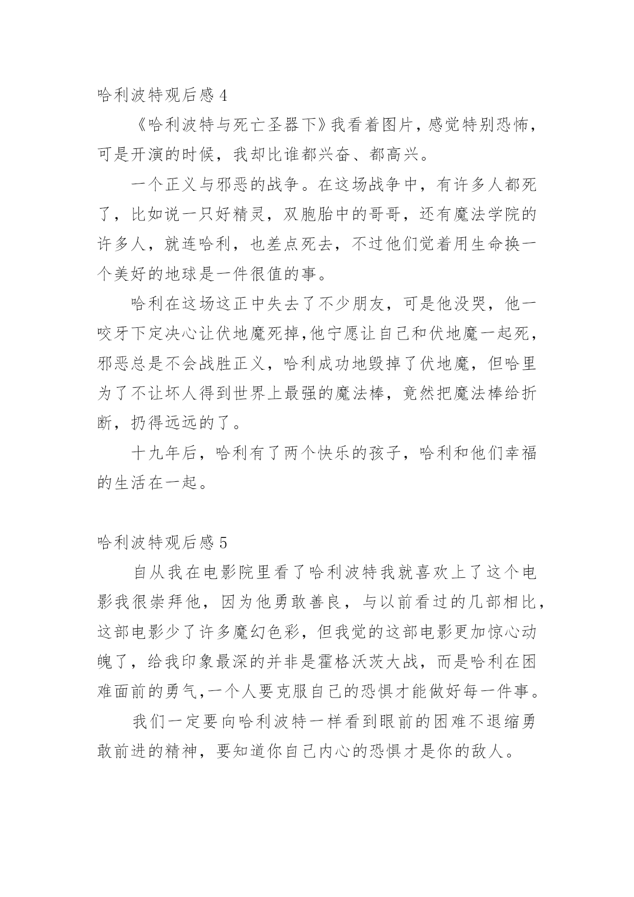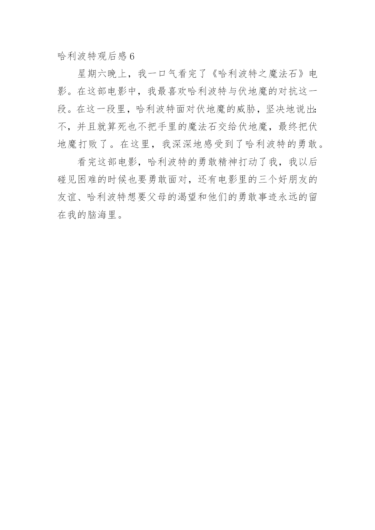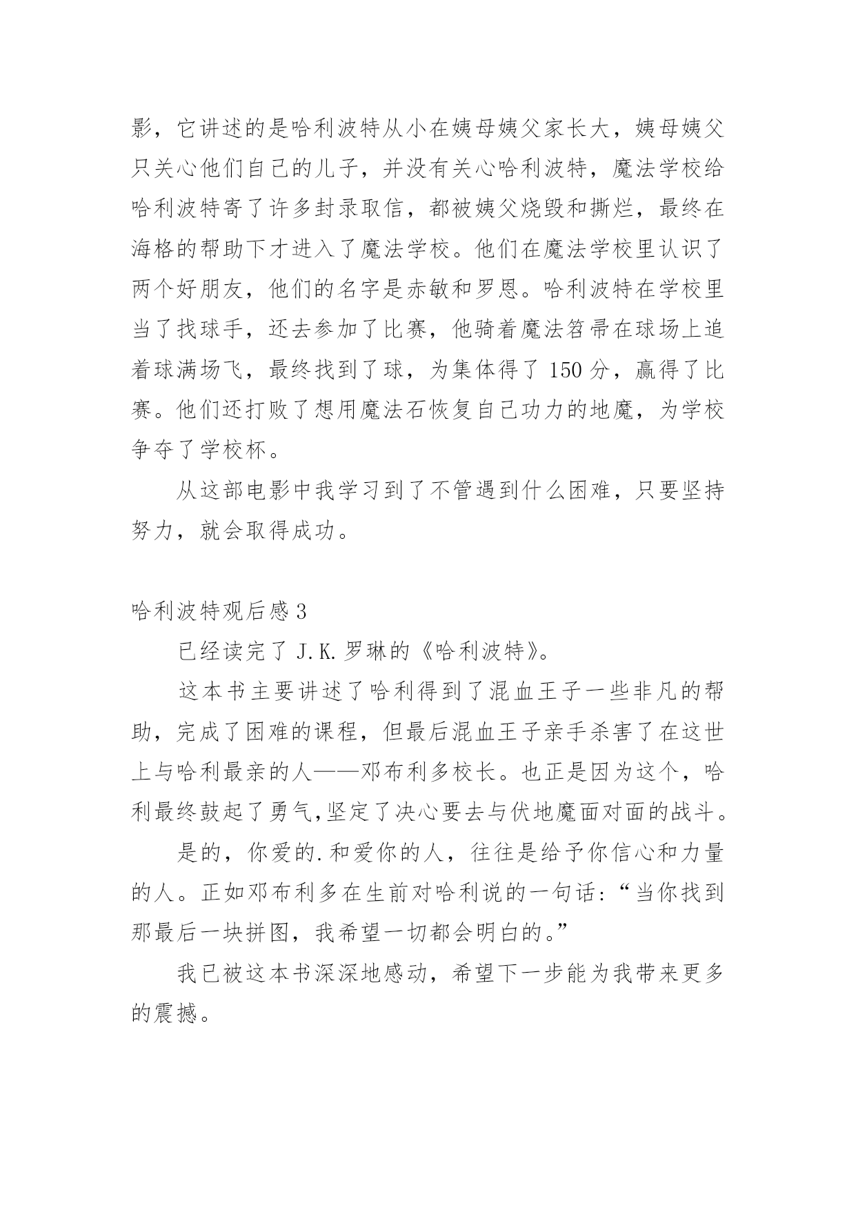 哈利波特观后感看完一部经典作品以后,一定有很多值得分享的心得吧,不妨坐下来好好写写观后感吧。可能你现在毫无头绪吧,以下是小编为大家收集的哈利波特观后感,欢迎大家分享。哈利波特观后感1刚刚重温了一遍“哈利波特与魔法石”,很喜欢魔镜那一段。哈利在无意中发现了厄里斯魔镜,并在镜中看到了自己朝思暮想的父母,于是每天都独坐在魔镜前等候,希望能再次与父母相遇。这时,阿不思邓不利多教授却告诉他:世上最快乐的人,才能在镜中看到真实的自己,镜子反映出的,正是我们心中最渴望的事。但镜子不能提供我们真正的知识或者真相,人类总是在镜子中虚度光阴,甚至因此而发疯。人不能活在梦里,不要依赖梦想而放弃生活。有时候会想,如果厄里斯魔镜真的存在,我们会不会忍不住去寻找它呢?我想我会的,因为我好想看看自己内心深处最最渴望的东西,甚至是连自己都不太清楚的那种渴望。哈利波特观后感2今天老师带领我们观看了《哈利波特之魔法石》这部电影,它讲述的是哈利波特从小在姨母姨父家长大,姨母姨父只关心他们自己的儿子,并没有关心哈利波特,魔法学校给哈利波特寄了许多封录取信,都被姨父烧毁和撕烂,最终在海格的帮助下才进入了魔法学校。他们在魔法学校里认识了两个好朋友,他们的名字是赤敏和罗恩。哈利波特在学校里当了找球手,还去参加了比赛,他骑着魔法笤帚在球场上追着球满场飞,最终找到了球,为集体得了150分,赢得了比赛。他们还打败了想用魔法石恢复自己功力的地魔,为学校争夺了学校杯。从这部电影中我学习到了不管遇到什么困难,只要坚持努力,就会取得成功。哈利波特观后感3已经读完了J.K.罗琳的《哈利波特》。这本书主要讲述了哈利得到了混血王子一些非凡的帮助,完成了困难的课程,但最后混血王子亲手杀害了在这世上与哈利最亲的人——邓布利多校长。也正是因为这个,哈利最终鼓起了勇气,坚定了决心要去与伏地魔面对面的战斗。是的,你爱的.和爱你的人,往往是给予你信心和力量的人。正如邓布利多在生前对哈利说的一句话:“当你找到那最后一块拼图,我希望一切都会明白的。”我已被这本书深深地感动,希望下一步能为我带来更多的震撼。哈利波特观后感4《哈利波特与死亡圣器下》我看着图片,感觉特别恐怖,可是开演的时候,我却比谁都兴奋、都高兴。一个正义与邪恶的战争。在这场战争中,有许多人都死了,比如说一只好精灵,双胞胎中的哥哥,还有魔法学院的许多人,就连哈利,也差点死去,不过他们觉着用生命换一个美好的地球是一件很值的事。哈利在这场这正中失去了不少朋友,可是他没哭,他一咬牙下定决心让伏地魔死掉,他宁愿让自己和伏地魔一起死,邪恶总是不会战胜正义,哈利成功地毁掉了伏地魔,但哈里为了不让坏人得到世界上最强的魔法棒,竟然把魔法棒给折断,扔得远远的了。十九年后,哈利有了两个快乐的孩子,哈利和他们幸福的生活在一起。哈利波特观后感5自从我在电影院里看了哈利波特我就喜欢上了这个电影我很崇拜他,因为他勇敢善良,与以前看过的几部相比,这部电影少了许多魔幻色彩,但我觉的这部电影更加惊心动魄了,给我印象最深的并非是霍格沃茨大战,而是哈利在困难面前的勇气,一个人要克服自己的恐惧才能做好每一件事。我们一定要向哈利波特一样看到眼前的困难不退缩勇敢前进的精神,要知道你自己内心的恐惧才是你的敌人。哈利波特观后感6星期六晚上,我一口气看完了《哈利波特之魔法石》电影。在这部电影中,我最喜欢哈利波特与伏地魔的对抗这一段。在这一段里,哈利波特面对伏地魔的威胁,坚决地说出:不,并且就算死也不把手里的魔法石交给伏地魔,最终把伏地魔打败了。在这里,我深深地感受到了哈利波特的勇敢。看完这部电影,哈利波特的勇敢精神打动了我,我以后碰见困难的时候也要勇敢面对,还有电影里的三个好朋友的友谊、哈利波特想要父母的渴望和他们的勇敢事迹永远的留在我的脑海里。