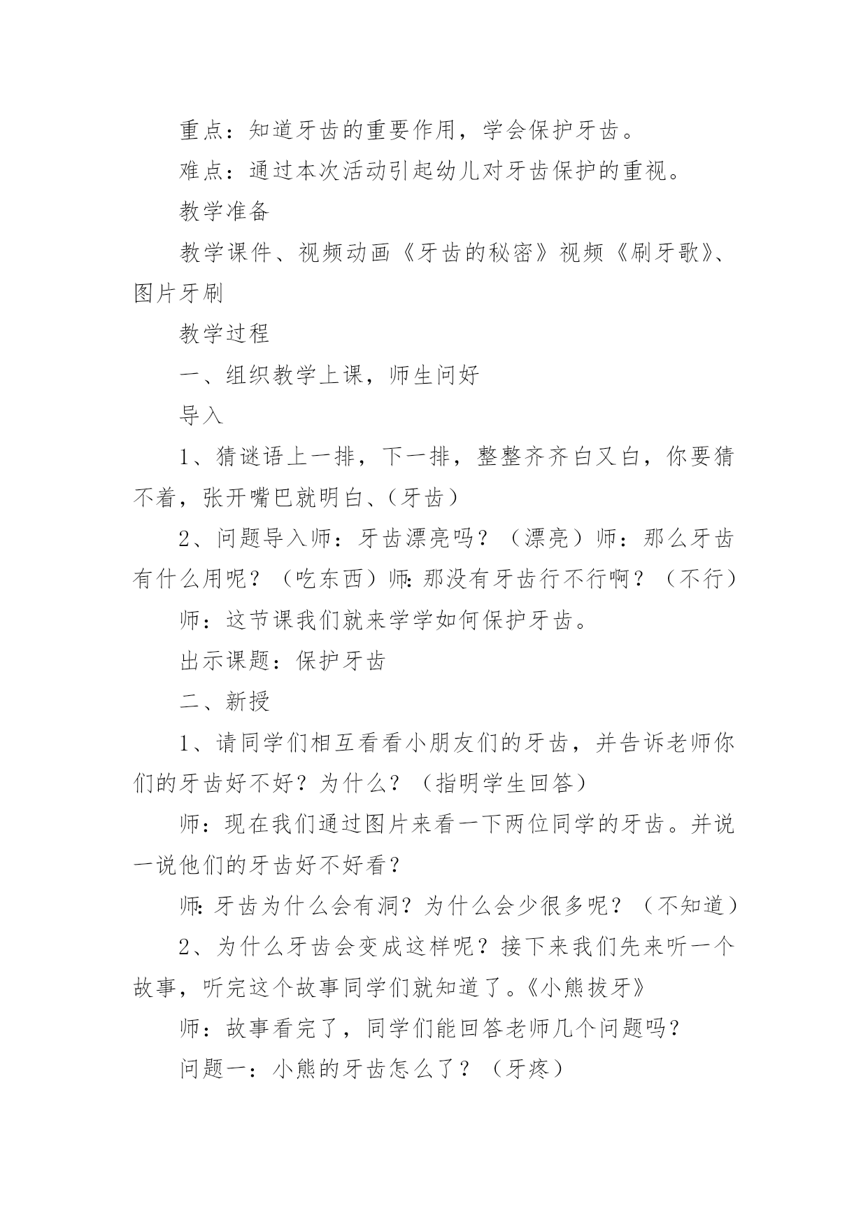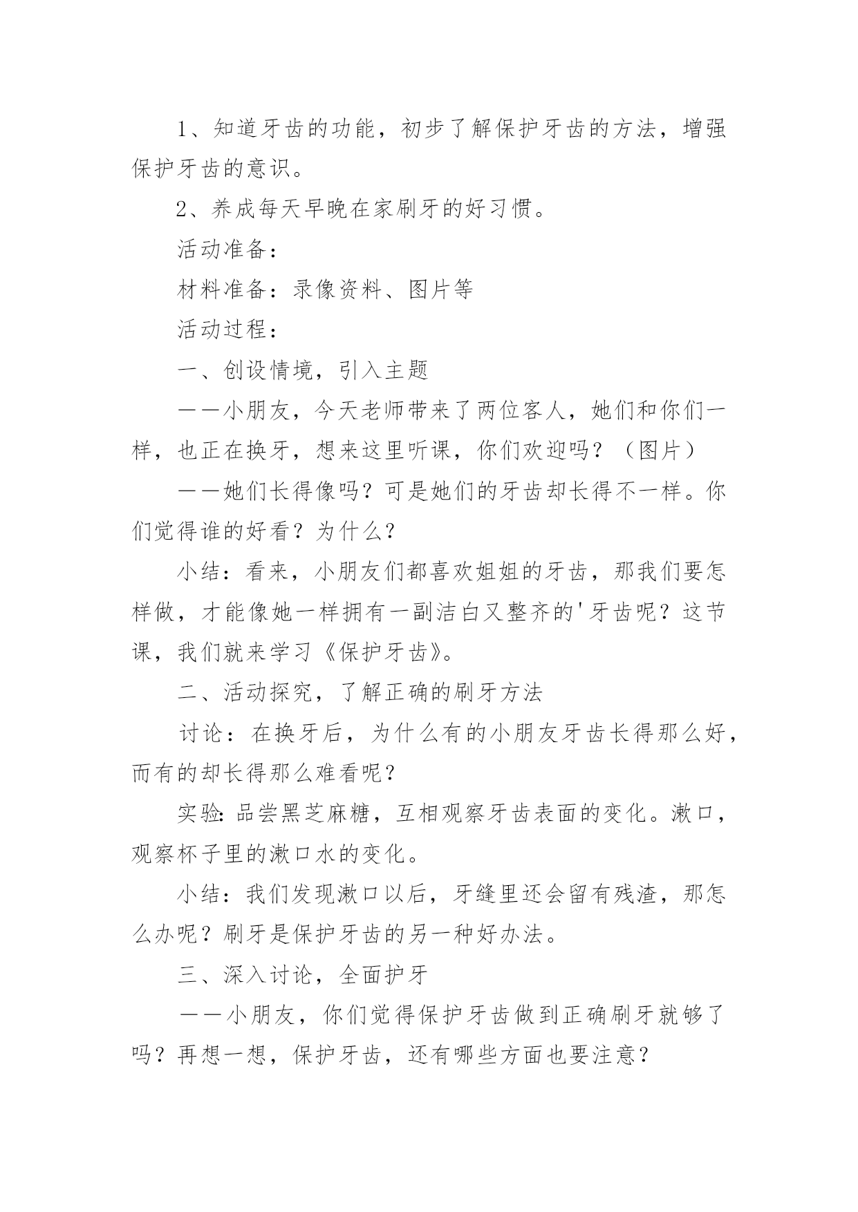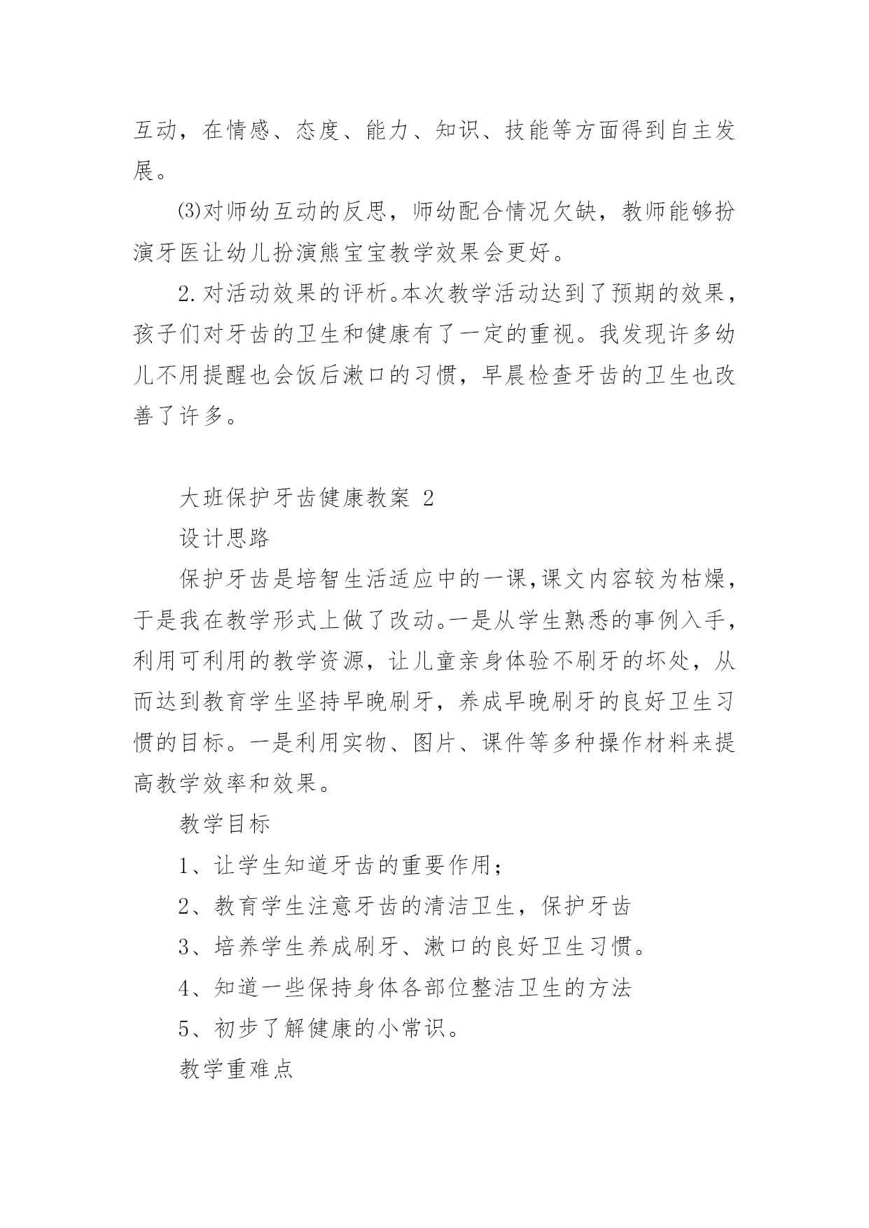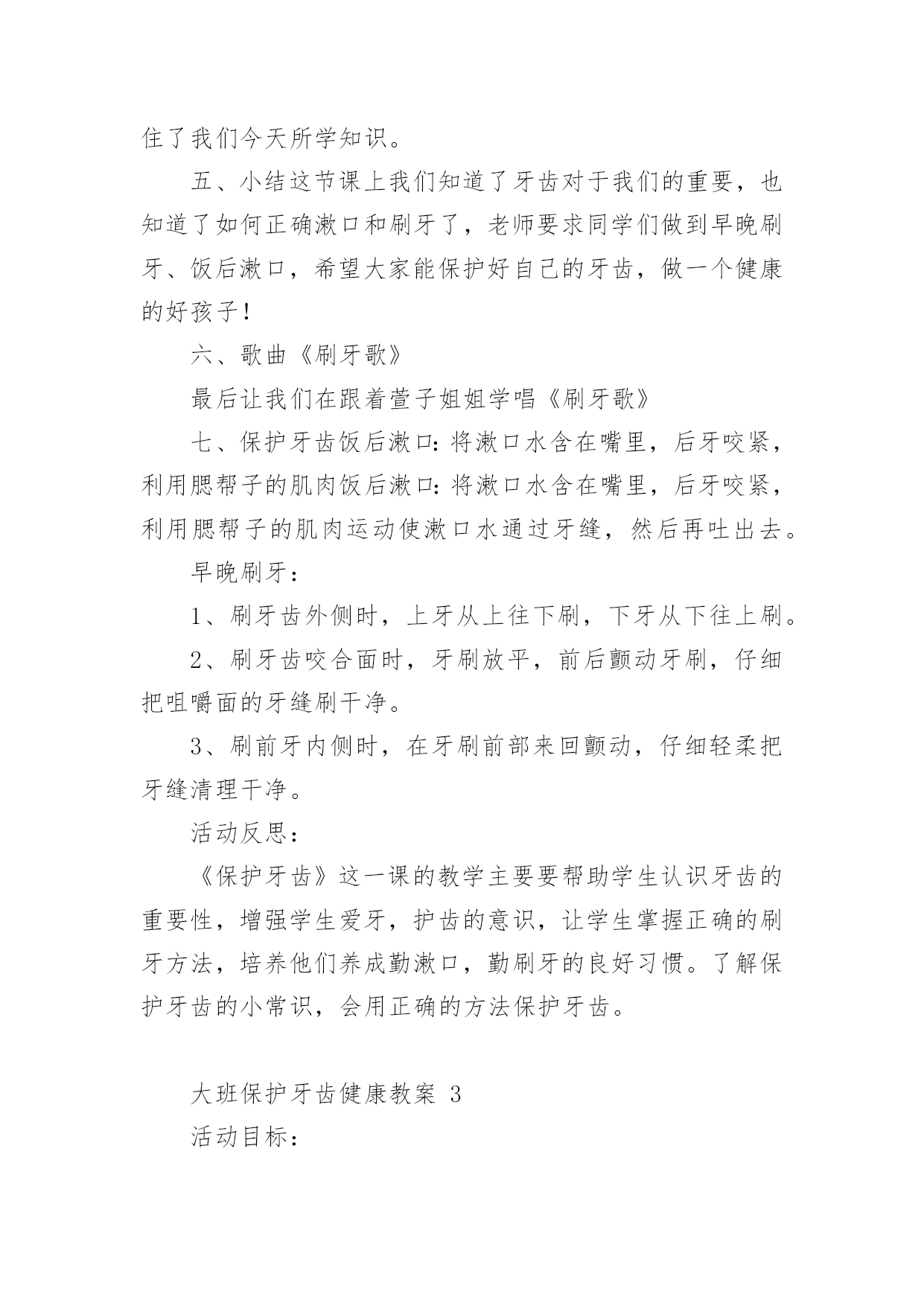 大班保护牙齿健康教案大班保护牙齿健康教案(通用15篇)作为一位杰出的教职工,时常需要编写教案,教案有助于顺利而有效地开展教学活动。教案应该怎么写才好呢?以下是小编精心整理的大班保护牙齿健康教案,仅供参考,欢迎大家阅读。大班保护牙齿健康教案1活动设计背景因本班出现幼儿不刷牙现象;为了培养幼儿讲卫生、爱刷牙的好习惯;结合幼儿的年龄特点,设计该活动过程。活动目标1、使幼儿知道细菌给我们的牙齿带来的危害。2、让孩子们懂得讲卫生、爱刷牙,养成良好的卫生习惯,做一个健康的孩子。3、初步了解健康的小常识。4、初步了解预防疾病的方法。5、了解主要症状,懂得预防和治疗的自我保护意识。教学重点、难点让幼儿知道怎样保护我们的牙齿并养成爱刷牙的好习惯活动准备1、flish动画故事《熊宝宝拔牙记》,挂图一幅2、牙型模具一套活动过程(活动过程的表述不必详细到将教师、学生的所有对话、活动逐字记录,但是应该把活动的主要环节很清楚地再现,即开始环节、基本环节、结束环节、延伸环节。注:重点表述基本环节)1、开始环节:放映动画故事《熊宝宝拔牙记》,让幼儿观看并思考以下几个问题2、基本环节:教师提问引入课题a、熊宝宝为什么牙痛呀?b、熊妈妈把熊宝宝送到哪里去了?c、医生怎么处理的呢?3、鼓励幼儿踊跃回答问题,回答问题结束后让幼儿自由讨论,怎样保护我们的牙齿。4、让幼儿上台演示自己平时是怎么刷牙的`5、教师演示正确的刷牙方法6、结束环节:教师总结怎样保护我们的牙齿7、延伸环节:让幼儿分组进入“娃娃家”区域角扮演牙医和熊宝宝的角色游戏教学反思1.对活动过程的反思:(以下方面无论是与否,都应该分析是与否的原因,从而总结经验或提出改进措施)⑴对幼儿发展的反思,本次教学活动的学习内容幼儿很乐意并容易接受。有适度的自由空间。能通同伴以及教师的互动,在情感、态度、能力、知识、技能等方面得到自主发展。⑶对师幼互动的反思,师幼配合情况欠缺,教师能够扮演牙医让幼儿扮演熊宝宝教学效果会更好。2.对活动效果的评析。本次教学活动达到了预期的效果,孩子们对牙齿的卫生和健康有了一定的重视。我发现许多幼儿不用提醒也会饭后漱口的习惯,早晨检查牙齿的卫生也改善了许多。大班保护牙齿健康教案2设计思路保护牙齿是培智生活适应中的一课,课文内容较为枯燥,于是我在教学形式上做了改动。一是从学生熟悉的事例入手,利用可利用的教学资源,让儿童亲身体验不刷牙的坏处,从而达到教育学生坚持早晚刷牙,养成早晚刷牙的良好卫生习惯的目标。一是利用实物、图片、课件等多种操作材料来提高教学效率和效果。教学目标1、让学生知道牙齿的重要作用;2、教育学生注意牙齿的清洁卫生,保护牙齿3、培养学生养成刷牙、漱口的良好卫生习惯。4、知道一些保持身体各部位整洁卫生的方法5、初步了解健康的小常识。教学重难点重点:知道牙齿的重要作用,学会保护牙齿。难点:通过本次活动引起幼儿对牙齿保护的重视。教学准备教学课件、视频动画《牙齿的秘密》视频《刷牙歌》、图片牙刷教学过程一、组织教学上课,师生问好导入1、猜谜语上一排,下一排,整整齐齐白又白,你要猜不着,张开嘴巴就明白、(牙齿)2、问题导入师:牙齿漂亮吗?(漂亮)师:那么牙齿有什么用呢?(吃东西)师:那没有牙齿行不行啊?(不行)师:这节课我们就来学学如何保护牙齿。出示课题:保护牙齿二、新授1、请同学们相互看看小朋友们的牙齿,并告诉老师你们的牙齿好不好?为什么?(指明学生回答)师:现在我们通过图片来看一下两位同学的牙齿。并说一说他们的牙齿好不好看?师:牙齿为什么会有洞?为什么会少很多呢?(不知道)2、为什么牙齿会变成这样呢?接下来我们先来听一个故事,听完这个故事同学们就知道了。《小熊拔牙》师:故事看完了,同学们能回答老师几个问题吗?问题一:小熊的牙齿怎么了?(牙疼)问题二:小熊为什么牙疼?(因为有小虫牙病菌在牙齿里)问题三:为什么牙齿里会有牙病菌(小虫)呢?(因为小熊吃完东西不刷牙)师:现在我们知道牙齿为什么会变黑、会有小洞了吗。(知道)师:我们每天吃完东西后,牙齿缝里留下一些食物,我们饭后不漱口,不刷牙,那些留在牙齿缝里的食物就变质了,产生一种细菌,腐蚀我们的牙齿然后就变成我们同学这样的牙齿了,它不仅会使我们的牙齿变的不漂亮,而且还会影响我们的健康。师:(图片)你们喜欢这个牙齿吗?为什么?你们想不想也要漂亮的'牙齿啊?那我们就来学习一下,如何清除我们饭后留在牙齿缝里的食物。师:首先要做到饭后正确的漱口。师:你们饭后漱口吗?是怎样做的?(找两名学生上前,示范他们是怎样漱口的)师:指出这种漱口方法是不正确的。(教师示范,学生练习)学生共同小结漱口的方法:师:将漱口水含在嘴里,后牙咬紧,利用腮帮子的肌肉运动使漱口水通过牙缝,然后再叶出去。师:我们牙齿在生长过程中,如果不精心地呵护它,它会生病的。我们每天除了饭后