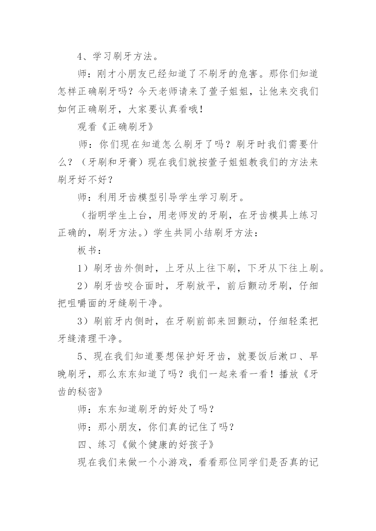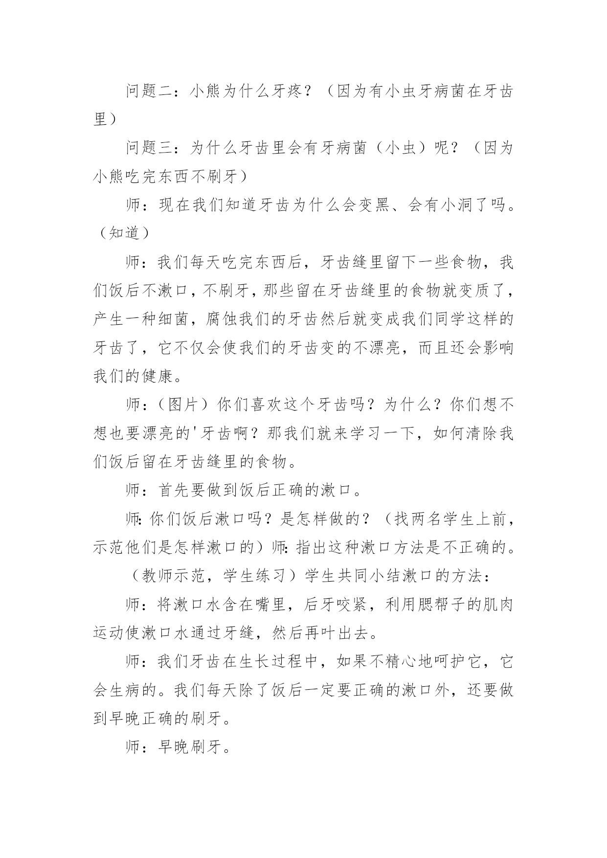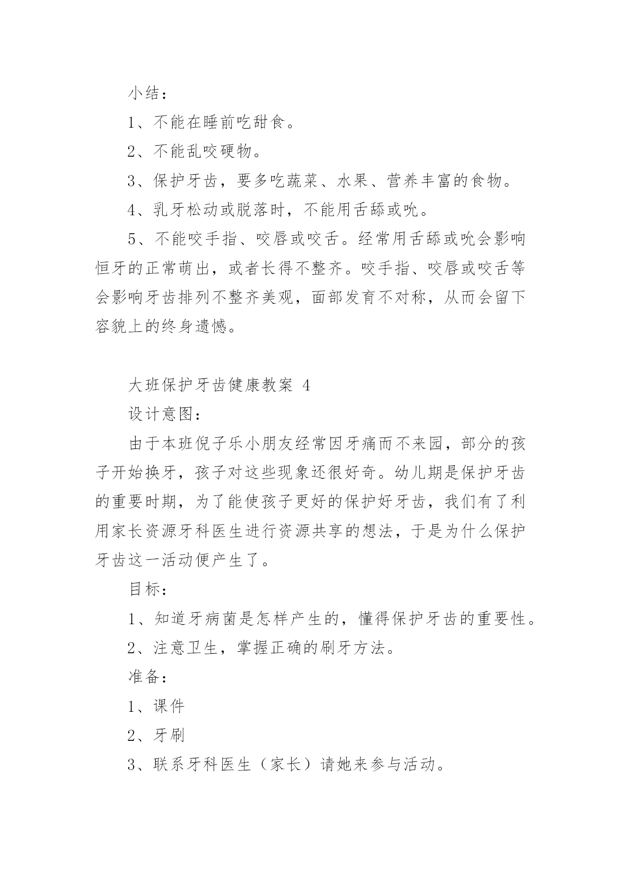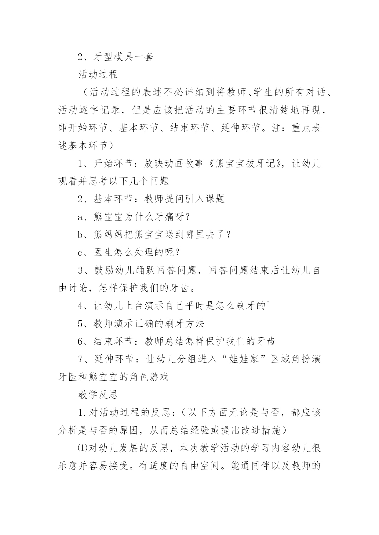 大班保护牙齿健康教案大班保护牙齿健康教案(通用15篇)作为一位杰出的教职工,时常需要编写教案,教案有助于顺利而有效地开展教学活动。教案应该怎么写才好呢?以下是小编精心整理的大班保护牙齿健康教案,仅供参考,欢迎大家阅读。大班保护牙齿健康教案1活动设计背景因本班出现幼儿不刷牙现象;为了培养幼儿讲卫生、爱刷牙的好习惯;结合幼儿的年龄特点,设计该活动过程。活动目标1、使幼儿知道细菌给我们的牙齿带来的危害。2、让孩子们懂得讲卫生、爱刷牙,养成良好的卫生习惯,做一个健康的孩子。3、初步了解健康的小常识。4、初步了解预防疾病的方法。5、了解主要症状,懂得预防和治疗的自我保护意识。教学重点、难点让幼儿知道怎样保护我们的牙齿并养成爱刷牙的好习惯活动准备1、flish动画故事《熊宝宝拔牙记》,挂图一幅2、牙型模具一套活动过程(活动过程的表述不必详细到将教师、学生的所有对话、活动逐字记录,但是应该把活动的主要环节很清楚地再现,即开始环节、基本环节、结束环节、延伸环节。注:重点表述基本环节)1、开始环节:放映动画故事《熊宝宝拔牙记》,让幼儿观看并思考以下几个问题2、基本环节:教师提问引入课题a、熊宝宝为什么牙痛呀?b、熊妈妈把熊宝宝送到哪里去了?c、医生怎么处理的呢?3、鼓励幼儿踊跃回答问题,回答问题结束后让幼儿自由讨论,怎样保护我们的牙齿。4、让幼儿上台演示自己平时是怎么刷牙的`5、教师演示正确的刷牙方法6、结束环节:教师总结怎样保护我们的牙齿7、延伸环节:让幼儿分组进入“娃娃家”区域角扮演牙医和熊宝宝的角色游戏教学反思1.对活动过程的反思:(以下方面无论是与否,都应该分析是与否的原因,从而总结经验或提出改进措施)⑴对幼儿发展的反思,本次教学活动的学习内容幼儿很乐意并容易接受。有适度的自由空间。能通同伴以及教师的互动,在情感、态度、能力、知识、技能等方面得到自主发展。⑶对师幼互动的反思,师幼配合情况欠缺,教师能够扮演牙医让幼儿扮演熊宝宝教学效果会更好。2.对活动效果的评析。本次教学活动达到了预期的效果,孩子们对牙齿的卫生和健康有了一定的重视。我发现许多幼儿不用提醒也会饭后漱口的习惯,早晨检查牙齿的卫生也改善了许多。大班保护牙齿健康教案2设计思路保护牙齿是培智生活适应中的一课,课文内容较为枯燥,于是我在教学形式上做了改动。一是从学生熟悉的事例入手,利用可利用的教学资源,让儿童亲身体验不刷牙的坏处,从而达到教育学生坚持早晚刷牙,养成早晚刷牙的良好卫生习惯的目标。一是利用实物、图片、课件等多种操作材料来提高教学效率和效果。教学目标1、让学生知道牙齿的重要作用;2、教育学生注意牙齿的清洁卫生,保护牙齿3、培养学生养成刷牙、漱口的良好卫生习惯。4、知道一些保持身体各部位整洁卫生的方法5、初步了解健康的小常识。教学重难点重点:知道牙齿的重要作用,学会保护牙齿。难点:通过本次活动引起幼儿对牙齿保护的重视。教学准备教学课件、视频动画《牙齿的秘密》视频《刷牙歌》、图片牙刷教学过程一、组织教学上课,师生问好导入1、猜谜语上一排,下一排,整整齐齐白又白,你要猜不着,张开嘴巴就明白、(牙齿)2、问题导入师:牙齿漂亮吗?(漂亮)师:那么牙齿有什么用呢?(吃东西)师:那没有牙齿行不行啊?(不行)师:这节课我们就来学学如何保护牙齿。出示课题:保护牙齿二、新授1、请同学们相互看看小朋友们的牙齿,并告诉老师你们的牙齿好不好?为什么?(指明学生回答)师:现在我们通过图片来看一下两位同学的牙齿。并说一说他们的牙齿好不好看?师:牙齿为什么会有洞?为什么会少很多呢?(不知道)2、为什么牙齿会变成这样呢?接下来我们先来听一个故事,听完这个故事同学们就知道了。《小熊拔牙》师:故事看完了,同学们能回答老师几个问题吗?问题一:小熊的牙齿怎么了?(牙疼)问题二:小熊为什么牙疼?(因为有小虫牙病菌在牙齿里)问题三:为什么牙齿里会有牙病菌(小虫)呢?(因为小熊吃完东西不刷牙)师:现在我们知道牙齿为什么会变黑、会有小洞了吗。(知道)师:我们每天吃完东西后,牙齿缝里留下一些食物,我们饭后不漱口,不刷牙,那些留在牙齿缝里的食物就变质了,产生一种细菌,腐蚀我们的牙齿然后就变成我们同学这样的牙齿了,它不仅会使我们的牙齿变的不漂亮,而且还会影响我们的健康。师:(图片)你们喜欢这个牙齿吗?为什么?你们想不想也要漂亮的'牙齿啊?那我们就来学习一下,如何清除我们饭后留在牙齿缝里的食物。师:首先要做到饭后正确的漱口。师:你们饭后漱口吗?是怎样做的?(找两名学生上前,示范他们是怎样漱口的)师:指出这种漱口方法是不正确的。(教师示范,学生练习)学生共同小结漱口的方法:师:将漱口水含在嘴里,后牙咬紧,利用腮帮子的肌肉运动使漱口水通过牙缝,然后再叶出去。师:我们牙齿在生长过程中,如果不精心地呵护它,它会生病的。我们每天除了饭后