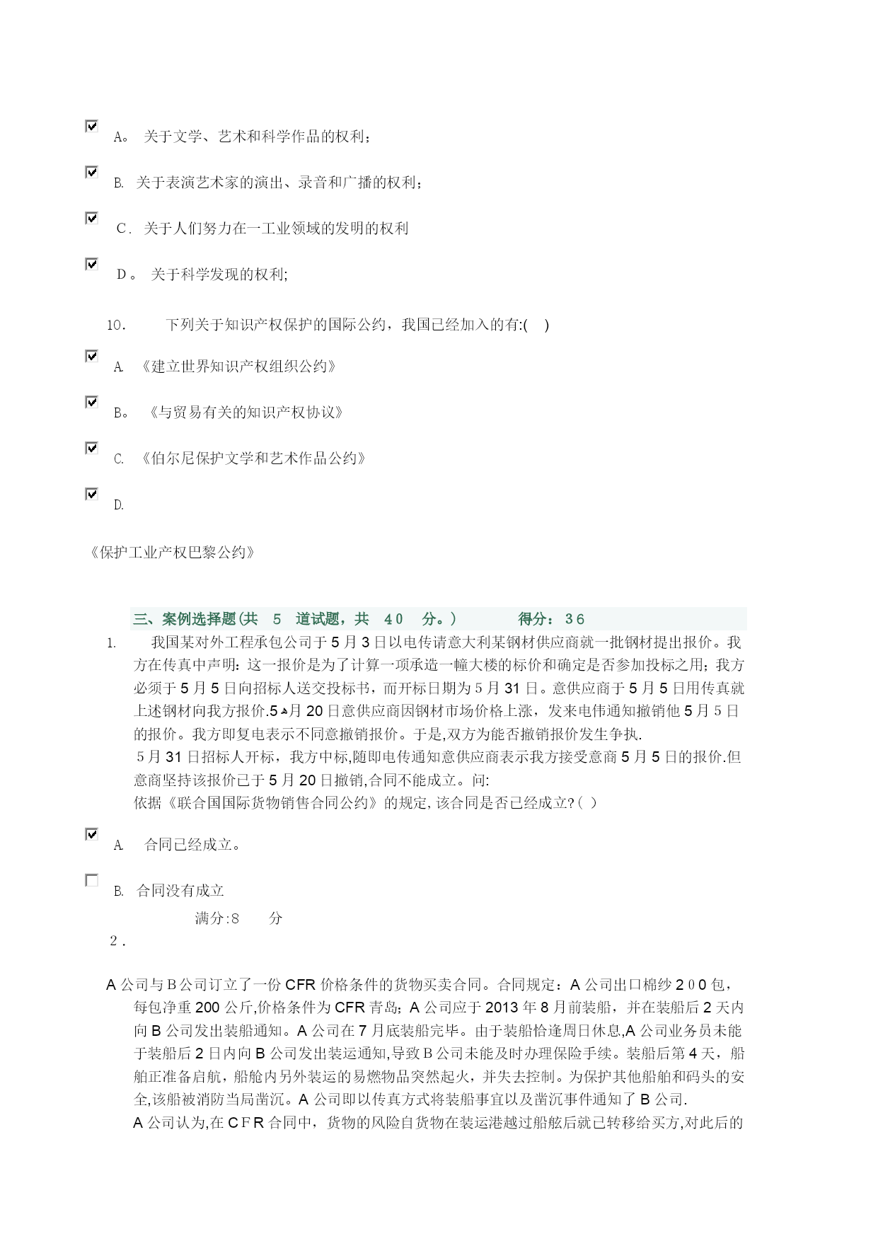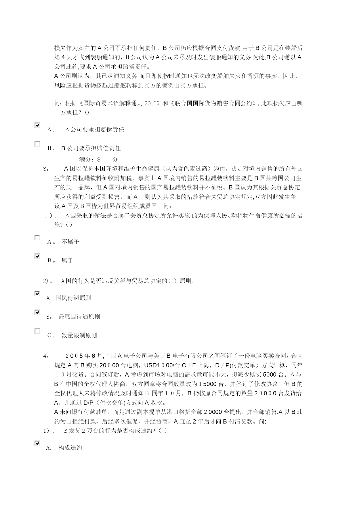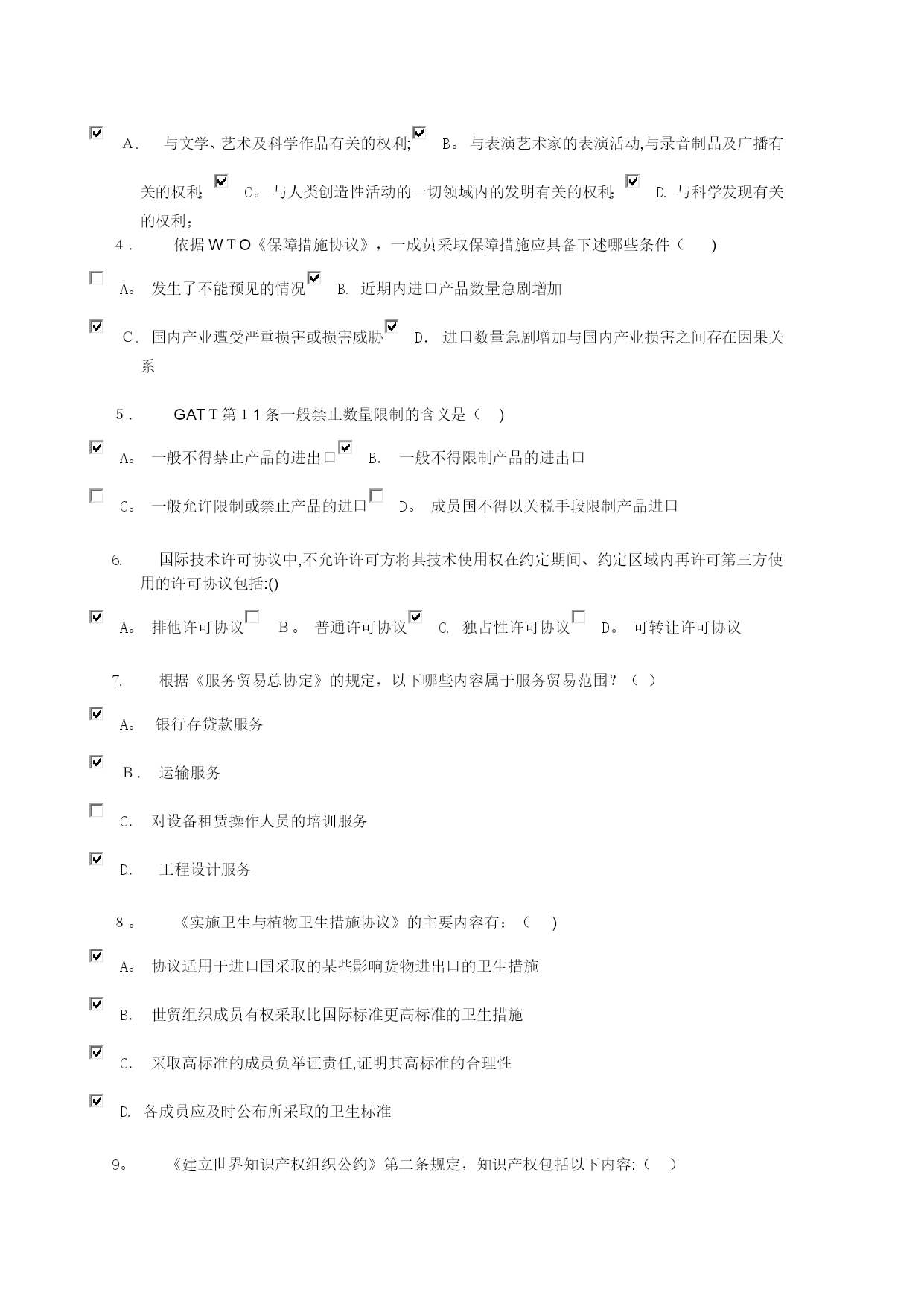 国际经济法任务试卷_2【实用文档】doc文档可直接使用可编辑,欢迎下载03任务试卷_0008一、单项选择题(共10道试题,共30分。)得分:271。一国给予另一国国民的待遇不低于现在或将来给予任何第三国国民的待遇,称为:()A。国民待遇B。互惠原则C.非歧视待遇D.最惠国待遇2.下列关于世界贸易组织基本原则的表述中正确的是:()A.对于进口商品提出不同的环境保护的要求不构成贸易限制B.数量限制是比关税更具保护进口国市场作用的贸易保护措施C.世界贸易组织的透明度原则要求各成员国制定更为严密的贸易法规D.最惠国待遇原则使得外国产品能享受比本国产品更多的优惠3.下列不属于乌拉圭回合谈判结束时所签订的协议的是:()A。与贸易有关的投资措施协议B.关于建立世界贸易组织的协定C.服务贸易总协定D.贸易便利化协议4.在保护知识产权的各项国际条约中,《与贸易有关的知识产权协议》首次规定应保护的权利是:()A.作者的精神权利B.与版权相关的权利C.作者享有租借权利D.表演者的权利5.关于世界贸易组织(WTO)和关税与贸易总协定(GATT)的内容,正确的表述是哪项?()A。世界贸易组织和关税与贸易总协定均对农产品贸易、纺织品与服装贸易进行调整B.世界贸易组织是常设性的国际组织,而关税与贸易总协定是临时适用的协定C。世界贸易组织和关税与贸易总协定的成员不论大小在参加许多协议与协定时缔约方在接受时可以是选择性的D.世界贸易组织和关税与贸易总协定的争端解决机制具有同等的权威性6.下列关于国际许可协议特征的描述错误的是:()A.企业之间无偿让渡技术使用权的协议属于国际许可协议的范围B.国际许可协议的主体可以是自然人,也可以是法人等经济组织C。国际许可协议的客体是技术使用权,可以作跨越国境的移动D.国际许可协议多数属于混合性协议,例如技术转让与机器设备买卖结合在一起7.依《保护文学艺术作品伯尔尼公约》的规定,非该公约成员国的国民,其作品首次在公约某一成员国出版,或同时在某一成员国及其它非成员国首次出版,则应在一切成员国中享有下列哪一种待遇?()A。最惠国待遇B.优惠待遇C.差别待遇D。国民待遇8.根据乌拉圭回合谈判中达成的《与贸易有关的知识产权协议》的规定,对计算机程序、数据库应依照哪一方面的法律提供保护?()A。专利法B.商标法C.版权法D。专有技术9.GATT第24条允许WTO成员建立关税同盟或自由贸易区等地区贸易集团,但是要求()。A。地区贸易集团内必须取消影响相互之间贸易的所有关税和其它限制B.地区贸易集团必须实行对外统一关税C。地区贸易集团以外的WTO成员其经营者的待遇不应低于给予集团内经营者的待遇D。地区贸易集团内实施的优惠也应给予来自集团以外的产品10。《与贸易有关的知识产权协议》,对未泄露的信息提供保护。这些信息得到保护应当具备的条件不包括().A。未经公开的B。呈送给政府机构的C。具有商业价值的D。信息所有者采取了合理保密措施的二、多项选择题(共10道试题,共30分。)得分:28.51。根据《建立世界知识产权组织公约》规定,知识产权包括下列权利:()A.与工业品外观设计有关的权利;B。与商品商标、服务商标、商号及其它商业标记有关的权利C。与防止不正当竞争有关的权利;D.一切其它来自工业、科学及文学艺术领域的智力创作活动所产生的权利。2。下列各项中,属于《服务贸易总协定》中所列举的国际服务贸易的是:()A。中国东方航空公司的飞机在德国法兰克福机场加油B.加拿大某设计事务所为中国的城市建设项目提供咨询C。境外律师在北京开设办事处D.中国江苏国际经济技术合作公司在埃及承包桥梁施工项目3。根据《建立世界知识产权组织公约》规定,知识产权包括下列权利:()A.与文学、艺术及科学作品有关的权利;B。与表演艺术家的表演活动,与录音制品及广播有关的权利;C。与人类创造性活动的一切领域内的发明有关的权利;D.与科学发现有关的权利;4.依据WTO《保障措施协议》,一成员采取保障措施应具备下述哪些条件()A。发生了不能预见的情况B.近期内进口产品数量急剧增加C.国内产业遭受严重损害或损害威胁D.进口数量急剧增加与国内产业损害之间存在因果关系5.GATT第11条一般禁止数量限制的含义是()A。一般不得禁止产品的进出口B.一般不得限制产品的进出口C。一般允许限制或禁止产品的进口D。成员国不得以关税手段限制产品进口6.国际技术许可协议中,不允许许可方将其技术使用权在约定期间、约定区域内再许可第三方使用的许可协议包括:()A。排他许可协议B。普通许可协议C.独占性许可协议D。可转让许可协议7.根据《服务贸易总协定》的规定,以下哪些内容属于服务贸易范