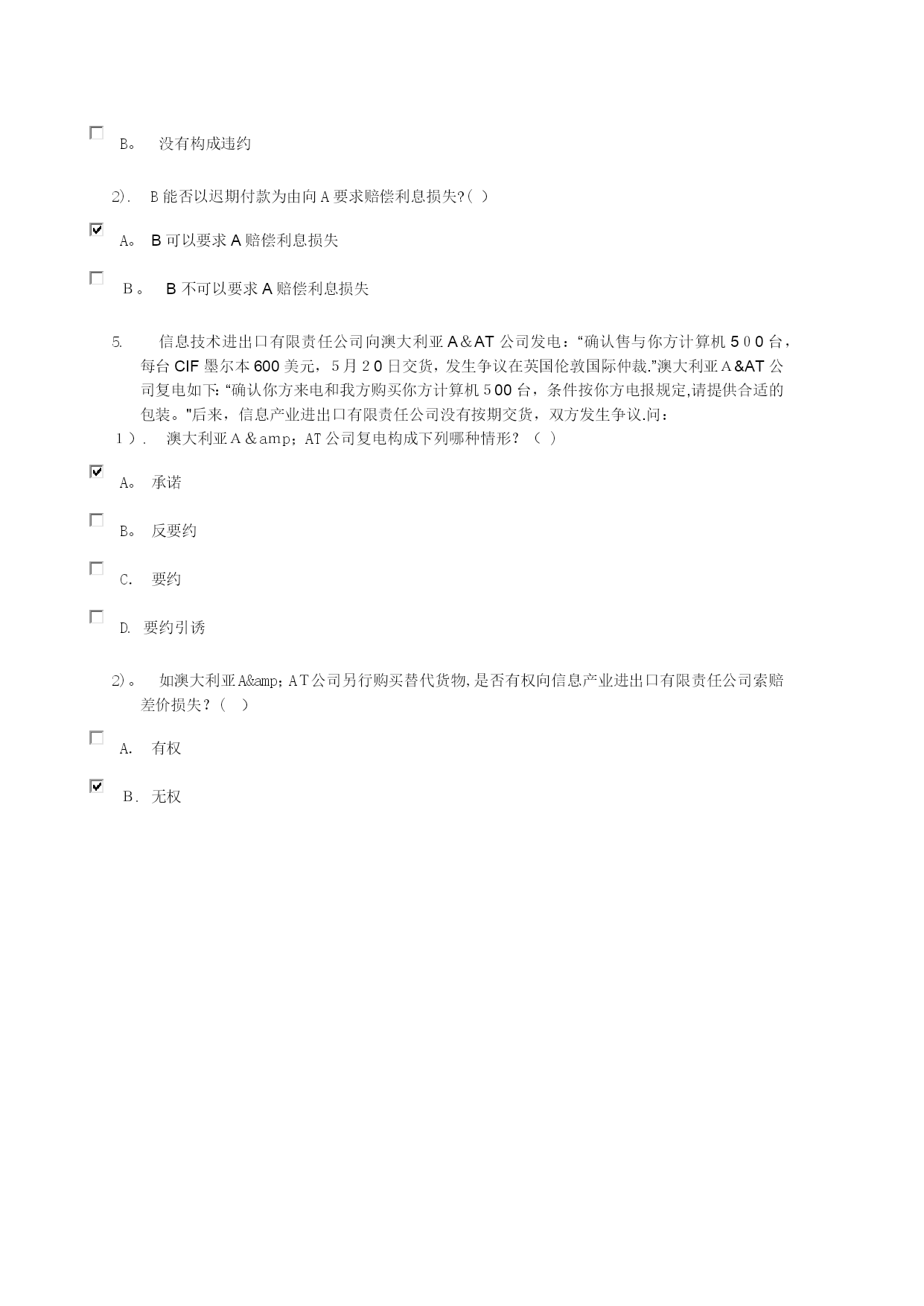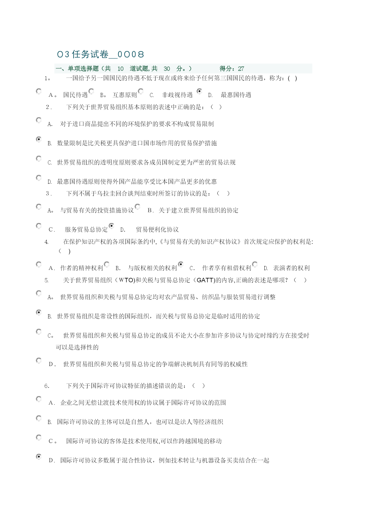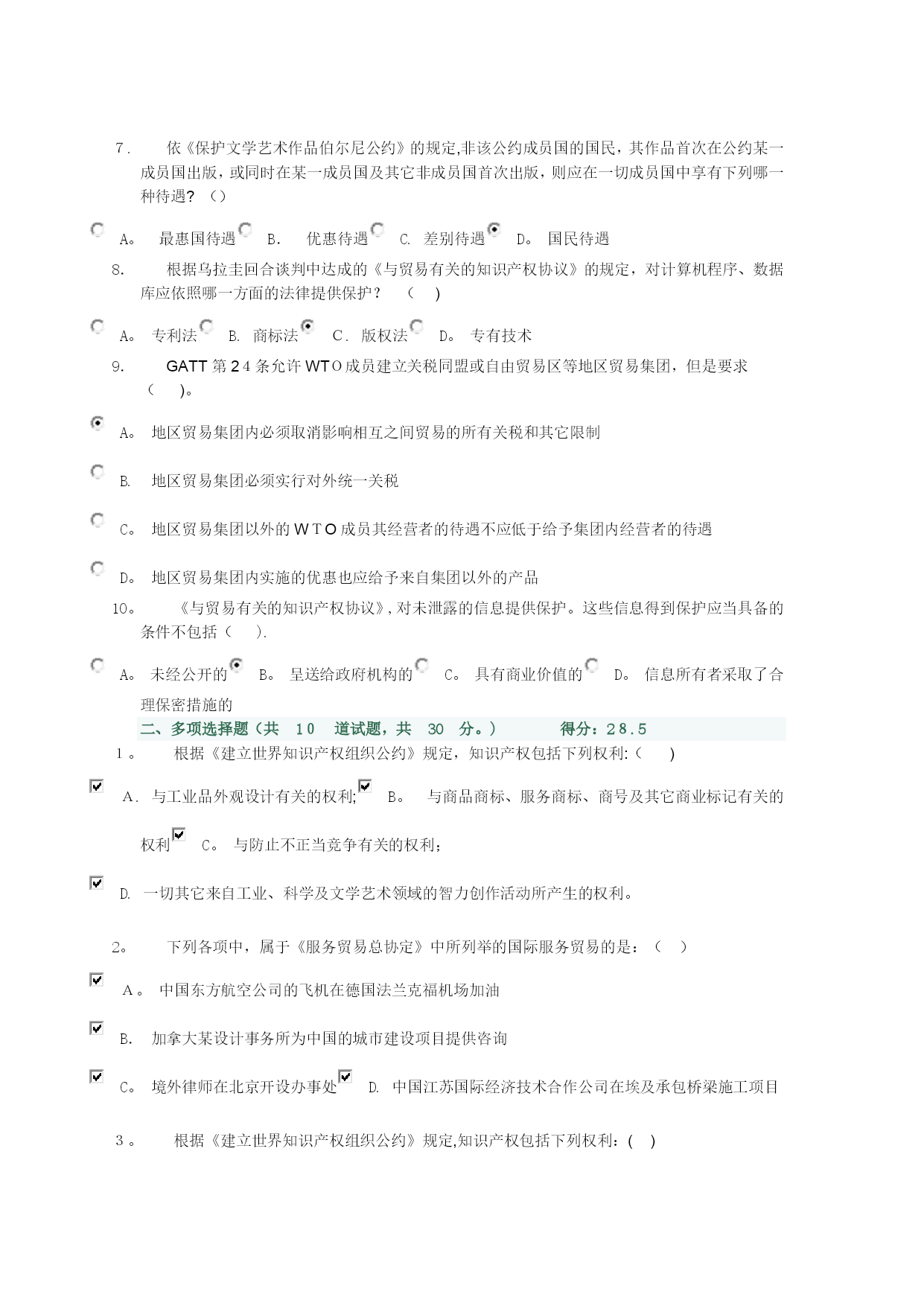 国际经济法任务试卷_2【实用文档】doc文档可直接使用可编辑,欢迎下载03任务试卷_0008一、单项选择题(共10道试题,共30分。)得分:271。一国给予另一国国民的待遇不低于现在或将来给予任何第三国国民的待遇,称为:()A。国民待遇B。互惠原则C.非歧视待遇D.最惠国待遇2.下列关于世界贸易组织基本原则的表述中正确的是:()A.对于进口商品提出不同的环境保护的要求不构成贸易限制B.数量限制是比关税更具保护进口国市场作用的贸易保护措施C.世界贸易组织的透明度原则要求各成员国制定更为严密的贸易法规D.最惠国待遇原则使得外国产品能享受比本国产品更多的优惠3.下列不属于乌拉圭回合谈判结束时所签订的协议的是:()A。与贸易有关的投资措施协议B.关于建立世界贸易组织的协定C.服务贸易总协定D.贸易便利化协议4.在保护知识产权的各项国际条约中,《与贸易有关的知识产权协议》首次规定应保护的权利是:()A.作者的精神权利B.与版权相关的权利C.作者享有租借权利D.表演者的权利5.关于世界贸易组织(WTO)和关税与贸易总协定(GATT)的内容,正确的表述是哪项?()A。世界贸易组织和关税与贸易总协定均对农产品贸易、纺织品与服装贸易进行调整B.世界贸易组织是常设性的国际组织,而关税与贸易总协定是临时适用的协定C。世界贸易组织和关税与贸易总协定的成员不论大小在参加许多协议与协定时缔约方在接受时可以是选择性的D.世界贸易组织和关税与贸易总协定的争端解决机制具有同等的权威性6.下列关于国际许可协议特征的描述错误的是:()A.企业之间无偿让渡技术使用权的协议属于国际许可协议的范围B.国际许可协议的主体可以是自然人,也可以是法人等经济组织C。国际许可协议的客体是技术使用权,可以作跨越国境的移动D.国际许可协议多数属于混合性协议,例如技术转让与机器设备买卖结合在一起7.依《保护文学艺术作品伯尔尼公约》的规定,非该公约成员国的国民,其作品首次在公约某一成员国出版,或同时在某一成员国及其它非成员国首次出版,则应在一切成员国中享有下列哪一种待遇?()A。最惠国待遇B.优惠待遇C.差别待遇D。国民待遇8.根据乌拉圭回合谈判中达成的《与贸易有关的知识产权协议》的规定,对计算机程序、数据库应依照哪一方面的法律提供保护?()A。专利法B.商标法C.版权法D。专有技术9.GATT第24条允许WTO成员建立关税同盟或自由贸易区等地区贸易集团,但是要求()。A。地区贸易集团内必须取消影响相互之间贸易的所有关税和其它限制B.地区贸易集团必须实行对外统一关税C。地区贸易集团以外的WTO成员其经营者的待遇不应低于给予集团内经营者的待遇D。地区贸易集团内实施的优惠也应给予来自集团以外的产品10。《与贸易有关的知识产权协议》,对未泄露的信息提供保护。这些信息得到保护应当具备的条件不包括().A。未经公开的B。呈送给政府机构的C。具有商业价值的D。信息所有者采取了合理保密措施的二、多项选择题(共10道试题,共30分。)得分:28.51。根据《建立世界知识产权组织公约》规定,知识产权包括下列权利:()A.与工业品外观设计有关的权利;B。与商品商标、服务商标、商号及其它商业标记有关的权利C。与防止不正当竞争有关的权利;D.一切其它来自工业、科学及文学艺术领域的智力创作活动所产生的权利。2。下列各项中,属于《服务贸易总协定》中所列举的国际服务贸易的是:()A。中国东方航空公司的飞机在德国法兰克福机场加油B.加拿大某设计事务所为中国的城市建设项目提供咨询C。境外律师在北京开设办事处D.中国江苏国际经济技术合作公司在埃及承包桥梁施工项目3。根据《建立世界知识产权组织公约》规定,知识产权包括下列权利:()A.与文学、艺术及科学作品有关的权利;B。与表演艺术家的表演活动,与录音制品及广播有关的权利;C。与人类创造性活动的一切领域内的发明有关的权利;D.与科学发现有关的权利;4.依据WTO《保障措施协议》,一成员采取保障措施应具备下述哪些条件()A。发生了不能预见的情况B.近期内进口产品数量急剧增加C.国内产业遭受严重损害或损害威胁D.进口数量急剧增加与国内产业损害之间存在因果关系5.GATT第11条一般禁止数量限制的含义是()A。一般不得禁止产品的进出口B.一般不得限制产品的进出口C。一般允许限制或禁止产品的进口D。成员国不得以关税手段限制产品进口6.国际技术许可协议中,不允许许可方将其技术使用权在约定期间、约定区域内再许可第三方使用的许可协议包括:()A。排他许可协议B。普通许可协议C.独占性许可协议D。可转让许可协议7.根据《服务贸易总协定》的规定,以下哪些内容属于服务贸易范