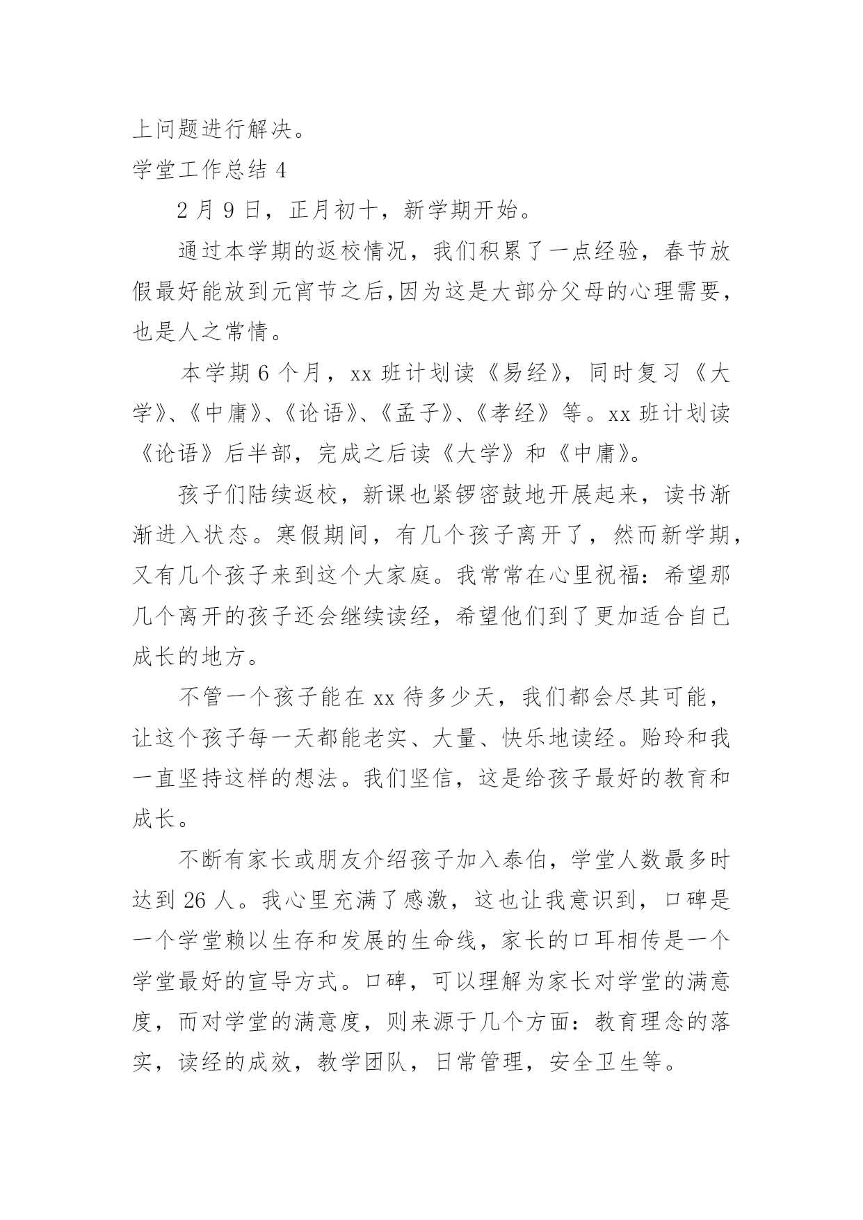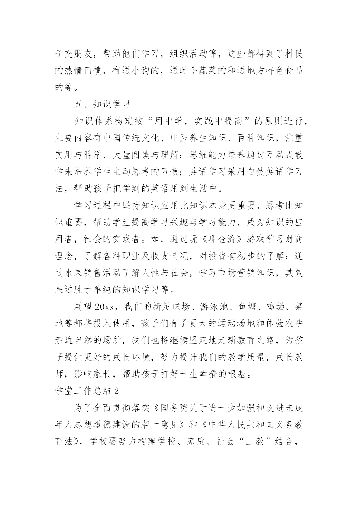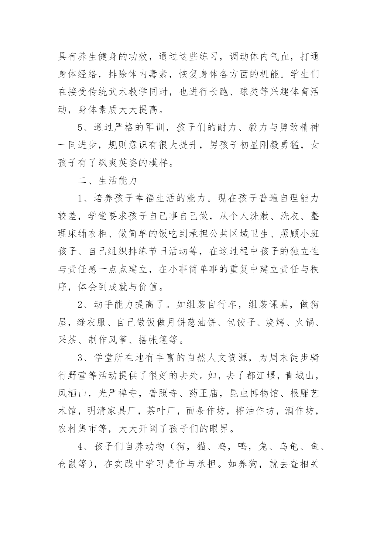 学堂工作总结学堂工作总结总结是对过去一定时期的工作、学习或思想情况进行回顾、分析,并做出客观评价的书面材料,写总结有利于我们学习和工作能力的提高,因此,让我们写一份总结吧。你所见过的总结应该是什么样的?以下是小编帮大家整理的学堂工作总结,欢迎阅读,希望大家能够喜欢。学堂工作总结1xx学堂是由数名热心新教育的家长与教师组建,秉持着“教其心,育其身”的教学宗旨组织教学工作。20xx年虽然经历波折,仍不改初心,坚定走新教育之路,现就一年中的主要工作按身体健康、生活能力、心理与行为教育、社会实践、知识学习等方面总结。一、身体健康1、当初学堂选址青城山,著名的养生胜地,空气清新,阳光充足,水源无污染,大环境是孩子健康的基础保障。2、食材安全,蔬菜是村民自种,食用油是小油作坊榨的,面条是镇上的小店现作的,肉食买村民自养的猪鸡等。3、作息规律,严格要求,按照中医养生的节律安排作息时间。4、体育锻炼,请青城派弟子任武术教练,教授青城派的基础拳法,涵盖了武林基本功中静功、桩功、动功内容,具有养生健身的功效,通过这些练习,调动体内气血,打通身体经络,排除体内毒素,恢复身体各方面的机能。学生们在接受传统武术教学同时,也进行长跑、球类等兴趣体育活动,身体素质大大提高。5、通过严格的军训,孩子们的耐力、毅力与勇敢精神一同进步,规则意识有很大提升,男孩子初显刚毅勇猛,女孩子有了飒爽英姿的模样。二、生活能力1、培养孩子幸福生活的能力。现在孩子普遍自理能力较差,学堂要求孩子自己事自己做,从个人洗漱、洗衣、整理床铺衣柜、做简单的饭吃到承担公共区域卫生、照顾小班孩子、自己组织排练节日活动等,在这过程中孩子的独立性与责任感一点点建立,在小事简单事的重复中建立责任与秩序,体会到成就与价值。2、动手能力提高了。如组装自行车,组装课桌,做狗屋,缝衣服、自己做饭做月饼葱油饼、包饺子、烧烤、火锅、采茶、制作风筝、搭帐篷等。3、学堂所在地有丰富的自然人文资源,为周末徒步骑行野营等活动提供了很好的去处。如,去了都江堰,青城山,凤栖山,光严禅寺,普照寺、药王庙,昆虫博物馆、根雕艺术馆,明清家具厂,茶叶厂,面条作坊,榨油作坊,酒作坊,农村集市等,大大开阔了孩子们的眼界。4、孩子们自养动物(狗,猫、鸡,鸭,兔、乌龟、鱼、仓鼠等),在实践中学习责任与承担。如养狗,就去查相关资料,看看如何照顾好狗,狗生病了怎么办,每天准备狗食,打扫狗舍,给狗洗澡等。5、课余生活,跳舞,画画,手工,音乐,自编自演舞台剧、歌曲等。三、心理和行为教育心理和行为教育是学堂教学的核心。针对孩子们普通存在的自信心弱的状况,还有多年形成的盲目攀比、贬低别人、自卑、抱怨等负面情绪,引导学生接受个体间差异,认识到自己与别人不同,坚决做好“三比”:自己与自己比、这次与上次比、今天与昨天比,通过自己的努力和不断挑战超越自我来取得成就感和价值感。责任心是一个优秀的人最根本的品质,针对部分孩子运动不及时、清洁不干净、个人物品乱摆放等问题,组织孩子们讨论明确自己的责任以及不承担责任的后果,把责任还给孩子,让孩子充分体验,去感受责任,管理好自己。执行后,孩子的体能提高了,清洁越来越干净,个人物品开始有序地摆放了,从这些生活细节上着手,孩子们的责任心一点点的构建。针对青春期的孩子,我们开展了青春期教育,了解两性生长的差异,如何与异性交往,如何保持青春期卫生等。学堂一直在营造充满爱的'大家庭氛围,让每个孩子都感受到爱,在其中学习爱、尊重、宽容等最基本最重要的人生功课。这些功课融合在日常教学生活之中,孩子们也一点点在进步,相信他们会越来越优秀。四、社会实践我们注重孩子所学与实践的结合,安排了西安游学、水果销售、帮助村民等活动,让孩子们在社会实践中对所学知识有更深的认识。西安游学的寻根之旅,祭拜黄帝陵、参观秦兵马俑、陕西省博物馆、大小雁塔、钟楼鼓楼等,民族的历史文化的厚重给孩子们留下直观深入的印象,我们用这样的方式告诉孩子们我们是中国人,历史的使命是传承中华文化兴旺中华民族。同时,西北风情的民俗与饮食文化也让孩子们用亲身体验明白什么是差异,如何去理解并接受甚至欣赏,这对孩子们形成包容宽广的情怀是大有助益的。孩子们自己组织去乡村集市销售水果的活动,体会了挣钱的不容易,曾经花钱大方的孩子舍不得花几元钱吃面了,因为面钱要卖好多斤水果才能挣回来,这样的体验效果远胜过师长的唠叨。在过程中学到了付出与坚持,来顾客了要热情招呼介绍,没生意时要耐心等待。更是亲身体验了人性,有的顾客和气可亲,有些人则是冷嘲热讽,甚至恶言相向;有的顾客大方,有的顾客贪小便宜等。跨度两个月的活动让孩子得到真实的社会体验,有了社会人生的第一手资料去思考人性、社会现象,克服自身的阻碍成长和团队合作,而不仅仅只是呆在学堂里,不谙世事,对孩子们心性的养成有非常重要的作用。他们也附带