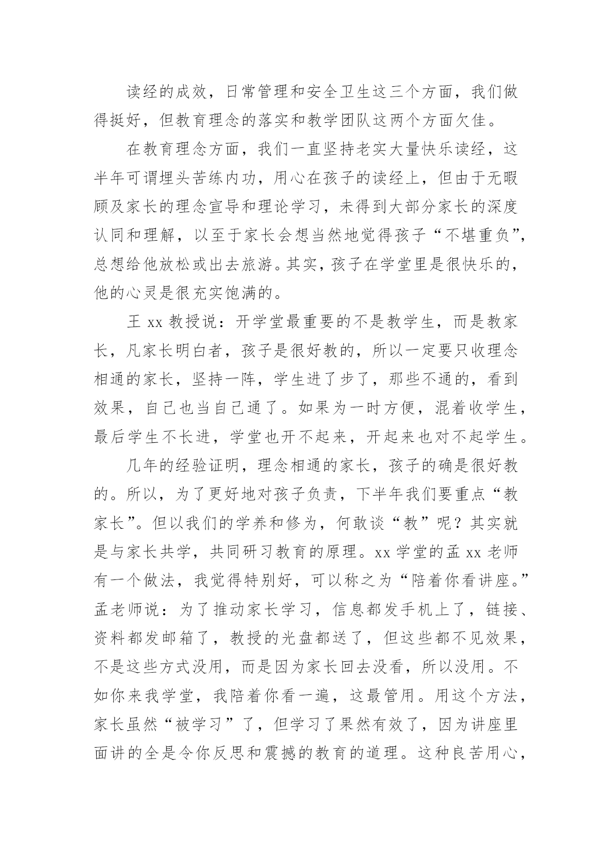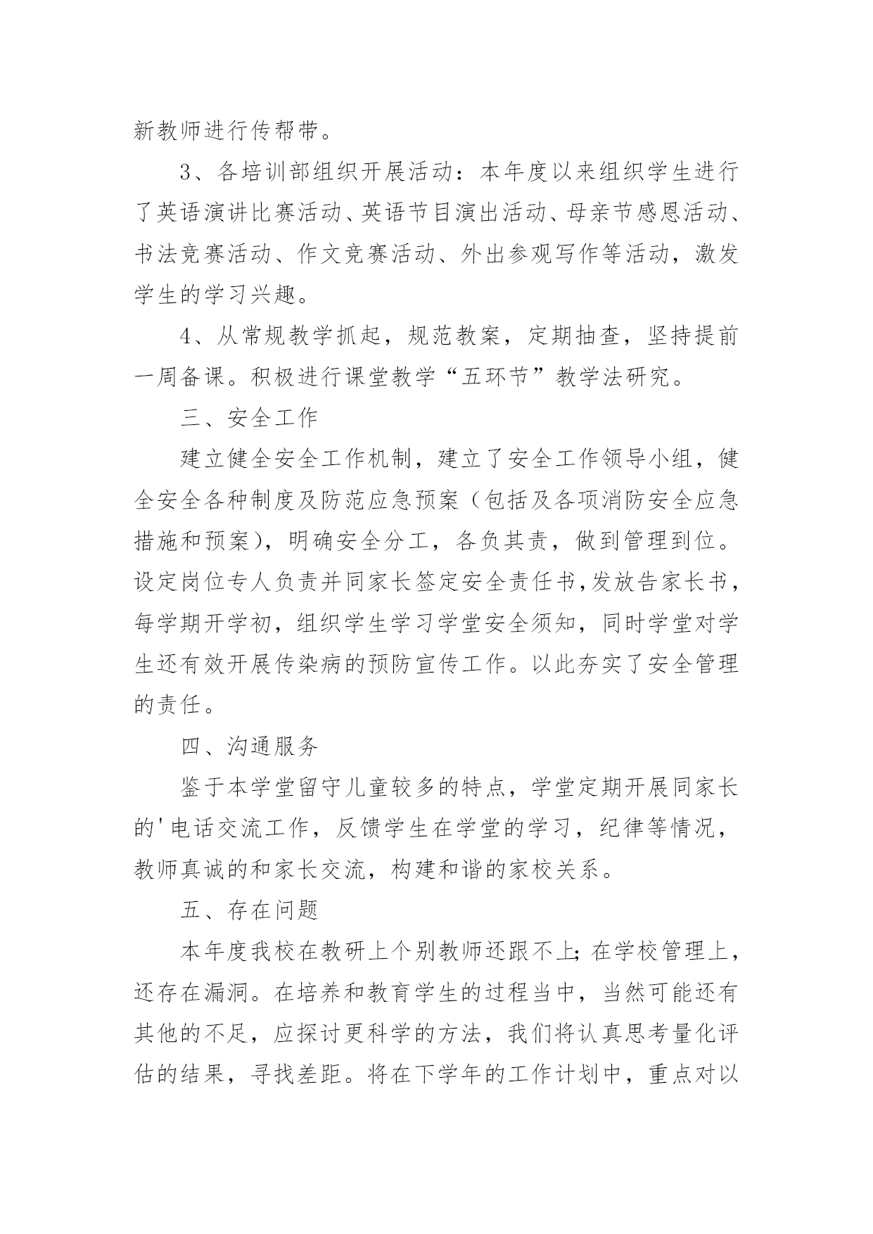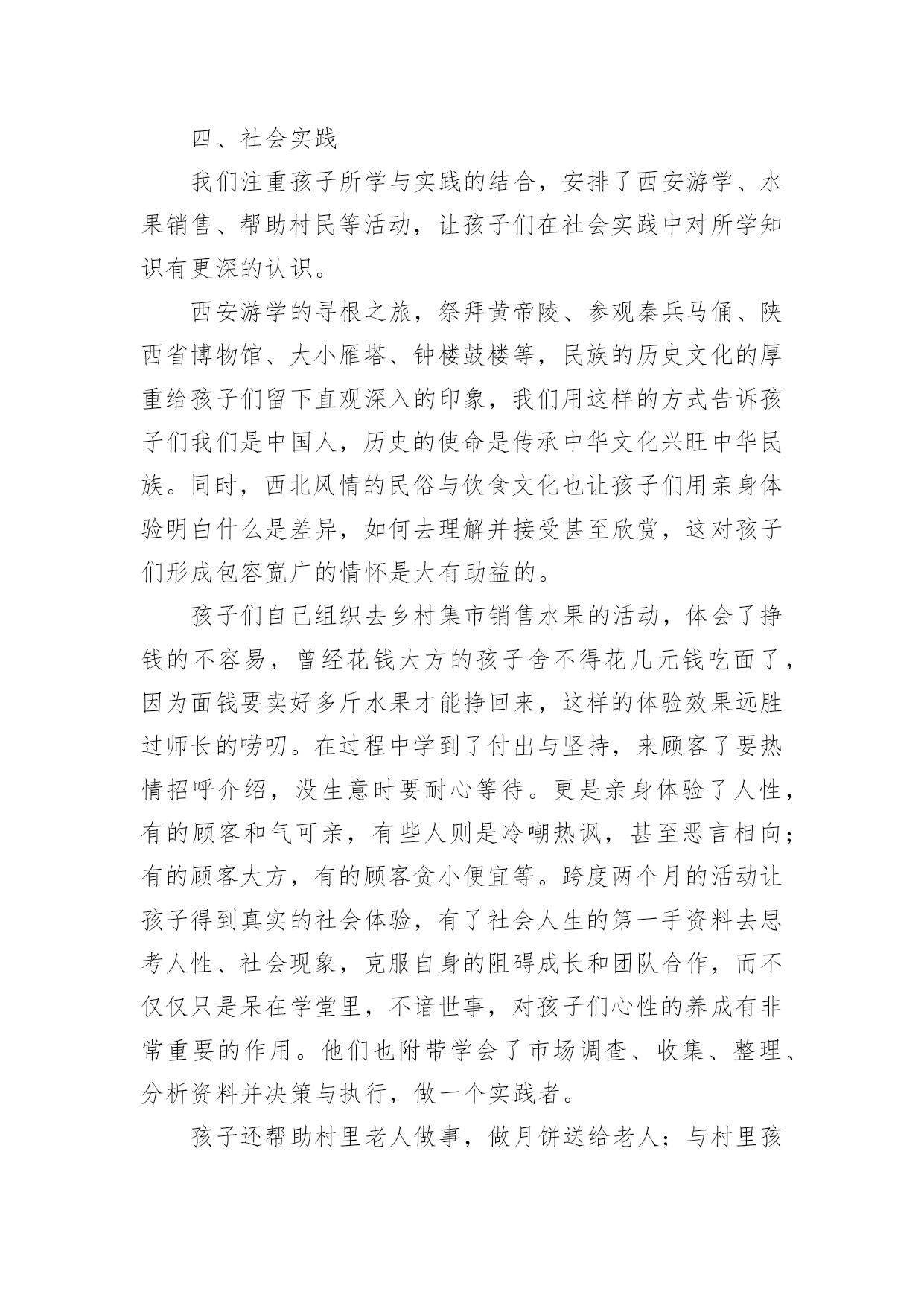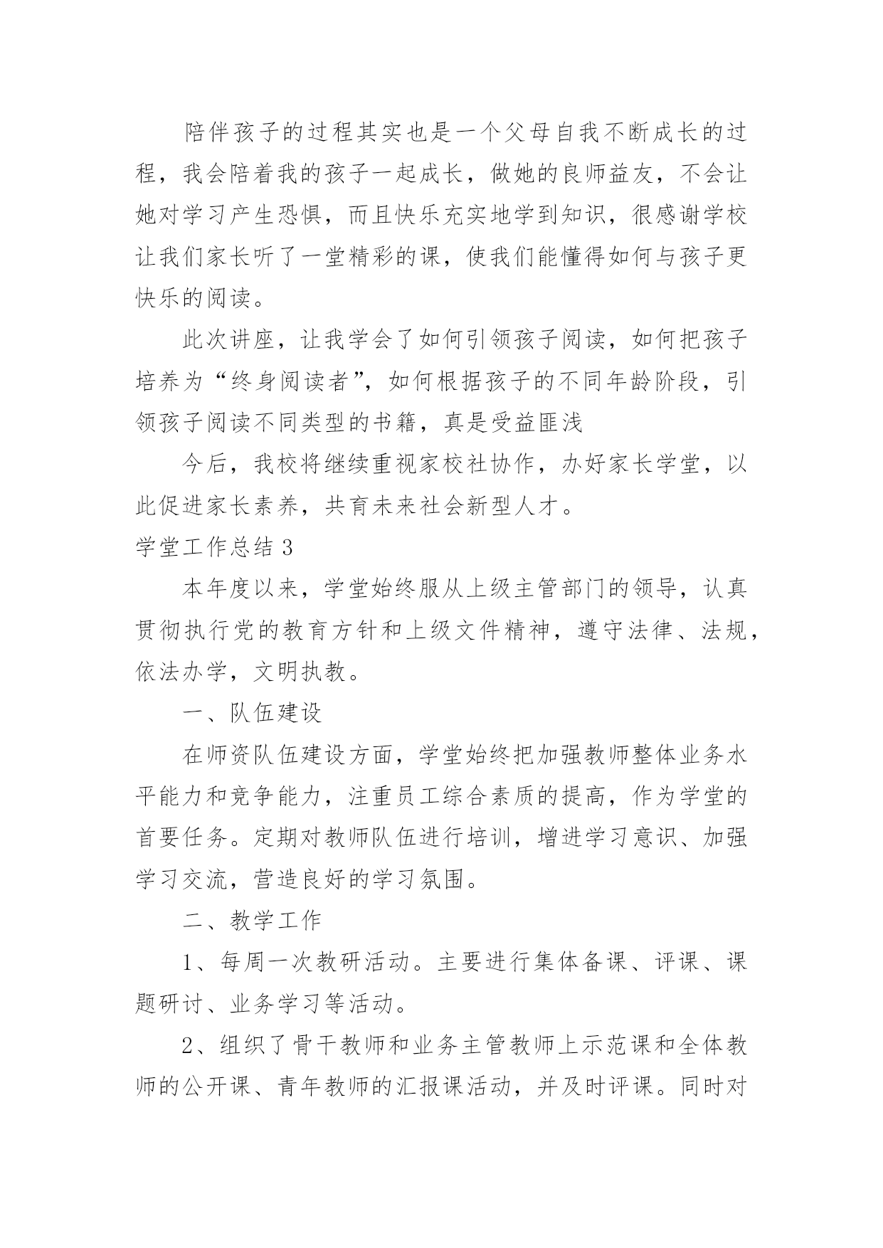 学堂工作总结学堂工作总结总结是对过去一定时期的工作、学习或思想情况进行回顾、分析,并做出客观评价的书面材料,写总结有利于我们学习和工作能力的提高,因此,让我们写一份总结吧。你所见过的总结应该是什么样的?以下是小编帮大家整理的学堂工作总结,欢迎阅读,希望大家能够喜欢。学堂工作总结1xx学堂是由数名热心新教育的家长与教师组建,秉持着“教其心,育其身”的教学宗旨组织教学工作。20xx年虽然经历波折,仍不改初心,坚定走新教育之路,现就一年中的主要工作按身体健康、生活能力、心理与行为教育、社会实践、知识学习等方面总结。一、身体健康1、当初学堂选址青城山,著名的养生胜地,空气清新,阳光充足,水源无污染,大环境是孩子健康的基础保障。2、食材安全,蔬菜是村民自种,食用油是小油作坊榨的,面条是镇上的小店现作的,肉食买村民自养的猪鸡等。3、作息规律,严格要求,按照中医养生的节律安排作息时间。4、体育锻炼,请青城派弟子任武术教练,教授青城派的基础拳法,涵盖了武林基本功中静功、桩功、动功内容,具有养生健身的功效,通过这些练习,调动体内气血,打通身体经络,排除体内毒素,恢复身体各方面的机能。学生们在接受传统武术教学同时,也进行长跑、球类等兴趣体育活动,身体素质大大提高。5、通过严格的军训,孩子们的耐力、毅力与勇敢精神一同进步,规则意识有很大提升,男孩子初显刚毅勇猛,女孩子有了飒爽英姿的模样。二、生活能力1、培养孩子幸福生活的能力。现在孩子普遍自理能力较差,学堂要求孩子自己事自己做,从个人洗漱、洗衣、整理床铺衣柜、做简单的饭吃到承担公共区域卫生、照顾小班孩子、自己组织排练节日活动等,在这过程中孩子的独立性与责任感一点点建立,在小事简单事的重复中建立责任与秩序,体会到成就与价值。2、动手能力提高了。如组装自行车,组装课桌,做狗屋,缝衣服、自己做饭做月饼葱油饼、包饺子、烧烤、火锅、采茶、制作风筝、搭帐篷等。3、学堂所在地有丰富的自然人文资源,为周末徒步骑行野营等活动提供了很好的去处。如,去了都江堰,青城山,凤栖山,光严禅寺,普照寺、药王庙,昆虫博物馆、根雕艺术馆,明清家具厂,茶叶厂,面条作坊,榨油作坊,酒作坊,农村集市等,大大开阔了孩子们的眼界。4、孩子们自养动物(狗,猫、鸡,鸭,兔、乌龟、鱼、仓鼠等),在实践中学习责任与承担。如养狗,就去查相关资料,看看如何照顾好狗,狗生病了怎么办,每天准备狗食,打扫狗舍,给狗洗澡等。5、课余生活,跳舞,画画,手工,音乐,自编自演舞台剧、歌曲等。三、心理和行为教育心理和行为教育是学堂教学的核心。针对孩子们普通存在的自信心弱的状况,还有多年形成的盲目攀比、贬低别人、自卑、抱怨等负面情绪,引导学生接受个体间差异,认识到自己与别人不同,坚决做好“三比”:自己与自己比、这次与上次比、今天与昨天比,通过自己的努力和不断挑战超越自我来取得成就感和价值感。责任心是一个优秀的人最根本的品质,针对部分孩子运动不及时、清洁不干净、个人物品乱摆放等问题,组织孩子们讨论明确自己的责任以及不承担责任的后果,把责任还给孩子,让孩子充分体验,去感受责任,管理好自己。执行后,孩子的体能提高了,清洁越来越干净,个人物品开始有序地摆放了,从这些生活细节上着手,孩子们的责任心一点点的构建。针对青春期的孩子,我们开展了青春期教育,了解两性生长的差异,如何与异性交往,如何保持青春期卫生等。学堂一直在营造充满爱的'大家庭氛围,让每个孩子都感受到爱,在其中学习爱、尊重、宽容等最基本最重要的人生功课。这些功课融合在日常教学生活之中,孩子们也一点点在进步,相信他们会越来越优秀。四、社会实践我们注重孩子所学与实践的结合,安排了西安游学、水果销售、帮助村民等活动,让孩子们在社会实践中对所学知识有更深的认识。西安游学的寻根之旅,祭拜黄帝陵、参观秦兵马俑、陕西省博物馆、大小雁塔、钟楼鼓楼等,民族的历史文化的厚重给孩子们留下直观深入的印象,我们用这样的方式告诉孩子们我们是中国人,历史的使命是传承中华文化兴旺中华民族。同时,西北风情的民俗与饮食文化也让孩子们用亲身体验明白什么是差异,如何去理解并接受甚至欣赏,这对孩子们形成包容宽广的情怀是大有助益的。孩子们自己组织去乡村集市销售水果的活动,体会了挣钱的不容易,曾经花钱大方的孩子舍不得花几元钱吃面了,因为面钱要卖好多斤水果才能挣回来,这样的体验效果远胜过师长的唠叨。在过程中学到了付出与坚持,来顾客了要热情招呼介绍,没生意时要耐心等待。更是亲身体验了人性,有的顾客和气可亲,有些人则是冷嘲热讽,甚至恶言相向;有的顾客大方,有的顾客贪小便宜等。跨度两个月的活动让孩子得到真实的社会体验,有了社会人生的第一手资料去思考人性、社会现象,克服自身的阻碍成长和团队合作,而不仅仅只是呆在学堂里,不谙世事,对孩子们心性的养成有非常重要的作用。他们也附带