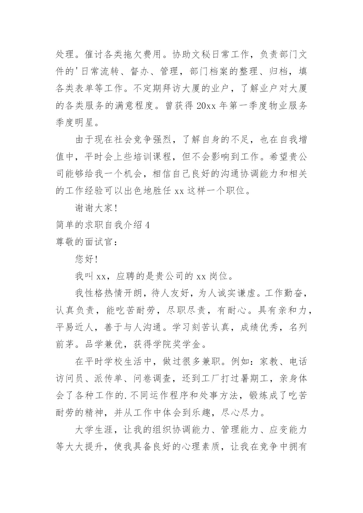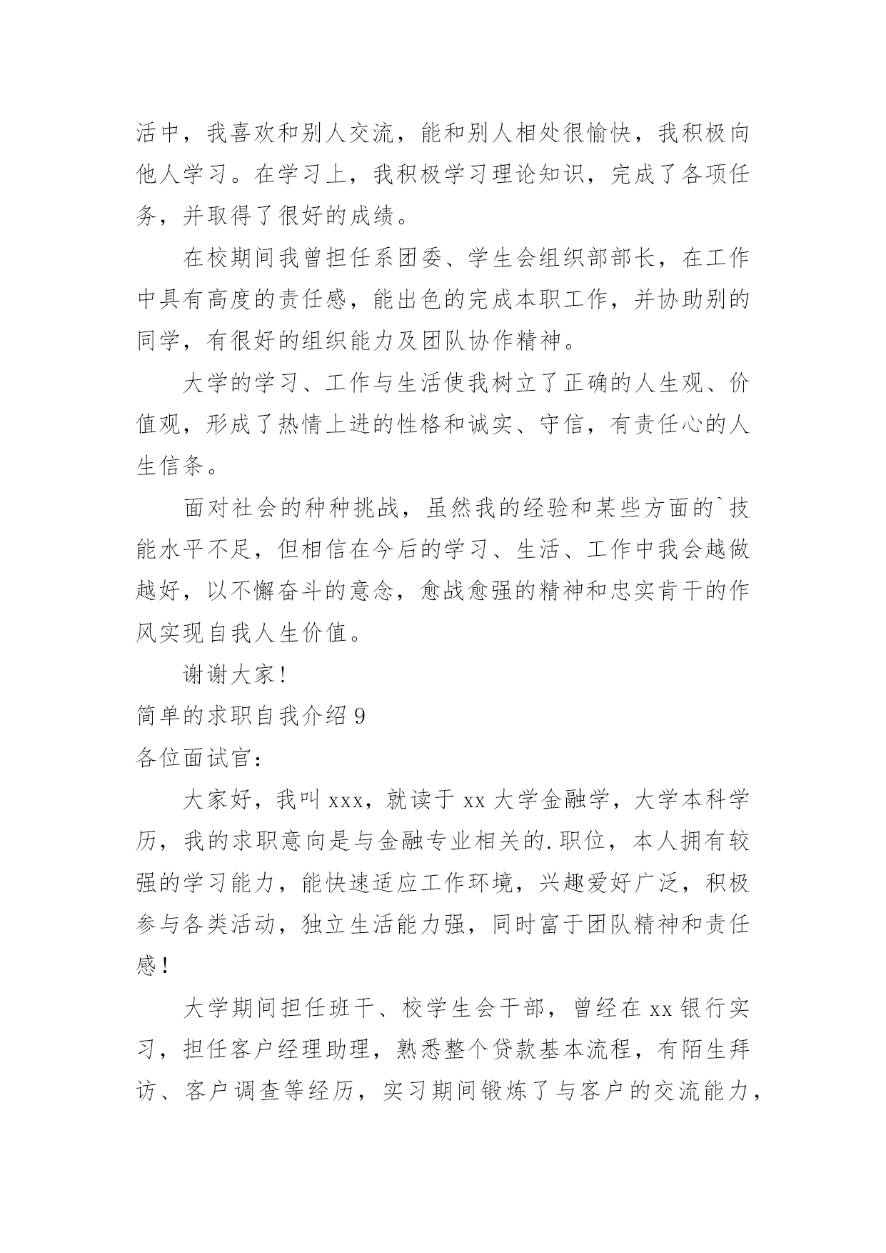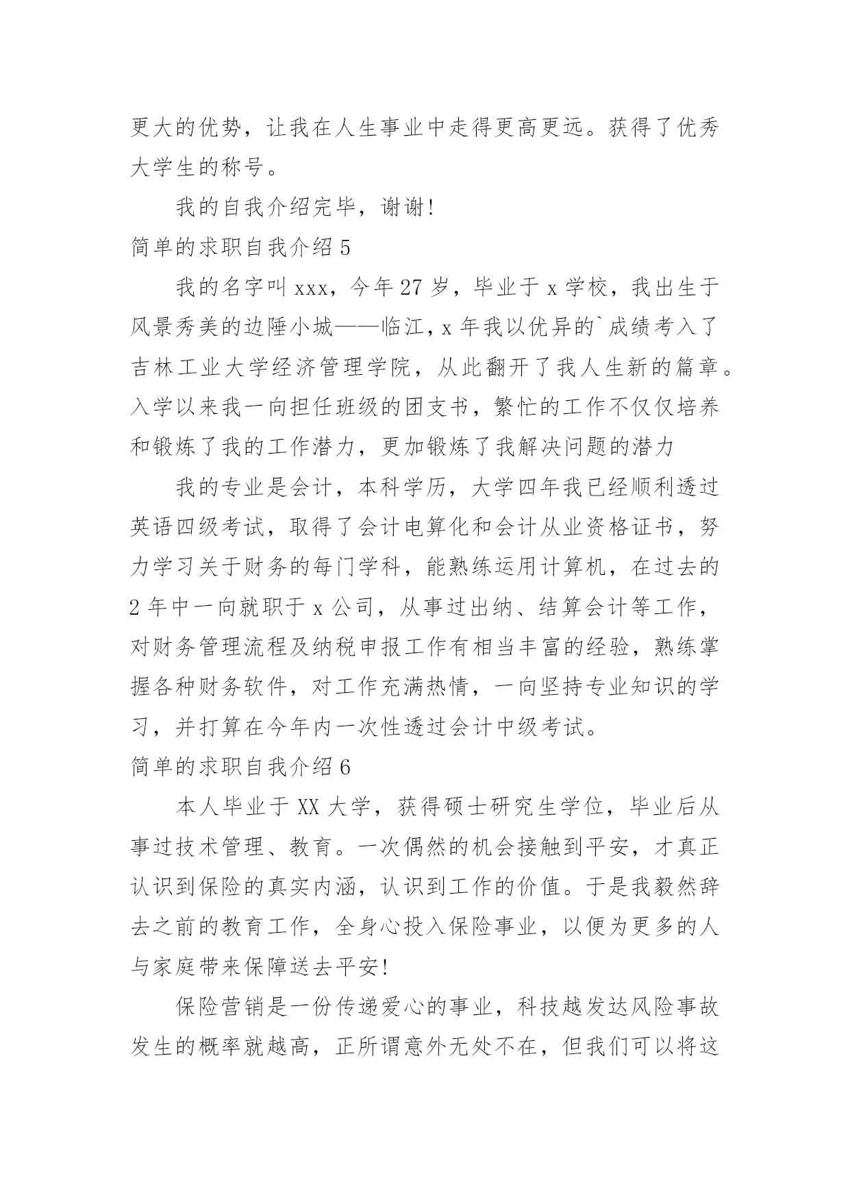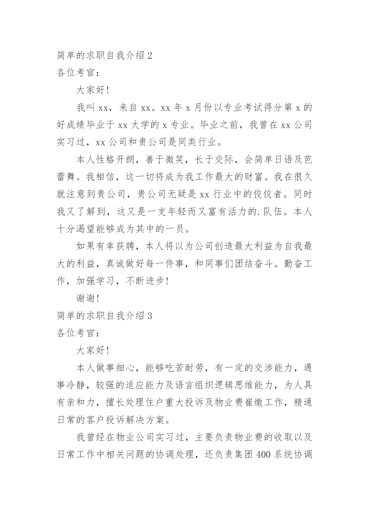 简单的求职自我介绍简单的求职自我介绍当碰到陌生人时候,我们有必要进行适当的自我介绍,用自我介绍往往可以来展示自己。那么你真的会写自我介绍吗?下面是小编整理的简单的求职自我介绍,仅供参考,欢迎大家阅读。简单的求职自我介绍1尊敬的招聘主管:您好!我是倪博尔,是xx学校工商管理专业的一名应届毕业生,我在班上担任了班干部,配合了其他干部的工作,积极为同学们服务。在学习上,我全力学好每门专业课程,让自己的`专业知识更坚实,为自己以后的工作奠定坚实的基础,在课余时间,我报了自学考试,现已通过了十门,并且获得了“助理物流师”以及“英语四级证书”和计算机二级证书”。通过做兼职和实习,也让我积累了一些经验。我性格开朗,自信热情,做事脚踏实地、做事稳重、有责任心、能吃苦耐劳,富有时间观念,富有团队合作精神和集体荣誉感及企业忠诚度。待人真诚,喜欢交际。作为一名应届毕业生,可能我没有足够的经验,但是我的适应能力强,学习能力强,我相信如果我应聘上,我相信我一定能做好。谢谢大家!简单的求职自我介绍2各位考官:大家好!我叫xx,来自xx。xx年x月份以专业考试得分第x的好成绩毕业于xx大学的x专业。毕业之前,我曾在xx公司实习过,xx公司和贵公司是同类行业。本人性格开朗,善于微笑,长于交际,会简单日语及芭蕾舞。我相信,这一切将成为我工作最大的财富。我在很久就注意到贵公司,贵公司无疑是xx行业中的佼佼者。同时我又了解到,这又是一支年轻而又富有活力的.队伍。本人十分渴望能够成为其中的一员。如果有幸获聘,本人将以为公司创造最大利益为自我最大的利益,真诚做好每一件事,和同事们团结奋斗。勤奋工作,加强学习,不断进步!谢谢!简单的求职自我介绍3各位考官:大家好!本人做事细心,能够吃苦耐劳,有一定的交涉能力,遇事冷静,较强的适应能力及语言组织逻辑思维能力,为人具有亲和力,擅长处理住户重大投诉及物业费崔缴工作,精通日常的客户投诉解决方案。我曾经在物业公司实习过,主要负责物业费的收取以及日常工作中相关问题的协调处理,还负责集团400系统协调处理。催讨各类拖欠费用。协助文秘日常工作,负责部门文件的'日常流转、督办、管理,部门档案的整理、归档,填各类表单等工作。不定期拜访大厦的业户,了解业户对大厦的各类服务的满意程度。曾获得20xx年第一季度物业服务季度明星。由于现在社会竞争强烈,了解自身的不足,也在自我增值中,平时会上些培训课程,但不会影响到工作。希望贵公司能够给我一个机会,相信自己良好的沟通协调能力和相关的工作经验可以出色地胜任xx这样一个职位。谢谢大家!简单的求职自我介绍4尊敬的面试官:您好!我叫xx,应聘的是贵公司的xx岗位。我性格热情开朗,待人友好,为人诚实谦虚。工作勤奋,认真负责,能吃苦耐劳,尽职尽责,有耐心。具有亲和力,平易近人,善于与人沟通。学习刻苦认真,成绩优秀,名列前茅。品学兼优,获得学院奖学金。在平时学校生活中,做过很多兼职。例如:家教、电话访问员、派传单、问卷调查,还到工厂打过暑期工,亲身体会了各种工作的.不同运作程序和处事方法,锻炼成了吃苦耐劳的精神,并从工作中体会到乐趣,尽心尽力。大学生涯,让我的组织协调能力、管理能力、应变能力等大大提升,使我具备良好的心理素质,让我在竞争中拥有更大的优势,让我在人生事业中走得更高更远。获得了优秀大学生的称号。我的自我介绍完毕,谢谢!简单的求职自我介绍5我的名字叫xxx,今年27岁,毕业于x学校,我出生于风景秀美的边陲小城——临江,x年我以优异的`成绩考入了吉林工业大学经济管理学院,从此翻开了我人生新的篇章。入学以来我一向担任班级的团支书,繁忙的工作不仅仅培养和锻炼了我的工作潜力,更加锻炼了我解决问题的潜力我的专业是会计,本科学历,大学四年我已经顺利透过英语四级考试,取得了会计电算化和会计从业资格证书,努力学习关于财务的每门学科,能熟练运用计算机,在过去的2年中一向就职于x公司,从事过出纳、结算会计等工作,对财务管理流程及纳税申报工作有相当丰富的经验,熟练掌握各种财务软件,对工作充满热情,一向坚持专业知识的学习,并打算在今年内一次性透过会计中级考试。简单的求职自我介绍6本人毕业于XX大学,获得硕士研究生学位,毕业后从事过技术管理、教育。一次偶然的机会接触到平安,才真正认识到保险的真实内涵,认识到工作的价值。于是我毅然辞去之前的教育工作,全身心投入保险事业,以便为更多的人与家庭带来保障送去平安!保险营销是一份传递爱心的事业,科技越发达风险事故发生的概率就越高,正所谓意外无处不在,但我们可以将这样的风险有效地转移给保险公司,让自己有个保障,同时对身边的'亲人也是责任心的体现。选择保险,要考虑三个问题:第一选择一个实力较好的保险公司;第二看这份保单是否适合自己;第三就是业务员的服务。我为人很真诚,非常乐意帮助别人,必定