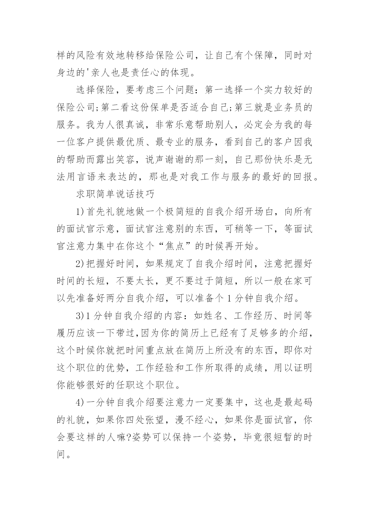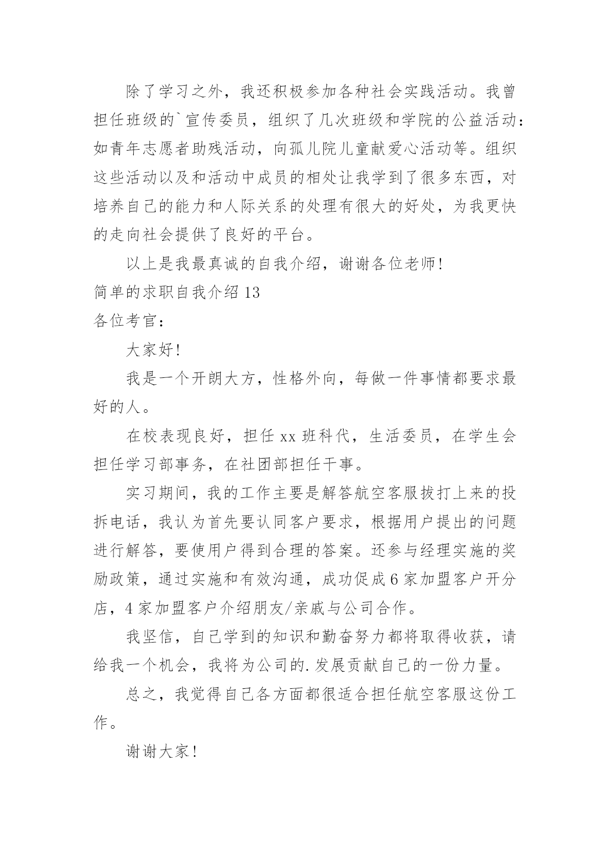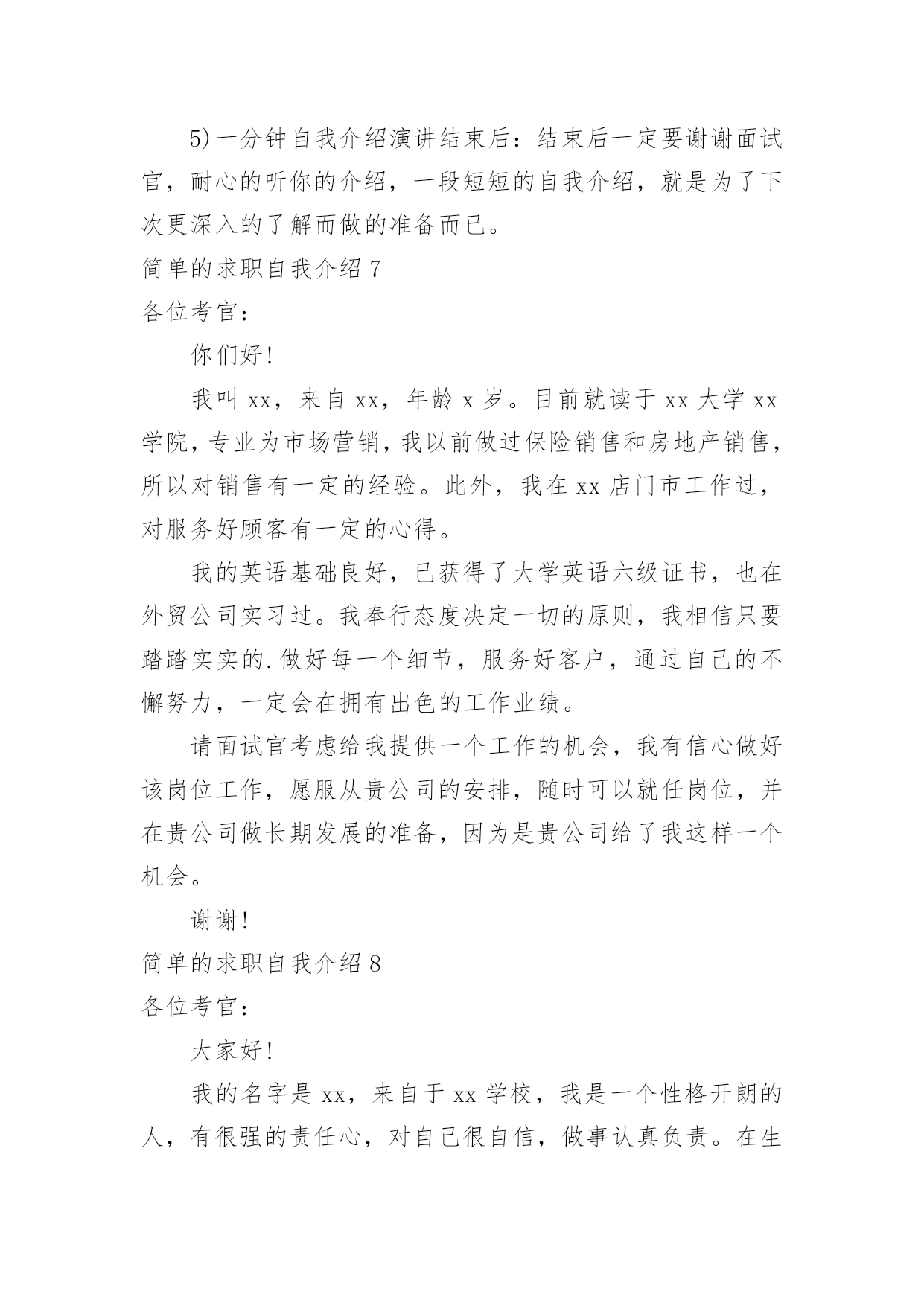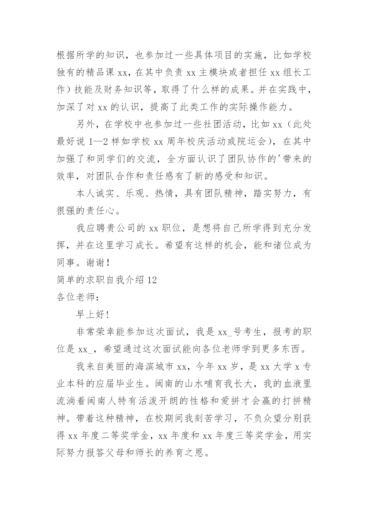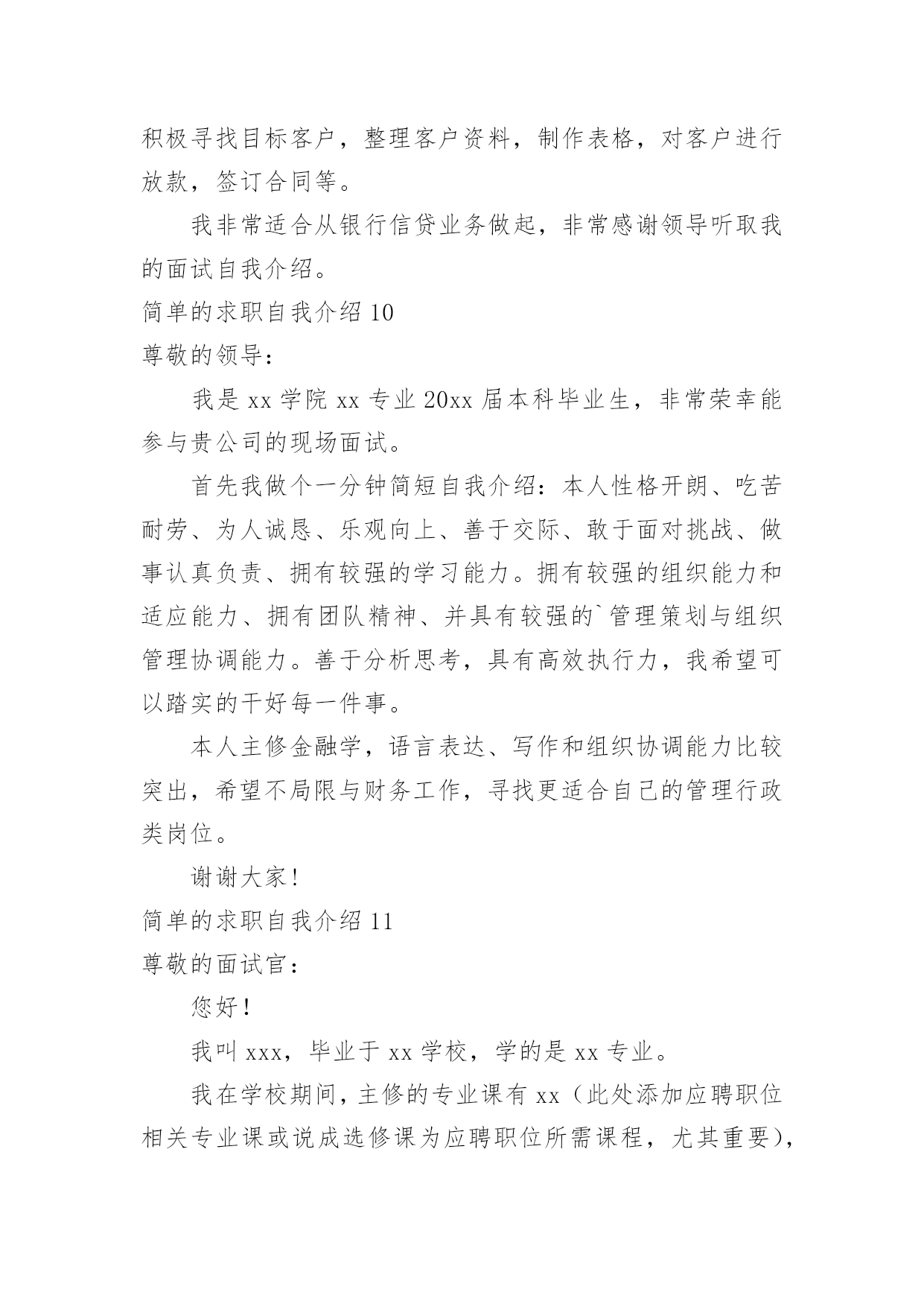 简单的求职自我介绍简单的求职自我介绍当碰到陌生人时候,我们有必要进行适当的自我介绍,用自我介绍往往可以来展示自己。那么你真的会写自我介绍吗?下面是小编整理的简单的求职自我介绍,仅供参考,欢迎大家阅读。简单的求职自我介绍1尊敬的招聘主管:您好!我是倪博尔,是xx学校工商管理专业的一名应届毕业生,我在班上担任了班干部,配合了其他干部的工作,积极为同学们服务。在学习上,我全力学好每门专业课程,让自己的`专业知识更坚实,为自己以后的工作奠定坚实的基础,在课余时间,我报了自学考试,现已通过了十门,并且获得了“助理物流师”以及“英语四级证书”和计算机二级证书”。通过做兼职和实习,也让我积累了一些经验。我性格开朗,自信热情,做事脚踏实地、做事稳重、有责任心、能吃苦耐劳,富有时间观念,富有团队合作精神和集体荣誉感及企业忠诚度。待人真诚,喜欢交际。作为一名应届毕业生,可能我没有足够的经验,但是我的适应能力强,学习能力强,我相信如果我应聘上,我相信我一定能做好。谢谢大家!简单的求职自我介绍2各位考官:大家好!我叫xx,来自xx。xx年x月份以专业考试得分第x的好成绩毕业于xx大学的x专业。毕业之前,我曾在xx公司实习过,xx公司和贵公司是同类行业。本人性格开朗,善于微笑,长于交际,会简单日语及芭蕾舞。我相信,这一切将成为我工作最大的财富。我在很久就注意到贵公司,贵公司无疑是xx行业中的佼佼者。同时我又了解到,这又是一支年轻而又富有活力的.队伍。本人十分渴望能够成为其中的一员。如果有幸获聘,本人将以为公司创造最大利益为自我最大的利益,真诚做好每一件事,和同事们团结奋斗。勤奋工作,加强学习,不断进步!谢谢!简单的求职自我介绍3各位考官:大家好!本人做事细心,能够吃苦耐劳,有一定的交涉能力,遇事冷静,较强的适应能力及语言组织逻辑思维能力,为人具有亲和力,擅长处理住户重大投诉及物业费崔缴工作,精通日常的客户投诉解决方案。我曾经在物业公司实习过,主要负责物业费的收取以及日常工作中相关问题的协调处理,还负责集团400系统协调处理。催讨各类拖欠费用。协助文秘日常工作,负责部门文件的'日常流转、督办、管理,部门档案的整理、归档,填各类表单等工作。不定期拜访大厦的业户,了解业户对大厦的各类服务的满意程度。曾获得20xx年第一季度物业服务季度明星。由于现在社会竞争强烈,了解自身的不足,也在自我增值中,平时会上些培训课程,但不会影响到工作。希望贵公司能够给我一个机会,相信自己良好的沟通协调能力和相关的工作经验可以出色地胜任xx这样一个职位。谢谢大家!简单的求职自我介绍4尊敬的面试官:您好!我叫xx,应聘的是贵公司的xx岗位。我性格热情开朗,待人友好,为人诚实谦虚。工作勤奋,认真负责,能吃苦耐劳,尽职尽责,有耐心。具有亲和力,平易近人,善于与人沟通。学习刻苦认真,成绩优秀,名列前茅。品学兼优,获得学院奖学金。在平时学校生活中,做过很多兼职。例如:家教、电话访问员、派传单、问卷调查,还到工厂打过暑期工,亲身体会了各种工作的.不同运作程序和处事方法,锻炼成了吃苦耐劳的精神,并从工作中体会到乐趣,尽心尽力。大学生涯,让我的组织协调能力、管理能力、应变能力等大大提升,使我具备良好的心理素质,让我在竞争中拥有更大的优势,让我在人生事业中走得更高更远。获得了优秀大学生的称号。我的自我介绍完毕,谢谢!简单的求职自我介绍5我的名字叫xxx,今年27岁,毕业于x学校,我出生于风景秀美的边陲小城——临江,x年我以优异的`成绩考入了吉林工业大学经济管理学院,从此翻开了我人生新的篇章。入学以来我一向担任班级的团支书,繁忙的工作不仅仅培养和锻炼了我的工作潜力,更加锻炼了我解决问题的潜力我的专业是会计,本科学历,大学四年我已经顺利透过英语四级考试,取得了会计电算化和会计从业资格证书,努力学习关于财务的每门学科,能熟练运用计算机,在过去的2年中一向就职于x公司,从事过出纳、结算会计等工作,对财务管理流程及纳税申报工作有相当丰富的经验,熟练掌握各种财务软件,对工作充满热情,一向坚持专业知识的学习,并打算在今年内一次性透过会计中级考试。简单的求职自我介绍6本人毕业于XX大学,获得硕士研究生学位,毕业后从事过技术管理、教育。一次偶然的机会接触到平安,才真正认识到保险的真实内涵,认识到工作的价值。于是我毅然辞去之前的教育工作,全身心投入保险事业,以便为更多的人与家庭带来保障送去平安!保险营销是一份传递爱心的事业,科技越发达风险事故发生的概率就越高,正所谓意外无处不在,但我们可以将这样的风险有效地转移给保险公司,让自己有个保障,同时对身边的'亲人也是责任心的体现。选择保险,要考虑三个问题:第一选择一个实力较好的保险公司;第二看这份保单是否适合自己;第三就是业务员的服务。我为人很真诚,非常乐意帮助别人,必定