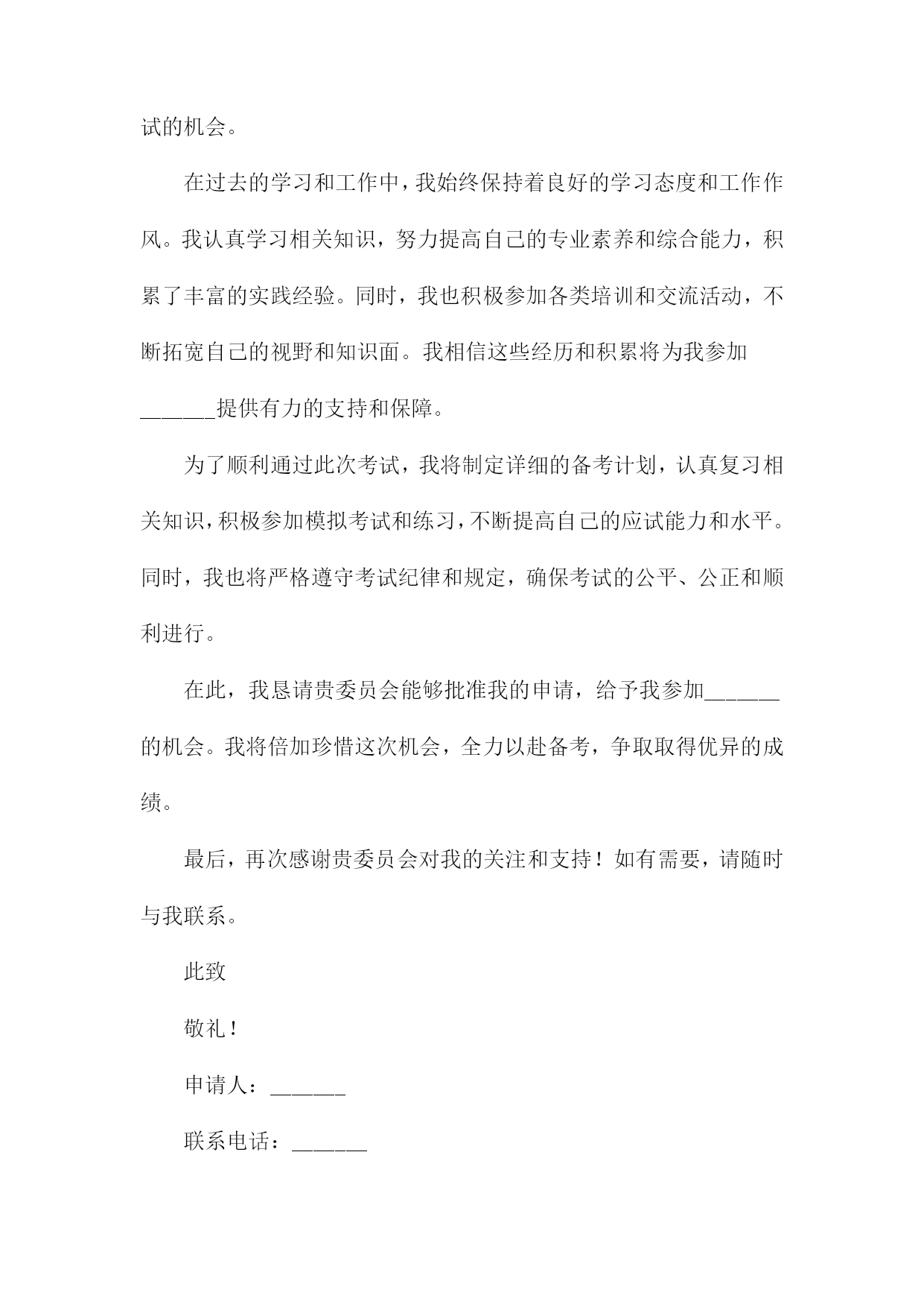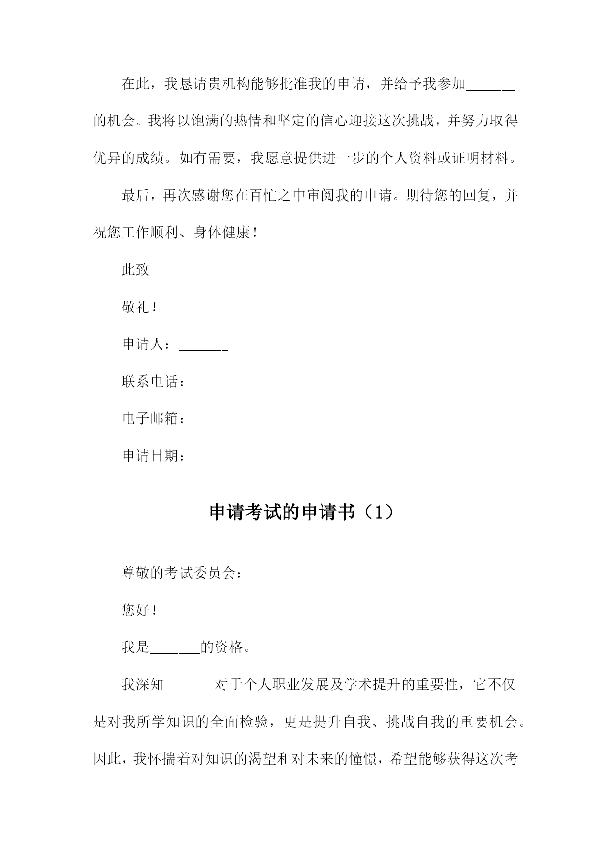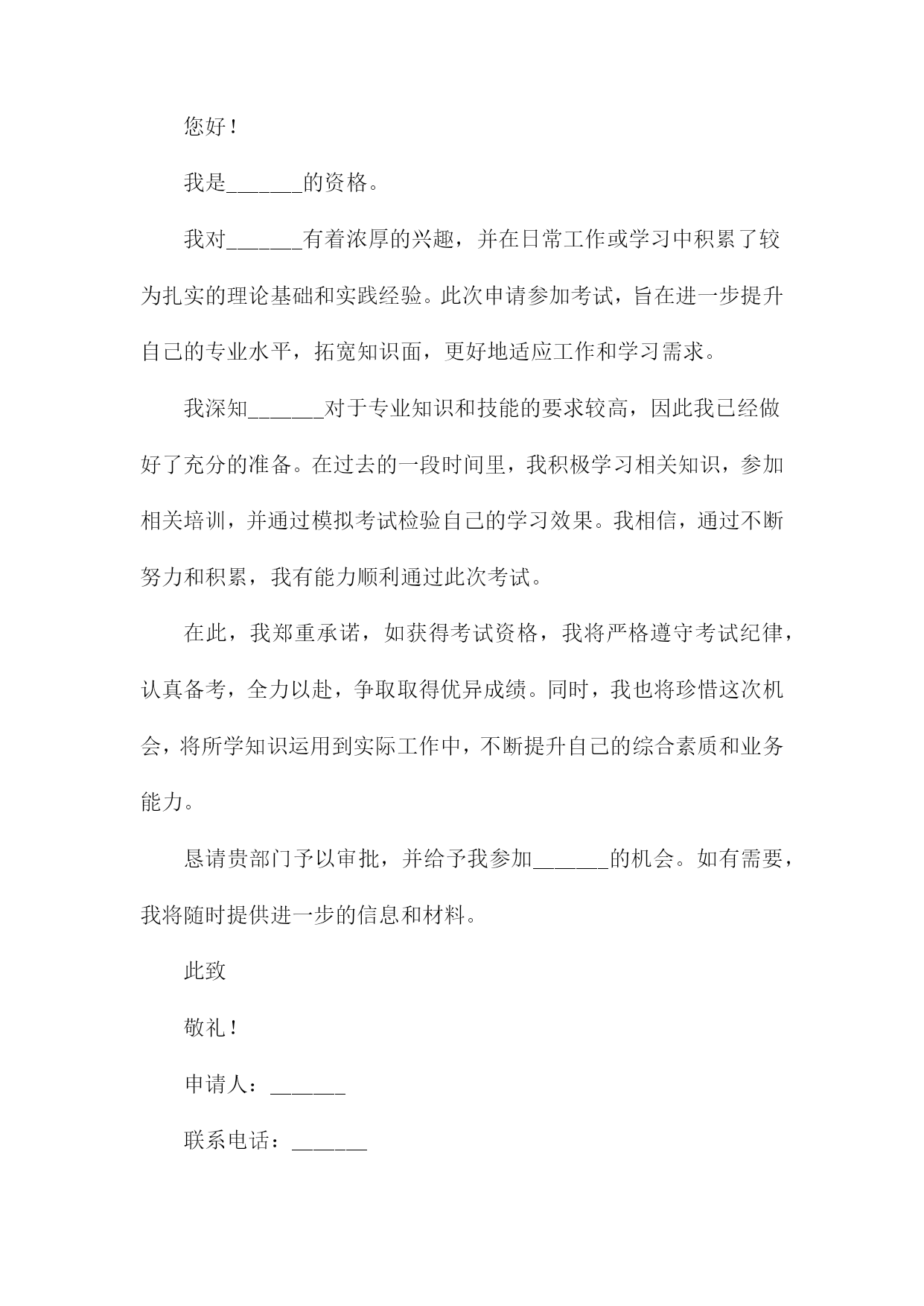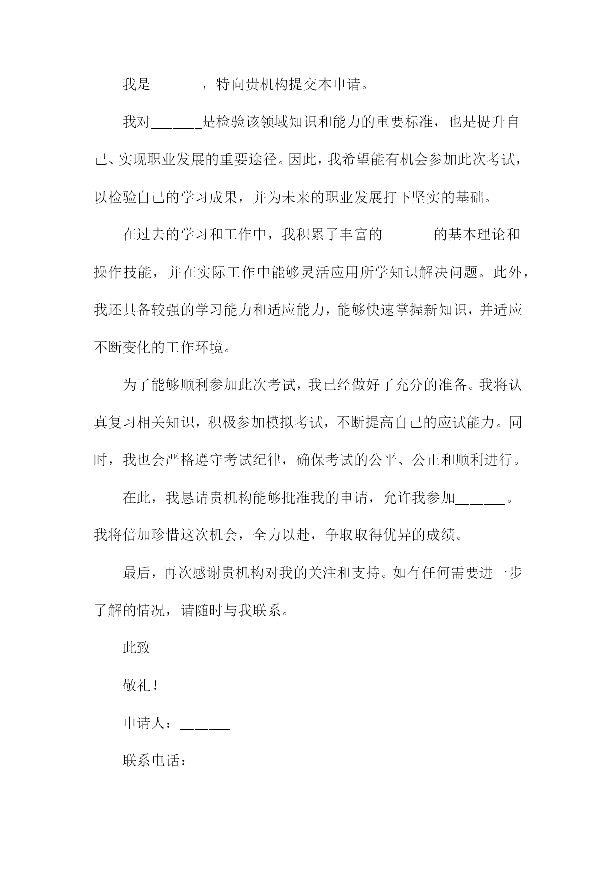 申请考试的申请书尊敬的考试机构负责人:您好!我谨以此信向您表达我参加_______的强烈愿望,并申请获得考试资格。我深知这次考试对我个人发展及未来职业规划的重要性,因此,我特向贵机构提交此申请书,希望能得到您的支持与批准。首先,请允许我简要介绍自己的基本情况。我叫_______充满热情,并一直努力提升自己的专业素养和实践能力。在校期间,我积极参加各类学术活动和实践项目,取得了良好的成绩和丰富的经验。关于申请参加_______的原因,我认为这次考试不仅是对我所学知识的检验,更是提升自我、挑战自我的绝佳机会。通过参加此次考试,我能够更全面地了解自己的专业水平,发现自身的不足之处,并针对性地加以改进。同时,我也相信这次考试将成为我未来求职和升学的重要参考依据,为我未来的职业发展奠定坚实的基础。为了确保能够顺利通过考试,我已经制定了详细的备考计划。我将充分利用课余时间,系统复习相关课程知识,并通过做题、模拟考试等方式提高自己的应试能力。此外,我还将积极参加各类辅导课程和讲座,以拓宽视野、提升专业素养。在此,我恳请贵机构能够批准我的申请,并给予我参加_______的机会。我将以饱满的热情和坚定的信心迎接这次挑战,并努力取得优异的成绩。如有需要,我愿意提供进一步的个人资料或证明材料。最后,再次感谢您在百忙之中审阅我的申请。期待您的回复,并祝您工作顺利、身体健康!此致敬礼!申请人:_______联系电话:_______电子邮箱:_______申请日期:_______申请考试的申请书(1)尊敬的考试委员会:您好!我是_______的资格。我深知_______对于个人职业发展及学术提升的重要性,它不仅是对我所学知识的全面检验,更是提升自我、挑战自我的重要机会。因此,我怀揣着对知识的渴望和对未来的憧憬,希望能够获得这次考试的机会。在过去的学习和工作中,我始终保持着良好的学习态度和工作作风。我认真学习相关知识,努力提高自己的专业素养和综合能力,积累了丰富的实践经验。同时,我也积极参加各类培训和交流活动,不断拓宽自己的视野和知识面。我相信这些经历和积累将为我参加_______提供有力的支持和保障。为了顺利通过此次考试,我将制定详细的备考计划,认真复习相关知识,积极参加模拟考试和练习,不断提高自己的应试能力和水平。同时,我也将严格遵守考试纪律和规定,确保考试的公平、公正和顺利进行。在此,我恳请贵委员会能够批准我的申请,给予我参加_______的机会。我将倍加珍惜这次机会,全力以赴备考,争取取得优异的成绩。最后,再次感谢贵委员会对我的关注和支持!如有需要,请随时与我联系。此致敬礼!申请人:_______联系电话:_______电子邮箱:_______申请日期:_______请根据您实际情况,替换或补充_______内的具体内容。此外,还可以根据您的实际需求对申请书的结构和内容进行调整,确保其准确反映您的意图和情况。申请考试的申请书(2)尊敬的考试机构负责人:您好!我谨以此信表达我对于参加贵机构所主办的考试的强烈意愿,并正式提交我的申请。我深知这次考试对于我的学术和职业发展具有重要意义,因此我希望能获得您的批准,以便我能有机会参加这次考试。首先,请允许我简要介绍一下自己的背景。我是一名来自XX大学XX专业的学生,目前正处于学习的关键阶段。我一直以来都对所学专业充满热情,并致力于提升自己的学术水平和专业能力。通过参加贵机构的考试,我相信我能够更全面地检验自己的学习成果,并进一步提高自己的综合素质。关于我选择参加这次考试的原因,主要有以下几点:首先,这次考试的内容与我的专业方向高度契合,能够帮助我深入理解和掌握专业知识;其次,通过考试,我可以与来自不同背景和领域的优秀考生进行交流和切磋,从而拓宽我的视野和思路;最后,这次考试的成绩也将对我未来的学术和职业发展产生积极影响,为我提供更多的机会和可能性。为了确保能够顺利参加考试,我已经做好了充分的准备。我会认真复习相关知识和技能,制定详细的备考计划,并积极参加模拟考试和练习。同时,我也会遵守考试纪律和规定,确保自己能够以诚信的态度参加考试。在此,我恳请贵机构能够批准我的申请,并为我提供参加考试的机会。我将倍加珍惜这次机会,全力以赴地备考和参加考试,争取取得优异的成绩。最后,再次感谢您在百忙之中审阅我的申请。如有需要,请随时与我联系,我的联系方式为:_______。此致敬礼!申请考试的申请书(3)尊敬的考试机构负责人:您好!我是_______,特向贵机构提交本申请。我对_______是检验该领域知识和能力的重要标准,也是提升自己、实现职业发展的重要途径。因此,我希望能有机会参加此次考试,以检验自己的学习成果,并为未来的职业发展