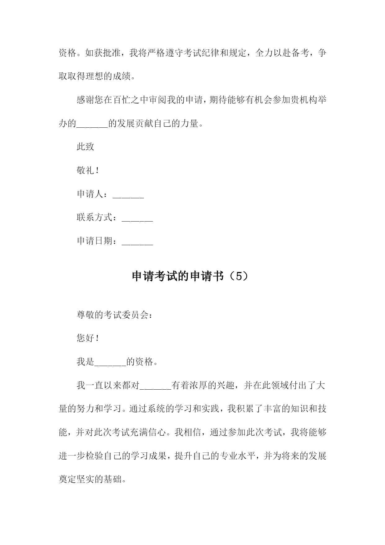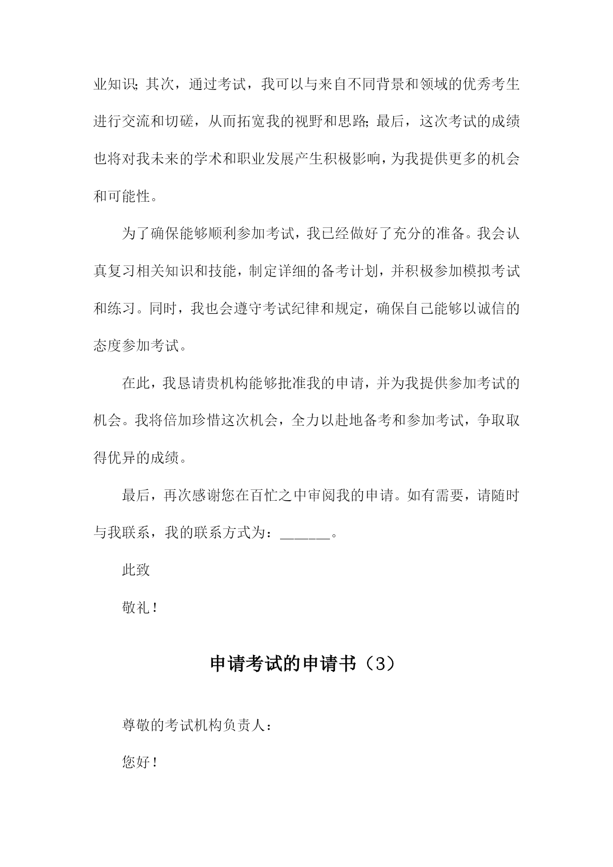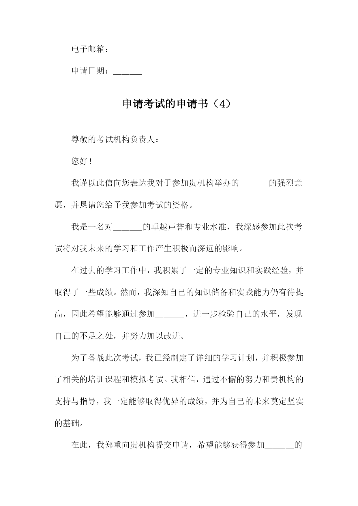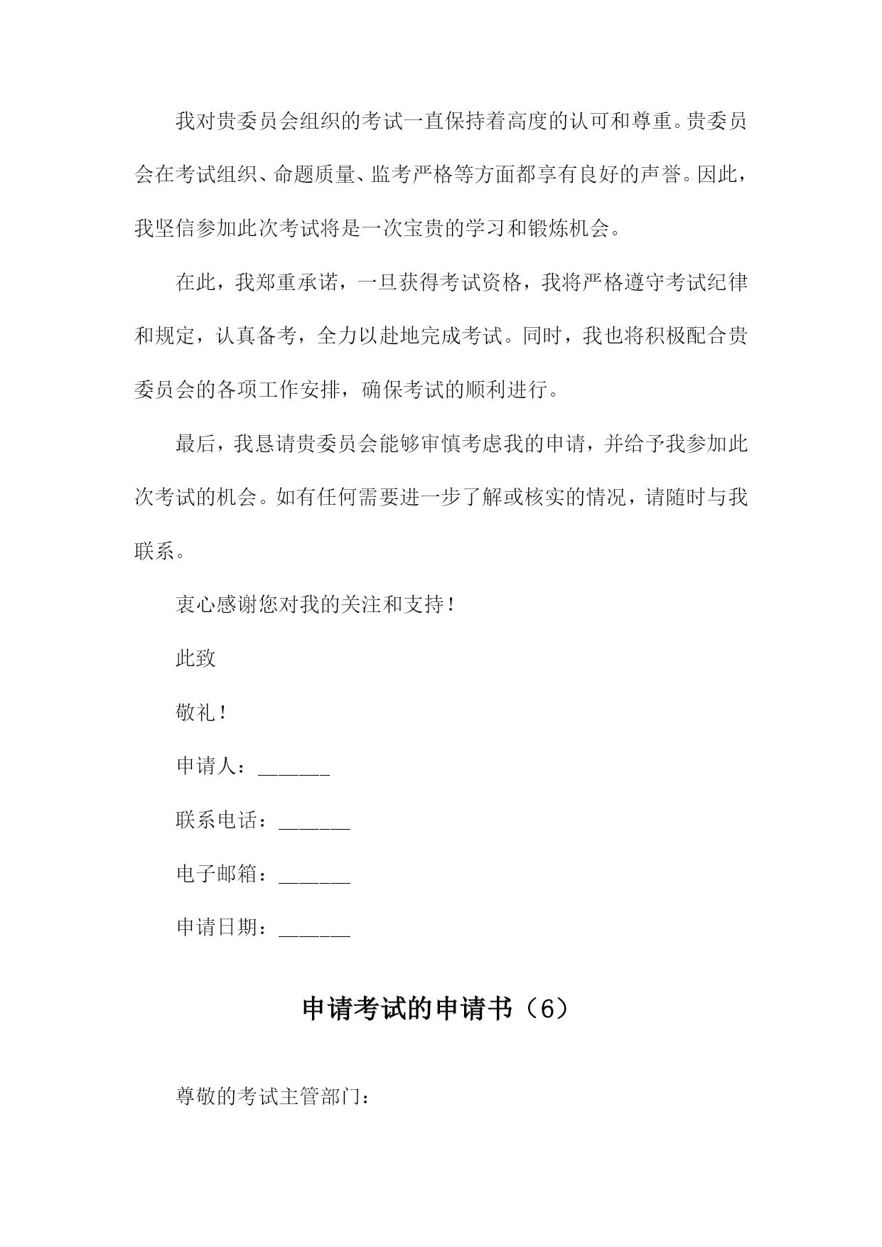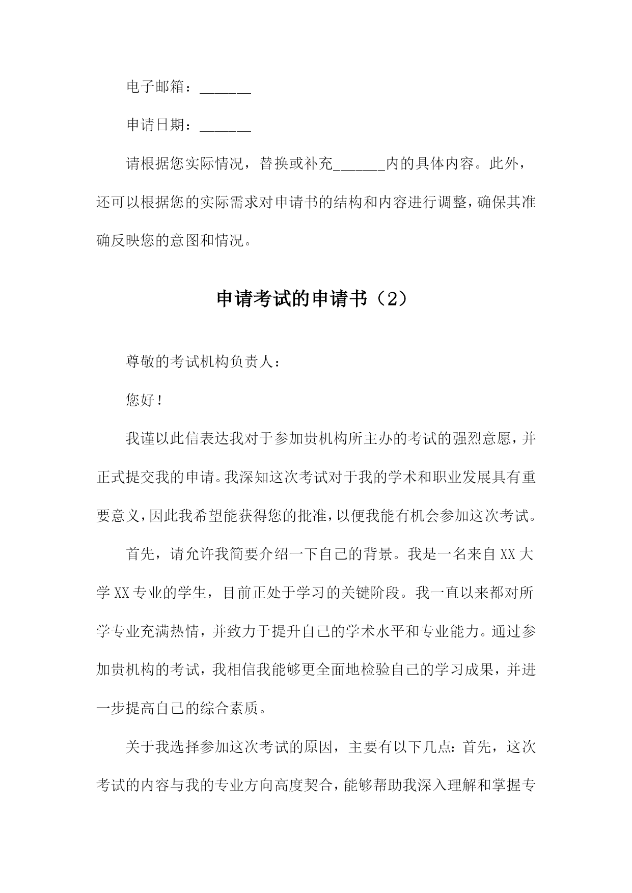 申请考试的申请书尊敬的考试机构负责人:您好!我谨以此信向您表达我参加_______的强烈愿望,并申请获得考试资格。我深知这次考试对我个人发展及未来职业规划的重要性,因此,我特向贵机构提交此申请书,希望能得到您的支持与批准。首先,请允许我简要介绍自己的基本情况。我叫_______充满热情,并一直努力提升自己的专业素养和实践能力。在校期间,我积极参加各类学术活动和实践项目,取得了良好的成绩和丰富的经验。关于申请参加_______的原因,我认为这次考试不仅是对我所学知识的检验,更是提升自我、挑战自我的绝佳机会。通过参加此次考试,我能够更全面地了解自己的专业水平,发现自身的不足之处,并针对性地加以改进。同时,我也相信这次考试将成为我未来求职和升学的重要参考依据,为我未来的职业发展奠定坚实的基础。为了确保能够顺利通过考试,我已经制定了详细的备考计划。我将充分利用课余时间,系统复习相关课程知识,并通过做题、模拟考试等方式提高自己的应试能力。此外,我还将积极参加各类辅导课程和讲座,以拓宽视野、提升专业素养。在此,我恳请贵机构能够批准我的申请,并给予我参加_______的机会。我将以饱满的热情和坚定的信心迎接这次挑战,并努力取得优异的成绩。如有需要,我愿意提供进一步的个人资料或证明材料。最后,再次感谢您在百忙之中审阅我的申请。期待您的回复,并祝您工作顺利、身体健康!此致敬礼!申请人:_______联系电话:_______电子邮箱:_______申请日期:_______申请考试的申请书(1)尊敬的考试委员会:您好!我是_______的资格。我深知_______对于个人职业发展及学术提升的重要性,它不仅是对我所学知识的全面检验,更是提升自我、挑战自我的重要机会。因此,我怀揣着对知识的渴望和对未来的憧憬,希望能够获得这次考试的机会。在过去的学习和工作中,我始终保持着良好的学习态度和工作作风。我认真学习相关知识,努力提高自己的专业素养和综合能力,积累了丰富的实践经验。同时,我也积极参加各类培训和交流活动,不断拓宽自己的视野和知识面。我相信这些经历和积累将为我参加_______提供有力的支持和保障。为了顺利通过此次考试,我将制定详细的备考计划,认真复习相关知识,积极参加模拟考试和练习,不断提高自己的应试能力和水平。同时,我也将严格遵守考试纪律和规定,确保考试的公平、公正和顺利进行。在此,我恳请贵委员会能够批准我的申请,给予我参加_______的机会。我将倍加珍惜这次机会,全力以赴备考,争取取得优异的成绩。最后,再次感谢贵委员会对我的关注和支持!如有需要,请随时与我联系。此致敬礼!申请人:_______联系电话:_______电子邮箱:_______申请日期:_______请根据您实际情况,替换或补充_______内的具体内容。此外,还可以根据您的实际需求对申请书的结构和内容进行调整,确保其准确反映您的意图和情况。申请考试的申请书(2)尊敬的考试机构负责人:您好!我谨以此信表达我对于参加贵机构所主办的考试的强烈意愿,并正式提交我的申请。我深知这次考试对于我的学术和职业发展具有重要意义,因此我希望能获得您的批准,以便我能有机会参加这次考试。首先,请允许我简要介绍一下自己的背景。我是一名来自XX大学XX专业的学生,目前正处于学习的关键阶段。我一直以来都对所学专业充满热情,并致力于提升自己的学术水平和专业能力。通过参加贵机构的考试,我相信我能够更全面地检验自己的学习成果,并进一步提高自己的综合素质。关于我选择参加这次考试的原因,主要有以下几点:首先,这次考试的内容与我的专业方向高度契合,能够帮助我深入理解和掌握专业知识;其次,通过考试,我可以与来自不同背景和领域的优秀考生进行交流和切磋,从而拓宽我的视野和思路;最后,这次考试的成绩也将对我未来的学术和职业发展产生积极影响,为我提供更多的机会和可能性。为了确保能够顺利参加考试,我已经做好了充分的准备。我会认真复习相关知识和技能,制定详细的备考计划,并积极参加模拟考试和练习。同时,我也会遵守考试纪律和规定,确保自己能够以诚信的态度参加考试。在此,我恳请贵机构能够批准我的申请,并为我提供参加考试的机会。我将倍加珍惜这次机会,全力以赴地备考和参加考试,争取取得优异的成绩。最后,再次感谢您在百忙之中审阅我的申请。如有需要,请随时与我联系,我的联系方式为:_______。此致敬礼!申请考试的申请书(3)尊敬的考试机构负责人:您好!我是_______,特向贵机构提交本申请。我对_______是检验该领域知识和能力的重要标准,也是提升自己、实现职业发展的重要途径。因此,我希望能有机会参加此次考试,以检验自己的学习成果,并为未来的职业发展