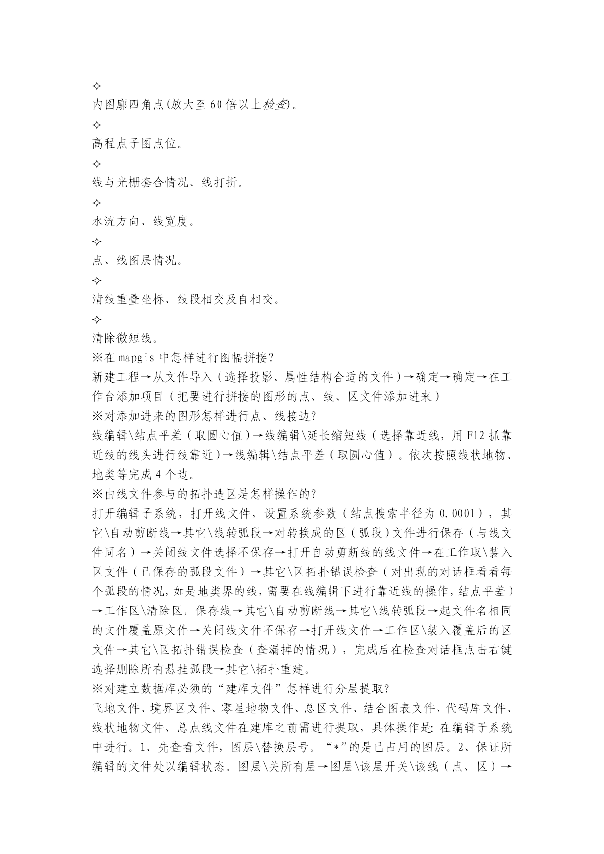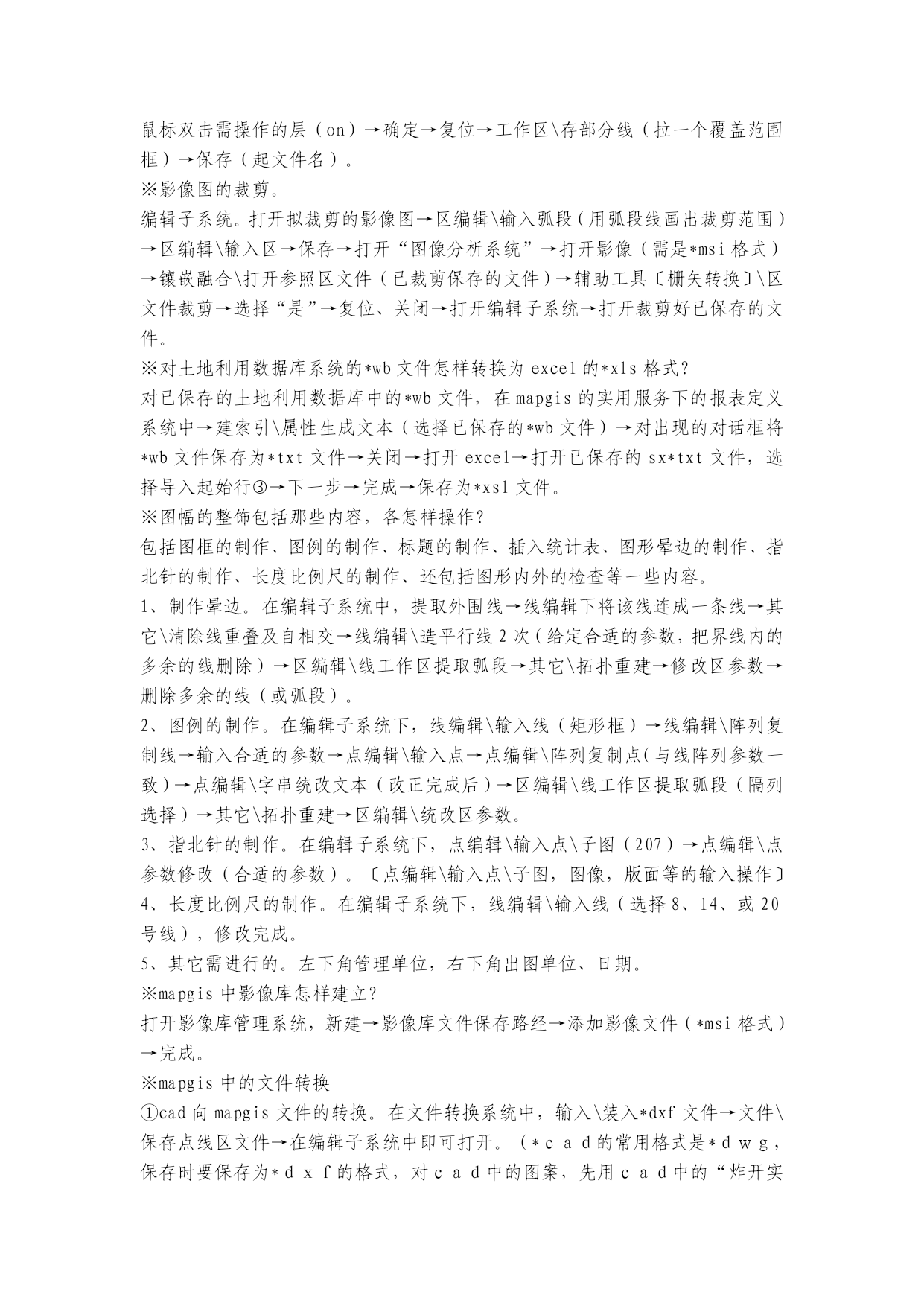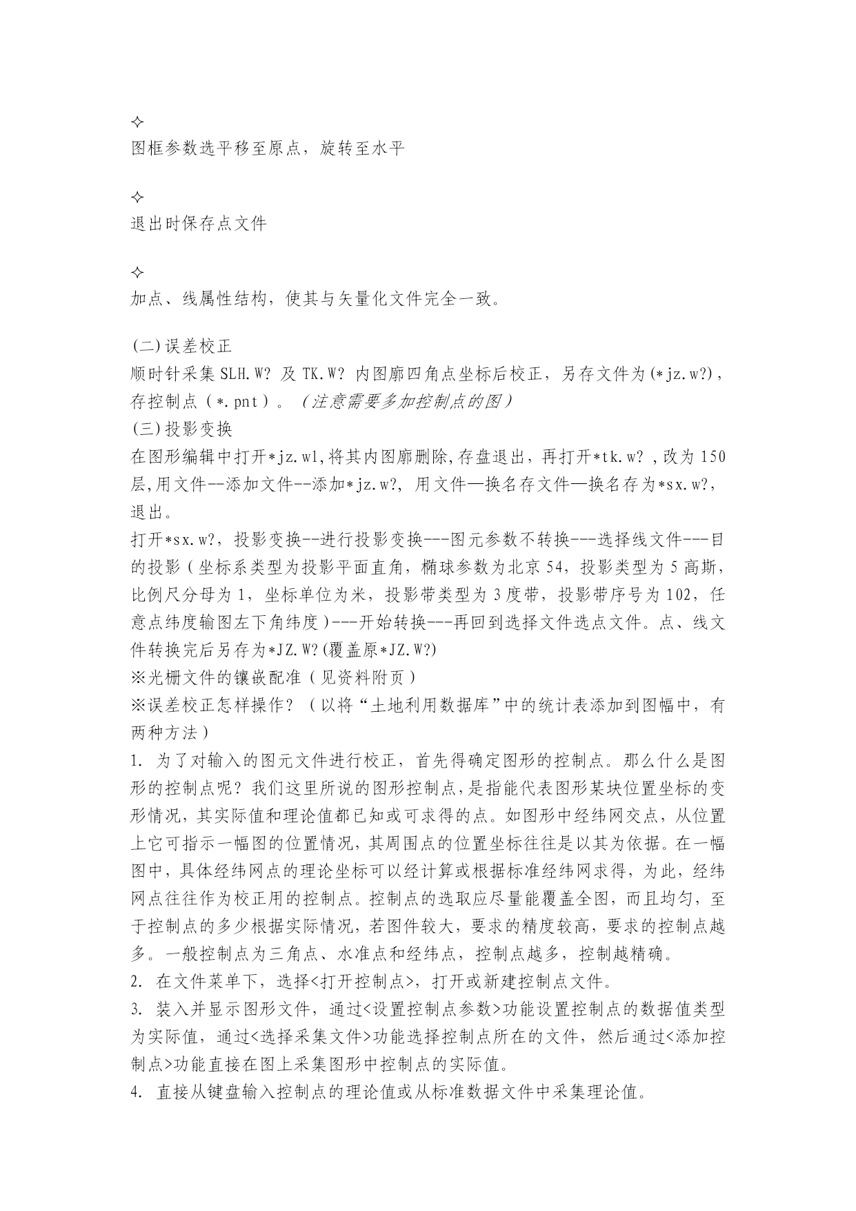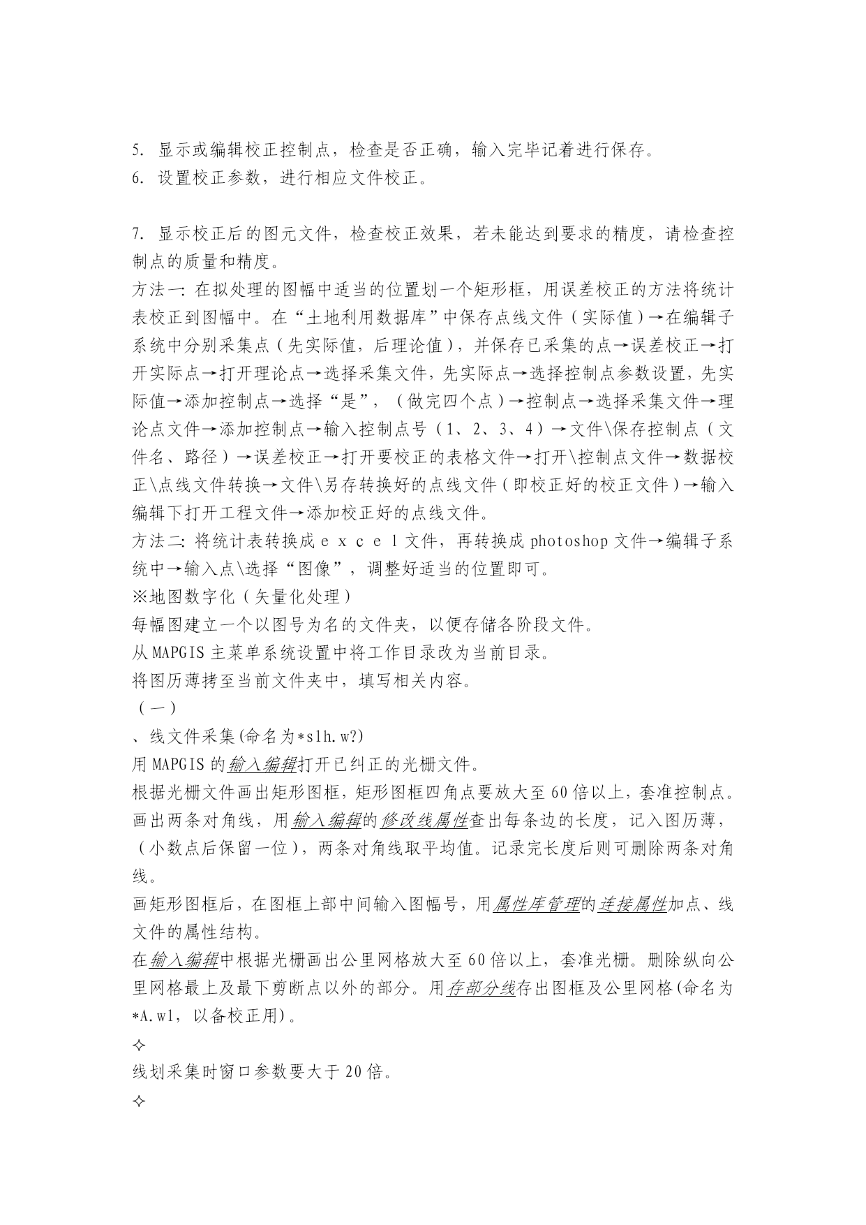 ※常用快捷方式:1、F12抓线头、靠近线F5放大F7缩小F9退点F11改变线的方向F8加点2、ctrl+右键闭合,ctrl+s复制,ctrl+v粘贴3、永登:34度带,中央经线1020000※提示:每幅图建立一个以图号为文件名的文件夹,以便存储各阶段文件。将图历薄拷贝至当前文件夹中,填写相关内容。※找狗文件6.7版本中我的电脑\右健“服务”或控制面版\管理工具\服务。如果仍然找不到,请运行win\system32\zdlccsvc.exe※扫描文件光栅纠正为保证下一步矢量化与误差校正的精度,利用photoshop图形编辑软件对每幅光栅文件进行扫描清晰度检查和角度纠正,使内图廓下边左右图廓点的连线水平。矢量化前在photoshop中检查光栅角度是否在0.2度以内,若大于等于0.2,转正再进行矢量化,并报作业组长登记,最后在全县矢量化完成后对这类光栅文件重新刻盘。※标准图框的生成与投影(一)生成标准图框(*TK.W?)实用服务---投影变换---系列标准图框---1:1万若图面无破损,选单线内框,否则选图框外写高斯坐标参数输图左下角经纬度,文件名为*tk.w?(*图框.w?)椭球参数选北京54,确定图框参数选平移至原点,旋转至水平退出时保存点文件加点、线属性结构,使其与矢量化文件完全一致。(二)误差校正顺时针采集SLH.W?及TK.W?内图廓四角点坐标后校正,另存文件为(*jz.w?),存控制点(*.pnt)。(注意需要多加控制点的图)(三)投影变换在图形编辑中打开*jz.wl,将其内图廓删除,存盘退出,再打开*tk.w?,改为150层,用文件--添加文件--添加*jz.w?,用文件—换名存文件—换名存为*sx.w?,退出。打开*sx.w?,投影变换--进行投影变换---图元参数不转换---选择线文件---目的投影(坐标系类型为投影平面直角,椭球参数为北京54,投影类型为5高斯,比例尺分母为1,坐标单位为米,投影带类型为3度带,投影带序号为102,任意点纬度输图左下角纬度)---开始转换---再回到选择文件选点文件。点、线文件转换完后另存为*JZ.W?(覆盖原*JZ.W?)※光栅文件的镶嵌配准(见资料附页)※误差校正怎样操作?(以将“土地利用数据库”中的统计表添加到图幅中,有两种方法)1.为了对输入的图元文件进行校正,首先得确定图形的控制点。那么什么是图形的控制点呢?我们这里所说的图形控制点,是指能代表图形某块位置坐标的变形情况,其实际值和理论值都已知或可求得的点。如图形中经纬网交点,从位置上它可指示一幅图的位置情况,其周围点的位置坐标往往是以其为依据。在一幅图中,具体经纬网点的理论坐标可以经计算或根据标准经纬网求得,为此,经纬网点往往作为校正用的控制点。控制点的选取应尽量能覆盖全图,而且均匀,至于控制点的多少根据实际情况,若图件较大,要求的精度较高,要求的控制点越多。一般控制点为三角点、水准点和经纬点,控制点越多,控制越精确。2.在文件菜单下,选择<打开控制点>,打开或新建控制点文件。3.装入并显示图形文件,通过<设置控制点参数>功能设置控制点的数据值类型为实际值,通过<选择采集文件>功能选择控制点所在的文件,然后通过<添加控制点>功能直接在图上采集图形中控制点的实际值。4.直接从键盘输入控制点的理论值或从标准数据文件中采集理论值。5.显示或编辑校正控制点,检查是否正确,输入完毕记着进行保存。6.设置校正参数,进行相应文件校正。7.显示校正后的图元文件,检查校正效果,若未能达到要求的精度,请检查控制点的质量和精度。方法一:在拟处理的图幅中适当的位置划一个矩形框,用误差校正的方法将统计表校正到图幅中。在“土地利用数据库”中保存点线文件(实际值)→在编辑子系统中分别采集点(先实际值,后理论值),并保存已采集的点→误差校正→打开实际点→打开理论点→选择采集文件,先实际点→选择控制点参数设置,先实际值→添加控制点→选择“是”,(做完四个点)→控制点→选择采集文件→理论点文件→添加控制点→输入控制点号(1、2、3、4)→文件\保存控制点(文件名、路径)→误差校正→打开要校正的表格文件→打开\控制点文件→数据校正\点线文件转换→文件\另存转换好的点线文件(即校正好的校正文件)→输入编辑下打开工程文件→添加校正好的点线文件。方法二:将统计表转换成excel文件,再转换成photoshop文件→编辑子系统中→输入点\选择“图像”,调整好适当的位置即可。※地图数字化(矢量化处理)每幅图建立一个以图号为名的文件夹,以便存储各阶段文件。从MAPGIS主菜单系统设置中将工作目录改为当前目录。将图历薄拷至当前文件夹中,填写相关内容。(一)、线文件采集(命名为*slh.w?)用MAPGIS的输入编辑打开已纠正的光栅文件。根据光