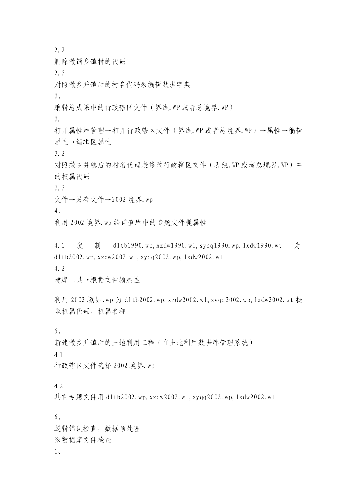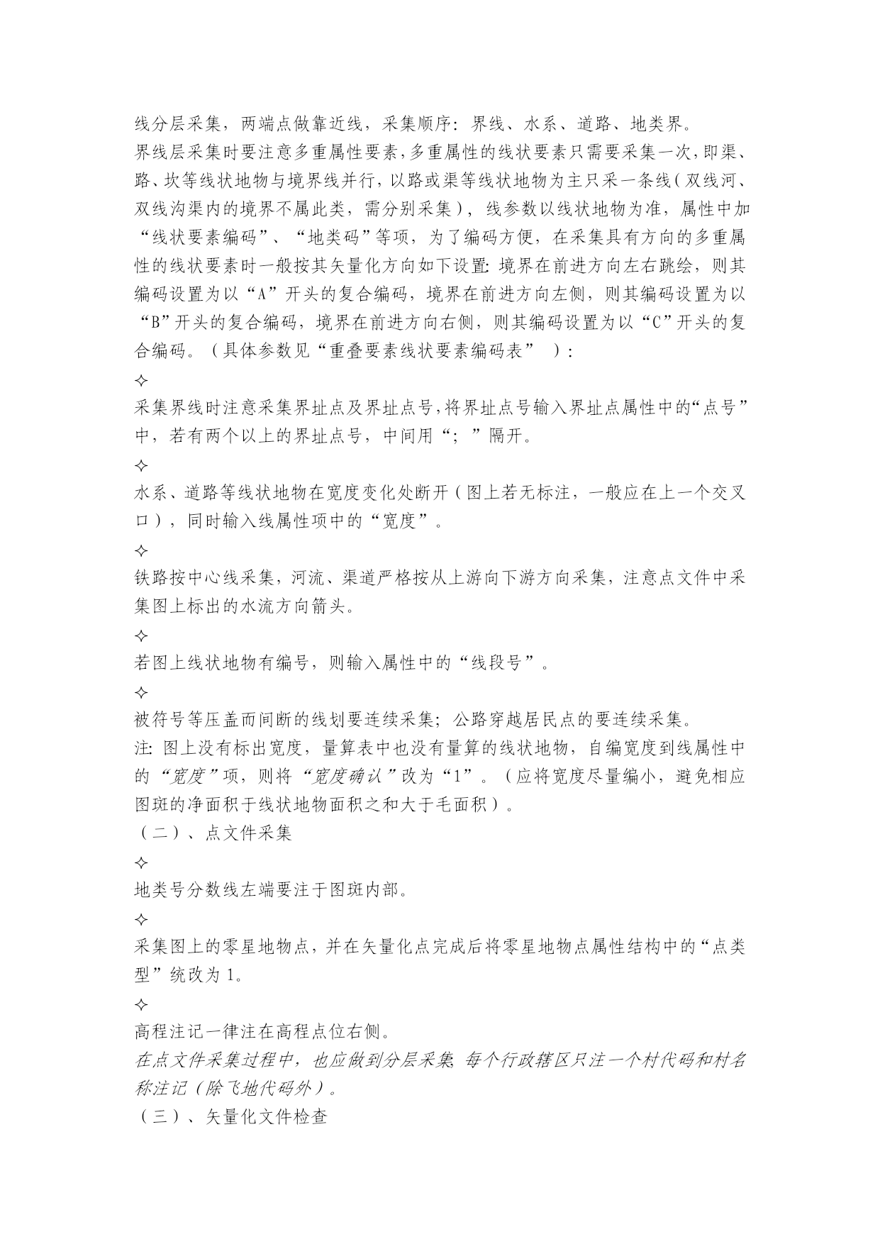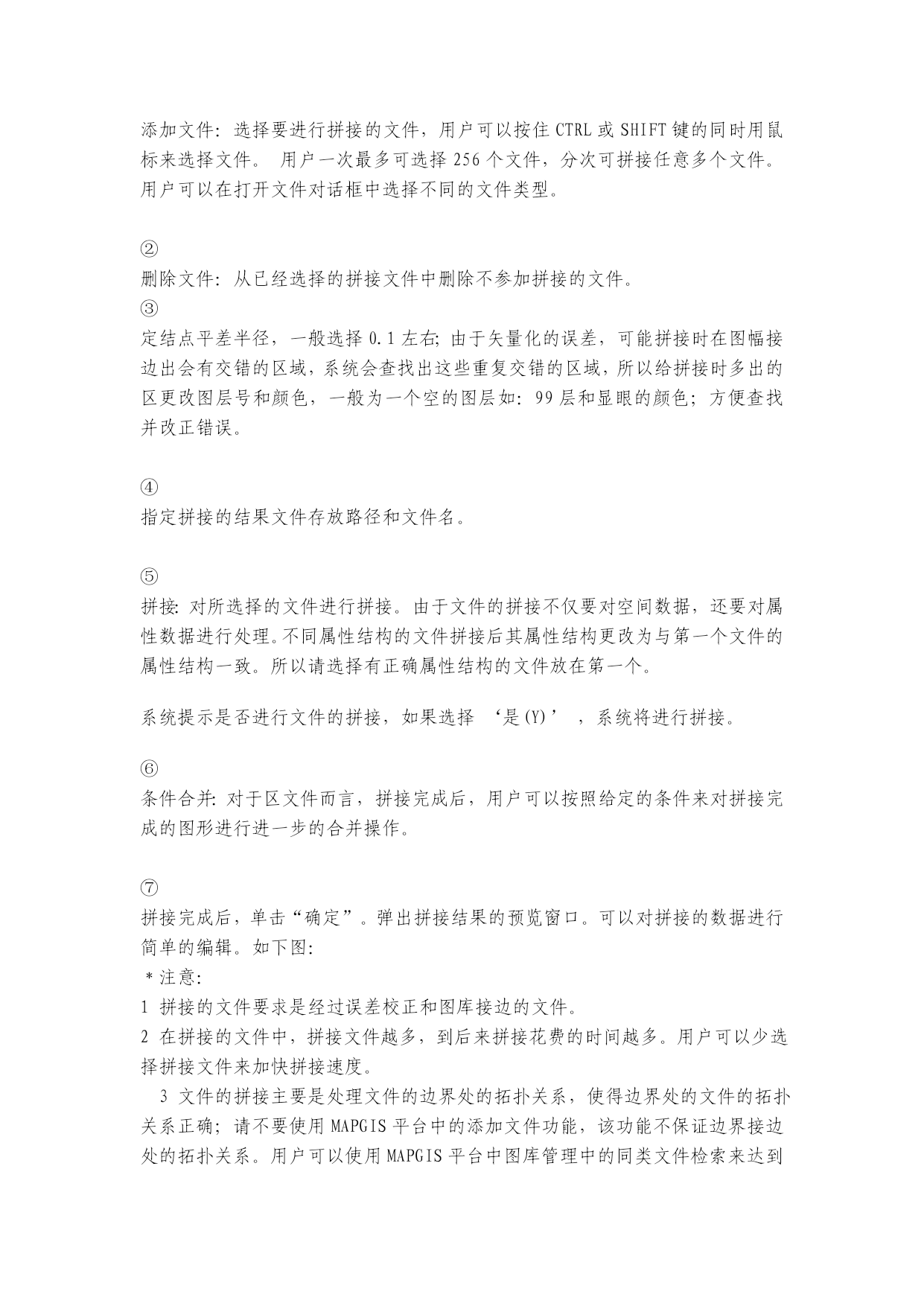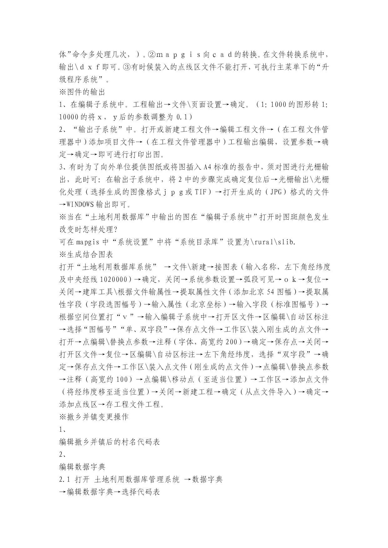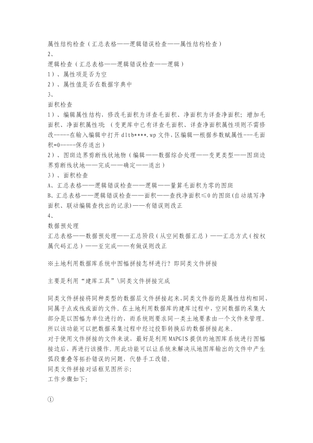 ※常用快捷方式:1、F12抓线头、靠近线F5放大F7缩小F9退点F11改变线的方向F8加点2、ctrl+右键闭合,ctrl+s复制,ctrl+v粘贴3、永登:34度带,中央经线1020000※提示:每幅图建立一个以图号为文件名的文件夹,以便存储各阶段文件。将图历薄拷贝至当前文件夹中,填写相关内容。※找狗文件6.7版本中我的电脑\右健“服务”或控制面版\管理工具\服务。如果仍然找不到,请运行win\system32\zdlccsvc.exe※扫描文件光栅纠正为保证下一步矢量化与误差校正的精度,利用photoshop图形编辑软件对每幅光栅文件进行扫描清晰度检查和角度纠正,使内图廓下边左右图廓点的连线水平。矢量化前在photoshop中检查光栅角度是否在0.2度以内,若大于等于0.2,转正再进行矢量化,并报作业组长登记,最后在全县矢量化完成后对这类光栅文件重新刻盘。※标准图框的生成与投影(一)生成标准图框(*TK.W?)实用服务---投影变换---系列标准图框---1:1万若图面无破损,选单线内框,否则选图框外写高斯坐标参数输图左下角经纬度,文件名为*tk.w?(*图框.w?)椭球参数选北京54,确定图框参数选平移至原点,旋转至水平退出时保存点文件加点、线属性结构,使其与矢量化文件完全一致。(二)误差校正顺时针采集SLH.W?及TK.W?内图廓四角点坐标后校正,另存文件为(*jz.w?),存控制点(*.pnt)。(注意需要多加控制点的图)(三)投影变换在图形编辑中打开*jz.wl,将其内图廓删除,存盘退出,再打开*tk.w?,改为150层,用文件--添加文件--添加*jz.w?,用文件—换名存文件—换名存为*sx.w?,退出。打开*sx.w?,投影变换--进行投影变换---图元参数不转换---选择线文件---目的投影(坐标系类型为投影平面直角,椭球参数为北京54,投影类型为5高斯,比例尺分母为1,坐标单位为米,投影带类型为3度带,投影带序号为102,任意点纬度输图左下角纬度)---开始转换---再回到选择文件选点文件。点、线文件转换完后另存为*JZ.W?(覆盖原*JZ.W?)※光栅文件的镶嵌配准(见资料附页)※误差校正怎样操作?(以将“土地利用数据库”中的统计表添加到图幅中,有两种方法)1.为了对输入的图元文件进行校正,首先得确定图形的控制点。那么什么是图形的控制点呢?我们这里所说的图形控制点,是指能代表图形某块位置坐标的变形情况,其实际值和理论值都已知或可求得的点。如图形中经纬网交点,从位置上它可指示一幅图的位置情况,其周围点的位置坐标往往是以其为依据。在一幅图中,具体经纬网点的理论坐标可以经计算或根据标准经纬网求得,为此,经纬网点往往作为校正用的控制点。控制点的选取应尽量能覆盖全图,而且均匀,至于控制点的多少根据实际情况,若图件较大,要求的精度较高,要求的控制点越多。一般控制点为三角点、水准点和经纬点,控制点越多,控制越精确。2.在文件菜单下,选择<打开控制点>,打开或新建控制点文件。3.装入并显示图形文件,通过<设置控制点参数>功能设置控制点的数据值类型为实际值,通过<选择采集文件>功能选择控制点所在的文件,然后通过<添加控制点>功能直接在图上采集图形中控制点的实际值。4.直接从键盘输入控制点的理论值或从标准数据文件中采集理论值。5.显示或编辑校正控制点,检查是否正确,输入完毕记着进行保存。6.设置校正参数,进行相应文件校正。7.显示校正后的图元文件,检查校正效果,若未能达到要求的精度,请检查控制点的质量和精度。方法一:在拟处理的图幅中适当的位置划一个矩形框,用误差校正的方法将统计表校正到图幅中。在“土地利用数据库”中保存点线文件(实际值)→在编辑子系统中分别采集点(先实际值,后理论值),并保存已采集的点→误差校正→打开实际点→打开理论点→选择采集文件,先实际点→选择控制点参数设置,先实际值→添加控制点→选择“是”,(做完四个点)→控制点→选择采集文件→理论点文件→添加控制点→输入控制点号(1、2、3、4)→文件\保存控制点(文件名、路径)→误差校正→打开要校正的表格文件→打开\控制点文件→数据校正\点线文件转换→文件\另存转换好的点线文件(即校正好的校正文件)→输入编辑下打开工程文件→添加校正好的点线文件。方法二:将统计表转换成excel文件,再转换成photoshop文件→编辑子系统中→输入点\选择“图像”,调整好适当的位置即可。※地图数字化(矢量化处理)每幅图建立一个以图号为名的文件夹,以便存储各阶段文件。从MAPGIS主菜单系统设置中将工作目录改为当前目录。将图历薄拷至当前文件夹中,填写相关内容。(一)、线文件采集(命名为*slh.w?)用MAPGIS的输入编辑打开已纠正的光栅文件。根据光