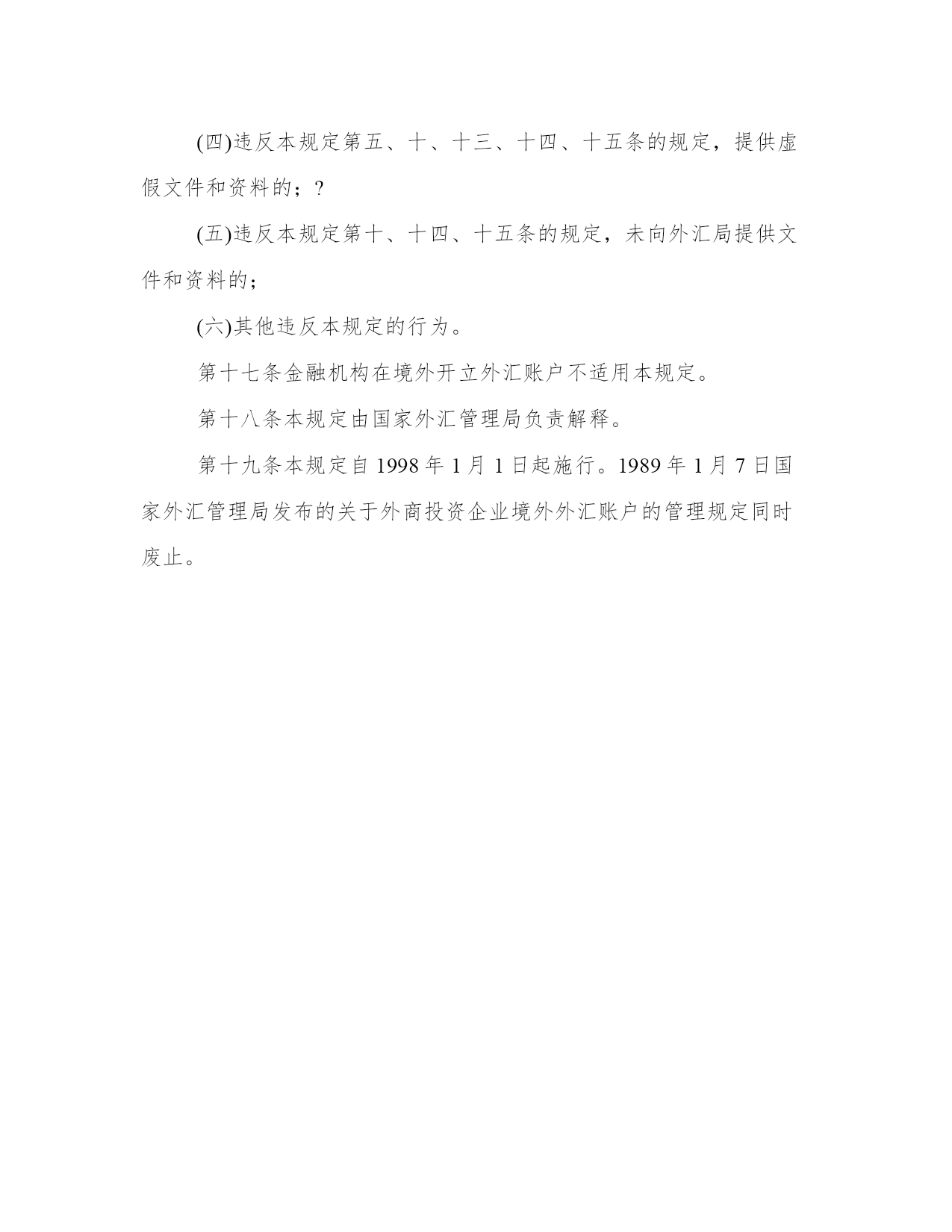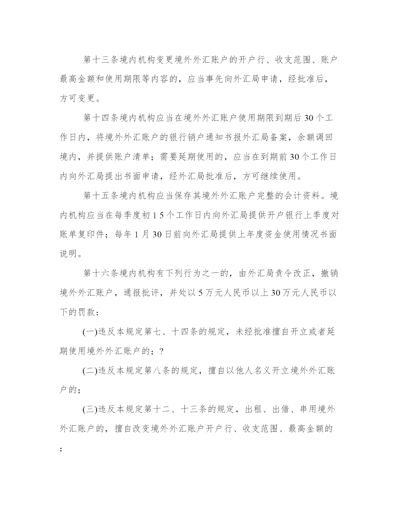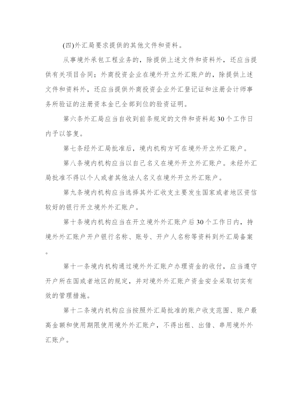 境外外汇账户管理规定第二条境内机构境外外汇账户的开立、使用及撤销的管理适用本规定。第三条国家外汇管理局及其分局(以下简称“外汇局”)为境外外汇账户的管理机关。第四条境内机构符合下列条件的,可以申请在境外开立外汇账户:(一)在境外有经常性零星收入,需在境外开立外汇账户,将收入集整后汇回境内的;?(二)在境外有经常性零星支出,需在境外开立外汇账户的;(三)从事境外承包工程项目,需在境外开立外汇账户的;(四)在境外发行外币有价证券,需在境外开立外汇账户的;(五)因业务上特殊需要必须在境外开立外汇账户的。第五条境内机构在境外开立外汇账户,应当持下列文件和资料向外汇局申请:(一)由境内机构法人代表或者其授权人签署并加盖公章的申请书。申请书应当包括开户理由、币别、账户最高金额、用途、收支范围、使用期限、拟开户银行及其所在地等内容;(二)工商行政管理部门颁发的营业执照正本及其复印件;(三)境外账户使用的内部管理规定;(四)外汇局要求提供的其他文件和资料。从事境外承包工程业务的,除提供上述文件和资料外,还应当提供有关项目合同;外商投资企业在境外开立外汇账户的,除提供上述文件和资料外,还应当提供外商投资企业外汇登记证和注册会计师事务所验证的注册资本金已全部到位的验资证明。第六条外汇局应当自收到前条规定的文件和资料起30个工作日内予以答复。第七条经外汇局批准后,境内机构方可在境外开立外汇账户。第八条境内机构应当以自己名义在境外开立外汇账户。未经外汇局批准不得以个人或者其他法人名义在境外开立外汇账户。第九条境内机构应当选择其外汇收支主要发生国家或者地区资信较好的银行开立境外外汇账户。第十条境内机构应当在开立境外外汇账户后30个工作日内,持境外外汇账户开户银行名称、账号、开户人名称等资料到外汇局备案。第十一条境内机构通过境外外汇账户办理资金的收付,应当遵守开户所在国或者地区的规定,并对境外外汇账户资金安全采取切实有效的管理措施。第十二条境内机构应当按照外汇局批准的账户收支范围、账户最高金额和使用期限使用境外外汇账户,不得出租、出借、串用境外外汇账户。第十三条境内机构变更境外外汇账户的开户行、收支范围、账户最高金额和使用期限等内容的,应当事先向外汇局申请,经批准后,方可变更。第十四条境内机构应当在境外外汇账户使用期限到期后30个工作日内,将境外外汇账户的银行销户通知书报外汇局备案,余额调回境内,并提供账户清单;需要延期使用的,应当在到期前30个工作日内向外汇局提出书面申请,经外汇局批准后,方可继续使用。第十五条境内机构应当保存其境外外汇账户完整的会计资料。境内机构应当在每季度初15个工作日内向外汇局提供开户银行上季度对账单复印件;每年1月30日前向外汇局提供上年度资金使用情况书面说明。第十六条境内机构有下列行为之一的,由外汇局责令改正,撤销境外外汇账户,通报批评,并处以5万元人民币以上30万元人民币以下的罚款:(一)违反本规定第七、十四条的规定,未经批准擅自开立或者延期使用境外外汇账户的;?(二)违反本规定第八条的规定,擅自以他人名义开立境外外汇账户的;(三)违反本规定第十二、十三条的规定,出租、出借、串用境外外汇账户的,擅自改变境外外汇账户开户行、收支范围、最高金额的;(四)违反本规定第五、十、十三、十四、十五条的规定,提供虚假文件和资料的;?(五)违反本规定第十、十四、十五条的规定,未向外汇局提供文件和资料的;(六)其他违反本规定的行为。第十七条金融机构在境外开立外汇账户不适用本规定。第十八条本规定由国家外汇管理局负责解释。第十九条本规定自1998年1月1日起施行。1989年1月7日国家外汇管理局发布的关于外商投资企业境外外汇账户的管理规定同时废止。