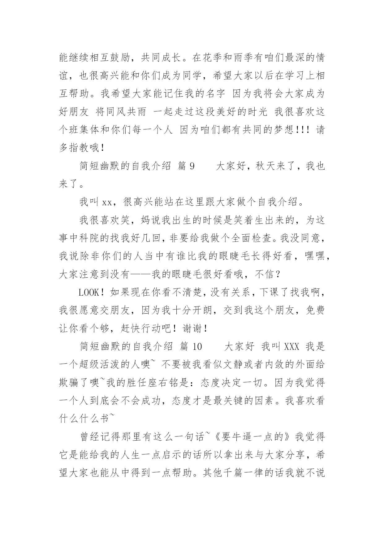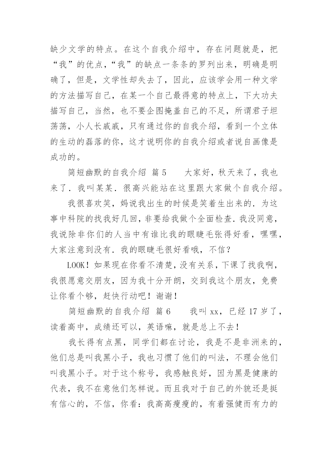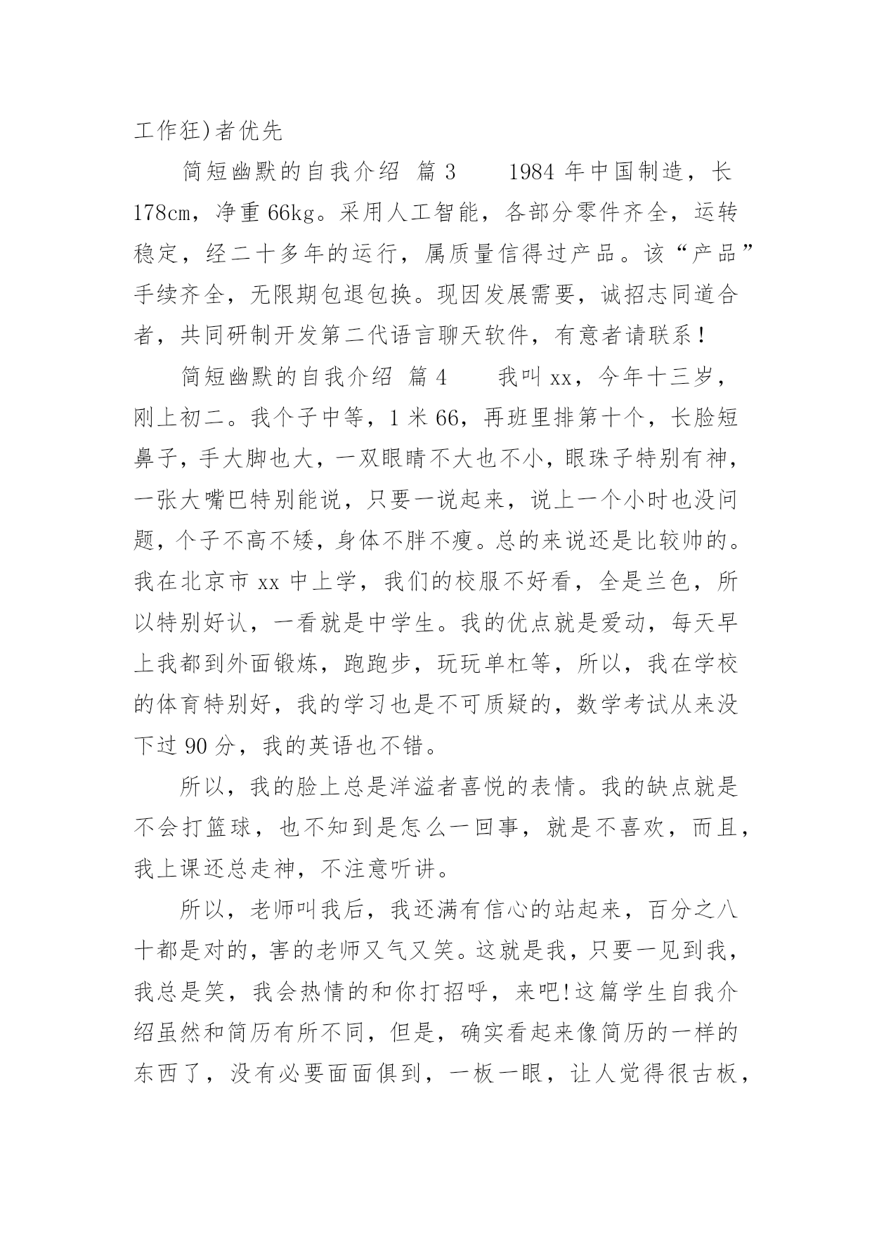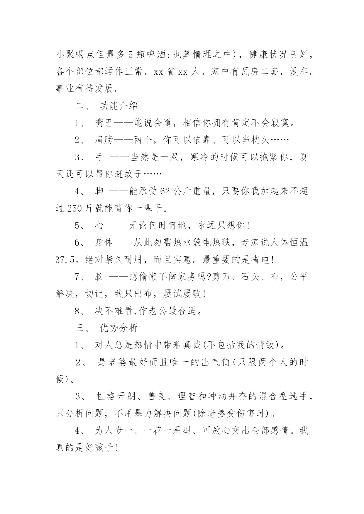 简短幽默的自我介绍简短幽默的自我介绍当到达一个新的环境后,我们有必要进行适当的自我介绍,自我介绍是让陌生人彼此认识的好方法。千万不能认为自我介绍随便应付就可以,以下是小编帮大家整理的简短幽默的自我介绍,仅供参考,大家一起来看看吧。简短幽默的自我介绍篇1大家好,我是xxx,来到这里,我非常的兴奋,因为我又能在新的环境中,找到新的朋友了大学新生自我介绍幽默自我介绍。我是一名学习一般,相貌一般,体格一般的内向学生。我沉着冷静,比较和善,也比较好相处,大家可以和我多交朋友我喜欢看书,特别是喜欢xxx的书,希望在大学能够交到一些志同道合的书友。我和在座的同学们一样,渴望展翅高飞,渴望将来有更大的发展空间,有施展才华的更广阔的天地。我想,有耕耘就会有收获。未来的四年里,由各位老师的倾情传授,我们一定会有一个更加无限美好的未来。谢谢大家。简短幽默的自我介绍篇2一、基本情况男,xx年出生(真实年龄决不瞒报),无婚史、现居xx。本人性格开朗,为人真诚,无不良嗜好(抽烟、偶尔和朋友小聚喝点但最多5瓶啤酒;也算情理之中),健康状况良好,各个部位都运作正常。xx省xx人。家中有瓦房二套,没车。事业有待发展。二、功能介绍1、嘴巴——能说会道,相信你拥有肯定不会寂寞。2、肩膀——两个,你可以依靠、可以当枕头……3、手——当然是一双,寒冷的时候可以抱紧你,夏天还可以帮你赶蚊子……4、脚——能承受62公斤重量,只要你我加起来不超过250斤就能背你一辈子。5、心——无论何时何地,永远只想你!6、身体——从此勿需热水袋电热毯,专家说人体恒温37.5。绝对禁久耐用,而且实惠。最重要的是省电!7、脑——想偷懒不做家务吗?剪刀、石头、布,公平解决,切记,我只出布,屡试屡败!8、决不难看,作老公最合适。三、优势分析1、对人总是热情中带着真诚(不包括我的情敌)。2、是老婆最好而且唯一的出气筒(只限两个人的时候)。3、性格开朗、善良、理智和冲动并存的混合型选手,只分析问题,不用暴力解决问题(除老婆受伤害时)。4、为人专一、一花一果型、可放心交出全部感情。我真的是好孩子!四、劣势分析1、想要钓金龟的女生请止步,虽然我也很想满足你们,但是我真的还没多少钱。2、整天充满幻想的女孩也留步,生活不是童话故事,我是个只认现实不求虚幻的人。3、如果我真的爱上你,我会对你很好,好到你想逃(努力改正中)。4、想了半天我还只想到这几条。5.最后一定要孝敬老人,善良热爱生活,要有进取心!身高(160左右,体重42-56KG左右,本人172,62KG)五、机会点分析1、我是找老婆,不是来玩的。自我介绍2、吃减肥药的、一天往酒吧钻好几趟的、视KTV如亲爹者勿扰。3、有抽烟嗜好者走开,偶尔抽一两根者除外(单单指玩)。女人有时抽烟的样子真的很美,但我真的不想在家的时候你发我一根,我发你一根抽个没完。4、管家婆型的靠边,我有一个妈已经够了。(恐龙谢绝)5、温柔、可爱、善良、喜欢小动物者(老鼠除外)优先。6、有理想、有目标、热爱一切美好事物者(不包括金钱)优先。7、喜欢做美食而且做的很好者优先。我们可以切磋一下!8、有固定工作、且热爱工作、对未来充满憧憬(不包括工作狂)者优先简短幽默的自我介绍篇31984年中国制造,长178cm,净重66kg。采用人工智能,各部分零件齐全,运转稳定,经二十多年的运行,属质量信得过产品。该“产品”手续齐全,无限期包退包换。现因发展需要,诚招志同道合者,共同研制开发第二代语言聊天软件,有意者请联系!简短幽默的自我介绍篇4我叫xx,今年十三岁,刚上初二。我个子中等,1米66,再班里排第十个,长脸短鼻子,手大脚也大,一双眼睛不大也不小,眼珠子特别有神,一张大嘴巴特别能说,只要一说起来,说上一个小时也没问题,个子不高不矮,身体不胖不瘦。总的来说还是比较帅的。我在北京市xx中上学,我们的校服不好看,全是兰色,所以特别好认,一看就是中学生。我的优点就是爱动,每天早上我都到外面锻炼,跑跑步,玩玩单杠等,所以,我在学校的体育特别好,我的学习也是不可质疑的,数学考试从来没下过90分,我的英语也不错。所以,我的脸上总是洋溢者喜悦的表情。我的缺点就是不会打篮球,也不知到是怎么一回事,就是不喜欢,而且,我上课还总走神,不注意听讲。所以,老师叫我后,我还满有信心的站起来,百分之八十都是对的,害的老师又气又笑。这就是我,只要一见到我,我总是笑,我会热情的和你打招呼,来吧!这篇学生自我介绍虽然和简历有所不同,但是,确实看起来像简历的一样的东西了,没有必要面面俱到,一板一眼,让人觉得很古板,缺少文学的特点。在这个自我介绍中,存在问题就是,把“我”的优点,“我”的缺点一条条的罗列出来,明确是明确了,但是,文学性却失去了,因此,应该学会用一种文学的方法描写自己,在某一个自己最得意的特点上,下大功夫描写自己,