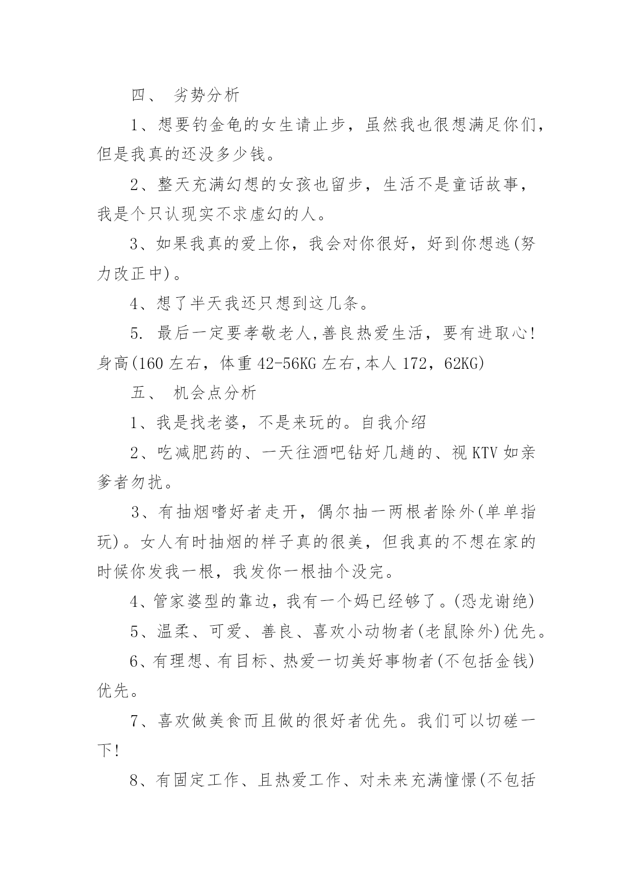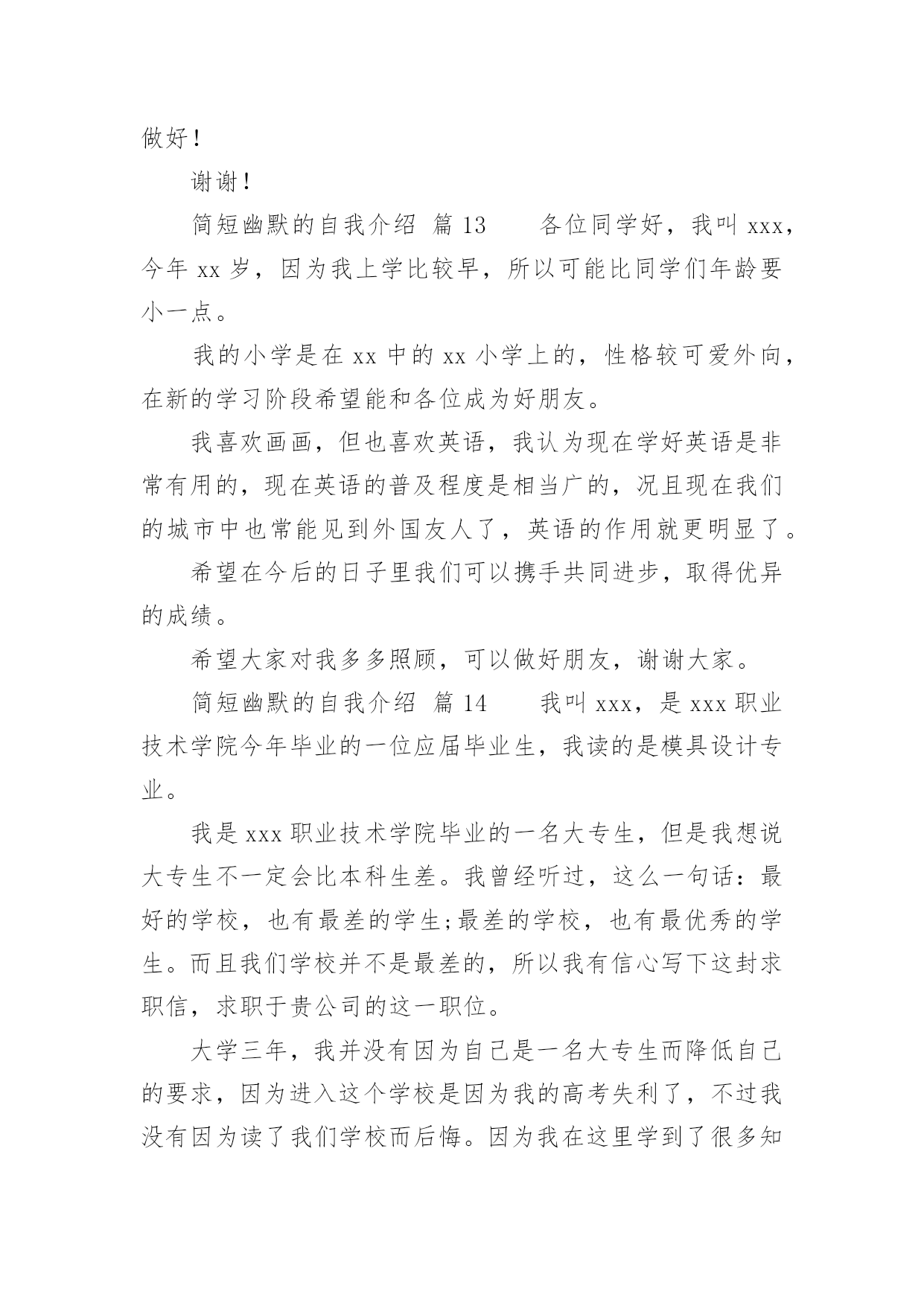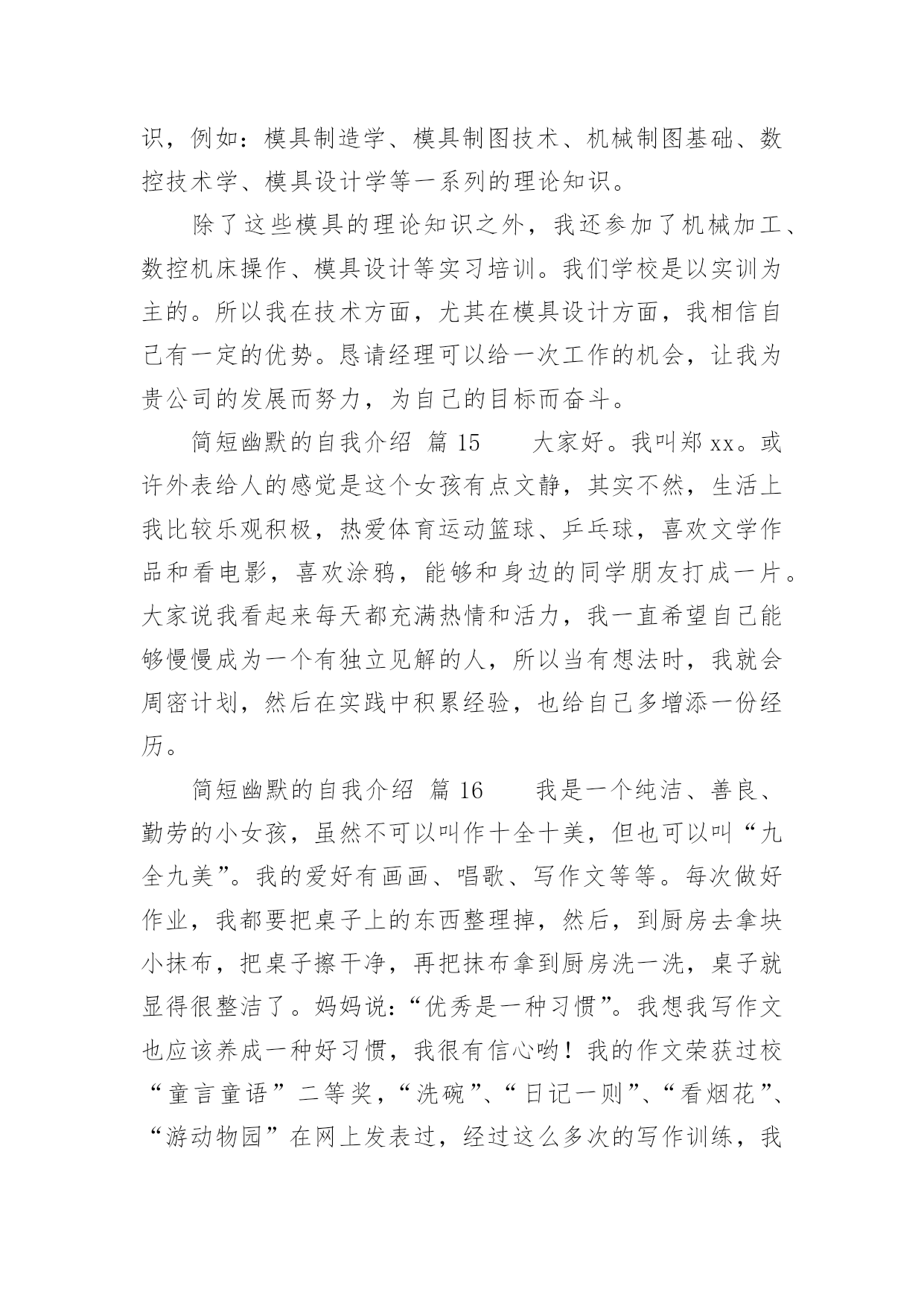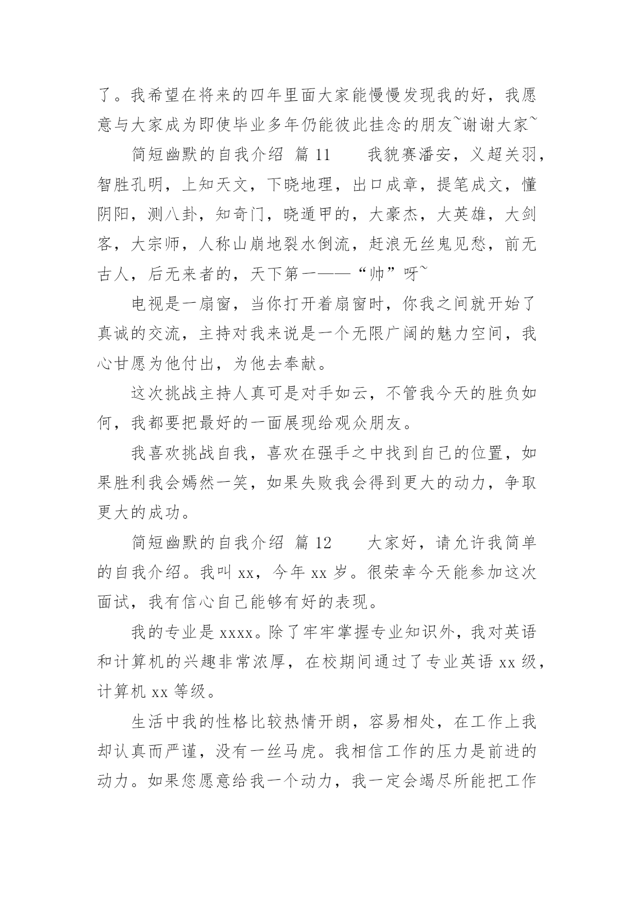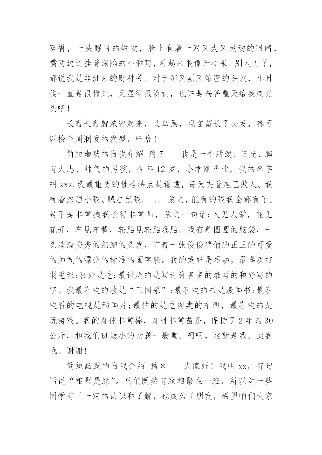 简短幽默的自我介绍简短幽默的自我介绍当到达一个新的环境后,我们有必要进行适当的自我介绍,自我介绍是让陌生人彼此认识的好方法。千万不能认为自我介绍随便应付就可以,以下是小编帮大家整理的简短幽默的自我介绍,仅供参考,大家一起来看看吧。简短幽默的自我介绍篇1大家好,我是xxx,来到这里,我非常的兴奋,因为我又能在新的环境中,找到新的朋友了大学新生自我介绍幽默自我介绍。我是一名学习一般,相貌一般,体格一般的内向学生。我沉着冷静,比较和善,也比较好相处,大家可以和我多交朋友我喜欢看书,特别是喜欢xxx的书,希望在大学能够交到一些志同道合的书友。我和在座的同学们一样,渴望展翅高飞,渴望将来有更大的发展空间,有施展才华的更广阔的天地。我想,有耕耘就会有收获。未来的四年里,由各位老师的倾情传授,我们一定会有一个更加无限美好的未来。谢谢大家。简短幽默的自我介绍篇2一、基本情况男,xx年出生(真实年龄决不瞒报),无婚史、现居xx。本人性格开朗,为人真诚,无不良嗜好(抽烟、偶尔和朋友小聚喝点但最多5瓶啤酒;也算情理之中),健康状况良好,各个部位都运作正常。xx省xx人。家中有瓦房二套,没车。事业有待发展。二、功能介绍1、嘴巴——能说会道,相信你拥有肯定不会寂寞。2、肩膀——两个,你可以依靠、可以当枕头……3、手——当然是一双,寒冷的时候可以抱紧你,夏天还可以帮你赶蚊子……4、脚——能承受62公斤重量,只要你我加起来不超过250斤就能背你一辈子。5、心——无论何时何地,永远只想你!6、身体——从此勿需热水袋电热毯,专家说人体恒温37.5。绝对禁久耐用,而且实惠。最重要的是省电!7、脑——想偷懒不做家务吗?剪刀、石头、布,公平解决,切记,我只出布,屡试屡败!8、决不难看,作老公最合适。三、优势分析1、对人总是热情中带着真诚(不包括我的情敌)。2、是老婆最好而且唯一的出气筒(只限两个人的时候)。3、性格开朗、善良、理智和冲动并存的混合型选手,只分析问题,不用暴力解决问题(除老婆受伤害时)。4、为人专一、一花一果型、可放心交出全部感情。我真的是好孩子!四、劣势分析1、想要钓金龟的女生请止步,虽然我也很想满足你们,但是我真的还没多少钱。2、整天充满幻想的女孩也留步,生活不是童话故事,我是个只认现实不求虚幻的人。3、如果我真的爱上你,我会对你很好,好到你想逃(努力改正中)。4、想了半天我还只想到这几条。5.最后一定要孝敬老人,善良热爱生活,要有进取心!身高(160左右,体重42-56KG左右,本人172,62KG)五、机会点分析1、我是找老婆,不是来玩的。自我介绍2、吃减肥药的、一天往酒吧钻好几趟的、视KTV如亲爹者勿扰。3、有抽烟嗜好者走开,偶尔抽一两根者除外(单单指玩)。女人有时抽烟的样子真的很美,但我真的不想在家的时候你发我一根,我发你一根抽个没完。4、管家婆型的靠边,我有一个妈已经够了。(恐龙谢绝)5、温柔、可爱、善良、喜欢小动物者(老鼠除外)优先。6、有理想、有目标、热爱一切美好事物者(不包括金钱)优先。7、喜欢做美食而且做的很好者优先。我们可以切磋一下!8、有固定工作、且热爱工作、对未来充满憧憬(不包括工作狂)者优先简短幽默的自我介绍篇31984年中国制造,长178cm,净重66kg。采用人工智能,各部分零件齐全,运转稳定,经二十多年的运行,属质量信得过产品。该“产品”手续齐全,无限期包退包换。现因发展需要,诚招志同道合者,共同研制开发第二代语言聊天软件,有意者请联系!简短幽默的自我介绍篇4我叫xx,今年十三岁,刚上初二。我个子中等,1米66,再班里排第十个,长脸短鼻子,手大脚也大,一双眼睛不大也不小,眼珠子特别有神,一张大嘴巴特别能说,只要一说起来,说上一个小时也没问题,个子不高不矮,身体不胖不瘦。总的来说还是比较帅的。我在北京市xx中上学,我们的校服不好看,全是兰色,所以特别好认,一看就是中学生。我的优点就是爱动,每天早上我都到外面锻炼,跑跑步,玩玩单杠等,所以,我在学校的体育特别好,我的学习也是不可质疑的,数学考试从来没下过90分,我的英语也不错。所以,我的脸上总是洋溢者喜悦的表情。我的缺点就是不会打篮球,也不知到是怎么一回事,就是不喜欢,而且,我上课还总走神,不注意听讲。所以,老师叫我后,我还满有信心的站起来,百分之八十都是对的,害的老师又气又笑。这就是我,只要一见到我,我总是笑,我会热情的和你打招呼,来吧!这篇学生自我介绍虽然和简历有所不同,但是,确实看起来像简历的一样的东西了,没有必要面面俱到,一板一眼,让人觉得很古板,缺少文学的特点。在这个自我介绍中,存在问题就是,把“我”的优点,“我”的缺点一条条的罗列出来,明确是明确了,但是,文学性却失去了,因此,应该学会用一种文学的方法描写自己,在某一个自己最得意的特点上,下大功夫描写自己,