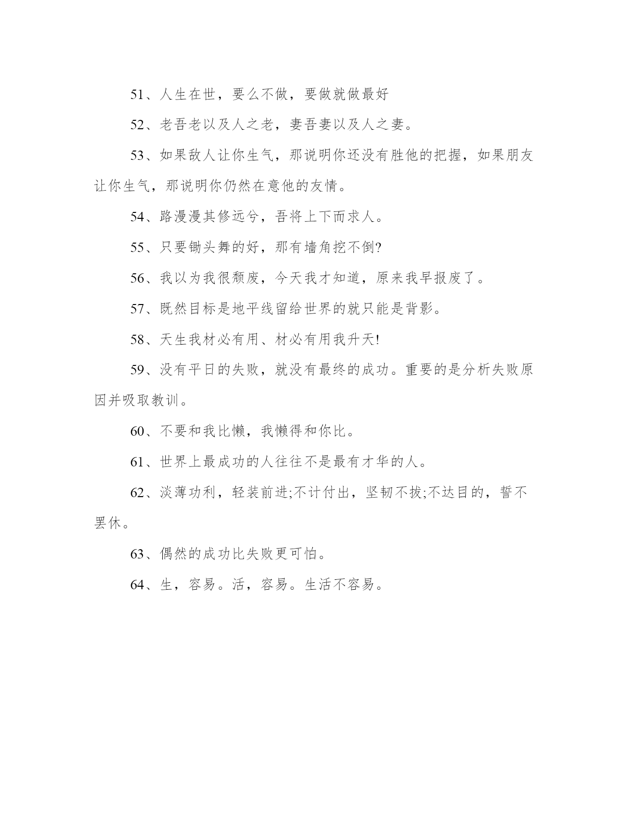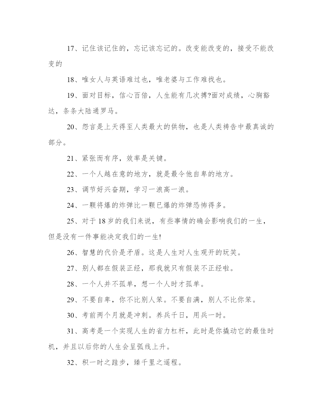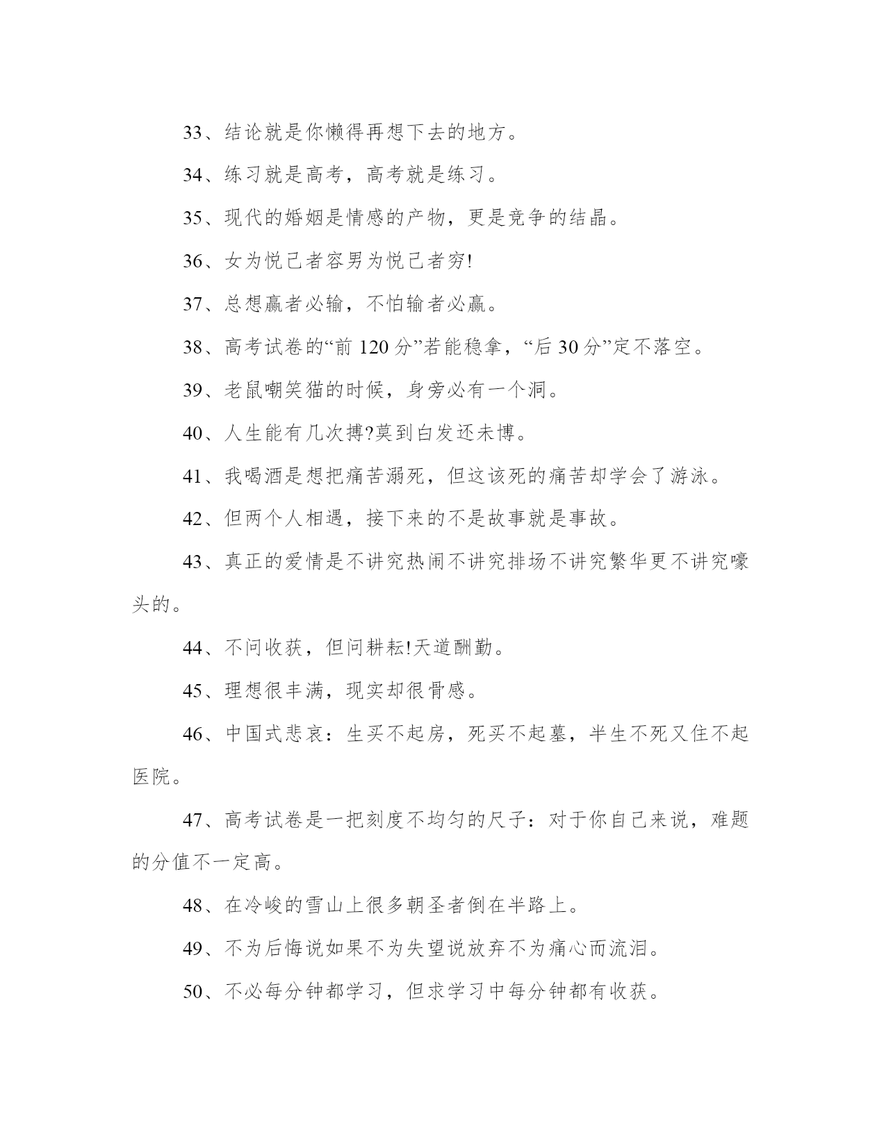 2024年励志的幽默句子工作报告1、身体常动,内心常静。2、别人的钱财乃我的身外之物!3、能冲刷一切的除了眼泪,就是时间,以时间来推移感情,时间越长,冲突越淡,仿佛不断稀释的茶。4、方有埋头,才有出头5、敌人变成战友多半是为了生存,战友变成敌人多半是为了金钱。6、流氓不可怕,就怕流氓有文化7、诚征小MM,共同来灌水;我灌长江头,君灌长江尾。8、不怕考不上,就怕不敢考。9、高考是比知识、比能力、比心理、比信心、比体力的一场综合考试。10、不吃饱哪有力气减肥啊。11、在这世上惟一件事比别人议论更糟,那就是无人议论你。12、给自己一个恰如其分的自信。13、学习与坐禅相似,须有一颗恒心。14、成功的母亲是失败,成功的父亲是汗水。15、即使爬到最高的山上,一次也只能脚踏实地地迈一步。16、幸福的末班车不是没赶上,而是挤不上去。17、记住该记住的,忘记该忘记的。改变能改变的,接受不能改变的18、唯女人与英语难过也,唯老婆与工作难找也。19、面对目标,信心百倍,人生能有几次搏?面对成绩,心胸豁达,条条大陆通罗马。20、怨言是上天得至人类最大的供物,也是人类祷告中最真诚的部分。21、紧张而有序,效率是关键。22、一个人越在意的地方,就是最令他自卑的地方。23、调节好兴奋期,学习一浪高一浪。24、一颗将爆的炸弹比一颗已爆的炸弹恐怖得多。25、对于18岁的我们来说,有些事情的确会影响我们的一生,但是没有一件事能决定我们的一生!26、智慧的代价是矛盾。这是人生对人生观开的玩笑。27、别人都在假装正经,那我就只有假装不正经啦。28、一个人并不孤单,想一个人时才孤单。29、不要自卑,你不比别人笨。不要自满,别人不比你笨。30、考前两个月就是冲刺。养兵千日,用兵一时。31、高考是一个实现人生的省力杠杆,此时是你撬动它的最佳时机,并且以后你的人生会呈弧线上升。32、积一时之跬步,臻千里之遥程。33、结论就是你懒得再想下去的地方。34、练习就是高考,高考就是练习。35、现代的婚姻是情感的产物,更是竞争的结晶。36、女为悦己者容男为悦己者穷!37、总想赢者必输,不怕输者必赢。38、高考试卷的“前120分”若能稳拿,“后30分”定不落空。39、老鼠嘲笑猫的时候,身旁必有一个洞。40、人生能有几次搏?莫到白发还未博。41、我喝酒是想把痛苦溺死,但这该死的痛苦却学会了游泳。42、但两个人相遇,接下来的不是故事就是事故。43、真正的爱情是不讲究热闹不讲究排场不讲究繁华更不讲究嚎头的。44、不问收获,但问耕耘!天道酬勤。45、理想很丰满,现实却很骨感。46、中国式悲哀:生买不起房,死买不起墓,半生不死又住不起医院。47、高考试卷是一把刻度不均匀的尺子:对于你自己来说,难题的分值不一定高。48、在冷峻的雪山上很多朝圣者倒在半路上。49、不为后悔说如果不为失望说放弃不为痛心而流泪。50、不必每分钟都学习,但求学习中每分钟都有收获。51、人生在世,要么不做,要做就做最好52、老吾老以及人之老,妻吾妻以及人之妻。53、如果敌人让你生气,那说明你还没有胜他的把握,如果朋友让你生气,那说明你仍然在意他的友情。54、路漫漫其修远兮,吾将上下而求人。55、只要锄头舞的好,那有墙角挖不倒?56、我以为我很颓废,今天我才知道,原来我早报废了。57、既然目标是地平线留给世界的就只能是背影。58、天生我材必有用、材必有用我升天!59、没有平日的失败,就没有最终的成功。重要的是分析失败原因并吸取教训。60、不要和我比懒,我懒得和你比。61、世界上最成功的人往往不是最有才华的人。62、淡薄功利,轻装前进;不计付出,坚韧不拔;不达目的,誓不罢休。63、偶然的成功比失败更可怕。64、生,容易。活,容易。生活不容易。