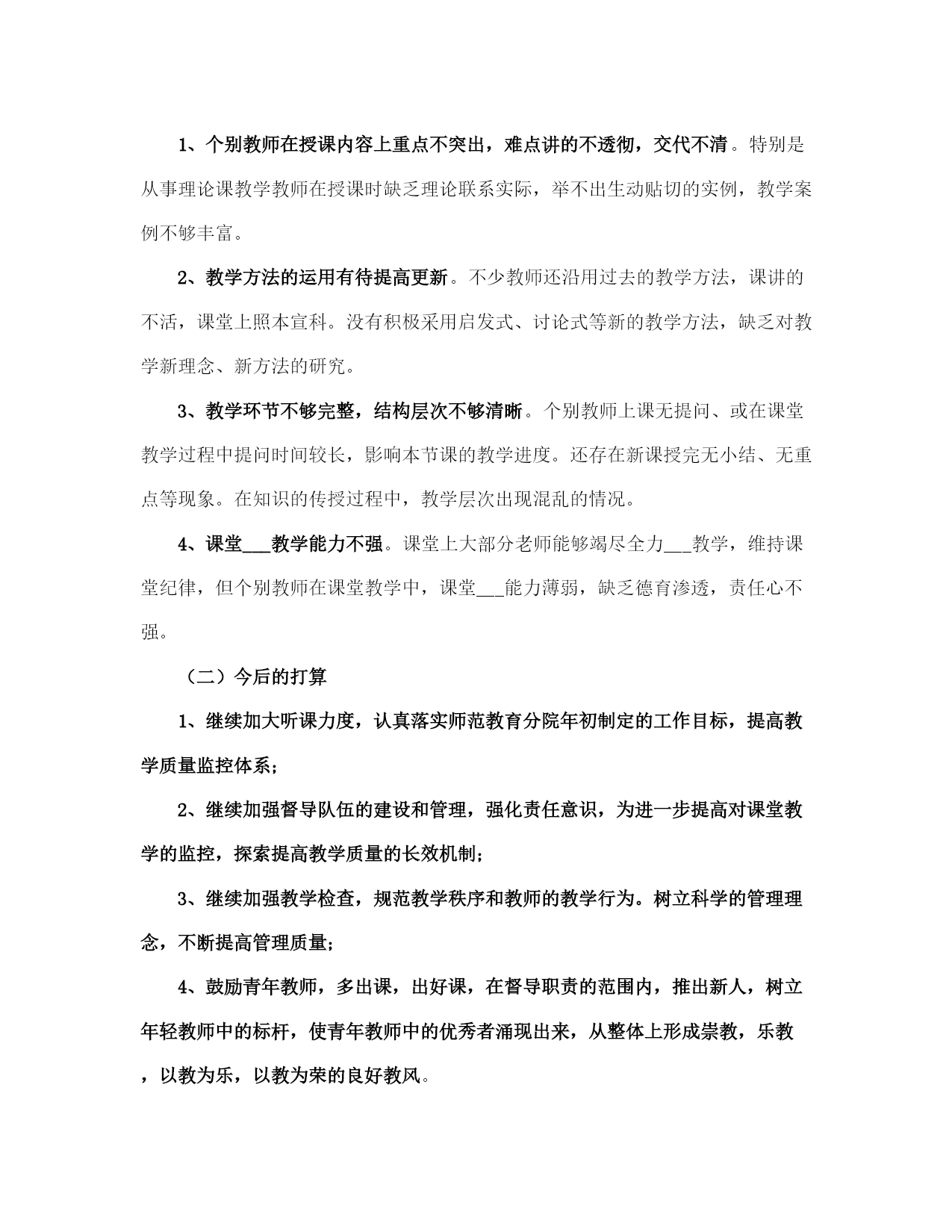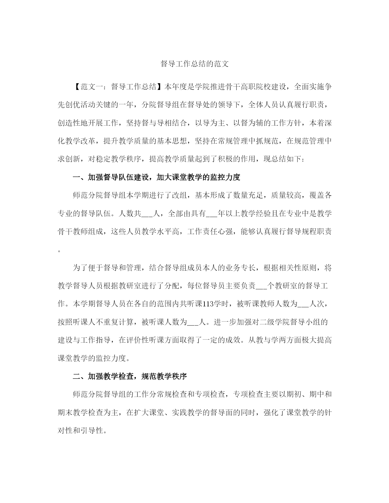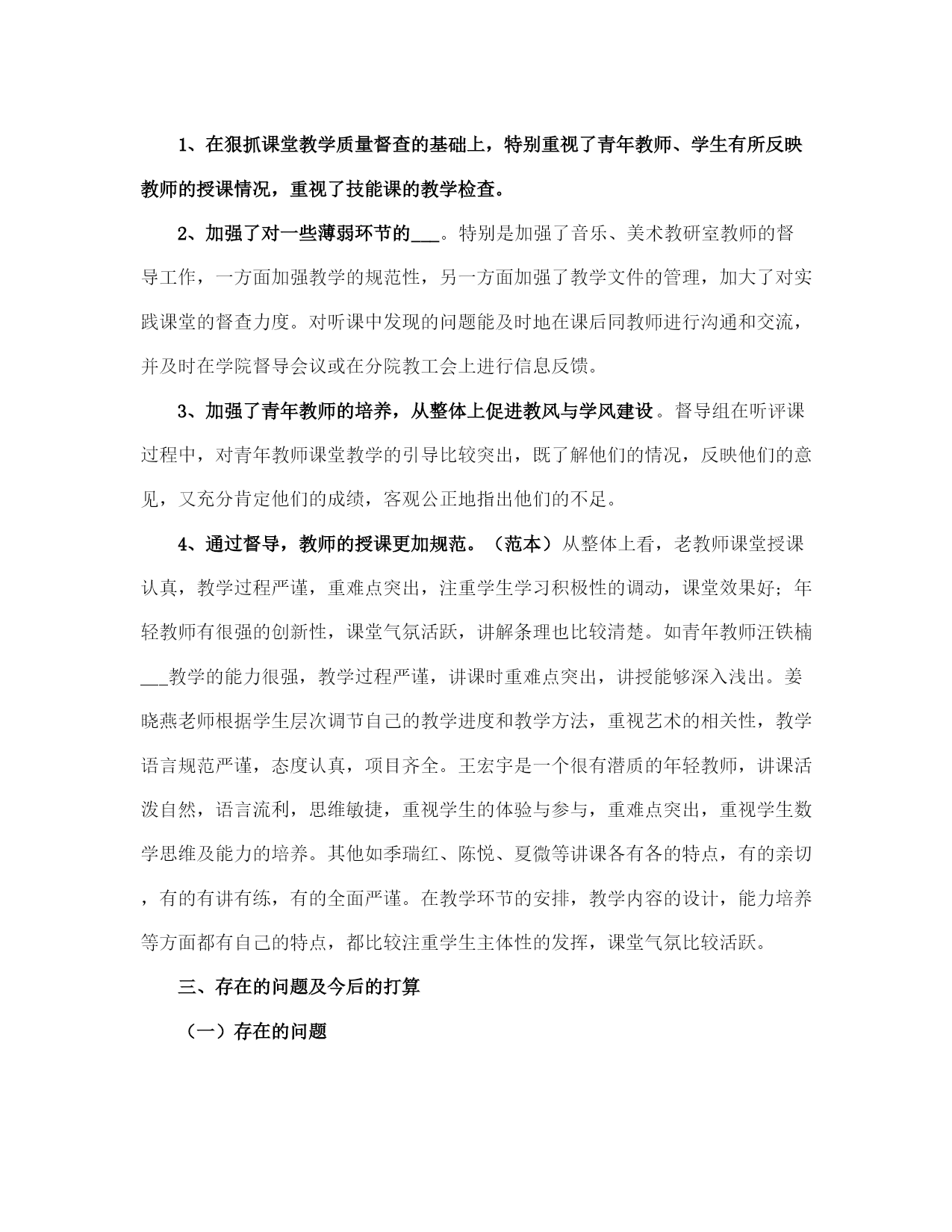 督导工作总结的(完整版)文档资料可直接使用,可编辑,欢迎下载督导工作总结的范文【范文一:督导工作总结】本年度是学院推进骨干高职院校建设,全面实施争先创优活动关键的一年,分院督导组在督导处的领导下,全体人员认真履行职责,创造性地开展工作,坚持督与导相结合,以导为主、以督为辅的工作方针,本着深化教学改革,提升教学质量的基本思想,坚持在常规管理中抓规范,在规范管理中求创新,对稳定教学秩序,提高教学质量起到了积极的作用,现总结如下:一、加强督导队伍建设,加大课堂教学的监控力度师范分院督导组本学期进行了改组,基本形成了数量充足,质量较高,覆盖各专业的督导队伍。人数共___人,全部由具有___年以上教学经验且在专业中是教学骨干教师组成,这些人员教学水平高,工作责任心强,能够认真履行督导规程职责。为了便于督导和管理,结合督导组成员本人的业务专长,根据相关性原则,将教学督导人员根据教研室进行了分配,每位督导员主要负责___个教研室的督导工作。本学期督导人员在各自的范围内共听课113学时,被听课教师人数为___人次,按照听课人不重复计算,被听课人数为___人。进一步加强对二级学院督导小组的建设与工作指导,在评价性听课方面取得了一定的成效。从教与学两方面极大提高课堂教学的监控力度。二、加强教学检查,规范教学秩序师范分院督导组的工作分常规检查和专项检查,专项检查主要以期初、期中和期末教学检查为主,在扩大课堂、实践教学的督导面的同时,强化了课堂教学的针对性和引导性。1、在狠抓课堂教学质量督查的基础上,特别重视了青年教师、学生有所反映教师的授课情况,重视了技能课的教学检查。2、加强了对一些薄弱环节的___。特别是加强了音乐、美术教研室教师的督导工作,一方面加强教学的规范性,另一方面加强了教学文件的管理,加大了对实践课堂的督查力度。对听课中发现的问题能及时地在课后同教师进行沟通和交流,并及时在学院督导会议或在分院教工会上进行信息反馈。3、加强了青年教师的培养,从整体上促进教风与学风建设。督导组在听评课过程中,对青年教师课堂教学的引导比较突出,既了解他们的情况,反映他们的意见,又充分肯定他们的成绩,客观公正地指出他们的不足。4、通过督导,教师的授课更加规范。(范本)从整体上看,老教师课堂授课认真,教学过程严谨,重难点突出,注重学生学习积极性的调动,课堂效果好;年轻教师有很强的创新性,课堂气氛活跃,讲解条理也比较清楚。如青年教师汪铁楠___教学的能力很强,教学过程严谨,讲课时重难点突出,讲授能够深入浅出。姜晓燕老师根据学生层次调节自己的教学进度和教学方法,重视艺术的相关性,教学语言规范严谨,态度认真,项目齐全。王宏宇是一个很有潜质的年轻教师,讲课活泼自然,语言流利,思维敏捷,重视学生的体验与参与,重难点突出,重视学生数学思维及能力的培养。其他如季瑞红、陈悦、夏微等讲课各有各的特点,有的亲切,有的有讲有练,有的全面严谨。在教学环节的安排,教学内容的设计,能力培养等方面都有自己的特点,都比较注重学生主体性的发挥,课堂气氛比较活跃。三、存在的问题及今后的打算(一)存在的问题1、个别教师在授课内容上重点不突出,难点讲的不透彻,交代不清。特别是从事理论课教学教师在授课时缺乏理论联系实际,举不出生动贴切的实例,教学案例不够丰富。2、教学方法的运用有待提高更新。不少教师还沿用过去的教学方法,课讲的不活,课堂上照本宣科。没有积极采用启发式、讨论式等新的教学方法,缺乏对教学新理念、新方法的研究。3、教学环节不够完整,结构层次不够清晰。个别教师上课无提问、或在课堂教学过程中提问时间较长,影响本节课的教学进度。还存在新课授完无小结、无重点等现象。在知识的传授过程中,教学层次出现混乱的情况。4、课堂___教学能力不强。课堂上大部分老师能够竭尽全力___教学,维持课堂纪律,但个别教师在课堂教学中,课堂___能力薄弱,缺乏德育渗透,责任心不强。(二)今后的打算1、继续加大听课力度,认真落实师范教育分院年初制定的工作目标,提高教学质量监控体系;2、继续加强督导队伍的建设和管理,强化责任意识,为进一步提高对课堂教学的监控,探索提高教学质量的长效机制;3、继续加强教学检查,规范教学秩序和教师的教学行为。树立科学的管理理念,不断提高管理质量;4、鼓励青年教师,多出课,出好课,在督导职责的范围内,推出新人,树立年轻教师中的标杆,使青年教师中的优秀者涌现出来,从整体上形成崇教,乐教,以教为乐,以教为荣的良好教风。【范文二:乡镇人民政府教育督导工作总结】___年度,___镇教育工作在___理论和“___”重要思想指导下,坚持科学发展观,全面落实把教育放在优先发展地位的战略思想,始终贯彻党的教育方针,积极推进教育改革,本着“百年大计,教育为本”、“全面协