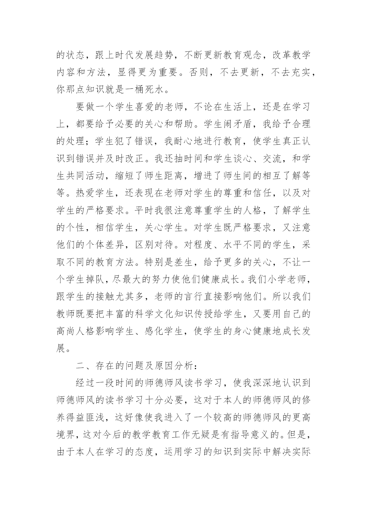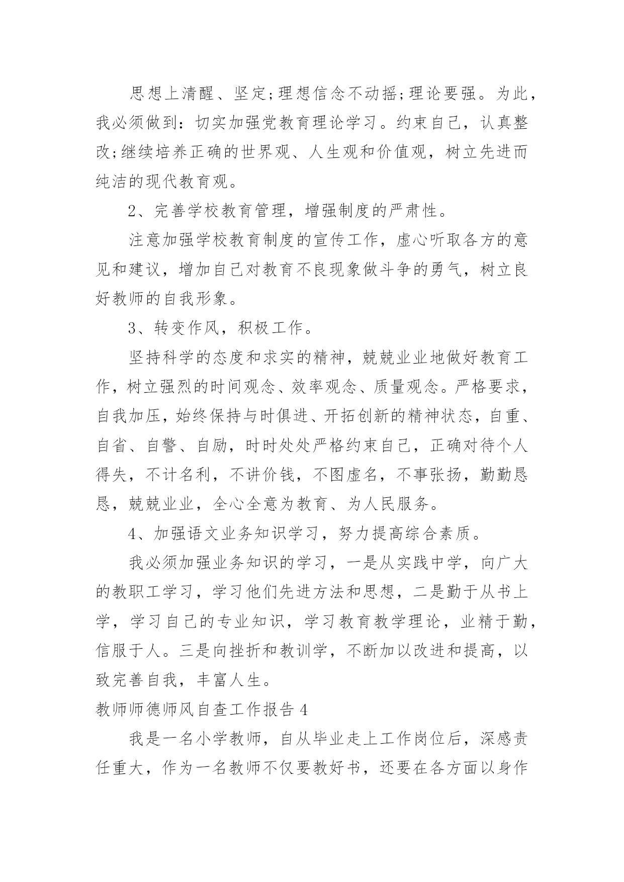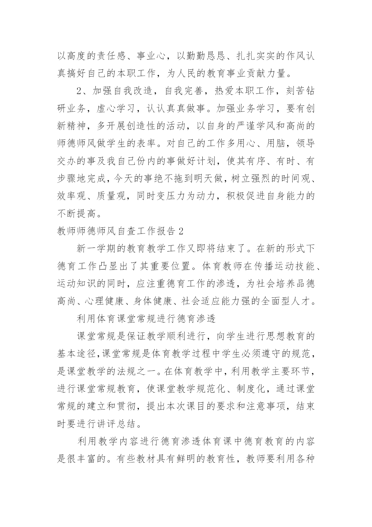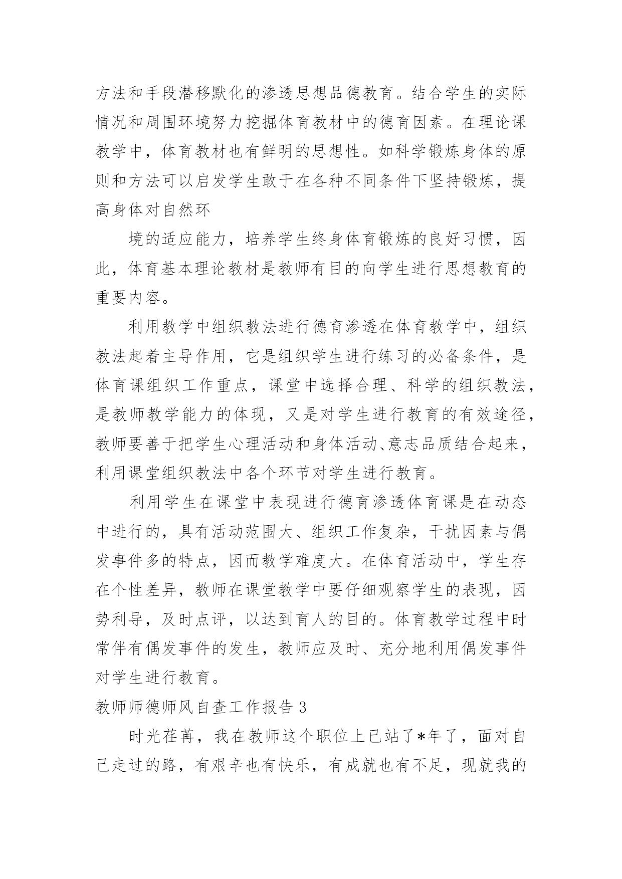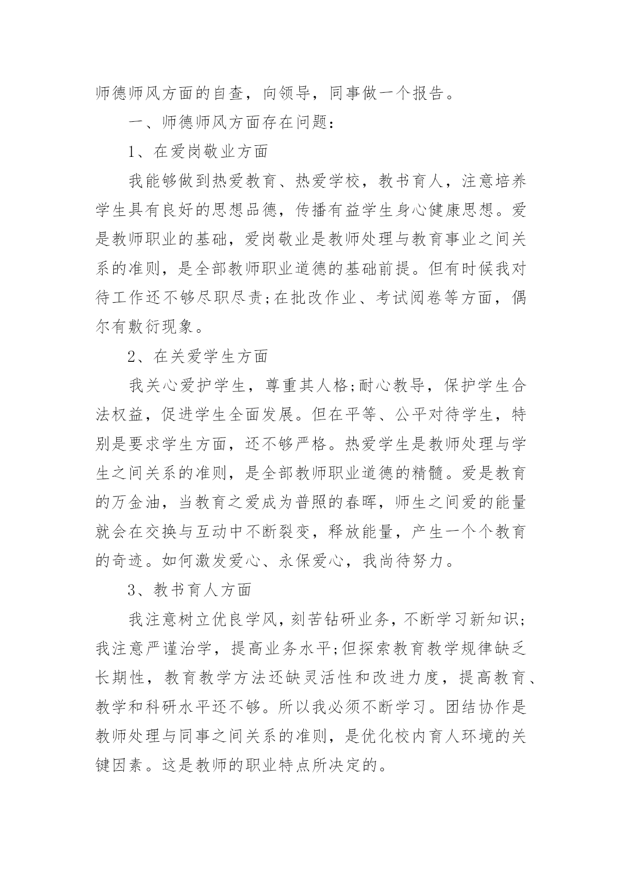教师师德师风自查工作报告教师师德师风自查工作报告随着社会不断地进步,报告不再是罕见的东西,我们在写报告的时候要注意语言要准确、简洁。那么报告应该怎么写才合适呢?下面是小编为大家整理的教师师德师风自查工作报告,欢迎大家借鉴与参考,希望对大家有所帮助。教师师德师风自查工作报告1“德高为师,身正为范”,师德是教师的灵魂,是教师立身之本,是教育教学的前提和保证。为了培育自己高尚的师德,我经常对自己的各个方面反思回顾,找出缺点与不足,以便把自己的工作做得更好一些。现将我师德师风方面的表现自查情况汇报如下:一、存在问题1、在爱岗敬业方面:我能够做到热爱教育、热爱学校,教书育人,注意培养学生具有良好的思想品德,传播有益学生身心健康思想。爱是教师职业的基础,爱岗敬业是教师处理与教育事业之间关系的准则,是全部教师职业道德的基础前提。但有时候我对待工作还不够尽职尽责;在批改作业、考试阅卷等方面,偶尔有敷衍现象。2、自学不够,学习的层次不高。当今世界瞬息万变,发展迅速。要适应这种变化,只有加强学习,注重自身素质的不断提高,做到与时俱进。回顾已走过的路,虽然各方面或多或少有一定的提高,但总的来说,进步并不算太大。尤其是在文化素养、科学思想、管理方法、科研能力、学习水平等诸多方面还很欠缺,与其他老师相比还存在较大的差距。归根到底是缺乏学习的自觉性与主动性。在工作中忽视了知识能力的培养再造,对业务知识掌握不够,没有意识到业务水平的高低对工作效率和质量起决定性作用。3、在严谨治学方面不够深,工作缺乏创新。对待工作不够主动、积极,只满足于完成领导交给的现有任务,在工作中遇到难题,不善于思考,动脑筋。对业务知识的掌握不够重视,缺乏敬业精神。虽然感到有潜在的压力和紧迫感,但缺乏向上攀登的勇气和刻苦钻研、锲而不舍,持之以恒的学习精神和态度,在业务钻研上存在依赖性,缺乏创新精神,没有创造性地开展工作。二、主要原因:1、现代教育理论、政策法规学习不够深入,放松了依法治教这个准则。2、缺乏刻苦耐劳精神和态度,因而提高教育、教学和科研水平还不够快。3、降低了自我要求的标准,缺乏对为人师表是教育事业对教师人格提出的特殊要求的理解。三、整改措施:1、加强政治理论学习,不断提高自己的思想道德素质,坚定正确政治方向,树立正确的世界观,人生观、价值观,以高度的责任感、事业心,以勤勤恳恳、扎扎实实的作风认真搞好自己的本职工作,为人民的教育事业贡献力量。2、加强自我改造,自我完善,热爱本职工作,刻苦钻研业务,虚心学习,认认真真做事。加强业务学习,要有创新精神,多开展创造性的活动,以自身的严谨学风和高尚的师德师风做学生的表率。对自己的工作多用心、用脑,领导交办的事及我自己份内的事做好计划,使其有序、有时、有步骤地完成,今天的事绝不拖到明天做,树立强烈的时间观、效率观、质量观,同时变压力为动力,积极促进自身能力的不断提高。教师师德师风自查工作报告2新一学期的教育教学工作又即将结束了。在新的形式下德育工作凸显出了其重要位置。体育教师在传播运动技能、运动知识的同时,应注重德育工作的渗透,为社会培养品德高尚、心理健康、身体健康、社会适应能力强的全面型人才。利用体育课堂常规进行德育渗透课堂常规是保证教学顺利进行,向学生进行思想教育的基本途径,课堂常规是体育教学过程中学生必须遵守的规范,是课堂教学的法规之一。在体育教学中,利用教学主要环节,进行课堂常规教育,使课堂教学规范化、制度化,通过课堂常规的建立和贯彻,提出本次课目的要求和注意事项,结束时要进行讲评总结。利用教学内容进行德育渗透体育课中德育教育的内容是很丰富的。有些教材具有鲜明的教育性,教师要利用各种方法和手段潜移默化的渗透思想品德教育。结合学生的实际情况和周围环境努力挖掘体育教材中的德育因素。在理论课教学中,体育教材也有鲜明的思想性。如科学锻炼身体的原则和方法可以启发学生敢于在各种不同条件下坚持锻炼,提高身体对自然环境的适应能力,培养学生终身体育锻炼的良好习惯,因此,体育基本理论教材是教师有目的向学生进行思想教育的重要内容。利用教学中组织教法进行德育渗透在体育教学中,组织教法起着主导作用,它是组织学生进行练习的必备条件,是体育课组织工作重点,课堂中选择合理、科学的组织教法,是教师教学能力的体现,又是对学生进行教育的有效途径,教师要善于把学生心理活动和身体活动、意志品质结合起来,利用课堂组织教法中各个环节对学生进行教育。利用学生在课堂中表现进行德育渗透体育课是在动态中进行的,具有活动范围大、组织工作复杂,干扰因素与偶发事件多的特点,因而教学难度大。在体育活动中,学生存在个性差异,教师在课堂教学中要仔细观察学生的表现,因势利导,及时点评,以达到育人的目的。体育教学过程中时常伴有偶发事件的发生,教师应及时、充分地利用偶发事件对学生进行教育。教师