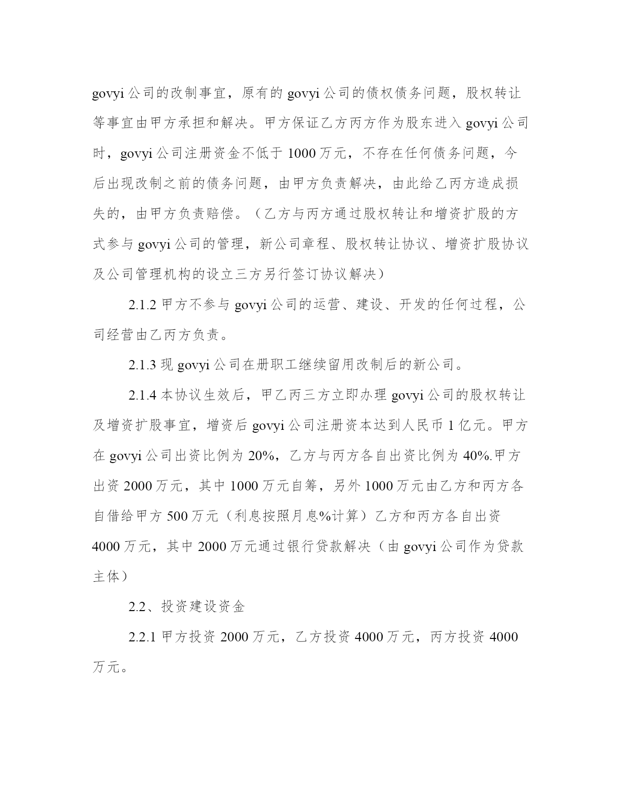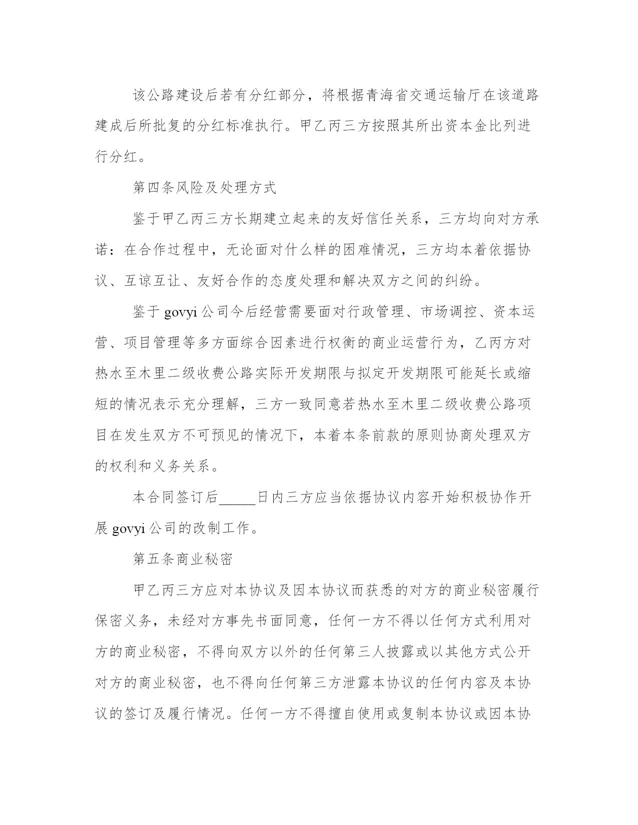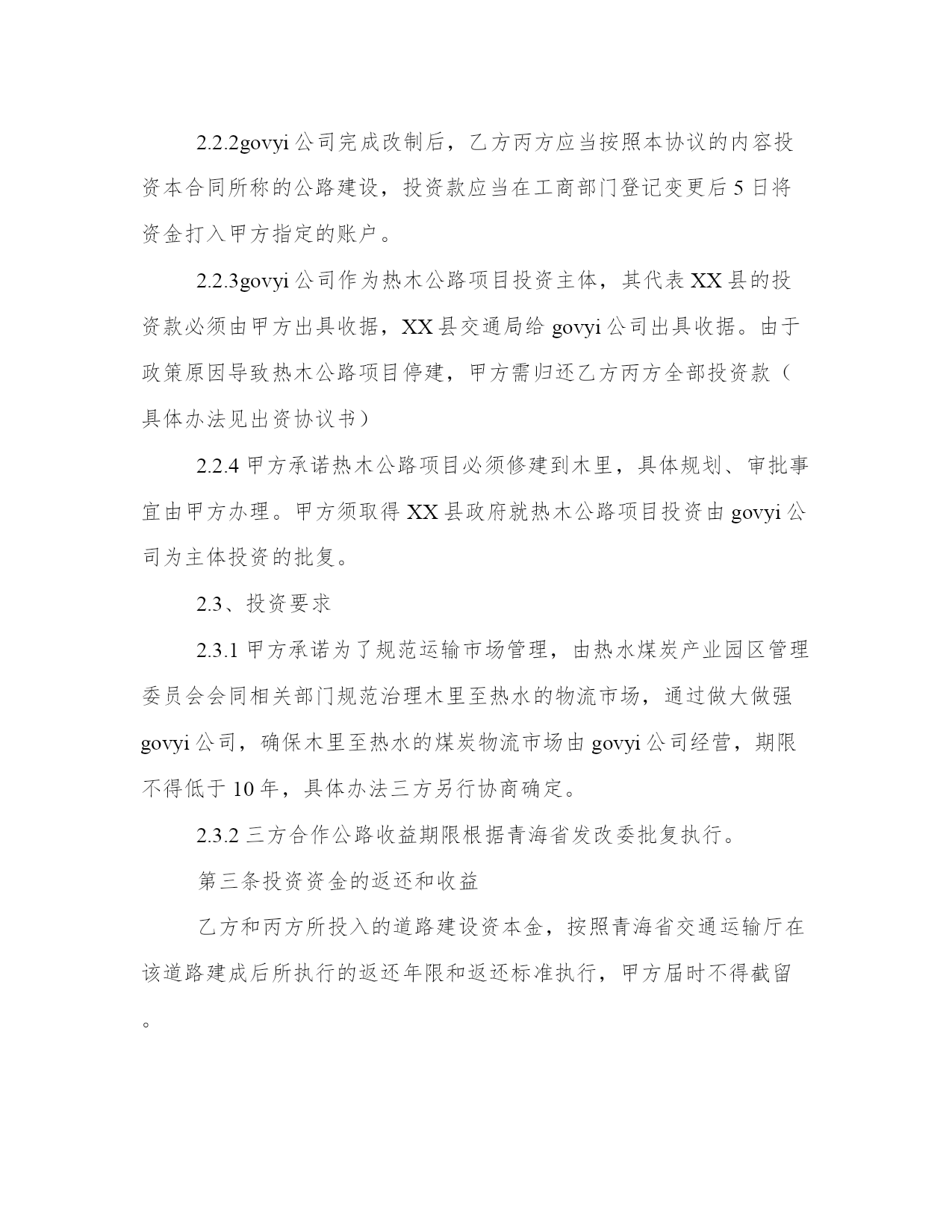 2024年投资项目合同工作汇报甲方:__________乙方:__________丙方:__________甲方签订本协议已获得XX县政府的授权,作为XX县人民政府的代表,与乙方和丙方进行协商和签订协议。经青海省交通厅批准修建热水至木里二级收费公路,由于甲方需要筹措资金。因此与具有投资的实力的乙方丙方协商后,乙方丙方愿意作为投资方参与公路建设。本着互利互惠、共同发展的原则,经充分协商,就该道路建设事宜达成如下投资意向,供三方共同遵守。第一条:项目概况项目名称:govyi*。甲方作为XX县政府的代表,承担20%即2000万元,乙方、丙方作为投资方,各出资40%即各出资4000万元。第二条乙方丙方投资的条件2.1、三方共同改制govyi公司,成立新的股份公司。2.1.1甲乙丙三方同意以govyi公司为出资载体,由govyi公司的名义投资热木公路项目建设。由于投资前的夏格尔公司为国有独资企业,需要经过相关的审批。所以甲方承诺在乙方丙方投资前解决govyi公司的改制事宜,企业改制方案由甲方报政府审批,审批后三方进行govyi公司的改制事宜,原有的govyi公司的债权债务问题,股权转让等事宜由甲方承担和解决。甲方保证乙方丙方作为股东进入govyi公司时,govyi公司注册资金不低于1000万元,不存在任何债务问题,今后出现改制之前的债务问题,由甲方负责解决,由此给乙丙方造成损失的,由甲方负责赔偿。(乙方与丙方通过股权转让和增资扩股的方式参与govyi公司的管理,新公司章程、股权转让协议、增资扩股协议及公司管理机构的设立三方另行签订协议解决)2.1.2甲方不参与govyi公司的运营、建设、开发的任何过程,公司经营由乙丙方负责。2.1.3现govyi公司在册职工继续留用改制后的新公司。2.1.4本协议生效后,甲乙丙三方立即办理govyi公司的股权转让及增资扩股事宜,增资后govyi公司注册资本达到人民币1亿元。甲方在govyi公司出资比例为20%,乙方与丙方各自出资比例为40%.甲方出资2000万元,其中1000万元自筹,另外1000万元由乙方和丙方各自借给甲方500万元(利息按照月息%计算)乙方和丙方各自出资4000万元,其中2000万元通过银行贷款解决(由govyi公司作为贷款主体)2.2、投资建设资金2.2.1甲方投资2000万元,乙方投资4000万元,丙方投资4000万元。2.2.2govyi公司完成改制后,乙方丙方应当按照本协议的内容投资本合同所称的公路建设,投资款应当在工商部门登记变更后5日将资金打入甲方指定的账户。2.2.3govyi公司作为热木公路项目投资主体,其代表XX县的投资款必须由甲方出具收据,XX县交通局给govyi公司出具收据。由于政策原因导致热木公路项目停建,甲方需归还乙方丙方全部投资款(具体办法见出资协议书)2.2.4甲方承诺热木公路项目必须修建到木里,具体规划、审批事宜由甲方办理。甲方须取得XX县政府就热木公路项目投资由govyi公司为主体投资的批复。2.3、投资要求2.3.1甲方承诺为了规范运输市场管理,由热水煤炭产业园区管理委员会会同相关部门规范治理木里至热水的物流市场,通过做大做强govyi公司,确保木里至热水的煤炭物流市场由govyi公司经营,期限不得低于10年,具体办法三方另行协商确定。2.3.2三方合作公路收益期限根据青海省发改委批复执行。第三条投资资金的返还和收益乙方和丙方所投入的道路建设资本金,按照青海省交通运输厅在该道路建成后所执行的返还年限和返还标准执行,甲方届时不得截留。该公路建设后若有分红部分,将根据青海省交通运输厅在该道路建成后所批复的分红标准执行。甲乙丙三方按照其所出资本金比列进行分红。第四条风险及处理方式鉴于甲乙丙三方长期建立起来的友好信任关系,三方均向对方承诺:在合作过程中,无论面对什么样的困难情况,三方均本着依据协议、互谅互让、友好合作的态度处理和解决双方之间的纠纷。鉴于govyi公司今后经营需要面对行政管理、市场调控、资本运营、项目管理等多方面综合因素进行权衡的商业运营行为,乙丙方对热水至木里二级收费公路实际开发期限与拟定开发期限可能延长或缩短的情况表示充分理解,三方一致同意若热水至木里二级收费公路项目在发生双方不可预见的情况下,本着本条前款的原则协商处理双方的权利和义务关系。本合同签订后_____日内三方应当依据协议内容开始积极协作开展govyi公司的改制工作。第五条商业秘密甲乙丙三方应对本协议及因本协议而获悉的对方的商业秘密履行保密义务,未经对方事先书面同意,任何一方不得以任何方式利用对方的商业秘密,不得向双方以外的任何第三人披露或以其他方式公开对方的商业秘密,也不得向任何第三方泄露本协议的任何内容及本协议的