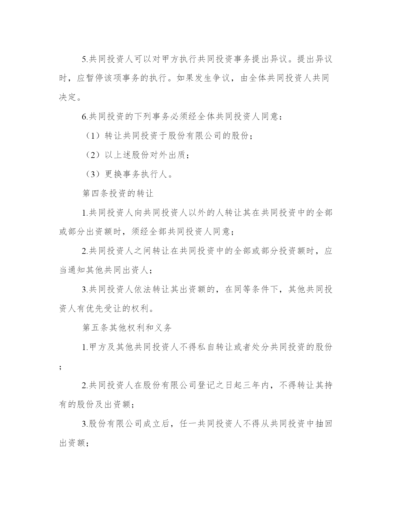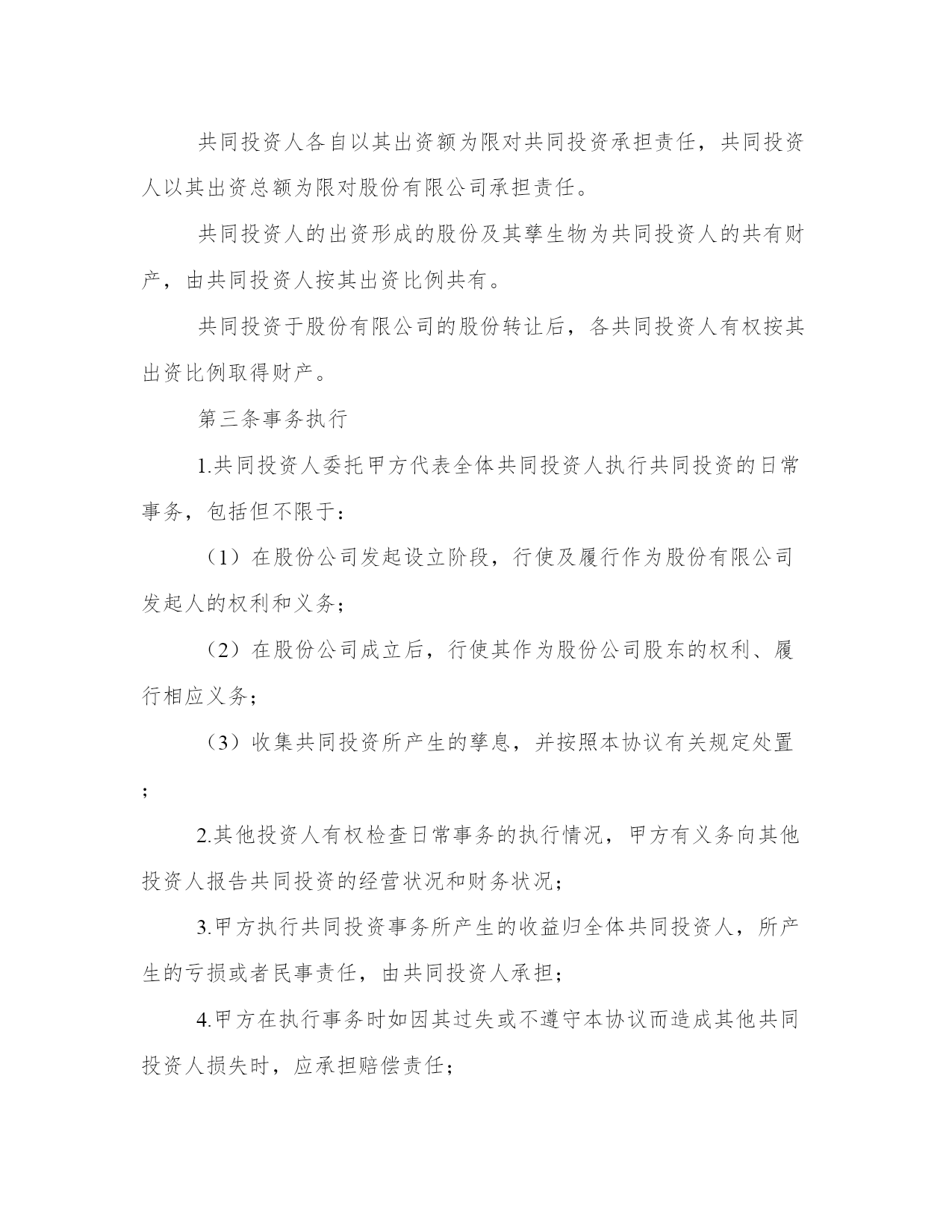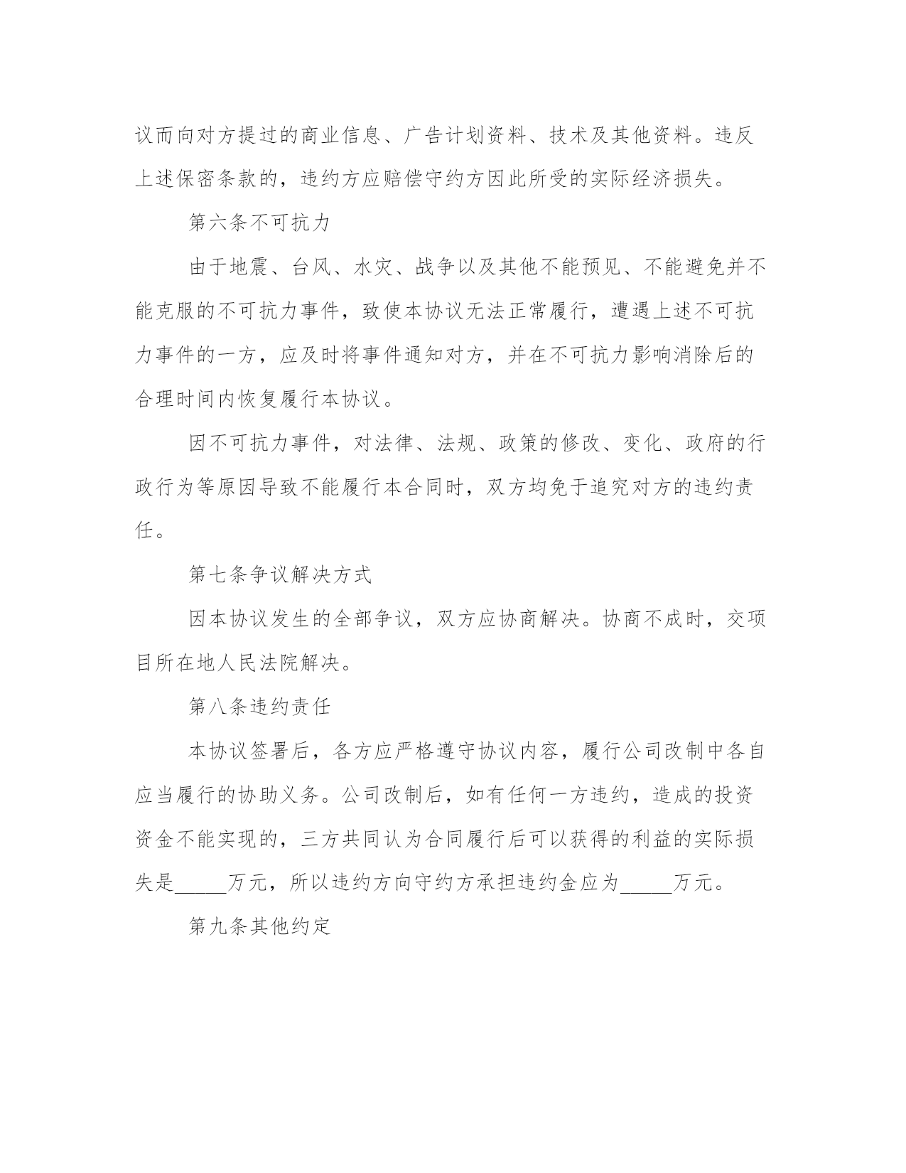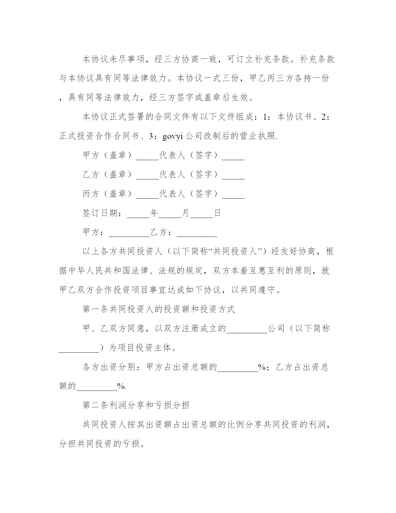 2024年投资项目合同工作汇报甲方:__________乙方:__________丙方:__________甲方签订本协议已获得XX县政府的授权,作为XX县人民政府的代表,与乙方和丙方进行协商和签订协议。经青海省交通厅批准修建热水至木里二级收费公路,由于甲方需要筹措资金。因此与具有投资的实力的乙方丙方协商后,乙方丙方愿意作为投资方参与公路建设。本着互利互惠、共同发展的原则,经充分协商,就该道路建设事宜达成如下投资意向,供三方共同遵守。第一条:项目概况项目名称:govyi*。甲方作为XX县政府的代表,承担20%即2000万元,乙方、丙方作为投资方,各出资40%即各出资4000万元。第二条乙方丙方投资的条件2.1、三方共同改制govyi公司,成立新的股份公司。2.1.1甲乙丙三方同意以govyi公司为出资载体,由govyi公司的名义投资热木公路项目建设。由于投资前的夏格尔公司为国有独资企业,需要经过相关的审批。所以甲方承诺在乙方丙方投资前解决govyi公司的改制事宜,企业改制方案由甲方报政府审批,审批后三方进行govyi公司的改制事宜,原有的govyi公司的债权债务问题,股权转让等事宜由甲方承担和解决。甲方保证乙方丙方作为股东进入govyi公司时,govyi公司注册资金不低于1000万元,不存在任何债务问题,今后出现改制之前的债务问题,由甲方负责解决,由此给乙丙方造成损失的,由甲方负责赔偿。(乙方与丙方通过股权转让和增资扩股的方式参与govyi公司的管理,新公司章程、股权转让协议、增资扩股协议及公司管理机构的设立三方另行签订协议解决)2.1.2甲方不参与govyi公司的运营、建设、开发的任何过程,公司经营由乙丙方负责。2.1.3现govyi公司在册职工继续留用改制后的新公司。2.1.4本协议生效后,甲乙丙三方立即办理govyi公司的股权转让及增资扩股事宜,增资后govyi公司注册资本达到人民币1亿元。甲方在govyi公司出资比例为20%,乙方与丙方各自出资比例为40%.甲方出资2000万元,其中1000万元自筹,另外1000万元由乙方和丙方各自借给甲方500万元(利息按照月息%计算)乙方和丙方各自出资4000万元,其中2000万元通过银行贷款解决(由govyi公司作为贷款主体)2.2、投资建设资金2.2.1甲方投资2000万元,乙方投资4000万元,丙方投资4000万元。2.2.2govyi公司完成改制后,乙方丙方应当按照本协议的内容投资本合同所称的公路建设,投资款应当在工商部门登记变更后5日将资金打入甲方指定的账户。2.2.3govyi公司作为热木公路项目投资主体,其代表XX县的投资款必须由甲方出具收据,XX县交通局给govyi公司出具收据。由于政策原因导致热木公路项目停建,甲方需归还乙方丙方全部投资款(具体办法见出资协议书)2.2.4甲方承诺热木公路项目必须修建到木里,具体规划、审批事宜由甲方办理。甲方须取得XX县政府就热木公路项目投资由govyi公司为主体投资的批复。2.3、投资要求2.3.1甲方承诺为了规范运输市场管理,由热水煤炭产业园区管理委员会会同相关部门规范治理木里至热水的物流市场,通过做大做强govyi公司,确保木里至热水的煤炭物流市场由govyi公司经营,期限不得低于10年,具体办法三方另行协商确定。2.3.2三方合作公路收益期限根据青海省发改委批复执行。第三条投资资金的返还和收益乙方和丙方所投入的道路建设资本金,按照青海省交通运输厅在该道路建成后所执行的返还年限和返还标准执行,甲方届时不得截留。该公路建设后若有分红部分,将根据青海省交通运输厅在该道路建成后所批复的分红标准执行。甲乙丙三方按照其所出资本金比列进行分红。第四条风险及处理方式鉴于甲乙丙三方长期建立起来的友好信任关系,三方均向对方承诺:在合作过程中,无论面对什么样的困难情况,三方均本着依据协议、互谅互让、友好合作的态度处理和解决双方之间的纠纷。鉴于govyi公司今后经营需要面对行政管理、市场调控、资本运营、项目管理等多方面综合因素进行权衡的商业运营行为,乙丙方对热水至木里二级收费公路实际开发期限与拟定开发期限可能延长或缩短的情况表示充分理解,三方一致同意若热水至木里二级收费公路项目在发生双方不可预见的情况下,本着本条前款的原则协商处理双方的权利和义务关系。本合同签订后_____日内三方应当依据协议内容开始积极协作开展govyi公司的改制工作。第五条商业秘密甲乙丙三方应对本协议及因本协议而获悉的对方的商业秘密履行保密义务,未经对方事先书面同意,任何一方不得以任何方式利用对方的商业秘密,不得向双方以外的任何第三人披露或以其他方式公开对方的商业秘密,也不得向任何第三方泄露本协议的任何内容及本协议的