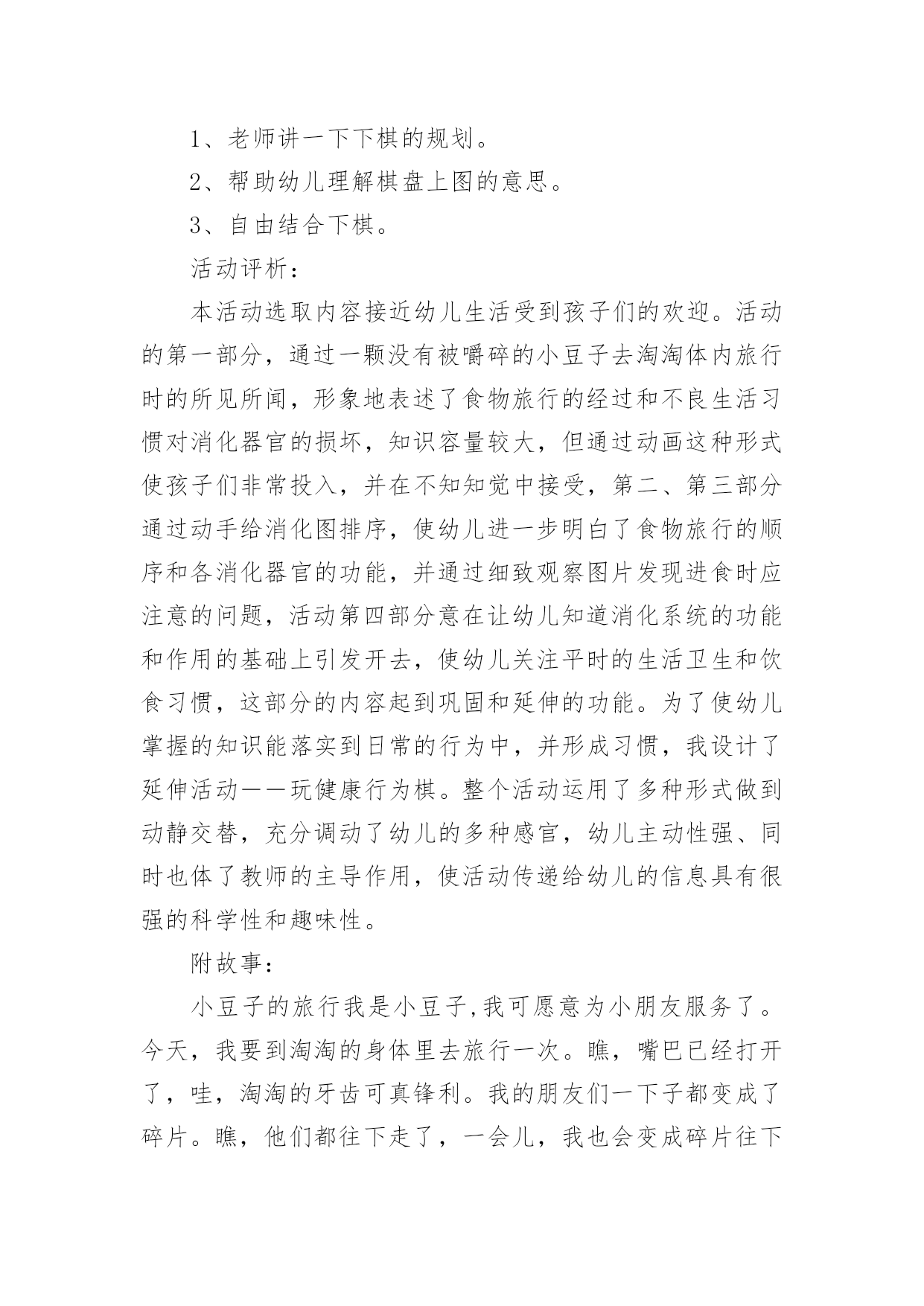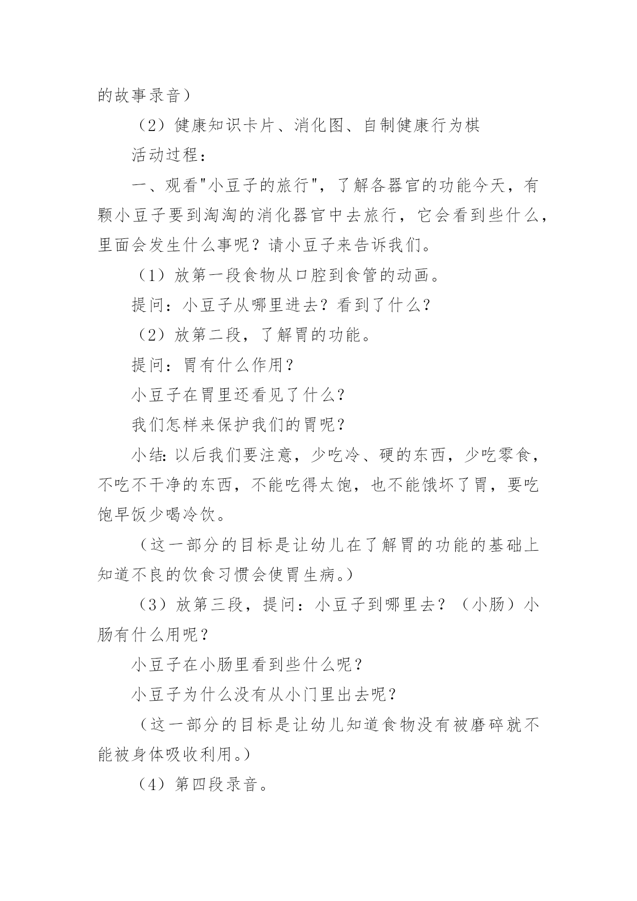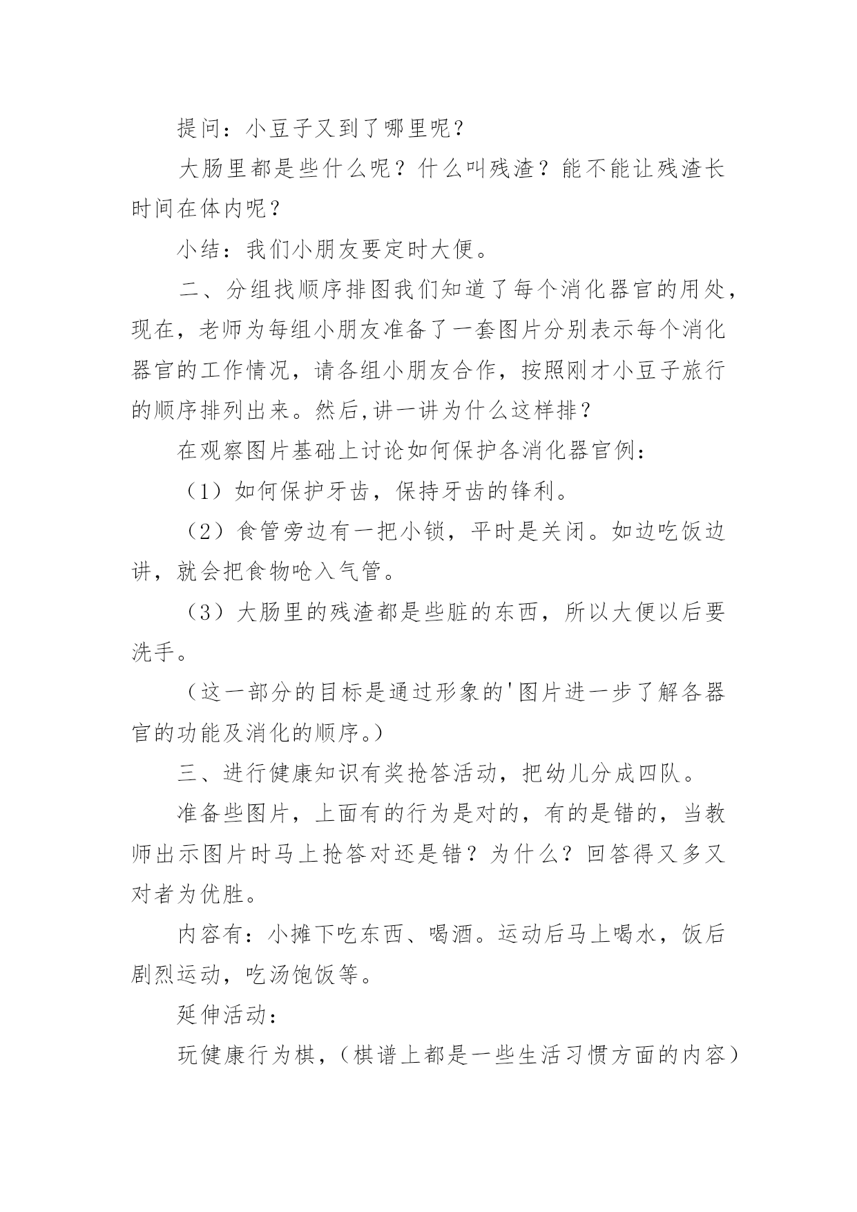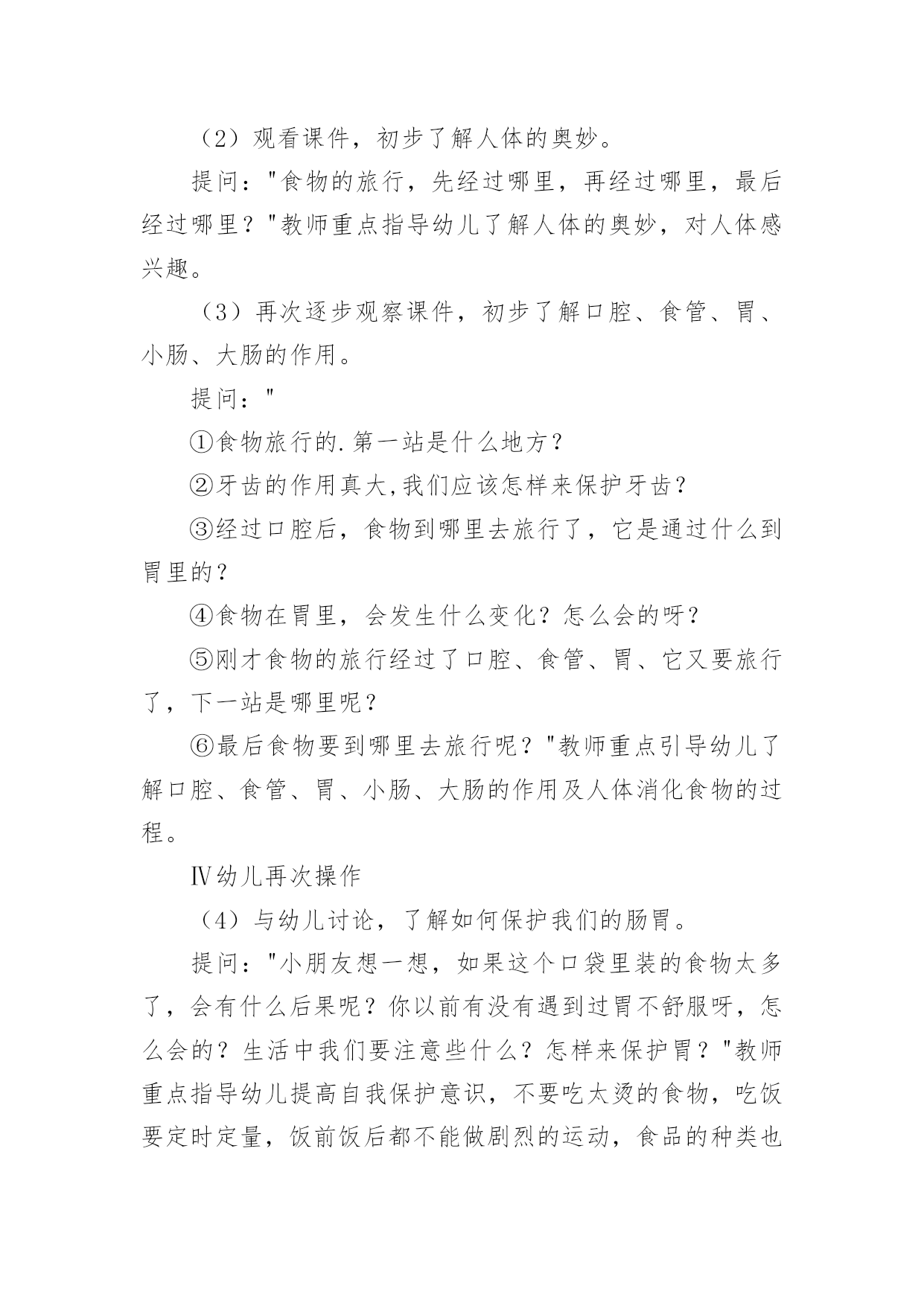 大班健康教案《食物的旅行》大班健康教案《食物的旅行》在教学工作者开展教学活动前,总不可避免地需要编写教案,编写教案有利于我们弄通教材内容,进而选择科学、恰当的教学方法。教案应该怎么写呢?以下是小编帮大家整理的大班健康教案《食物的旅行》,仅供参考,大家一起来看看吧。大班健康教案《食物的旅行》11.活动目标:(1)了解人体消化食物的过程;(2)养成讲卫生的习惯;(3)初步了解人体奥妙,对人体感兴趣。2.活动准备ppt:图片3.活动过程:Ⅰ导入(1)提问导入,引入讨论话题。提问:①"我们每天都要吃东西,那么吃下去的食物到哪里去了呢?"②"食物在人体中是怎样旅行的,经过了哪些地方?"教师重点引导幼儿对情景表演的兴趣。Ⅱ幼儿第一次操作(2)观看课件,初步了解人体的奥妙。提问:"食物的旅行,先经过哪里,再经过哪里,最后经过哪里?"教师重点指导幼儿了解人体的奥妙,对人体感兴趣。(3)再次逐步观察课件,初步了解口腔、食管、胃、小肠、大肠的作用。提问:"①食物旅行的.第一站是什么地方?②牙齿的作用真大,我们应该怎样来保护牙齿?③经过口腔后,食物到哪里去旅行了,它是通过什么到胃里的?④食物在胃里,会发生什么变化?怎么会的呀?⑤刚才食物的旅行经过了口腔、食管、胃、它又要旅行了,下一站是哪里呢?⑥最后食物要到哪里去旅行呢?"教师重点引导幼儿了解口腔、食管、胃、小肠、大肠的作用及人体消化食物的过程。Ⅳ幼儿再次操作(4)与幼儿讨论,了解如何保护我们的肠胃。提问:"小朋友想一想,如果这个口袋里装的食物太多了,会有什么后果呢?你以前有没有遇到过胃不舒服呀,怎么会的?生活中我们要注意些什么?怎样来保护胃?"教师重点指导幼儿提高自我保护意识,不要吃太烫的食物,吃饭要定时定量,饭前饭后都不能做剧烈的运动,食品的种类也要丰富,还不能吃太多的冷饮和零食等等才能保护我们的胃部健康。4.活动延伸在我们人体,除了食物的旅行,还有许多秘密,只要我们认真学本领,长大一定能探索到更多的人体秘密。大班健康教案《食物的旅行》2活动背景:随着人民生活水平的提高,家长为孩子提供的饮食也越来越富有营养,但依然有许多家长抱怨孩子不能好好吃饭,孩子的健康不能得到保证,原因是许多幼儿有一些不良的饮食卫生习惯,如:不吃早饭、大量喝饮料、吃冷饮、不定时大便等。为了使孩子们明白食物在体内消化吸收的过程,养成良好的饮食和卫生习惯,学习保护自己的健康,我创编了《小豆子的旅行》教材并设计了本次活动。活动目标:1、让幼儿了解各消化器官的功能和食物在人体内消化吸收过程2、学习简单的自我保护方法3、培养幼儿良好的饮食和卫生习惯4、知道检查身体的重要性。5、引导孩子乐于接受治疗。鼓励、培养小朋友不怕打针的勇敢精神。活动准备:(1)电脑制作《小豆子的旅行》(或图片及小豆子旅行的故事录音)(2)健康知识卡片、消化图、自制健康行为棋活动过程:一、观看"小豆子的旅行",了解各器官的功能今天,有颗小豆子要到淘淘的消化器官中去旅行,它会看到些什么,里面会发生什么事呢?请小豆子来告诉我们。(1)放第一段食物从口腔到食管的动画。提问:小豆子从哪里进去?看到了什么?(2)放第二段,了解胃的功能。提问:胃有什么作用?小豆子在胃里还看见了什么?我们怎样来保护我们的胃呢?小结:以后我们要注意,少吃冷、硬的东西,少吃零食,不吃不干净的东西,不能吃得太饱,也不能饿坏了胃,要吃饱早饭少喝冷饮。(这一部分的目标是让幼儿在了解胃的功能的基础上知道不良的饮食习惯会使胃生病。)(3)放第三段,提问:小豆子到哪里去?(小肠)小肠有什么用呢?小豆子在小肠里看到些什么呢?小豆子为什么没有从小门里出去呢?(这一部分的目标是让幼儿知道食物没有被磨碎就不能被身体吸收利用。)(4)第四段录音。提问:小豆子又到了哪里呢?大肠里都是些什么呢?什么叫残渣?能不能让残渣长时间在体内呢?小结:我们小朋友要定时大便。二、分组找顺序排图我们知道了每个消化器官的用处,现在,老师为每组小朋友准备了一套图片分别表示每个消化器官的工作情况,请各组小朋友合作,按照刚才小豆子旅行的顺序排列出来。然后,讲一讲为什么这样排?在观察图片基础上讨论如何保护各消化器官例:(1)如何保护牙齿,保持牙齿的锋利。(2)食管旁边有一把小锁,平时是关闭。如边吃饭边讲,就会把食物呛入气管。(3)大肠里的残渣都是些脏的东西,所以大便以后要洗手。(这一部分的目标是通过形象的'图片进一步了解各器官的功能及消化的顺序。)三、进行健康知识有奖抢答活动,把幼儿分成四队。准备些图片,上面有的行为是对的,有的是错的,当教师出示图片时马上抢答对还是错?为什么?回答得又多又对者为优胜。内容有:小摊下吃东西、喝酒。运动后马上喝水,饭后剧烈运动,吃汤饱饭等。延伸活动:玩健康行为棋,(棋谱上都是一些生活习惯方面的内容)1、老师讲一下下