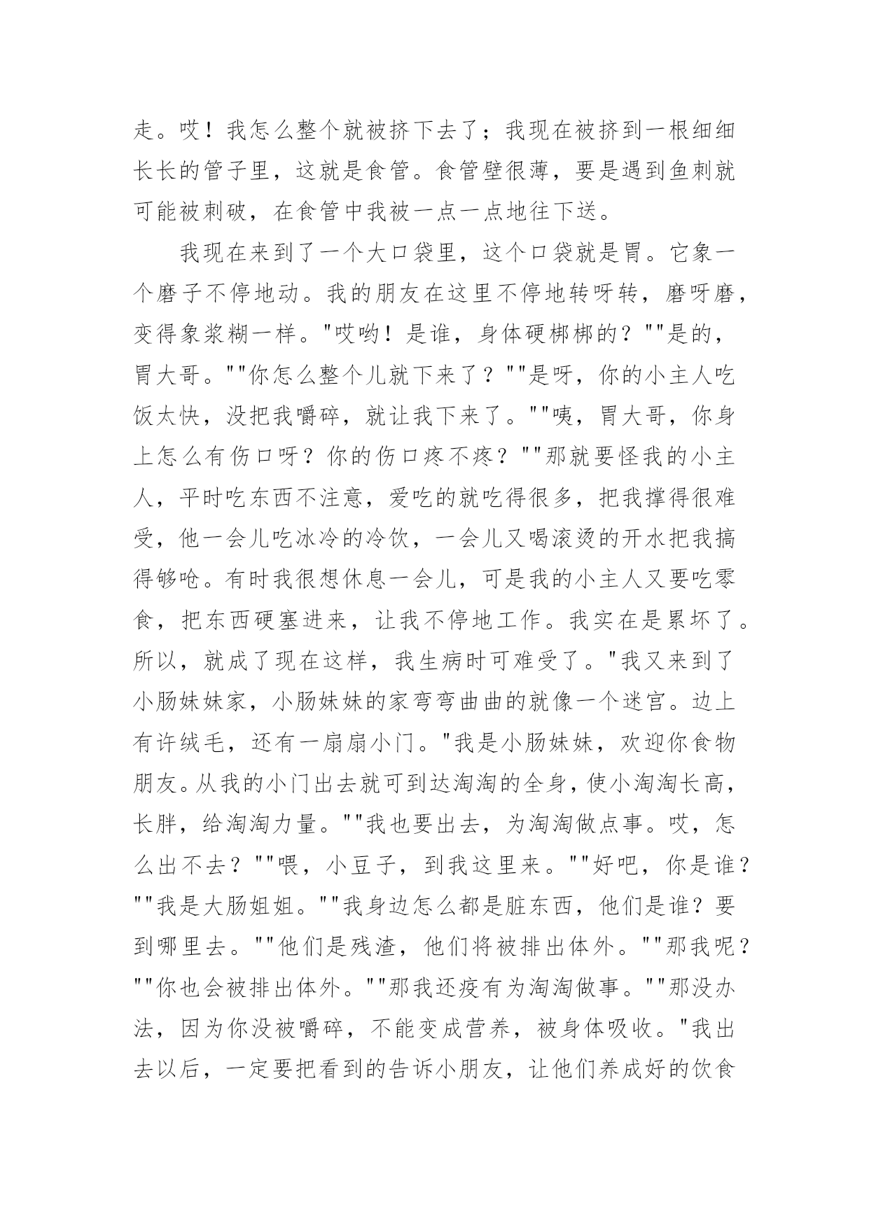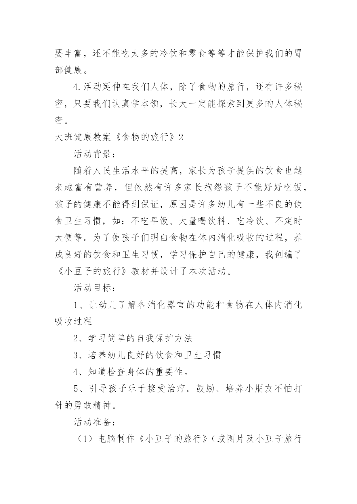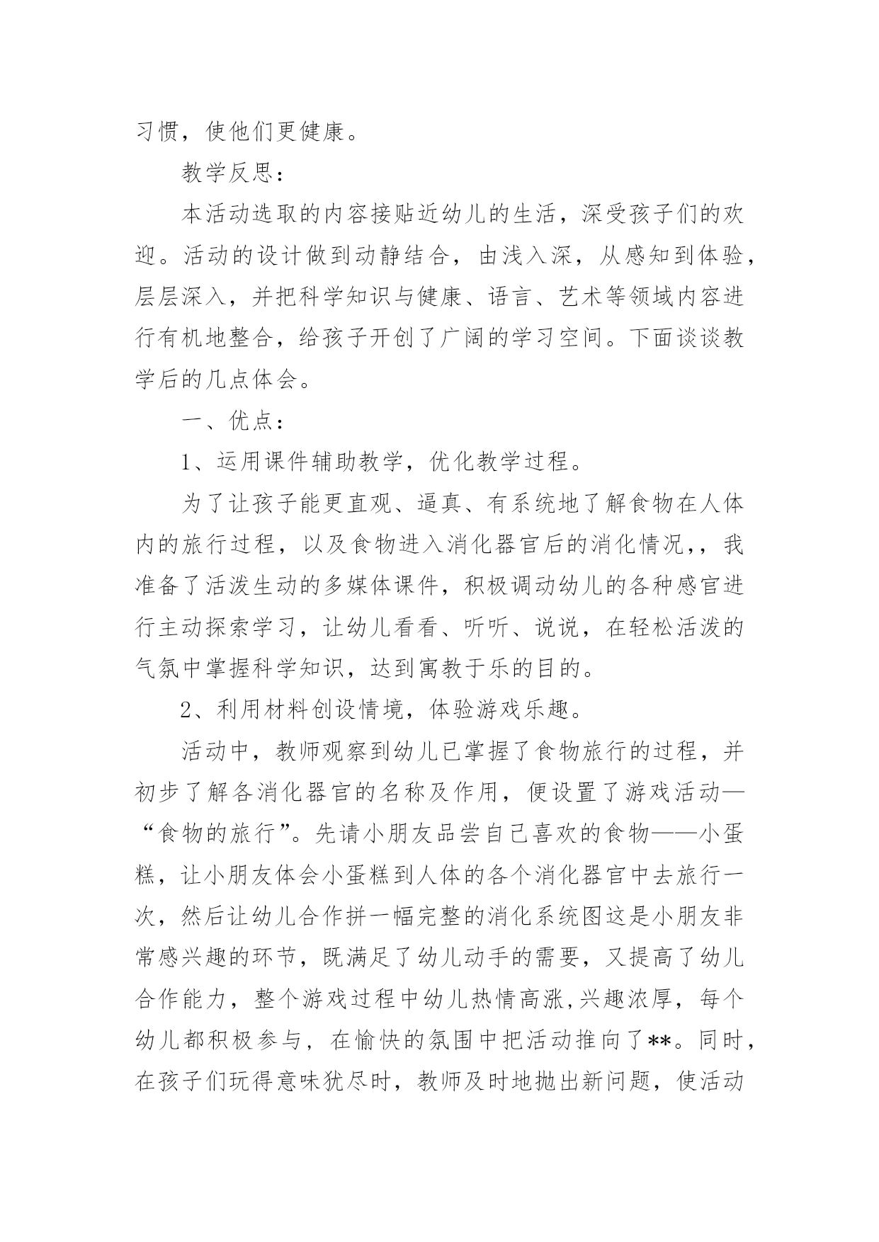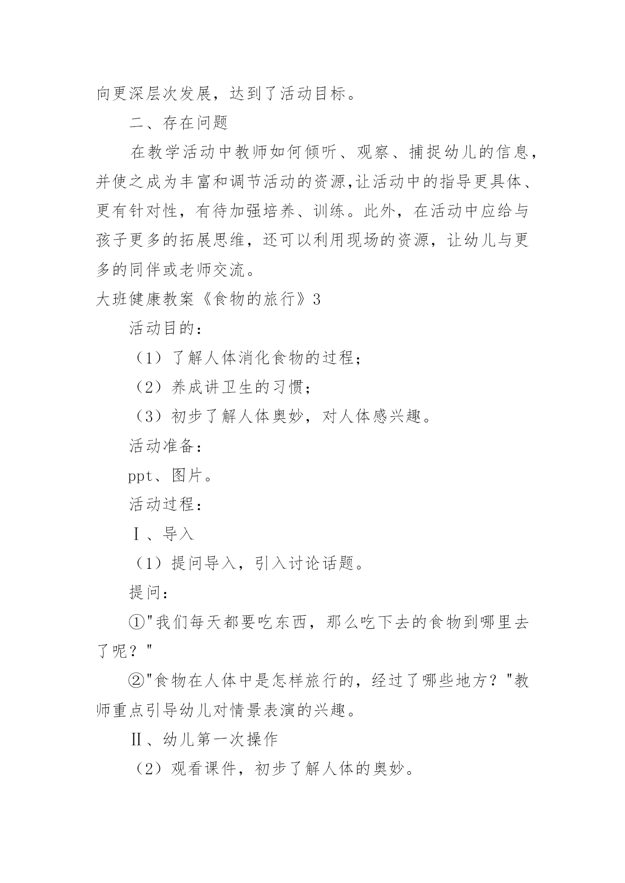 大班健康教案《食物的旅行》大班健康教案《食物的旅行》在教学工作者开展教学活动前,总不可避免地需要编写教案,编写教案有利于我们弄通教材内容,进而选择科学、恰当的教学方法。教案应该怎么写呢?以下是小编帮大家整理的大班健康教案《食物的旅行》,仅供参考,大家一起来看看吧。大班健康教案《食物的旅行》11.活动目标:(1)了解人体消化食物的过程;(2)养成讲卫生的习惯;(3)初步了解人体奥妙,对人体感兴趣。2.活动准备ppt:图片3.活动过程:Ⅰ导入(1)提问导入,引入讨论话题。提问:①"我们每天都要吃东西,那么吃下去的食物到哪里去了呢?"②"食物在人体中是怎样旅行的,经过了哪些地方?"教师重点引导幼儿对情景表演的兴趣。Ⅱ幼儿第一次操作(2)观看课件,初步了解人体的奥妙。提问:"食物的旅行,先经过哪里,再经过哪里,最后经过哪里?"教师重点指导幼儿了解人体的奥妙,对人体感兴趣。(3)再次逐步观察课件,初步了解口腔、食管、胃、小肠、大肠的作用。提问:"①食物旅行的.第一站是什么地方?②牙齿的作用真大,我们应该怎样来保护牙齿?③经过口腔后,食物到哪里去旅行了,它是通过什么到胃里的?④食物在胃里,会发生什么变化?怎么会的呀?⑤刚才食物的旅行经过了口腔、食管、胃、它又要旅行了,下一站是哪里呢?⑥最后食物要到哪里去旅行呢?"教师重点引导幼儿了解口腔、食管、胃、小肠、大肠的作用及人体消化食物的过程。Ⅳ幼儿再次操作(4)与幼儿讨论,了解如何保护我们的肠胃。提问:"小朋友想一想,如果这个口袋里装的食物太多了,会有什么后果呢?你以前有没有遇到过胃不舒服呀,怎么会的?生活中我们要注意些什么?怎样来保护胃?"教师重点指导幼儿提高自我保护意识,不要吃太烫的食物,吃饭要定时定量,饭前饭后都不能做剧烈的运动,食品的种类也要丰富,还不能吃太多的冷饮和零食等等才能保护我们的胃部健康。4.活动延伸在我们人体,除了食物的旅行,还有许多秘密,只要我们认真学本领,长大一定能探索到更多的人体秘密。大班健康教案《食物的旅行》2活动背景:随着人民生活水平的提高,家长为孩子提供的饮食也越来越富有营养,但依然有许多家长抱怨孩子不能好好吃饭,孩子的健康不能得到保证,原因是许多幼儿有一些不良的饮食卫生习惯,如:不吃早饭、大量喝饮料、吃冷饮、不定时大便等。为了使孩子们明白食物在体内消化吸收的过程,养成良好的饮食和卫生习惯,学习保护自己的健康,我创编了《小豆子的旅行》教材并设计了本次活动。活动目标:1、让幼儿了解各消化器官的功能和食物在人体内消化吸收过程2、学习简单的自我保护方法3、培养幼儿良好的饮食和卫生习惯4、知道检查身体的重要性。5、引导孩子乐于接受治疗。鼓励、培养小朋友不怕打针的勇敢精神。活动准备:(1)电脑制作《小豆子的旅行》(或图片及小豆子旅行的故事录音)(2)健康知识卡片、消化图、自制健康行为棋活动过程:一、观看"小豆子的旅行",了解各器官的功能今天,有颗小豆子要到淘淘的消化器官中去旅行,它会看到些什么,里面会发生什么事呢?请小豆子来告诉我们。(1)放第一段食物从口腔到食管的动画。提问:小豆子从哪里进去?看到了什么?(2)放第二段,了解胃的功能。提问:胃有什么作用?小豆子在胃里还看见了什么?我们怎样来保护我们的胃呢?小结:以后我们要注意,少吃冷、硬的东西,少吃零食,不吃不干净的东西,不能吃得太饱,也不能饿坏了胃,要吃饱早饭少喝冷饮。(这一部分的目标是让幼儿在了解胃的功能的基础上知道不良的饮食习惯会使胃生病。)(3)放第三段,提问:小豆子到哪里去?(小肠)小肠有什么用呢?小豆子在小肠里看到些什么呢?小豆子为什么没有从小门里出去呢?(这一部分的目标是让幼儿知道食物没有被磨碎就不能被身体吸收利用。)(4)第四段录音。提问:小豆子又到了哪里呢?大肠里都是些什么呢?什么叫残渣?能不能让残渣长时间在体内呢?小结:我们小朋友要定时大便。二、分组找顺序排图我们知道了每个消化器官的用处,现在,老师为每组小朋友准备了一套图片分别表示每个消化器官的工作情况,请各组小朋友合作,按照刚才小豆子旅行的顺序排列出来。然后,讲一讲为什么这样排?在观察图片基础上讨论如何保护各消化器官例:(1)如何保护牙齿,保持牙齿的锋利。(2)食管旁边有一把小锁,平时是关闭。如边吃饭边讲,就会把食物呛入气管。(3)大肠里的残渣都是些脏的东西,所以大便以后要洗手。(这一部分的目标是通过形象的'图片进一步了解各器官的功能及消化的顺序。)三、进行健康知识有奖抢答活动,把幼儿分成四队。准备些图片,上面有的行为是对的,有的是错的,当教师出示图片时马上抢答对还是错?为什么?回答得又多又对者为优胜。内容有:小摊下吃东西、喝酒。运动后马上喝水,饭后剧烈运动,吃汤饱饭等。延伸活动:玩健康行为棋,(棋谱上都是一些生活习惯方面的内容)1、老师讲一下下