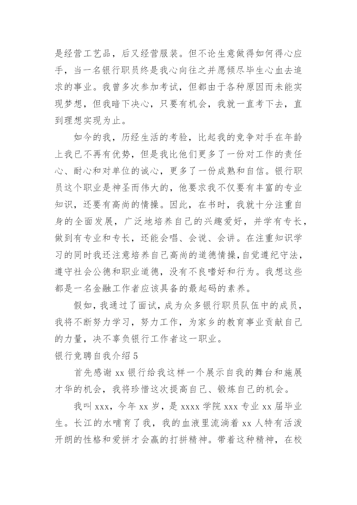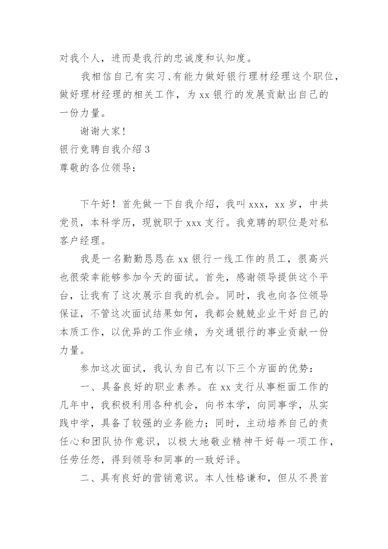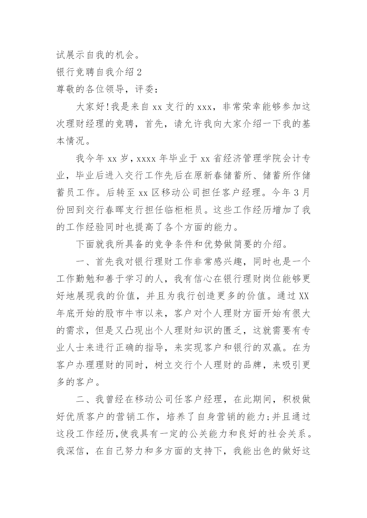 银行竞聘自我介绍银行竞聘自我介绍当我们在一个陌生场合中,通常需要我们进行自我介绍,用自我介绍往往可以向他人介绍自己。写自我介绍可不能随随便便哦,以下是小编为大家收集的银行竞聘自我介绍,欢迎大家借鉴与参考,希望对大家有所帮助。银行竞聘自我介绍1各位考官:上午好!您好,我叫xxx。xxxx年x月即将毕业于xxxxx信息管理学院,我的专业是信息管理与信息系统。今天很荣幸能来到这里参加贵行的面试,对于一个即将踏入社会工作岗位的我来说,我是很期待能在工作中找到自我的价值的体现。在学校期间,我非常喜欢参加各项团队活动,因为在那能找到和大家合作的愉快和感受到团队胜利的喜悦。我参加过学校社团管理办公室组织部学生工作,虽然只有短短的一年多,但在那段时间让我体会到了和大家一起合作的快乐。为了锻炼自己,作为一个在校生,利用假期时间曾经去做过促销员,以及在金凤呈祥蛋糕店做过销售人员。我这人喜欢亲手去尝试和了解很多期待的事物,做事还算有毅力,能够团结周围的人,性格开朗,诚实守信。不过也有点缺,就是有点成就,爱沾沾自喜,在今后的工作学习中,我会注意并努力改正的。谢谢今天您们能在这里给我一个面试展示自我的机会。银行竞聘自我介绍2尊敬的各位领导,评委:大家好!我是来自xx支行的xxx,非常荣幸能够参加这次理财经理的竞聘,首先,请允许我向大家介绍一下我的基本情况。我今年xx岁,xxxx年毕业于xx省经济管理学院会计专业,毕业后进入交行工作先后在原新春储蓄所、储蓄所作储蓄员工作。后转至xx区移动公司担任客户经理。今年3月份回到交行春晖支行担任临柜柜员。这些工作经历增加了我的工作经验同时也提高了各个方面的能力。下面就我所具备的竞争条件和优势做简要的介绍。一、首先我对银行理财工作非常感兴趣,同时也是一个工作勤勉和善于学习的人,我有信心在银行理财岗位能够更好地展现我的价值,并且为我行创造更多的价值。通过XX年底开始的股市牛市以来,客户对个人理财方面开始有很大的需求,但是又凸现出个人理财知识的匮乏,这就需要有专业人士来进行正确的指导,来实现客户和银行的双赢。在为客户办理理财的同时,树立交行个人理财的品牌,来吸引更多的客户。二、我曾经在移动公司任客户经理,在此期间,积极做好优质客户的营销工作,培养了自身营销的能力;并且通过这段工作经历,使我具有一定的公关能力和良好的社会关系。我深信,在自己努力和多方面的支持下,我能出色的做好这项工作。三、有在一线网点工作的经历,接触的客户层面较多,能够了解各类客户的需求,根据不同类型的客户,而采用有针对性的营销策略。努力做到客户需要什么,我们就要给他什么。让客户把我们当作自己人来看待。如果这次能够竞聘成功,我将从以下几个方面来加强1、尽快适应岗位转换。首先是加强理财知识的学习。这是关键,不能够熟悉个人理财业务知识和我们的'各种理财产品,得不到客户的信服,任何的服务和营销将无从谈起。更谈不上客户的开发。其次是营销的技能。在理财经理岗位上不单纯是个客户作理财服务,我们的目的是要将我们的产品销售出去,为我行创造效益。我们每天都会面对许多形形色色的客户,要善于和他们进行广泛的沟通与交流,洞察客户的想法,为其提供满意的服务。通过对学习和对市场行情的准确把握,为客户提供合理建议。这种营销,既立足当前,更着眼于未来。善待客户,就是善待自己;提升客户价值,就是提升自我价值。2、目前,银行理财主要以单一产品销售为主,什么在市场上卖得火,我们就一拥而上都卖这个,而忽视了必要的个人投资风险规避。只注重短期效应,比如在去年的基金销售中,个别行就存在这种情况。针对这种情况,我将着重于组合理财产品和手段,由对客户的深入了解开始,然后针对每一个目标客户的特点及风险承受能力,量身组合出恰当的理财产品或服务手段,让其获得更大的收益,从而提升客户对我个人,进而是我行的忠诚度和认知度。我相信自己有实习、有能力做好银行理材经理这个职位,做好理材经理的相关工作,为xx银行的发展贡献出自己的一份力量。谢谢大家!银行竞聘自我介绍3尊敬的各位领导:下午好!首先做一下自我介绍,我叫xxx,xx岁,中共党员,本科学历,现就职于xxx支行。我竞聘的职位是对私客户经理。我是一名勤勤恳恳在xx银行一线工作的员工,很高兴也很荣幸能够参加今天的面试。首先,感谢领导提供这个平台,让我有了这次展示自我的机会。同时,我也向各位领导保证,不管这次面试结果如何,我都会兢兢业业干好自己的本质工作,以优异的工作业绩,为交通银行的事业贡献一份力量。参加这次面试,我认为自己有以下三个方面的优势:一、具备良好的职业素养。在xx支行从事柜面工作的几年中,我积极利用各种机会,向书本学,向同事学,从实践中学,具备了较强的业务能力;同时,主动培养自己的责任心和团队协作意识,以极大地敬业精神干好每一项工作,任劳任怨,得到领导