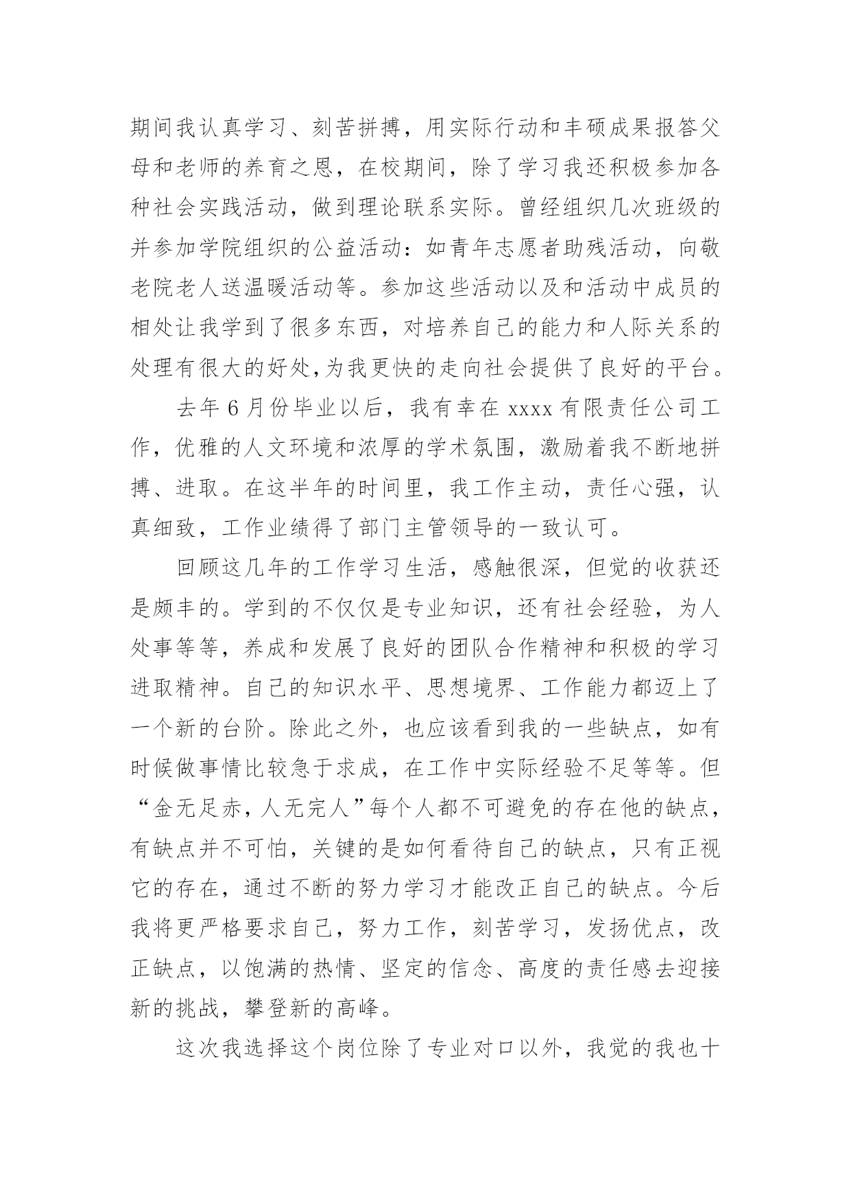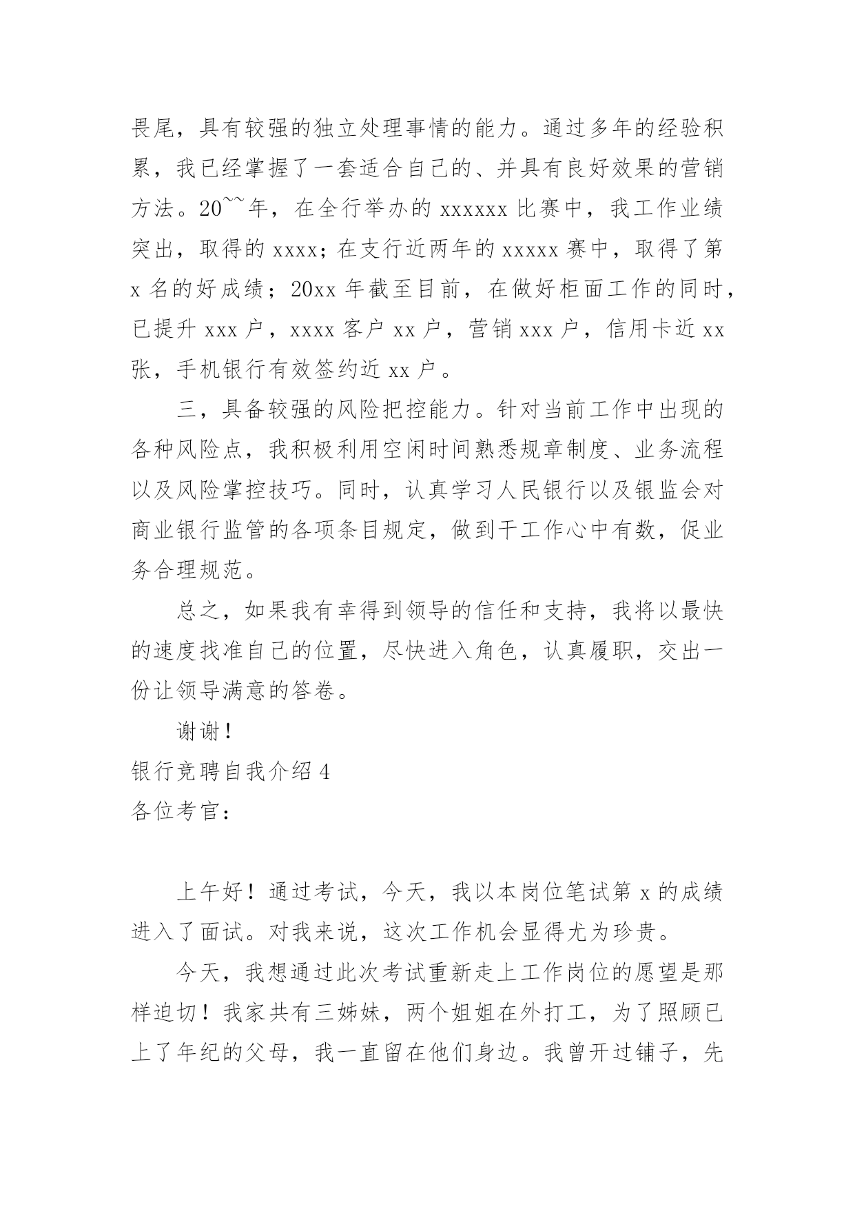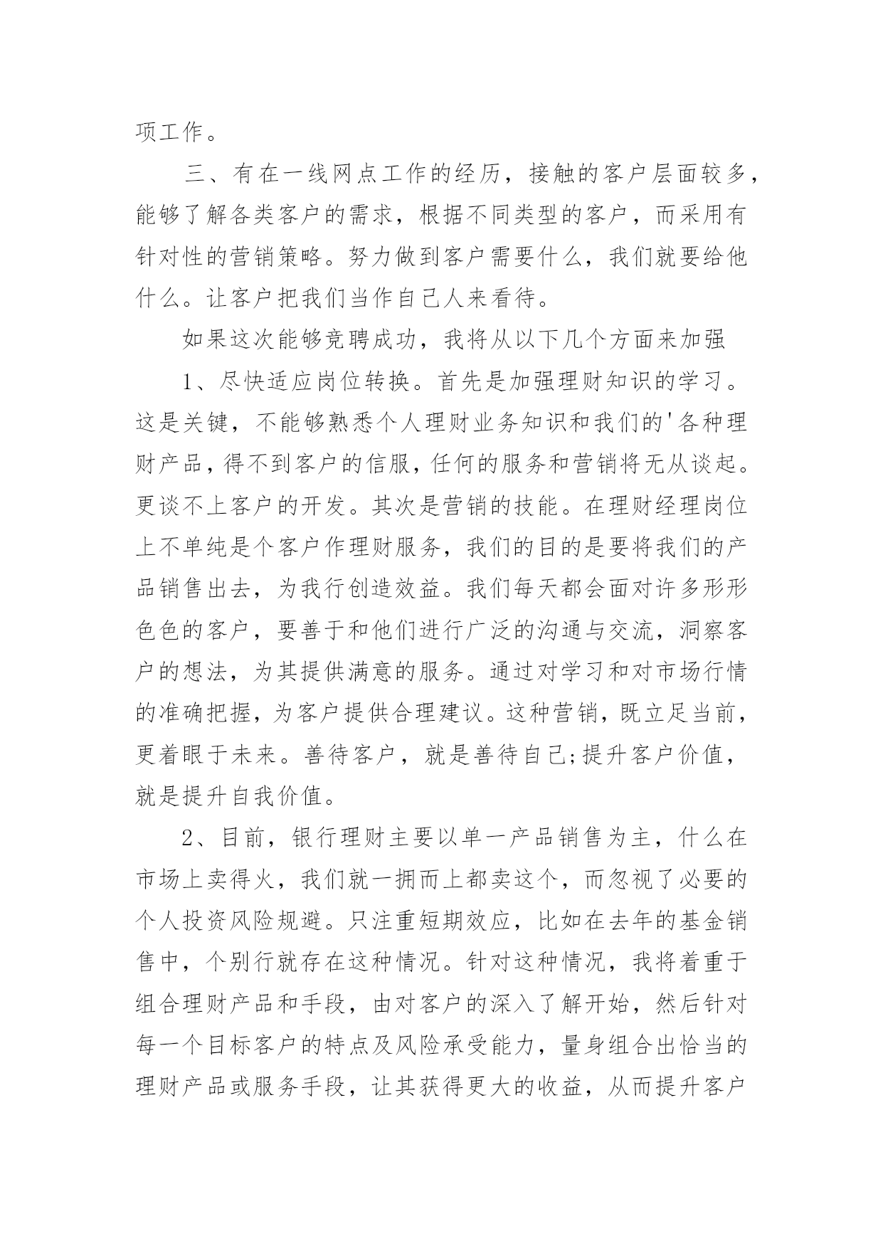 银行竞聘自我介绍银行竞聘自我介绍当我们在一个陌生场合中,通常需要我们进行自我介绍,用自我介绍往往可以向他人介绍自己。写自我介绍可不能随随便便哦,以下是小编为大家收集的银行竞聘自我介绍,欢迎大家借鉴与参考,希望对大家有所帮助。银行竞聘自我介绍1各位考官:上午好!您好,我叫xxx。xxxx年x月即将毕业于xxxxx信息管理学院,我的专业是信息管理与信息系统。今天很荣幸能来到这里参加贵行的面试,对于一个即将踏入社会工作岗位的我来说,我是很期待能在工作中找到自我的价值的体现。在学校期间,我非常喜欢参加各项团队活动,因为在那能找到和大家合作的愉快和感受到团队胜利的喜悦。我参加过学校社团管理办公室组织部学生工作,虽然只有短短的一年多,但在那段时间让我体会到了和大家一起合作的快乐。为了锻炼自己,作为一个在校生,利用假期时间曾经去做过促销员,以及在金凤呈祥蛋糕店做过销售人员。我这人喜欢亲手去尝试和了解很多期待的事物,做事还算有毅力,能够团结周围的人,性格开朗,诚实守信。不过也有点缺,就是有点成就,爱沾沾自喜,在今后的工作学习中,我会注意并努力改正的。谢谢今天您们能在这里给我一个面试展示自我的机会。银行竞聘自我介绍2尊敬的各位领导,评委:大家好!我是来自xx支行的xxx,非常荣幸能够参加这次理财经理的竞聘,首先,请允许我向大家介绍一下我的基本情况。我今年xx岁,xxxx年毕业于xx省经济管理学院会计专业,毕业后进入交行工作先后在原新春储蓄所、储蓄所作储蓄员工作。后转至xx区移动公司担任客户经理。今年3月份回到交行春晖支行担任临柜柜员。这些工作经历增加了我的工作经验同时也提高了各个方面的能力。下面就我所具备的竞争条件和优势做简要的介绍。一、首先我对银行理财工作非常感兴趣,同时也是一个工作勤勉和善于学习的人,我有信心在银行理财岗位能够更好地展现我的价值,并且为我行创造更多的价值。通过XX年底开始的股市牛市以来,客户对个人理财方面开始有很大的需求,但是又凸现出个人理财知识的匮乏,这就需要有专业人士来进行正确的指导,来实现客户和银行的双赢。在为客户办理理财的同时,树立交行个人理财的品牌,来吸引更多的客户。二、我曾经在移动公司任客户经理,在此期间,积极做好优质客户的营销工作,培养了自身营销的能力;并且通过这段工作经历,使我具有一定的公关能力和良好的社会关系。我深信,在自己努力和多方面的支持下,我能出色的做好这项工作。三、有在一线网点工作的经历,接触的客户层面较多,能够了解各类客户的需求,根据不同类型的客户,而采用有针对性的营销策略。努力做到客户需要什么,我们就要给他什么。让客户把我们当作自己人来看待。如果这次能够竞聘成功,我将从以下几个方面来加强1、尽快适应岗位转换。首先是加强理财知识的学习。这是关键,不能够熟悉个人理财业务知识和我们的'各种理财产品,得不到客户的信服,任何的服务和营销将无从谈起。更谈不上客户的开发。其次是营销的技能。在理财经理岗位上不单纯是个客户作理财服务,我们的目的是要将我们的产品销售出去,为我行创造效益。我们每天都会面对许多形形色色的客户,要善于和他们进行广泛的沟通与交流,洞察客户的想法,为其提供满意的服务。通过对学习和对市场行情的准确把握,为客户提供合理建议。这种营销,既立足当前,更着眼于未来。善待客户,就是善待自己;提升客户价值,就是提升自我价值。2、目前,银行理财主要以单一产品销售为主,什么在市场上卖得火,我们就一拥而上都卖这个,而忽视了必要的个人投资风险规避。只注重短期效应,比如在去年的基金销售中,个别行就存在这种情况。针对这种情况,我将着重于组合理财产品和手段,由对客户的深入了解开始,然后针对每一个目标客户的特点及风险承受能力,量身组合出恰当的理财产品或服务手段,让其获得更大的收益,从而提升客户对我个人,进而是我行的忠诚度和认知度。我相信自己有实习、有能力做好银行理材经理这个职位,做好理材经理的相关工作,为xx银行的发展贡献出自己的一份力量。谢谢大家!银行竞聘自我介绍3尊敬的各位领导:下午好!首先做一下自我介绍,我叫xxx,xx岁,中共党员,本科学历,现就职于xxx支行。我竞聘的职位是对私客户经理。我是一名勤勤恳恳在xx银行一线工作的员工,很高兴也很荣幸能够参加今天的面试。首先,感谢领导提供这个平台,让我有了这次展示自我的机会。同时,我也向各位领导保证,不管这次面试结果如何,我都会兢兢业业干好自己的本质工作,以优异的工作业绩,为交通银行的事业贡献一份力量。参加这次面试,我认为自己有以下三个方面的优势:一、具备良好的职业素养。在xx支行从事柜面工作的几年中,我积极利用各种机会,向书本学,向同事学,从实践中学,具备了较强的业务能力;同时,主动培养自己的责任心和团队协作意识,以极大地敬业精神干好每一项工作,任劳任怨,得到领导