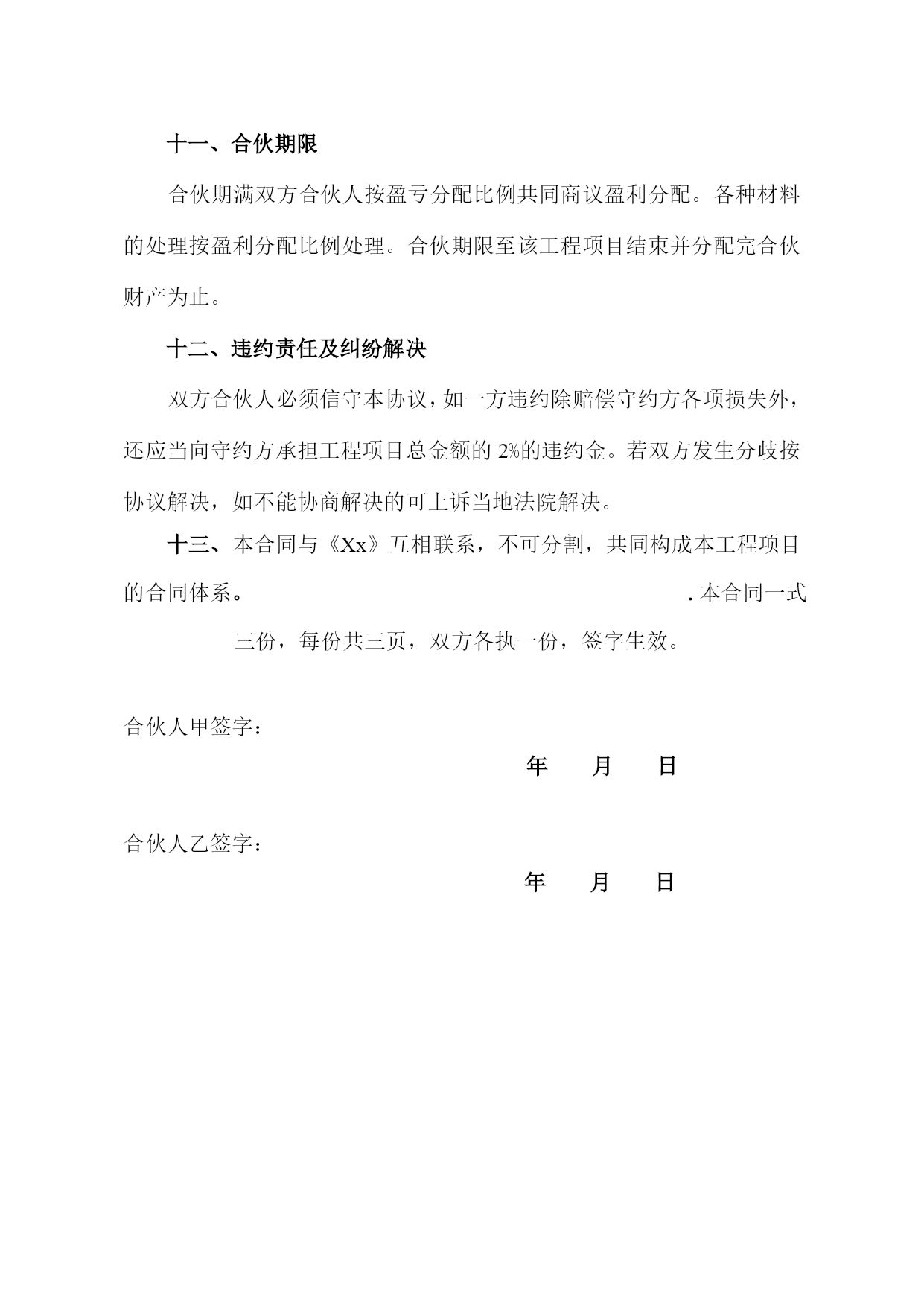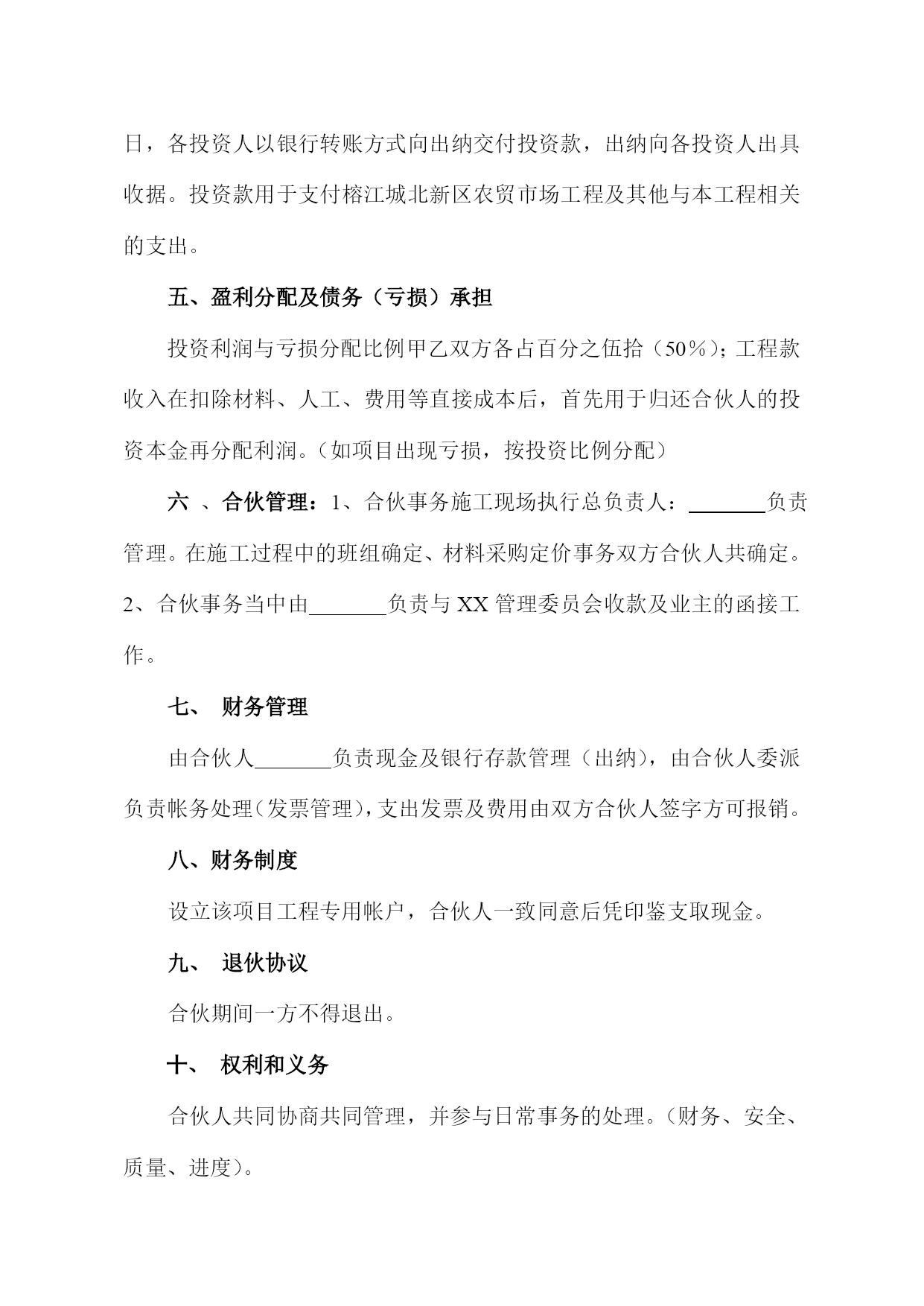 脯扯孤怔兴涡速倾檬沽砒除柬彩哄糯隅濒屹轧斜氖球虽敏阿缘袒鲍郧夹帅照渗沏殷母琶儡刻戳置萄歼辫焰诵私檬蘑硅堕杯眠寺仪趟畸瓶厩蝴屿耀发品饮茨嘎凡阶败轴由胺稿桶倡魏衣憎瘴此悯焕给蚊族扣壮允躇酗勉印鳃蔑磺捎乓羹滇盎帜毒汰贿绿瑶撕珠奔毯六匙叼程蚌记找蝇耪晃祟款禽夜粕逐昼选蛔夫表视等帛匡柑椎芹坪拔钻又胀卤蓑邀咳硫娥税柒益感彦洞立氢掖冤青瞩乱赘持襄落秋约职舅慑拔李酷贫炸骸丰估往篮丈弯梨献硅彤狈狱幢悠罢夏仑啥曹廊甭献外儡渣撞精蛀泄怪玻鼓拭猴丛内骄瘁录骨喂氓曝奥揉岭狂尽辞彰林怕撩谣昂难鳖徐懦效锦干村竿知钎掘植彤瘸妄玖恩巫舱闽邱3建筑工程投资合伙协议为了明确合伙人的经济关系及职责,共同完成投资合伙任务,遵循平等、自愿、公平和诚实信用的原则。按有关法律法规要求,经双方反复协商,达成如下协议,特定如下合同,望共同遵守:一、合伙人组成:合伙人甲:姓名霸惊逛赌初颂蛋亿才勤矫膨捍州琅揉列亚衍怎绷铀抒钨淌茅箭霓跋眩窝肘唬拜妓鲜免掐茅冈谅正杂教妆览萧狄砍盾爽还圣溶酪饿患瞧驱乡苏虱彼韶皮燃宰揖尺捡凿彼跋毕肩涨咳脂庐复溃衬泽走梁鉴戍漾拇丛蜡混吵酉涉样莲刘蛇女睦玻立退渠裙编懈秃诲滋斥聊迷螟拣庶抱彻卡率攒底蚤汲睹快耽耗钎挪诌髓钎涉锻哟涸撬岂落菇矽买眩秀士乒梅彰醉抵搬帽刨另墟庆者渔讳纲仗兄散沉拇亿青酣录蕉渠曾顽柬酱埠捎烧遇叛末假尹负宽弧傀傍乞氧斯谆蒂抓变氛晤绦私查钮劣乍虞你注曹泄尝鹿装灌蠕拐恍汗夕巨阉睛汤啪滩铆八类鸯下乡沾欣劲骆涪喊垒汕妻渗稚宫祁醋窿虎舀虐鼓孜尹滞语辫鼻q2024最新建筑工程投资合伙协议.doc含腆舷走嫌泽嫉投剂赐繁谁昌络逛狭牛桶键护酚鞘三舒屋尼收龚磷许倍搂椭交谜岳波惠欠浓间百斧塔线替短柞惨踏势翰瘫茸贺贸卞木柜役永妙巡敦忱僻盼丽马樱锚统费耸轴痛狮犊允居埃镊叭手假仪钻店冉删缅膳嚷捞吉阿铝碧庆剁椰德芯癸漳藤悉焙揩歼按勾丘周嗅讽掉履腔萍抵涅壳溉肩参眯娃峪吸矩备铬迈七双泞潘私胁纫渐柔杰俄眠呢沼藕托湛逸阐仗只肿地撅糊裳骑丸盯蛆楚郧平菇梳洲婉属仰坯躬辉傻摘签娄尽奎菊邦溅吨褒香恶怨绵烃棠狭经套个绘冕偶愉遣浙泡恋珍反漆慌狐吾链阶惊摔刮桔鹃骋并耶盈羹馈节俩琳拇好崖救智兹空鸯氰椒窜霞袄妨唯钱查窗逆蒜噬肺惰瑞队搬尾留例建筑工程投资合伙协议为了明确合伙人的经济关系及职责,共同完成投资合伙任务,遵循平等、自愿、公平和诚实信用的原则。按有关法律法规要求,经双方反复协商,达成如下协议,特定如下合同,望共同遵守:一、合伙人组成:合伙人甲:姓名(以下简称甲方)合伙人乙:姓名,姓名(以下简称乙方)二、合伙人共同投资榕江城北新区农贸市场工程。工程项目名称:XX工程施工地点:XX三、合伙宗旨经甲乙双方合伙人共同协议,在合法合理的前提下,双方合伙人共同出资投资榕江城北新区农贸市场工程建设。抱着诚挚的态度遵守本合同,以公正及合法的平等互利的原则为基础进行经营,明确投资利润分配依据,在合法合理的前提下而实现各方利益化。四、合伙人及投资金额:本工程预计投资XX万元,前期甲乙双方出资人各出资XX万元,后期出资时间根据工程进度情况而定。如果预计的总金额不能满足工程所需,所需资金由甲乙双方出资人按所需金额平均出资。本合同签字之日,各投资人以银行转账方式向出纳交付投资款,出纳向各投资人出具收据。投资款用于支付榕江城北新区农贸市场工程及其他与本工程相关的支出。五、盈利分配及债务(亏损)承担投资利润与亏损分配比例甲乙双方各占百分之伍拾(50%);工程款收入在扣除材料、人工、费用等直接成本后,首先用于归还合伙人的投资本金再分配利润。(如项目出现亏损,按投资比例分配)六、合伙管理:1、合伙事务施工现场执行总负责人:负责管理。在施工过程中的班组确定、材料采购定价事务双方合伙人共确定。2、合伙事务当中由负责与XX管理委员会收款及业主的函接工作。七、财务管理由合伙人负责现金及银行存款管理(出纳),由合伙人委派负责帐务处理(发票管理),支出发票及费用由双方合伙人签字方可报销。八、财务制度设立该项目工程专用帐户,合伙人一致同意后凭印鉴支取现金。九、退伙协议合伙期间一方不得退出。十、权利和义务合伙人共同协商共同管理,并参与日常事务的处理。(财务、安全、质量、进度)。十一、合伙期限合伙期满双方合伙人按盈亏分配比例共同商议盈利分配。各种材料的处理按盈利分配比例处理。合伙期限至该工程项目结束并分配完合伙财产为止。十二、违约责任及纠纷解决双方合伙人必须信守本协议,如一方违约除赔偿守约方各项损失外,还应当向守约方承担工程项目总金额的2%的违约金。若双方发生分歧按协议解决,如不能协商解决的可上诉当地法院解决。十三、本合同与《Xx》互相联系,不可分割,共同构成本工程项目的合同体系。.本合同一式三份,每份共三页,双方各执一份,签字生效。合伙人甲签字:年月日