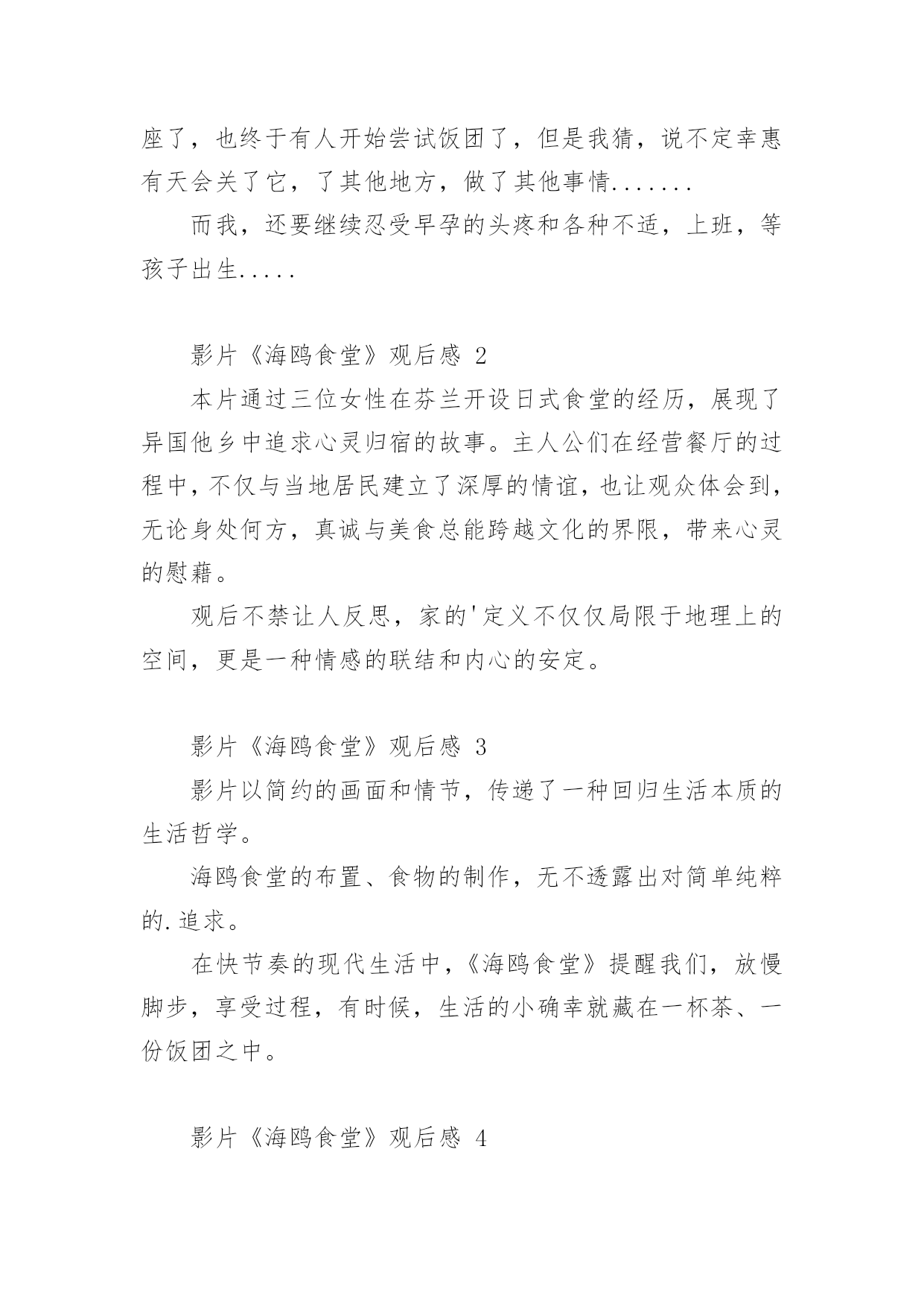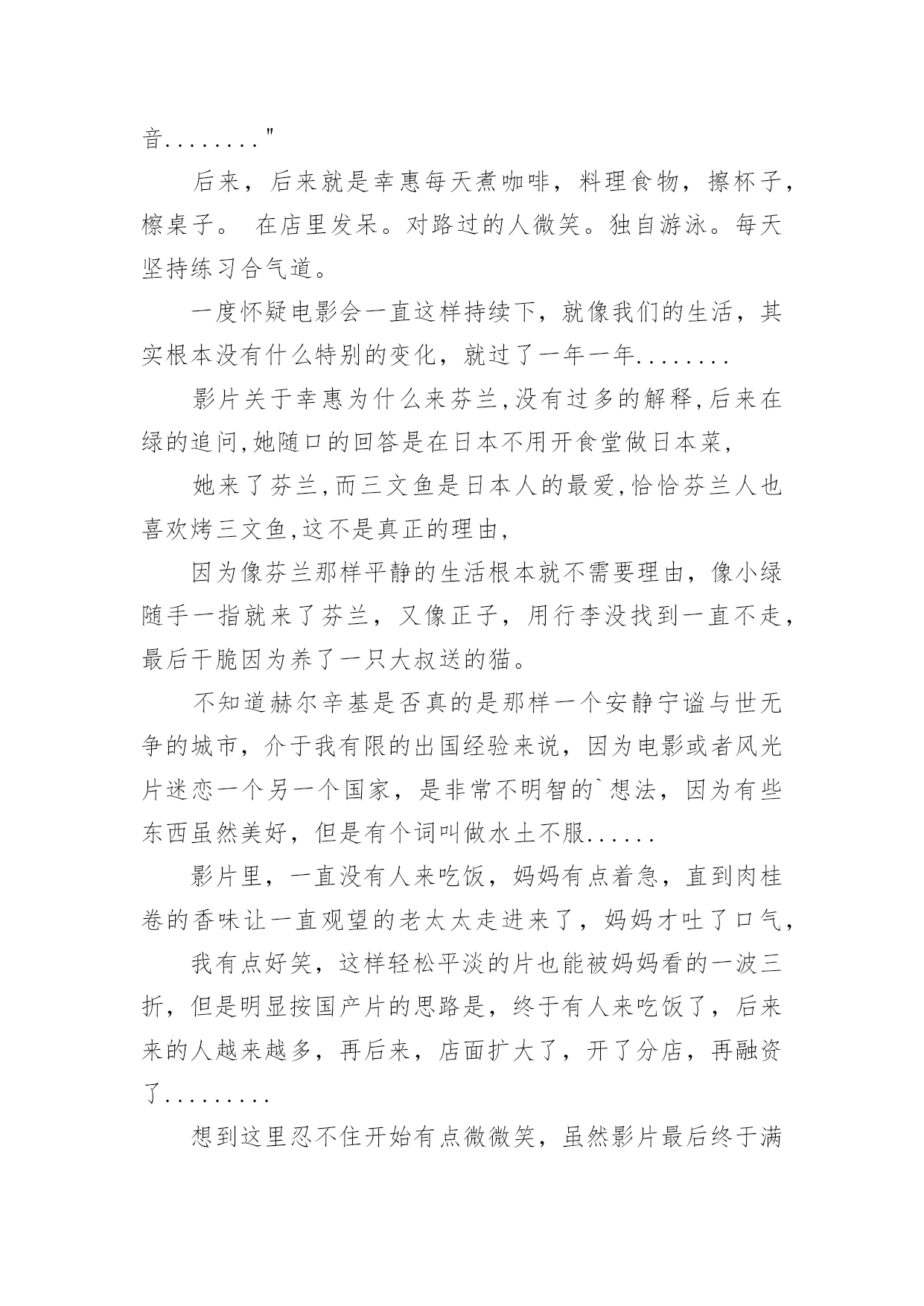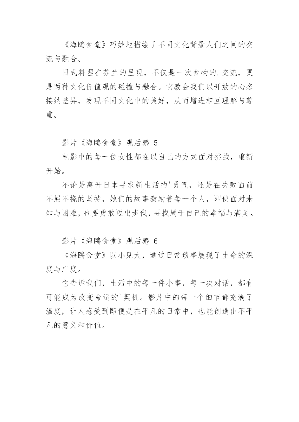 影片《海鸥食堂》观后感影片《海鸥食堂》观后感(精选6篇)当认真看完一部影视作品后,从中我们可以吸收新的思想,观后感就是把我们观看过程中的所思所想写下来的文章。那么我们如何去写观后感呢?以下是小编帮大家整理的影片《海鸥食堂》观后感,仅供参考,欢迎大家阅读。影片《海鸥食堂》观后感1早孕反应一直很严重,每天晚上吃完,胃里就纠结的疼,只能躺着,避免动作一多,又会全盘吐掉。在这样的情况下,看的海鸥食堂,妈妈忙完家务,陪着我一起看。两个人挤在小床上,举着IPADMINI,肚子上搭着防辐射的肚兜。全片风格明显,有着日本文艺电影一贯的清新,关于几个日本人在芬兰的温暖故事,女导演荻上直子的用一整个电影,来让你想吃饭团,听说她还有另外一部叫《眼镜》片子,看完让你想吃刨冰.........至于画面,是典型的北欧场景,开片的胖胖海鸥和淡淡的对白,让心缓慢的停下躁动。“……nanao是一只体重10.2公斤的猫,谁的话都不听,动不动就和附近的猫打起来,大家都讨厌它。但是为什么它只让摸它的大肚子,喉咙里发出咕噜咕噜的声音........"后来,后来就是幸惠每天煮咖啡,料理食物,擦杯子,檫桌子。在店里发呆。对路过的人微笑。独自游泳。每天坚持练习合气道。一度怀疑电影会一直这样持续下,就像我们的生活,其实根本没有什么特别的变化,就过了一年一年........影片关于幸惠为什么来芬兰,没有过多的解释,后来在绿的追问,她随口的回答是在日本不用开食堂做日本菜,她来了芬兰,而三文鱼是日本人的最爱,恰恰芬兰人也喜欢烤三文鱼,这不是真正的理由,因为像芬兰那样平静的生活根本就不需要理由,像小绿随手一指就来了芬兰,又像正子,用行李没找到一直不走,最后干脆因为养了一只大叔送的猫。不知道赫尔辛基是否真的是那样一个安静宁谧与世无争的城市,介于我有限的出国经验来说,因为电影或者风光片迷恋一个另一个国家,是非常不明智的`想法,因为有些东西虽然美好,但是有个词叫做水土不服......影片里,一直没有人来吃饭,妈妈有点着急,直到肉桂卷的香味让一直观望的老太太走进来了,妈妈才吐了口气,我有点好笑,这样轻松平淡的片也能被妈妈看的一波三折,但是明显按国产片的思路是,终于有人来吃饭了,后来来的人越来越多,再后来,店面扩大了,开了分店,再融资了.........想到这里忍不住开始有点微微笑,虽然影片最后终于满座了,也终于有人开始尝试饭团了,但是我猜,说不定幸惠有天会关了它,了其他地方,做了其他事情.......而我,还要继续忍受早孕的头疼和各种不适,上班,等孩子出生.....影片《海鸥食堂》观后感2本片通过三位女性在芬兰开设日式食堂的经历,展现了异国他乡中追求心灵归宿的故事。主人公们在经营餐厅的过程中,不仅与当地居民建立了深厚的情谊,也让观众体会到,无论身处何方,真诚与美食总能跨越文化的界限,带来心灵的慰藉。观后不禁让人反思,家的'定义不仅仅局限于地理上的空间,更是一种情感的联结和内心的安定。影片《海鸥食堂》观后感3影片以简约的画面和情节,传递了一种回归生活本质的生活哲学。海鸥食堂的布置、食物的制作,无不透露出对简单纯粹的.追求。在快节奏的现代生活中,《海鸥食堂》提醒我们,放慢脚步,享受过程,有时候,生活的小确幸就藏在一杯茶、一份饭团之中。影片《海鸥食堂》观后感4《海鸥食堂》巧妙地描绘了不同文化背景人们之间的交流与融合。日式料理在芬兰的呈现,不仅是一次食物的.交流,更是两种文化价值观的碰撞与融合。它教会我们以开放的心态接纳差异,发现不同文化中的美好,从而增进相互理解与尊重。影片《海鸥食堂》观后感5电影中的每一位女性都在以自己的方式面对挑战,重新开始。不论是离开日本寻求新生活的'勇气,还是在失败面前不屈不挠的坚持,她们的故事激励着每一个人,即使面对未知与困难,也要勇敢迈出步伐,寻找属于自己的幸福与满足。影片《海鸥食堂》观后感6《海鸥食堂》以小见大,通过日常琐事展现了生命的深度与广度。它告诉我们,生活中的每一件小事,每一次对话,都有可能成为改变命运的`契机。影片中的每一个细节都充满了温度,让人感受到即便是在平凡的日常中,也能创造出不平凡的意义和价值。