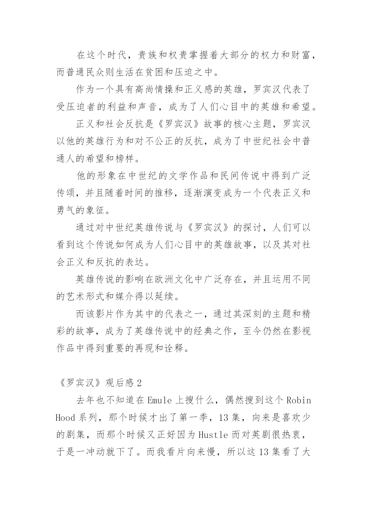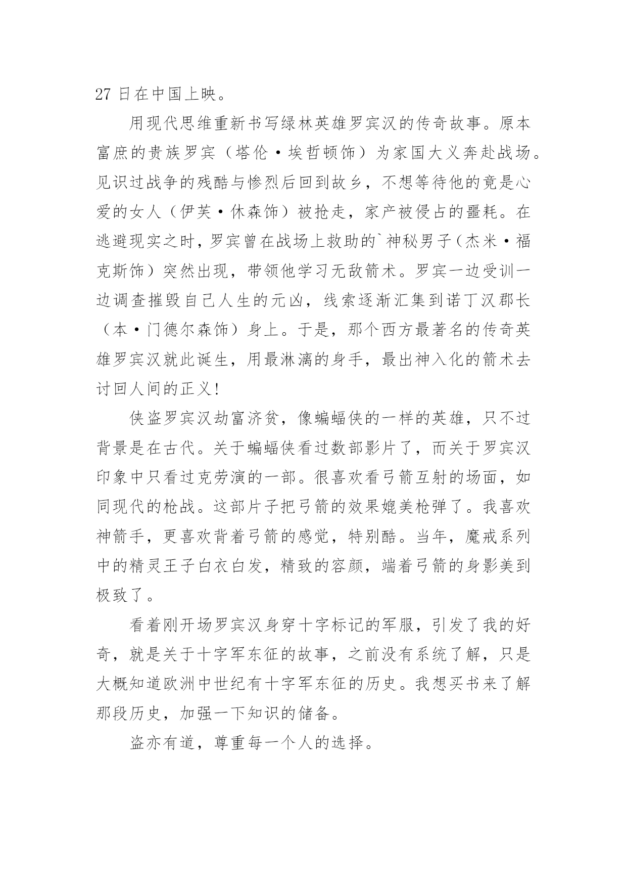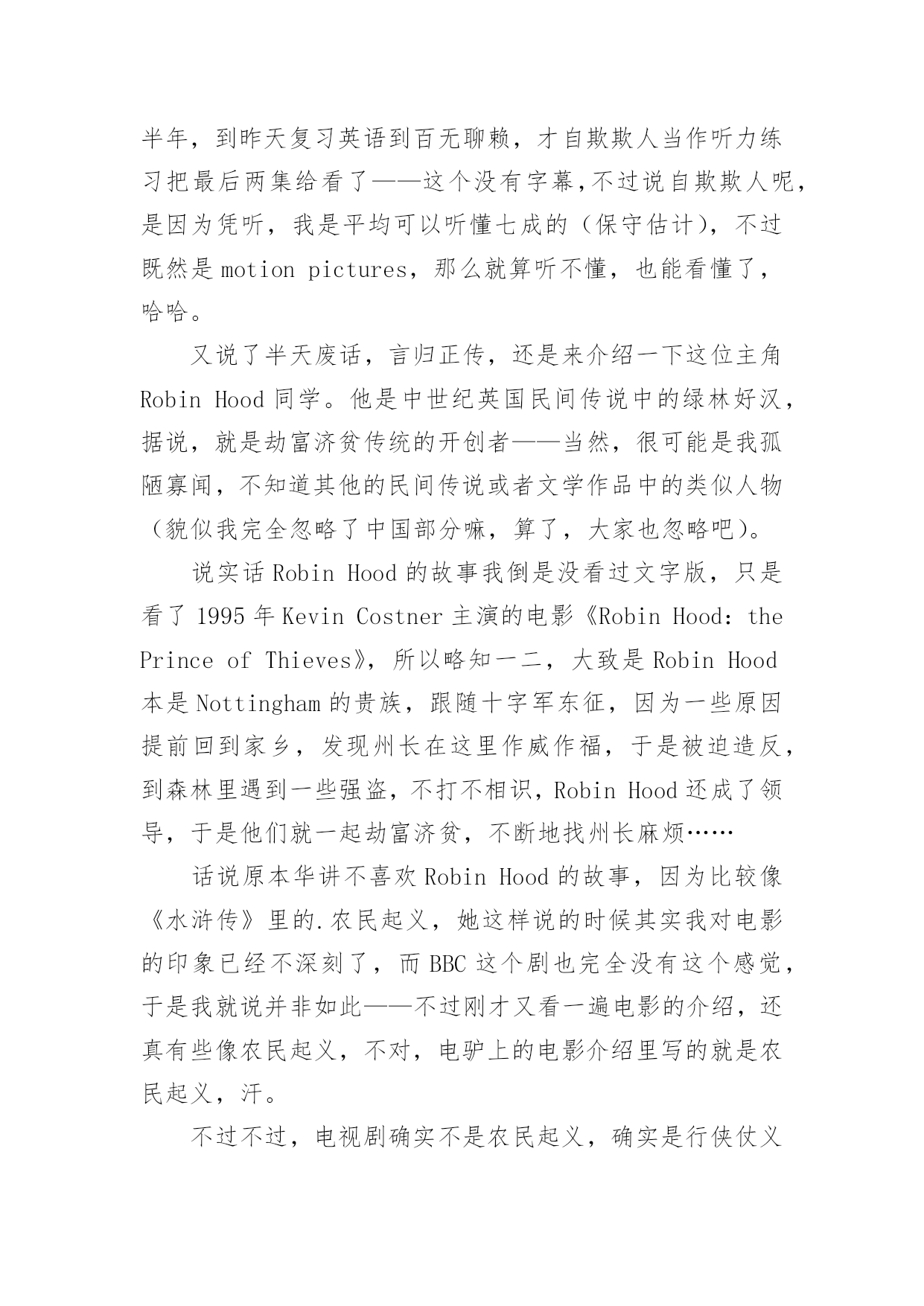 《罗宾汉》观后感观看一部优秀作品之后,我们会受益匪浅,对人生或者事物一定产生了许多感想吧,写一份观后感,记录收获与付出。那么你真的懂得怎么写观后感吗?下面是小编帮大家整理的《罗宾汉》观后感,供大家参考借鉴,希望可以帮助到有需要的朋友。《罗宾汉》观后感1中世纪英雄传说与《罗宾汉》英雄传说在中世纪欧洲文化中扮演着重要的角色,这些传说通常以英雄的冒险和伟业为主题,通过口头传承和文学作品传播。该世纪英雄传说的起源可以追溯到古代的民间传说和神话,随着时间的推移,这些故事逐渐演变和发展,形成了独特的中世纪英雄传说体系。这些传说常常包含着勇敢、正义和荣誉等核心价值观,成为人们追求的理想和榜样,而《罗宾汉》作为中世纪英雄传说的代表之一,具有深远的影响力。它的故事发生在英格兰的谢菲尔德森林,讲述了一位被剥夺了财产和地位的贵族青年罗宾汉,他带领一群亡命之徒在森林中与不公正和腐败的权贵斗争的'故事。罗宾汉以他的勇敢、聪明和慷慨赢得了穷人们的敬仰和支持,并通过劫富济贫的行动来维护正义和平等。在这个时代,贵族和权贵掌握着大部分的权力和财富,而普通民众则生活在贫困和压迫之中。作为一个具有高尚情操和正义感的英雄,罗宾汉代表了受压迫者的利益和声音,成为了人们心目中的英雄和希望。正义和社会反抗是《罗宾汉》故事的核心主题,罗宾汉以他的英雄行为和对不公正的反抗,成为了中世纪社会中普通人的希望和榜样。他的形象在中世纪的文学作品和民间传说中得到广泛传颂,并且随着时间的推移,逐渐演变成为一个代表正义和勇气的象征。通过对中世纪英雄传说与《罗宾汉》的探讨,人们可以看到这个传说如何成为人们心目中的英雄故事,以及其对社会正义和反抗的表达。英雄传说的影响在欧洲文化中广泛存在,并且运用不同的艺术形式和媒介得以延续。而该影片作为其中的代表之一,通过其深刻的主题和精彩的故事,成为了英雄传说中的经典之作,至今仍然在影视作品中得到重要的再现和诠释。《罗宾汉》观后感2去年也不知道在Emule上搜什么,偶然搜到这个RobinHood系列,那个时候才出了第一季,13集,向来是喜欢少的剧集,而那个时候又正好因为Hustle而对英剧很热衷,于是一冲动就下了。而我看片向来慢,所以这13集看了大半年,到昨天复习英语到百无聊赖,才自欺欺人当作听力练习把最后两集给看了——这个没有字幕,不过说自欺欺人呢,是因为凭听,我是平均可以听懂七成的(保守估计),不过既然是motionpictures,那么就算听不懂,也能看懂了,哈哈。又说了半天废话,言归正传,还是来介绍一下这位主角RobinHood同学。他是中世纪英国民间传说中的绿林好汉,据说,就是劫富济贫传统的开创者——当然,很可能是我孤陋寡闻,不知道其他的民间传说或者文学作品中的类似人物(貌似我完全忽略了中国部分嘛,算了,大家也忽略吧)。说实话RobinHood的故事我倒是没看过文字版,只是看了1995年KevinCostner主演的电影《RobinHood:thePrinceofThieves》,所以略知一二,大致是RobinHood本是Nottingham的贵族,跟随十字军东征,因为一些原因提前回到家乡,发现州长在这里作威作福,于是被迫造反,到森林里遇到一些强盗,不打不相识,RobinHood还成了领导,于是他们就一起劫富济贫,不断地找州长麻烦……话说原本华讲不喜欢RobinHood的故事,因为比较像《水浒传》里的.农民起义,她这样说的时候其实我对电影的印象已经不深刻了,而BBC这个剧也完全没有这个感觉,于是我就说并非如此——不过刚才又看一遍电影的介绍,还真有些像农民起义,不对,电驴上的电影介绍里写的就是农民起义,汗。不过不过,电视剧确实不是农民起义,确实是行侠仗义(不过似乎剧情总是逃不开跟州长的纠葛)。当然RobinHood本是贵族,所以多少还是有些“落草为寇”的意味,于是他们也就一直在企图回归law(这似乎是跟AL最大的区别,其实HH同学本可以研究一下这两位的区别,毕竟这两者更具有可比性,不过鉴于他对RobinHood的了解也不会太多,因此写论文的话我还是不推荐这样研究)。不过到第一季结束(本来我以为就一季的),还没像电影一样的happyending,而我现在居然在下第二季了——我也不知道为什么愿意看下去,或许,我还是比较喜欢这种“外国古装武打片”?哈哈。当然当然,本系列的音乐也十分的不错,很有交响乐的感觉,旋律也非常的uplifting,心情不好的时候一看就能high。《罗宾汉》观后感3因为南方与北方,疯狂地迷上RichardArmitage,于是搜索到这出电视剧。平心而论,除了看英伦帅哥,这出电视剧确实乏善可陈,每一集都是邪与正的较量,毫无疑问的是,正终能压邪,没有任何惊喜。但在第一季的最后一集,玛丽安在与吉斯伯恩的婚礼上,她抛弃了所有的.顾忌,她