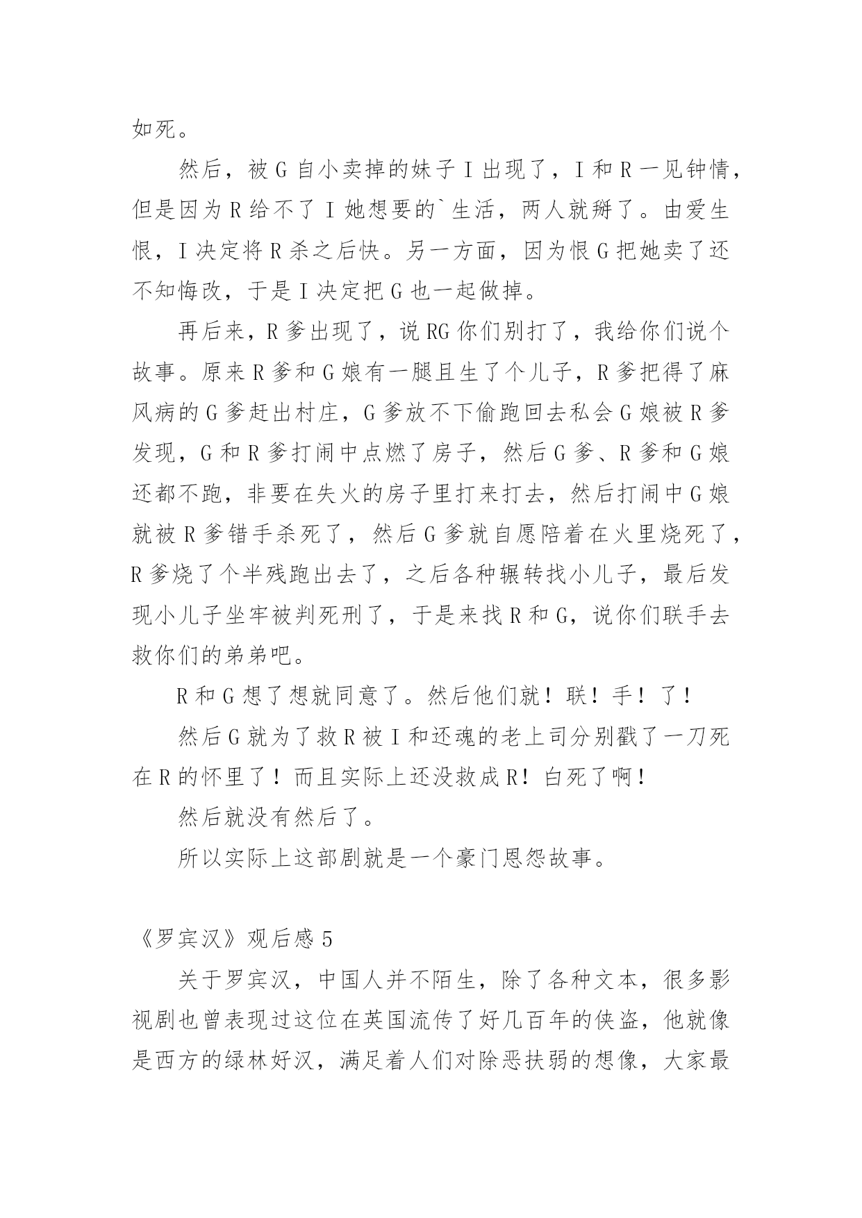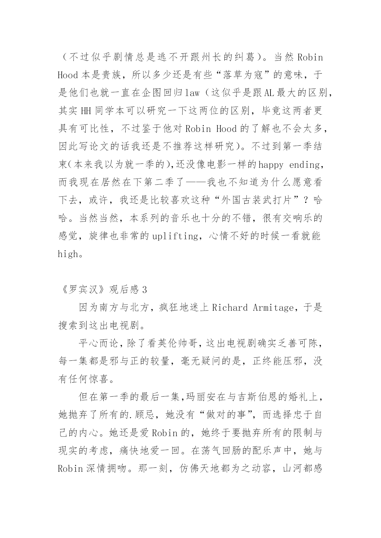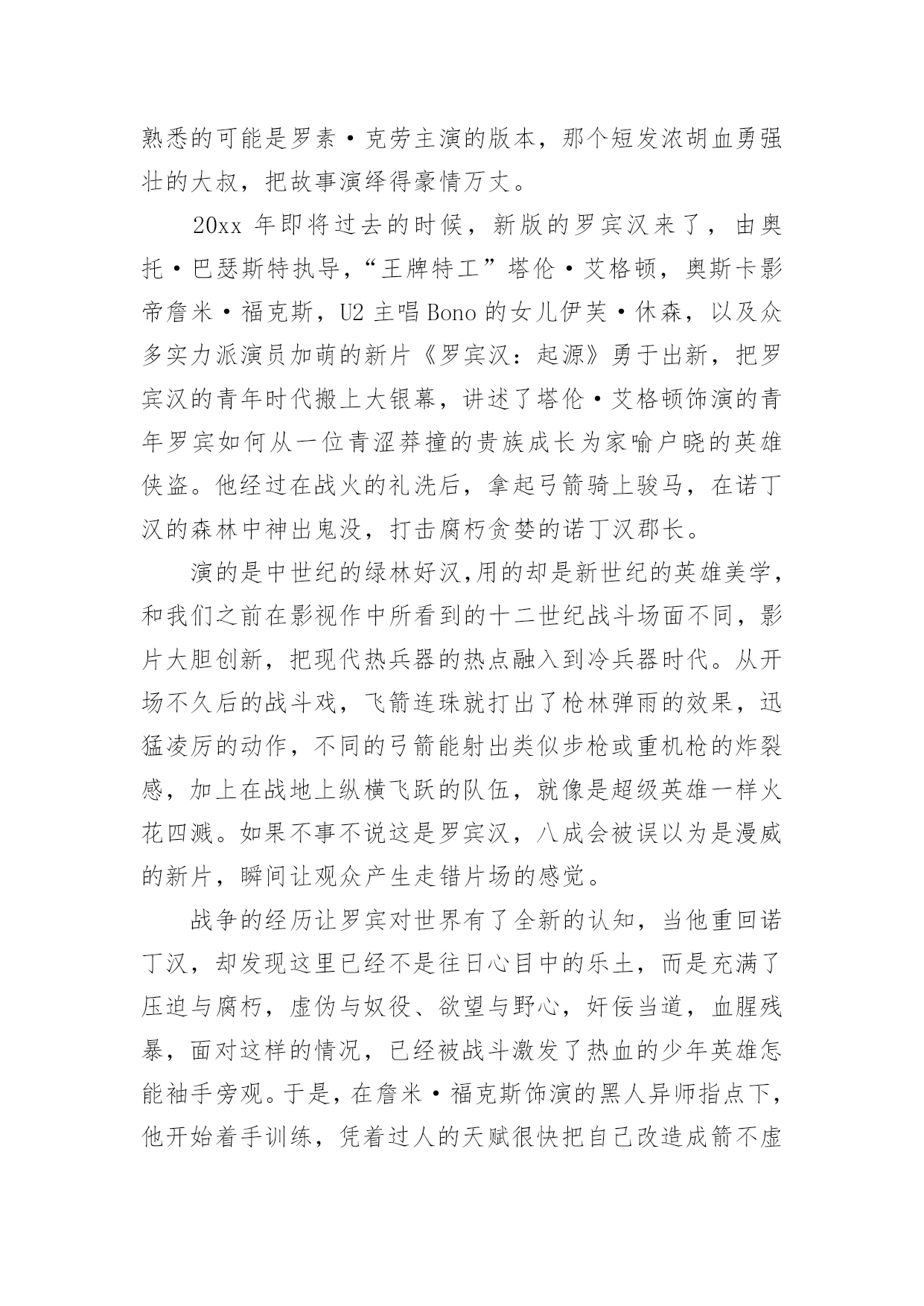 《罗宾汉》观后感观看一部优秀作品之后,我们会受益匪浅,对人生或者事物一定产生了许多感想吧,写一份观后感,记录收获与付出。那么你真的懂得怎么写观后感吗?下面是小编帮大家整理的《罗宾汉》观后感,供大家参考借鉴,希望可以帮助到有需要的朋友。《罗宾汉》观后感1中世纪英雄传说与《罗宾汉》英雄传说在中世纪欧洲文化中扮演着重要的角色,这些传说通常以英雄的冒险和伟业为主题,通过口头传承和文学作品传播。该世纪英雄传说的起源可以追溯到古代的民间传说和神话,随着时间的推移,这些故事逐渐演变和发展,形成了独特的中世纪英雄传说体系。这些传说常常包含着勇敢、正义和荣誉等核心价值观,成为人们追求的理想和榜样,而《罗宾汉》作为中世纪英雄传说的代表之一,具有深远的影响力。它的故事发生在英格兰的谢菲尔德森林,讲述了一位被剥夺了财产和地位的贵族青年罗宾汉,他带领一群亡命之徒在森林中与不公正和腐败的权贵斗争的'故事。罗宾汉以他的勇敢、聪明和慷慨赢得了穷人们的敬仰和支持,并通过劫富济贫的行动来维护正义和平等。在这个时代,贵族和权贵掌握着大部分的权力和财富,而普通民众则生活在贫困和压迫之中。作为一个具有高尚情操和正义感的英雄,罗宾汉代表了受压迫者的利益和声音,成为了人们心目中的英雄和希望。正义和社会反抗是《罗宾汉》故事的核心主题,罗宾汉以他的英雄行为和对不公正的反抗,成为了中世纪社会中普通人的希望和榜样。他的形象在中世纪的文学作品和民间传说中得到广泛传颂,并且随着时间的推移,逐渐演变成为一个代表正义和勇气的象征。通过对中世纪英雄传说与《罗宾汉》的探讨,人们可以看到这个传说如何成为人们心目中的英雄故事,以及其对社会正义和反抗的表达。英雄传说的影响在欧洲文化中广泛存在,并且运用不同的艺术形式和媒介得以延续。而该影片作为其中的代表之一,通过其深刻的主题和精彩的故事,成为了英雄传说中的经典之作,至今仍然在影视作品中得到重要的再现和诠释。《罗宾汉》观后感2去年也不知道在Emule上搜什么,偶然搜到这个RobinHood系列,那个时候才出了第一季,13集,向来是喜欢少的剧集,而那个时候又正好因为Hustle而对英剧很热衷,于是一冲动就下了。而我看片向来慢,所以这13集看了大半年,到昨天复习英语到百无聊赖,才自欺欺人当作听力练习把最后两集给看了——这个没有字幕,不过说自欺欺人呢,是因为凭听,我是平均可以听懂七成的(保守估计),不过既然是motionpictures,那么就算听不懂,也能看懂了,哈哈。又说了半天废话,言归正传,还是来介绍一下这位主角RobinHood同学。他是中世纪英国民间传说中的绿林好汉,据说,就是劫富济贫传统的开创者——当然,很可能是我孤陋寡闻,不知道其他的民间传说或者文学作品中的类似人物(貌似我完全忽略了中国部分嘛,算了,大家也忽略吧)。说实话RobinHood的故事我倒是没看过文字版,只是看了1995年KevinCostner主演的电影《RobinHood:thePrinceofThieves》,所以略知一二,大致是RobinHood本是Nottingham的贵族,跟随十字军东征,因为一些原因提前回到家乡,发现州长在这里作威作福,于是被迫造反,到森林里遇到一些强盗,不打不相识,RobinHood还成了领导,于是他们就一起劫富济贫,不断地找州长麻烦……话说原本华讲不喜欢RobinHood的故事,因为比较像《水浒传》里的.农民起义,她这样说的时候其实我对电影的印象已经不深刻了,而BBC这个剧也完全没有这个感觉,于是我就说并非如此——不过刚才又看一遍电影的介绍,还真有些像农民起义,不对,电驴上的电影介绍里写的就是农民起义,汗。不过不过,电视剧确实不是农民起义,确实是行侠仗义(不过似乎剧情总是逃不开跟州长的纠葛)。当然RobinHood本是贵族,所以多少还是有些“落草为寇”的意味,于是他们也就一直在企图回归law(这似乎是跟AL最大的区别,其实HH同学本可以研究一下这两位的区别,毕竟这两者更具有可比性,不过鉴于他对RobinHood的了解也不会太多,因此写论文的话我还是不推荐这样研究)。不过到第一季结束(本来我以为就一季的),还没像电影一样的happyending,而我现在居然在下第二季了——我也不知道为什么愿意看下去,或许,我还是比较喜欢这种“外国古装武打片”?哈哈。当然当然,本系列的音乐也十分的不错,很有交响乐的感觉,旋律也非常的uplifting,心情不好的时候一看就能high。《罗宾汉》观后感3因为南方与北方,疯狂地迷上RichardArmitage,于是搜索到这出电视剧。平心而论,除了看英伦帅哥,这出电视剧确实乏善可陈,每一集都是邪与正的较量,毫无疑问的是,正终能压邪,没有任何惊喜。但在第一季的最后一集,玛丽安在与吉斯伯恩的婚礼上,她抛弃了所有的.顾忌,她