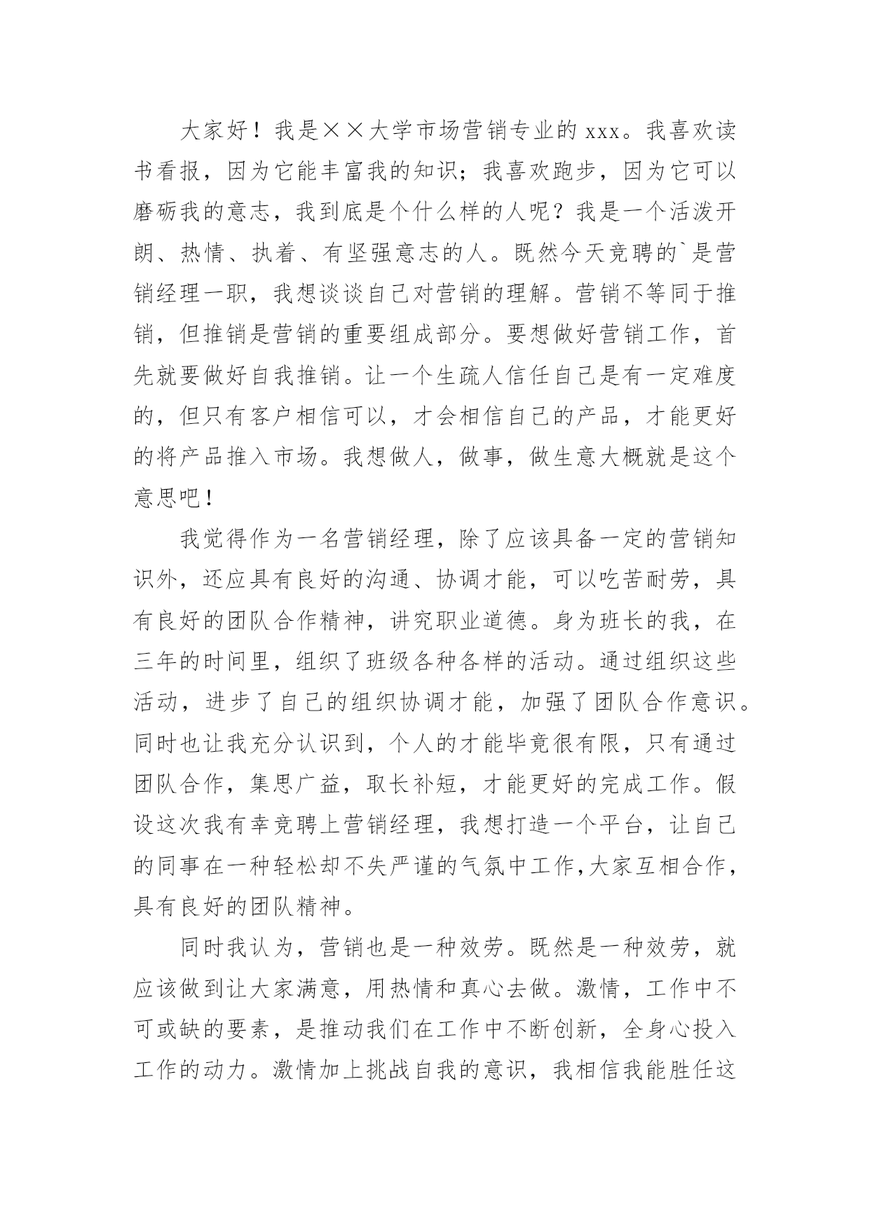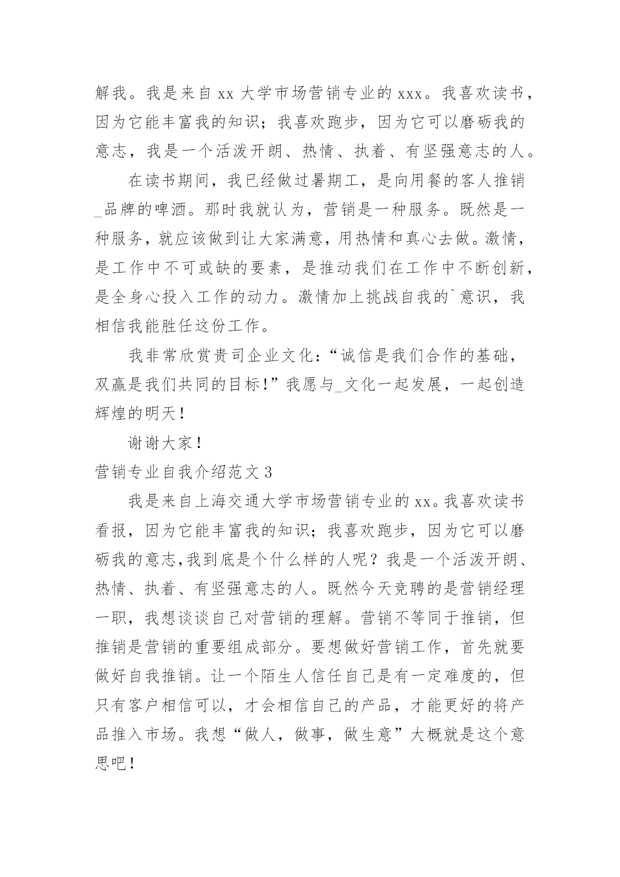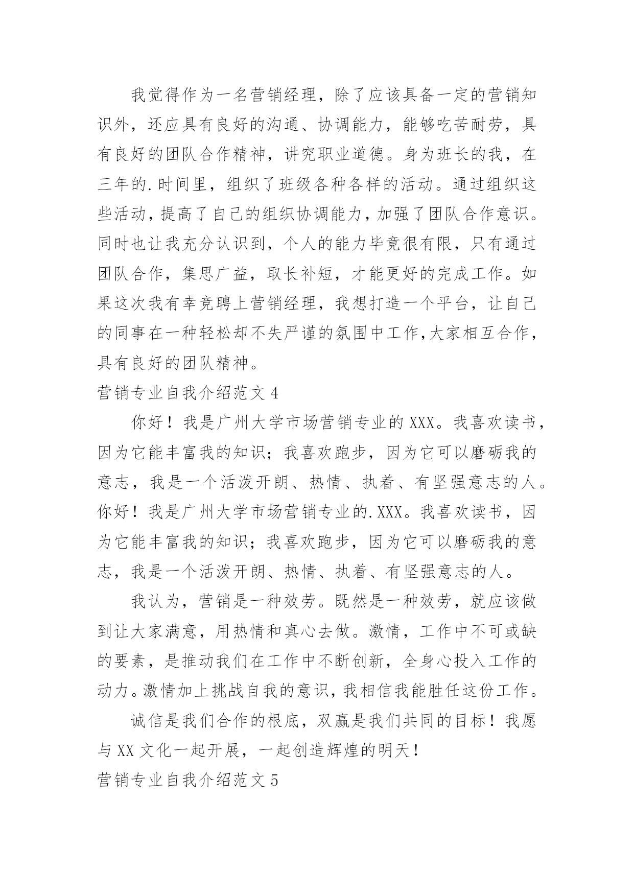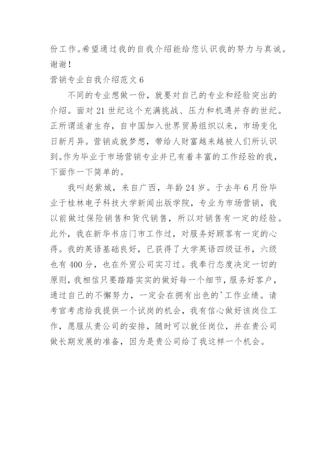 营销专业自我介绍营销专业自我介绍范文当我们在一个新环境中,我们难以避免地要作出自我介绍,自我介绍是一展示自己的手段。现在你是否对自我介绍一筹莫展呢?以下是小编精心整理的营销专业自我介绍范文,欢迎大家借鉴与参考,希望对大家有所帮助。营销专业自我介绍范文1我叫XXX,来自广西,年龄24岁。于去年6月份毕业于桂林电子科技大学新闻出版学院,专业为市场营销,我以前做过保险销售和货代销售,所以对销售有一定的经验。此外,我在新华书店门市工作过,对服务好顾客有一定的心得。我的英语基础良好,已获得了大学英语四级证书,六级也有400分,也在外贸公司实习过。我奉行态度决定一切的原则,我相信只要踏踏实实的做好每一个细节,服务好客户,通过自己的不懈努力,一定会在拥有出色的工作业绩。以上为我的自我介绍,请考官考虑给我提供一个试岗的.机会,我有信心做好该岗位工作,愿服从贵公司的安排,随时可以就任岗位,并在贵公司做长期发展的准备,因为是贵公司给了我这样一个机会。营销专业自我介绍范文2各位下午好!下面我将通过简单的自我介绍让您来了解我。我是来自xx大学市场营销专业的xxx。我喜欢读书,因为它能丰富我的知识;我喜欢跑步,因为它可以磨砺我的意志,我是一个活泼开朗、热情、执着、有坚强意志的人。在读书期间,我已经做过暑期工,是向用餐的客人推销_品牌的啤酒。那时我就认为,营销是一种服务。既然是一种服务,就应该做到让大家满意,用热情和真心去做。激情,是工作中不可或缺的要素,是推动我们在工作中不断创新,是全身心投入工作的动力。激情加上挑战自我的`意识,我相信我能胜任这份工作。我非常欣赏贵司企业文化:“诚信是我们合作的基础,双赢是我们共同的目标!”我愿与_文化一起发展,一起创造辉煌的明天!谢谢大家!营销专业自我介绍范文3我是来自上海交通大学市场营销专业的xx。我喜欢读书看报,因为它能丰富我的知识;我喜欢跑步,因为它可以磨砺我的意志,我到底是个什么样的人呢?我是一个活泼开朗、热情、执着、有坚强意志的人。既然今天竞聘的是营销经理一职,我想谈谈自己对营销的理解。营销不等同于推销,但推销是营销的重要组成部分。要想做好营销工作,首先就要做好自我推销。让一个陌生人信任自己是有一定难度的,但只有客户相信可以,才会相信自己的产品,才能更好的将产品推入市场。我想“做人,做事,做生意”大概就是这个意思吧!我觉得作为一名营销经理,除了应该具备一定的营销知识外,还应具有良好的沟通、协调能力,能够吃苦耐劳,具有良好的团队合作精神,讲究职业道德。身为班长的我,在三年的.时间里,组织了班级各种各样的活动。通过组织这些活动,提高了自己的组织协调能力,加强了团队合作意识。同时也让我充分认识到,个人的能力毕竟很有限,只有通过团队合作,集思广益,取长补短,才能更好的完成工作。如果这次我有幸竞聘上营销经理,我想打造一个平台,让自己的同事在一种轻松却不失严谨的氛围中工作,大家相互合作,具有良好的团队精神。营销专业自我介绍范文4你好!我是广州大学市场营销专业的XXX。我喜欢读书,因为它能丰富我的知识;我喜欢跑步,因为它可以磨砺我的意志,我是一个活泼开朗、热情、执着、有坚强意志的人。你好!我是广州大学市场营销专业的.XXX。我喜欢读书,因为它能丰富我的知识;我喜欢跑步,因为它可以磨砺我的意志,我是一个活泼开朗、热情、执着、有坚强意志的人。我认为,营销是一种效劳。既然是一种效劳,就应该做到让大家满意,用热情和真心去做。激情,工作中不可或缺的要素,是推动我们在工作中不断创新,全身心投入工作的动力。激情加上挑战自我的意识,我相信我能胜任这份工作。诚信是我们合作的根底,双赢是我们共同的目标!我愿与XX文化一起开展,一起创造辉煌的明天!营销专业自我介绍范文5大家好!我是××大学市场营销专业的xxx。我喜欢读书看报,因为它能丰富我的知识;我喜欢跑步,因为它可以磨砺我的意志,我到底是个什么样的人呢?我是一个活泼开朗、热情、执着、有坚强意志的人。既然今天竞聘的`是营销经理一职,我想谈谈自己对营销的理解。营销不等同于推销,但推销是营销的重要组成部分。要想做好营销工作,首先就要做好自我推销。让一个生疏人信任自己是有一定难度的,但只有客户相信可以,才会相信自己的产品,才能更好的将产品推入市场。我想做人,做事,做生意大概就是这个意思吧!我觉得作为一名营销经理,除了应该具备一定的营销知识外,还应具有良好的沟通、协调才能,可以吃苦耐劳,具有良好的团队合作精神,讲究职业道德。身为班长的我,在三年的时间里,组织了班级各种各样的活动。通过组织这些活动,进步了自己的组织协调才能,加强了团队合作意识。同时也让我充分认识到,个人的才能毕竟很有限,只有通过团队合作,集思广益,取长补短,才能更好的完成工作。假设这次我有幸竞聘上营销经理,我想打造一个平台,让自己