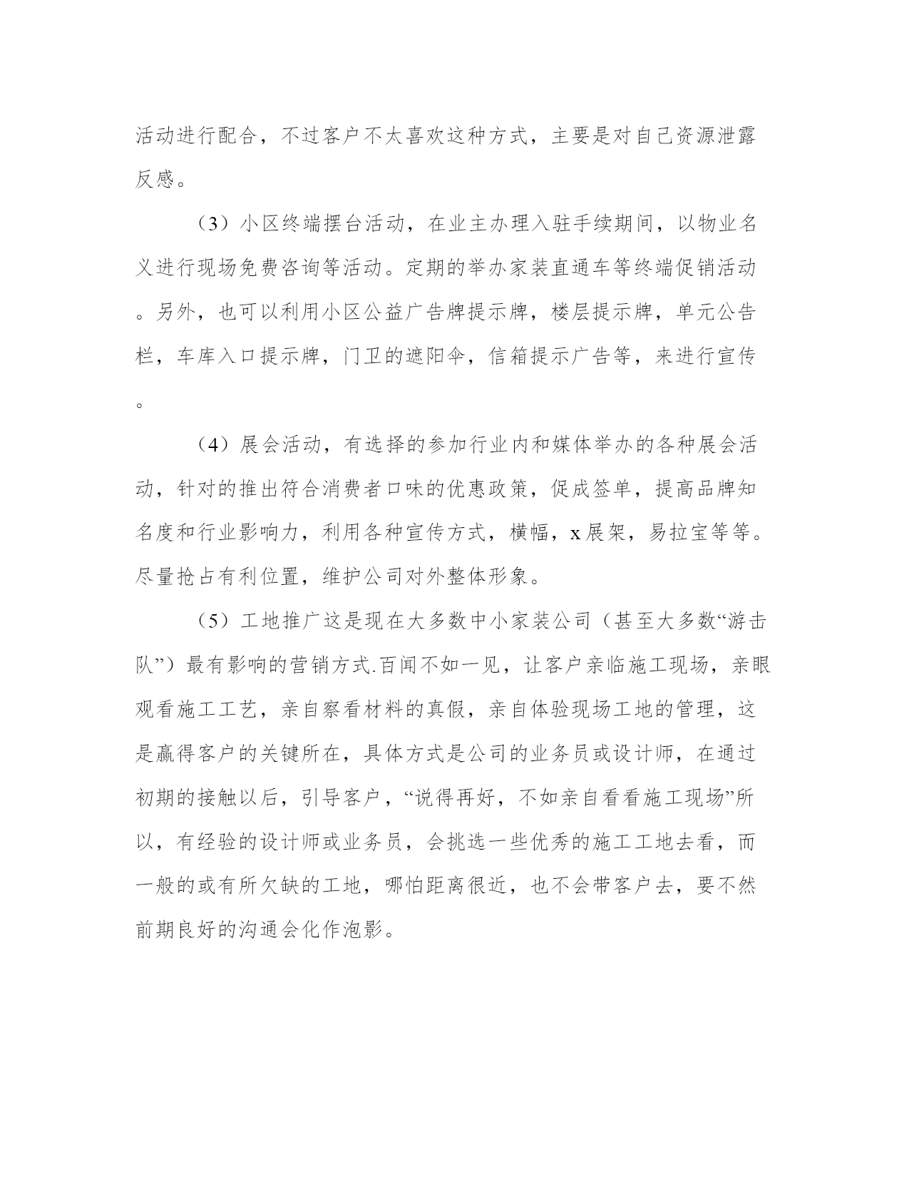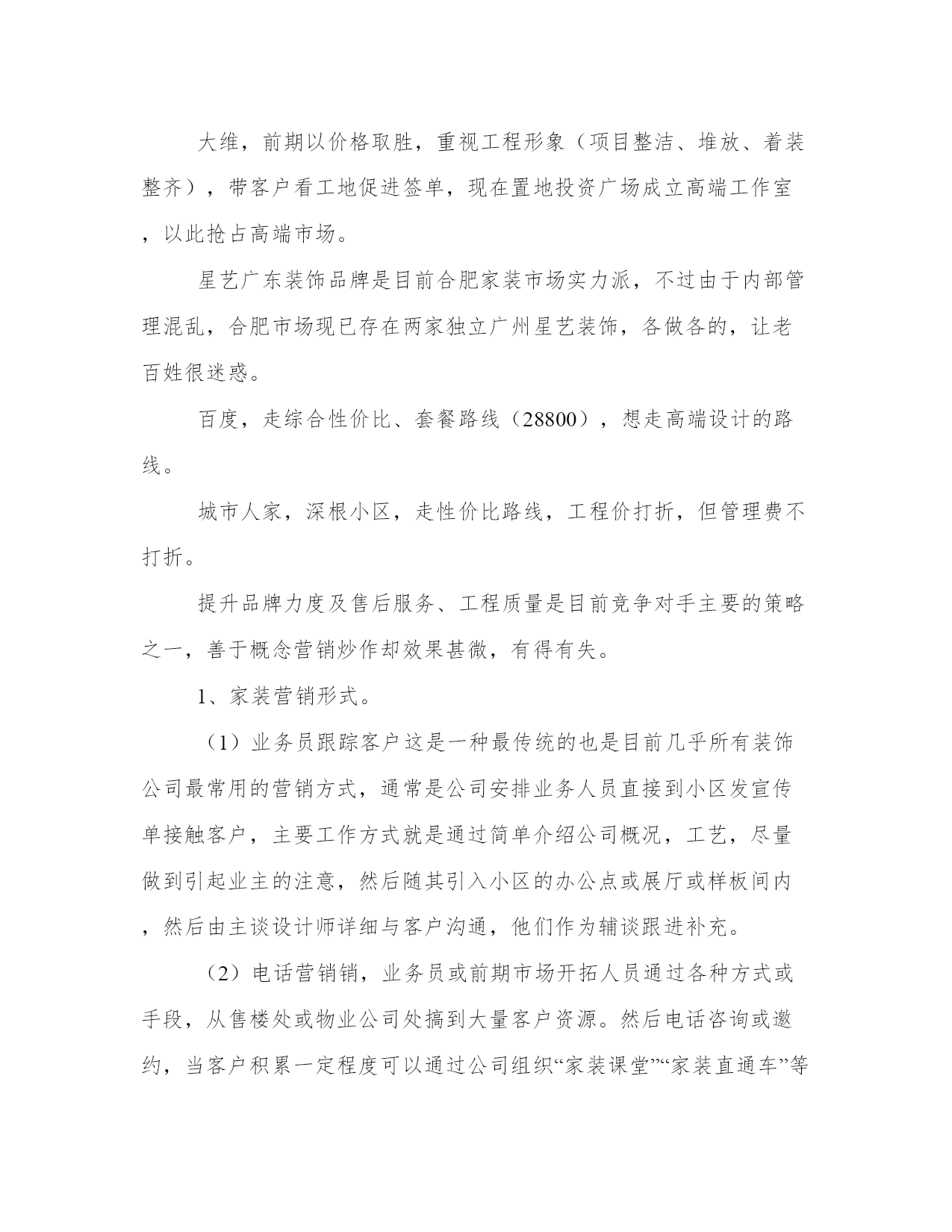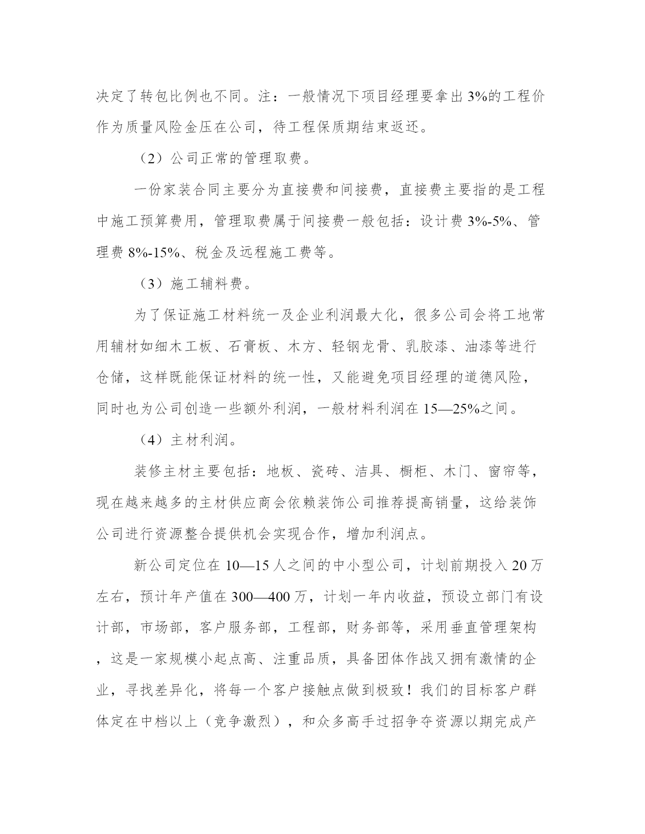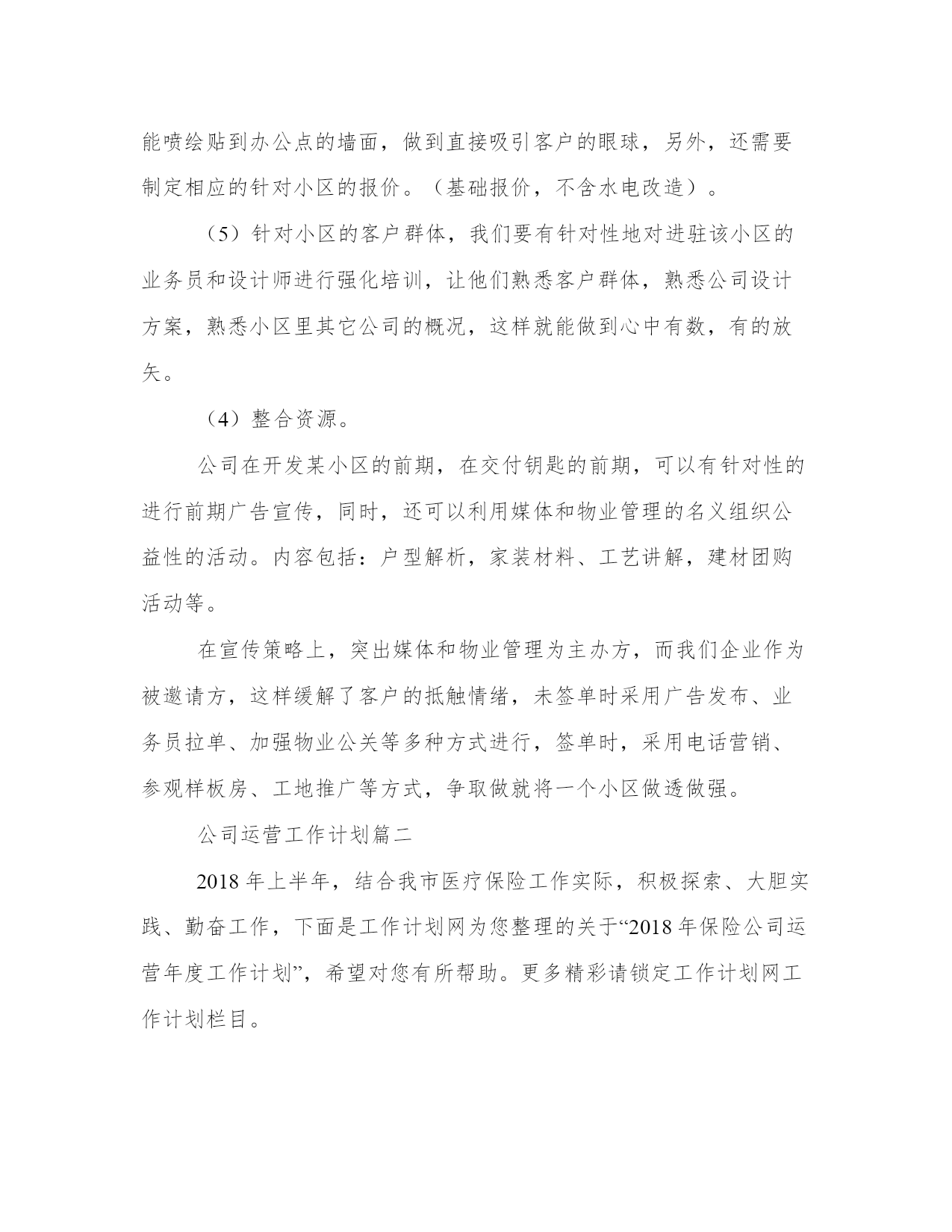 2023年公司运营工作计划(优秀13篇)时间过得真快,总在不经意间流逝,我们又将续写新的诗篇,展开新的旅程,该为自己下阶段的学习制定一个计划了。那关于计划格式是怎样的呢?而个人计划又该怎么写呢?这里给大家分享一些最新的计划书范文,方便大家学习。公司运营工作计划篇一本方案将从行业市场定位、营销策略及管理与盈利模式等展开构想,以期达到为决策者提供参考依据,文中省略了关于企业战略规划的细述,对部分标题内容仅做提纲性描述。创办新公司的思路和情况。成为一家优秀的装饰企业是我们的梦想,并在此基础上努力做到最好,我们知道装饰行业是一个市场容量大,入市门槛低,同质化程度高,竞争激烈又极度不规范的行业。目前,多数企业采用公司设计师接单,项目经理分包等形式作为公司主要运营模式。关于盈利,装饰公司的利润主要有以下几点:(1)工程分包费。为了减少公司管理成本,通常装饰公司会将所签合同与实际支出的差价作为公司的毛利润(一般在30-40%),其余部分(60-70%)会转包给与自己有固定承包合同的项目经理,这样利润公司利润虽然比直接施工要小,但利润相对固定,各公司报价、材料、施工等值不同决定了转包比例也不同。注:一般情况下项目经理要拿出3%的工程价作为质量风险金压在公司,待工程保质期结束返还。(2)公司正常的管理取费。一份家装合同主要分为直接费和间接费,直接费主要指的是工程中施工预算费用,管理取费属于间接费一般包括:设计费3%-5%、管理费8%-15%、税金及远程施工费等。(3)施工辅料费。为了保证施工材料统一及企业利润最大化,很多公司会将工地常用辅材如细木工板、石膏板、木方、轻钢龙骨、乳胶漆、油漆等进行仓储,这样既能保证材料的统一性,又能避免项目经理的道德风险,同时也为公司创造一些额外利润,一般材料利润在15—25%之间。(4)主材利润。装修主材主要包括:地板、瓷砖、洁具、橱柜、木门、窗帘等,现在越来越多的主材供应商会依赖装饰公司推荐提高销量,这给装饰公司进行资源整合提供机会实现合作,增加利润点。新公司定位在10—15人之间的中小型公司,计划前期投入20万左右,预计年产值在300—400万,计划一年内收益,预设立部门有设计部,市场部,客户服务部,工程部,财务部等,采用垂直管理架构,这是一家规模小起点高、注重品质,具备团体作战又拥有激情的企业,寻找差异化,将每一个客户接触点做到极致!我们的目标客户群体定在中档以上(竞争激烈),和众多高手过招争夺资源以期完成产值,为此我们需要拥有超越对手的能力和相应市场的速度,以及强烈的服务意识。二、在新公司明确了竞争环境和目标之后,执行力是实现经营目标的决定因素!1.、公司预计成立时间。20xx年8月筹备—9月初开业。2、公司股东背景介绍及股权结构。待定。3、公司业务范围。装饰设计,施工,材料,与家居有关的一切!4、公司的目标和发展战略。20xx年8月—9月,是新公司筹划制定目标方案及分解战略步骤的准备期,至20xx年未,计划完成100万产值任务,实现完工在建样板房20—30个,在开业一年内实现品牌建立,产值任务达标,两年内形成设计,施工,材料销售等业务组合,进入合肥家装界主流品牌,为此,20xx年确定为“开局之年”,20xx年将是“产值年”新公司的营销策略,年度计划,工作步骤将会按照清晰的发展目标制定和实施。三、市场机会分析。1、环境分析。装饰行业年产值近2万亿,年均增长18%,装饰装修已成为消费者仅次购房以外第二大消费支出。目前,家装业总产值首次超过了家电业、汽车业和牛奶业,装饰行业市场容量大,发展速度快,行业分布广,为一般传统行业所不及,是典型的朝阳产业,是拉动国民经济增长点重要力量。合肥市20xx年gdp1664.84亿元,增长率17.2%,增幅达中部六省市之首。合肥市商品房均价4150元/平米,随着前几年房地产的持续热销,大多数新房将集中在20xx年交付,每年新交付楼盘众多,合肥07年商品房销售1028万m2,08年销售800万m2,二手房和二次装修房约400万m2,加上望湖城、天鹅湖、报业园等三十多个单位集资房面积约200万m2,再加上历年存量房约500万m2,合计建筑面积达2928万m2,以每套100m2计,合计292800套,以其中一半准备装修计,需装修套数为146400套,以每套装修费(不含主材)35000元计,总产值达51.24亿元,将超过08年家装约44个亿的总产值。滨湖新区等百万平米大盘交房量都在10000套以上,市场潜力巨大。品牌装饰公司所占市场份额不足20%,装饰成熟度低,消费者尚处于初级价格阶段,大多数竞争对手营销能力不强。另外,家装市场是一个低关注度的行业,也就是说消费者在没买房子甚至没拿房子的时候,是不会注意家装信息的。这个特点决
