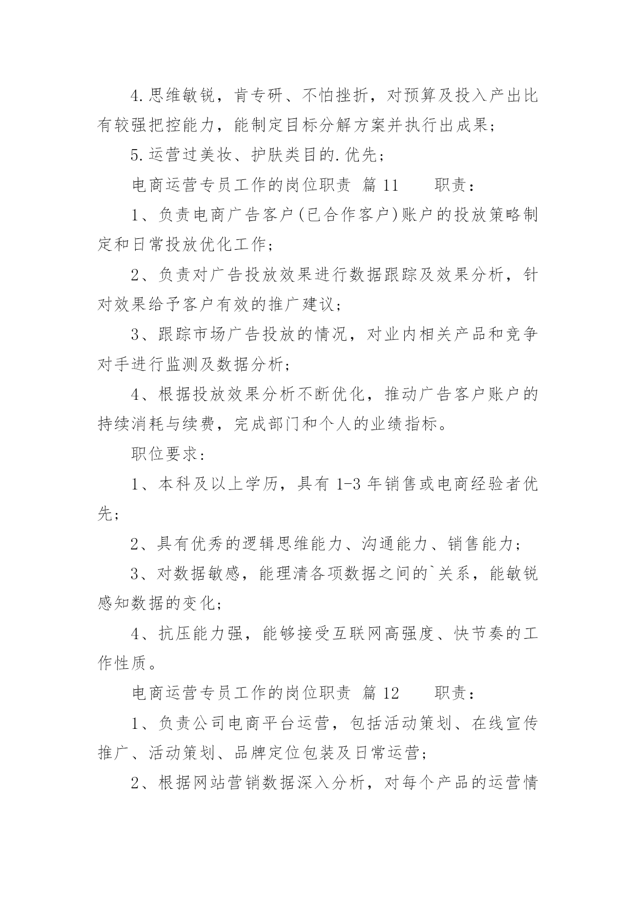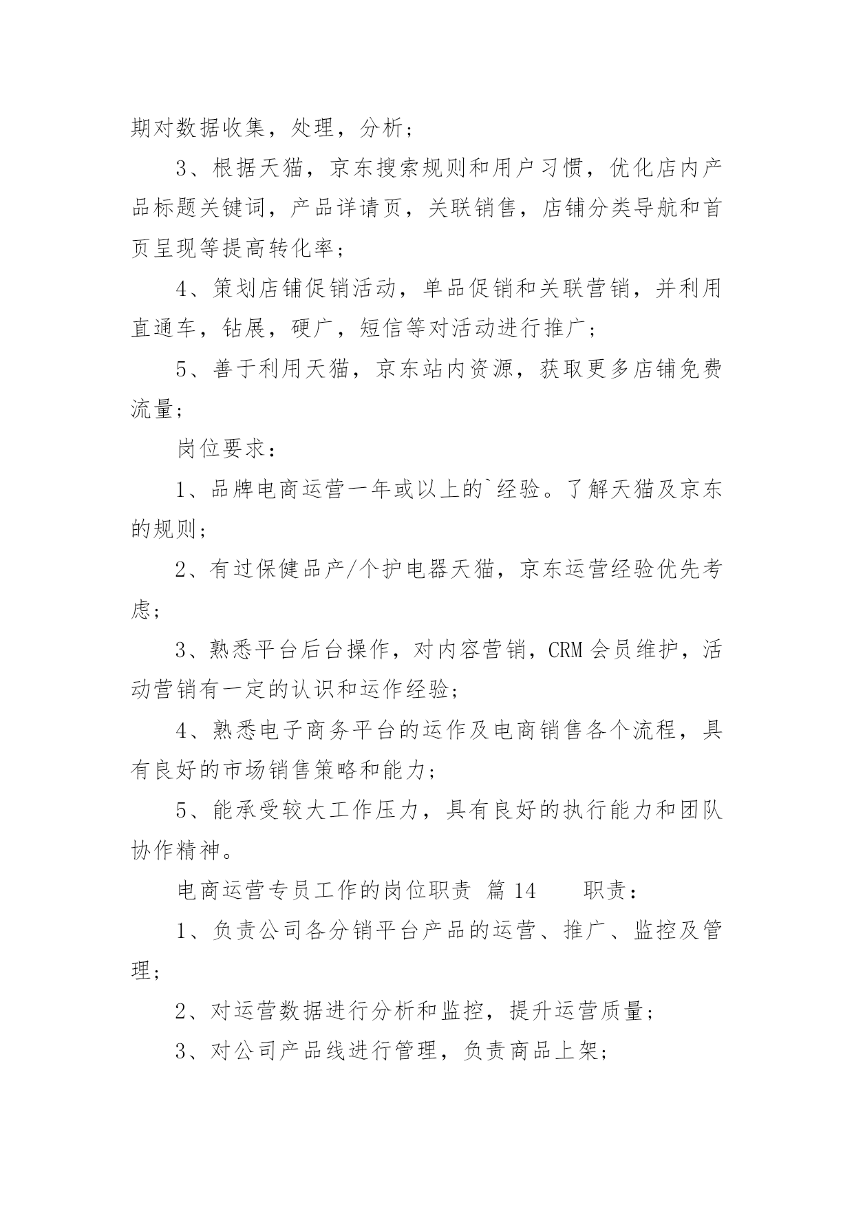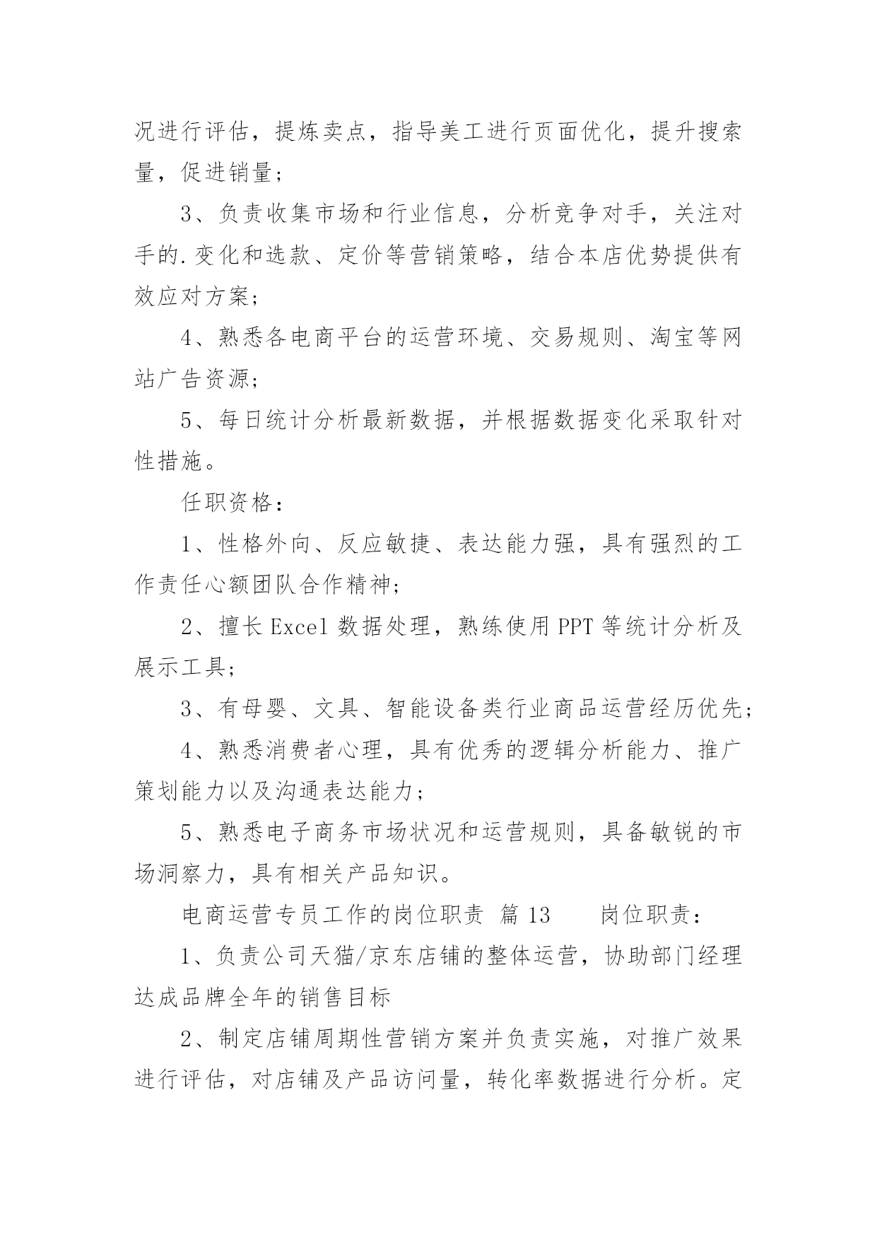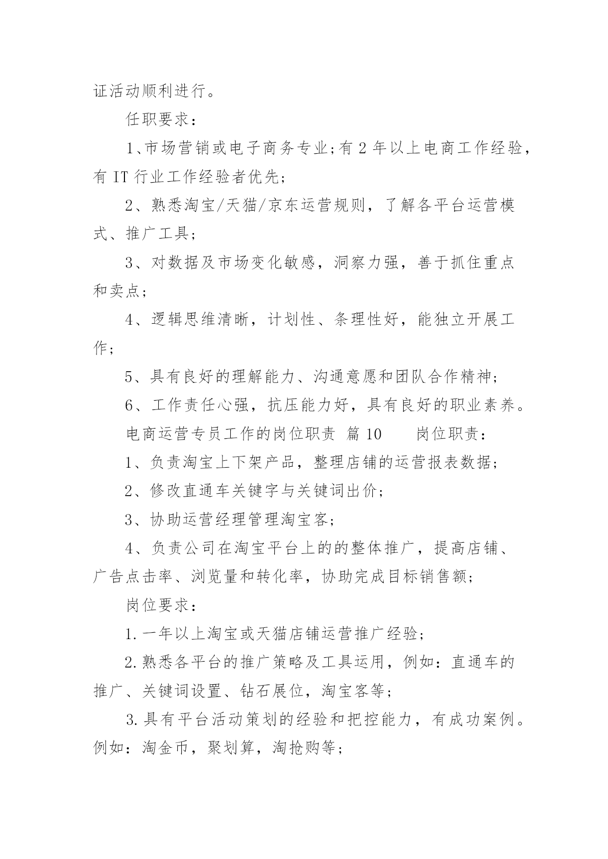 电商运营专员工作的岗位职责电商运营专员工作的岗位职责(通用21篇)在学习、工作、生活中,需要使用岗位职责的场合越来越多,制定岗位职责可以减少违章行为和违章事故的发生。一般岗位职责是怎么制定的呢?下面是小编精心整理的电商运营专员工作的岗位职责,希望对大家有所帮助。电商运营专员工作的岗位职责篇11、负责淘宝京东的整体运营,熟悉平台流程及推广规则;2、负责淘宝京东店铺推广工作,能够熟练运用直通车,钻展等营销工具。能有效提高店铺的`浏览量、点击率和转化率等;3、控制运营成本,扩张免费流量渠道和提升流量,安排店铺各类促销活动;4、制定推广方案并负责实施,对推广效果进行评估,对店铺及产品访问量、转化率数据进行分析;5、新品宝贝销量的破零以及提升,进行评价维护,打造爆款。6、完成领导交办的其他工作电商运营专员工作的岗位职责篇2岗位职责:1、负责公司的阿里巴巴平台店铺日常运作,客户维护2、通过公司线上平台向准客户介绍公司产品,并促成合作,跟进订单进展3、利用网络进行公司产品的销售及推广,负责公司网上平台的操作管理和产品信息的发布.任职要求:1、大专或以上学历;电子商务、营销、计算机相关专业2、有网站建设及电子商务经验者优先录取3、可以独立完成网站前后台工作,熟悉网站的.运营及推广营销4、良好的沟通能力及团队协作能力,富有责任心、学习能力强电商运营专员工作的岗位职责篇3职责:1.负责区域内电商渠道经销商开发、日常运营管理与沟通,帮助店铺完成相关业绩指标;2.天猫京东及其他电商平台经销商后台各项日常数据的统计、收集和分析;3.参与策划公司产品的线上营销活动并制定推广方案;4.追踪并监察各项电商经销商生意发展计划的执行和实施;5.配合公司供应链做好经销商全国各仓备货及出货管理;6.收集同行业竞品的营销信息。任职要求:1、专科及以上学历,2年及以上电商运营管理经验、热爱互联网零售;2、熟悉主流电商平台业务流程及规则,有较强的逻辑思维能力和沟通表达能力;3、具有站内、站外、团购等上活动资源,具备引流方法的.各项资源;4、有良好的沟通能力及团队合作能力,工作责任心强,有想法并且能够将想法实现;5、正直、热情、坦诚、豁达、自信。电商运营专员工作的岗位职责篇41、电商平台(天猫、京东、拼多多、淘宝特卖)的运营策划工作;2、各店铺的详情、主图、文案工作;3、平台销售的产品销售数据深入挖掘,及时的调整店铺的'运营方案和方向;4、关键词的深挖和匹配度的问题,提高店铺整体的点击率、转化率;5、针对产品做销售工作,完成销售业绩。电商运营专员工作的岗位职责篇5职责:1.负责社区电商(如魅力惠、毒、寺库等)日常商品的更新和维护,完成页面装修、新品发布和活动发布工作;2.制定商品销售推广计划,店铺商品促销方案等,提升社区电商的运营能力,达成运营目标;3.负责微信营销活动策划,微信内容文案及活动文案设计撰写,提升内容质量和传播度;4.负责电商网站每日监控的数据:营销数据、交易数据、商品管理、客户评价;5.跟进网购的各种官方推广活动的执行,配合网购力争活动效果;并与渠道平台管理人员有效沟通;6.完成其他上级安排的工作;7.薪资待遇:底薪+提成岗位要求:1.专科以上学历,有服饰类、奢侈品类运营,Excel使用熟练,有外贸运营经验优先;2.了解电商政策规定;3.思维灵活且有逻辑性。积极主动,敏锐的`市场分析能力,善于解决各种业务问题;4.能承受一定的工作压力,应变能力强;5.性格开朗,正直,自我约束力强,高度的工作热情,良好的团队合作精神;电商运营专员工作的岗位职责篇6职责:1、负责商家所处行业、淘宝、竞争对手的`市场信息数据收集、整理与分析;2、负责策划天猫/京东店铺促销活动方案,及活动跟进、执行,与撰写活动评估报告;3、负责策划天猫/京东店铺、商品推广方案,及推广工作跟进、执行,与撰写市场推广评估报告;4、负责商品关键字优化、商品类目优化;5、负责保持与天猫/京东相关工作人员、淘宝商家间的正常联系及关系维护。职位要求:1、熟悉淘宝网规则,有一年以上网店运营推广实施经验,了解网购用户行为习惯;2、具有一定的广告策划能力,市场营销能力,对网络推广有一定了解;3、具备良好的沟通能力和团队协作精神,能吃苦耐劳;4、能熟练操作excel、word、PPT等办公应用软件;5、能熟练操作天猫/京东等品台操作、以及ERP系统。电商运营专员工作的岗位职责篇7职责:1、负责推广运营,提高店铺点击率和流浪量;2、整理每天、周、月监控的数据,流量数据、营销数据、交易数据、做好产品优化和客户管理;3、定期针对推广运营效果进行跟踪、评估、并提交推广运营效果的统计分析报表,及时提出营销改进措施,并给出可行的.改进方案。任职要求:1、大专及以上学历,电子商务、市场营销专业优先;2、有过京东、天猫、淘宝、有