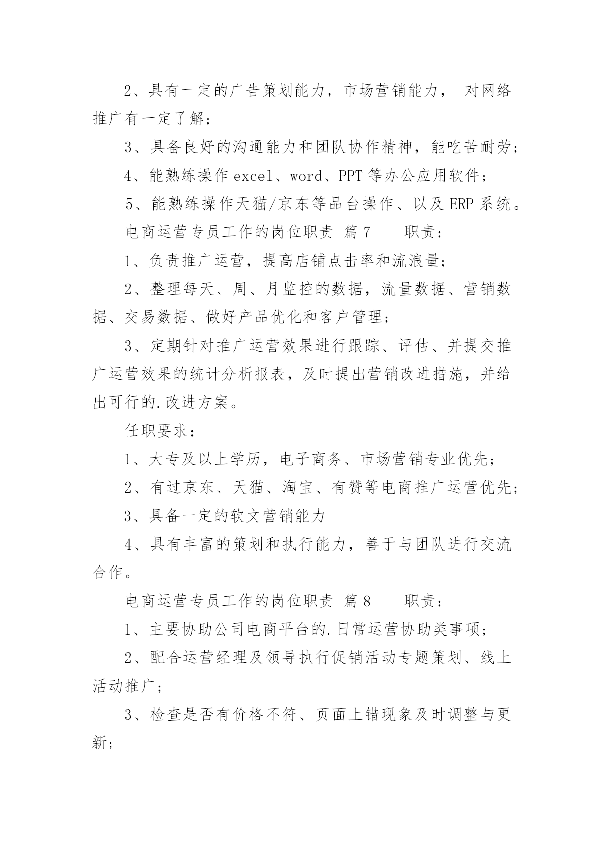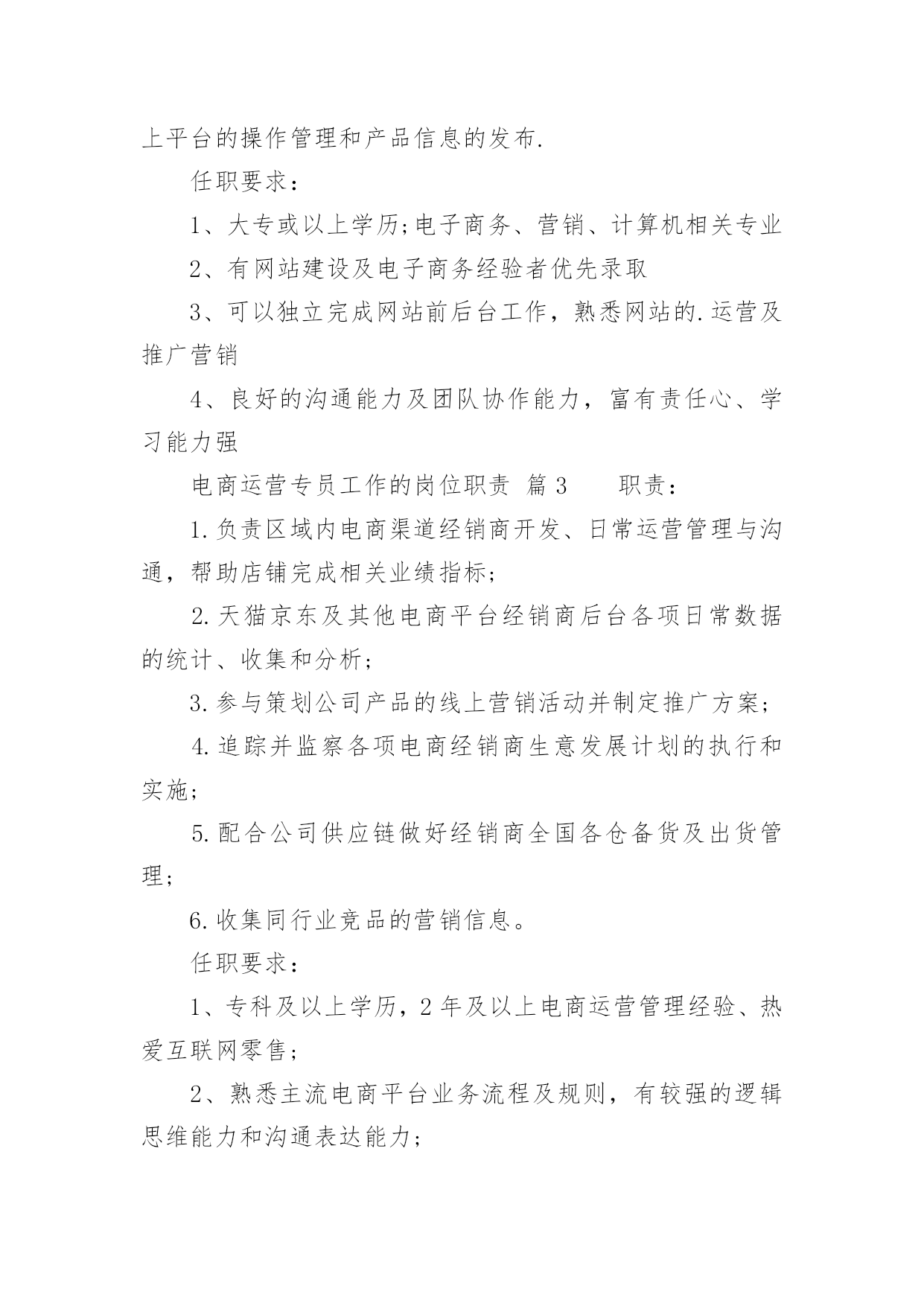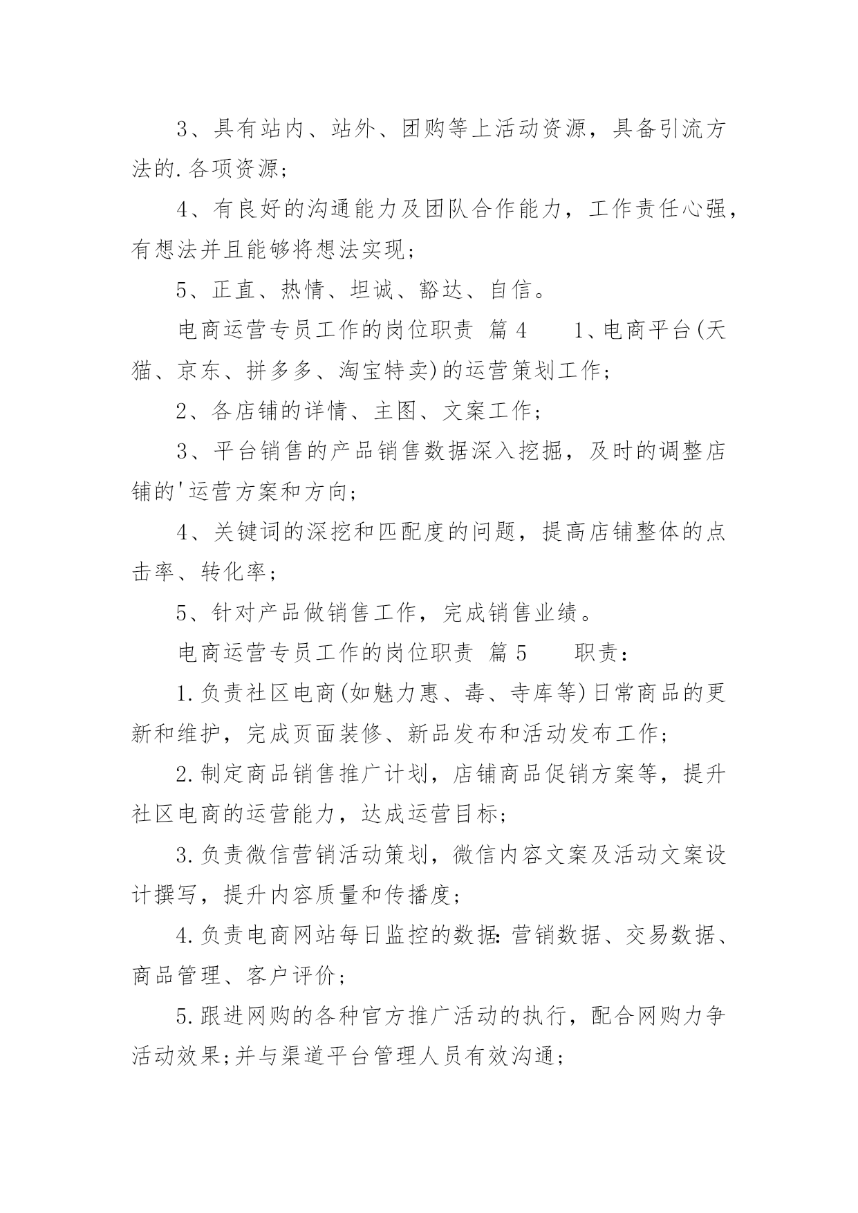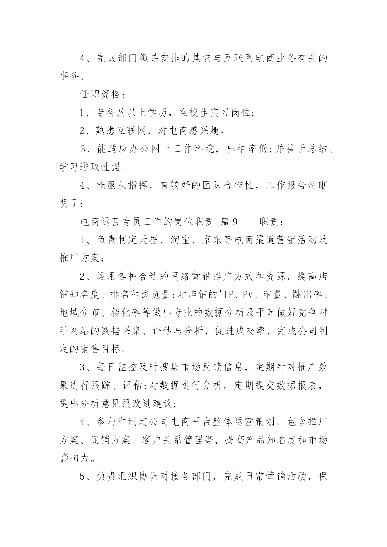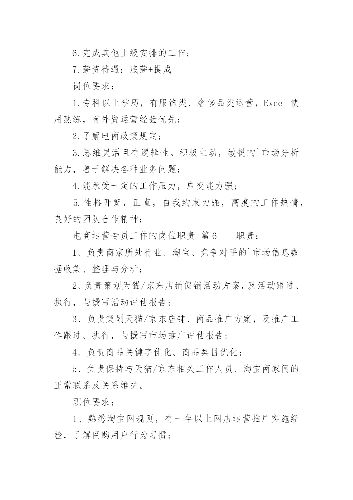 电商运营专员工作的岗位职责电商运营专员工作的岗位职责(通用21篇)在学习、工作、生活中,需要使用岗位职责的场合越来越多,制定岗位职责可以减少违章行为和违章事故的发生。一般岗位职责是怎么制定的呢?下面是小编精心整理的电商运营专员工作的岗位职责,希望对大家有所帮助。电商运营专员工作的岗位职责篇11、负责淘宝京东的整体运营,熟悉平台流程及推广规则;2、负责淘宝京东店铺推广工作,能够熟练运用直通车,钻展等营销工具。能有效提高店铺的`浏览量、点击率和转化率等;3、控制运营成本,扩张免费流量渠道和提升流量,安排店铺各类促销活动;4、制定推广方案并负责实施,对推广效果进行评估,对店铺及产品访问量、转化率数据进行分析;5、新品宝贝销量的破零以及提升,进行评价维护,打造爆款。6、完成领导交办的其他工作电商运营专员工作的岗位职责篇2岗位职责:1、负责公司的阿里巴巴平台店铺日常运作,客户维护2、通过公司线上平台向准客户介绍公司产品,并促成合作,跟进订单进展3、利用网络进行公司产品的销售及推广,负责公司网上平台的操作管理和产品信息的发布.任职要求:1、大专或以上学历;电子商务、营销、计算机相关专业2、有网站建设及电子商务经验者优先录取3、可以独立完成网站前后台工作,熟悉网站的.运营及推广营销4、良好的沟通能力及团队协作能力,富有责任心、学习能力强电商运营专员工作的岗位职责篇3职责:1.负责区域内电商渠道经销商开发、日常运营管理与沟通,帮助店铺完成相关业绩指标;2.天猫京东及其他电商平台经销商后台各项日常数据的统计、收集和分析;3.参与策划公司产品的线上营销活动并制定推广方案;4.追踪并监察各项电商经销商生意发展计划的执行和实施;5.配合公司供应链做好经销商全国各仓备货及出货管理;6.收集同行业竞品的营销信息。任职要求:1、专科及以上学历,2年及以上电商运营管理经验、热爱互联网零售;2、熟悉主流电商平台业务流程及规则,有较强的逻辑思维能力和沟通表达能力;3、具有站内、站外、团购等上活动资源,具备引流方法的.各项资源;4、有良好的沟通能力及团队合作能力,工作责任心强,有想法并且能够将想法实现;5、正直、热情、坦诚、豁达、自信。电商运营专员工作的岗位职责篇41、电商平台(天猫、京东、拼多多、淘宝特卖)的运营策划工作;2、各店铺的详情、主图、文案工作;3、平台销售的产品销售数据深入挖掘,及时的调整店铺的'运营方案和方向;4、关键词的深挖和匹配度的问题,提高店铺整体的点击率、转化率;5、针对产品做销售工作,完成销售业绩。电商运营专员工作的岗位职责篇5职责:1.负责社区电商(如魅力惠、毒、寺库等)日常商品的更新和维护,完成页面装修、新品发布和活动发布工作;2.制定商品销售推广计划,店铺商品促销方案等,提升社区电商的运营能力,达成运营目标;3.负责微信营销活动策划,微信内容文案及活动文案设计撰写,提升内容质量和传播度;4.负责电商网站每日监控的数据:营销数据、交易数据、商品管理、客户评价;5.跟进网购的各种官方推广活动的执行,配合网购力争活动效果;并与渠道平台管理人员有效沟通;6.完成其他上级安排的工作;7.薪资待遇:底薪+提成岗位要求:1.专科以上学历,有服饰类、奢侈品类运营,Excel使用熟练,有外贸运营经验优先;2.了解电商政策规定;3.思维灵活且有逻辑性。积极主动,敏锐的`市场分析能力,善于解决各种业务问题;4.能承受一定的工作压力,应变能力强;5.性格开朗,正直,自我约束力强,高度的工作热情,良好的团队合作精神;电商运营专员工作的岗位职责篇6职责:1、负责商家所处行业、淘宝、竞争对手的`市场信息数据收集、整理与分析;2、负责策划天猫/京东店铺促销活动方案,及活动跟进、执行,与撰写活动评估报告;3、负责策划天猫/京东店铺、商品推广方案,及推广工作跟进、执行,与撰写市场推广评估报告;4、负责商品关键字优化、商品类目优化;5、负责保持与天猫/京东相关工作人员、淘宝商家间的正常联系及关系维护。职位要求:1、熟悉淘宝网规则,有一年以上网店运营推广实施经验,了解网购用户行为习惯;2、具有一定的广告策划能力,市场营销能力,对网络推广有一定了解;3、具备良好的沟通能力和团队协作精神,能吃苦耐劳;4、能熟练操作excel、word、PPT等办公应用软件;5、能熟练操作天猫/京东等品台操作、以及ERP系统。电商运营专员工作的岗位职责篇7职责:1、负责推广运营,提高店铺点击率和流浪量;2、整理每天、周、月监控的数据,流量数据、营销数据、交易数据、做好产品优化和客户管理;3、定期针对推广运营效果进行跟踪、评估、并提交推广运营效果的统计分析报表,及时提出营销改进措施,并给出可行的.改进方案。任职要求:1、大专及以上学历,电子商务、市场营销专业优先;2、有过京东、天猫、淘宝、有