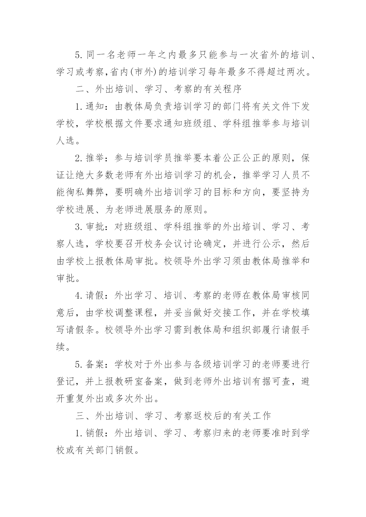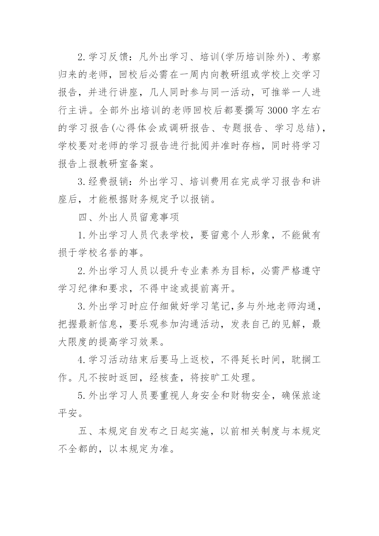 培训学习制度在现在社会,很多场合都离不了制度,制度是一种要求大家共同遵守的规章或准则。那么你真正懂得怎么制定制度吗?下面是小编帮大家整理的培训学习制度,希望对大家有所帮助。为了规范中学校老师外出学习、培训、考察管理,完善老师培训学习管理制度,维护老师培育、培训的公正与公正,做到有序、有效培育老师,遵照教体局和纪委纪检组联席会议要求,现对大武口区老师外出学习、培训、考察作如下规定:一、老师外出学习、培训、考察的原则1.区级以上政府部门或教育主管部门下发通知或指令参与学习、培训、考察的领导和老师,经学校或教体局同意方可参与。2.教育主管部门组织的培训或各类研讨会,涉及到领导和学科老师,学校可依据实际状况按方案派出。3.因教育教学工作需要必需派出培训、参赛、参会或考察学习的领导和老师,由学校依据有关规定或经学校讨论推举、教体局批准后方可参与。4.对一些民间性质的学术团体组织的会议或活动,未经教体局批准,学校不得派老师参与;非学术性团体组织的活动,学校一律不得参与。5.同一名老师一年之内最多只能参与一次省外的培训、学习或考察,省内(市外)的培训学习每年最多不得超过两次。二、外出培训、学习、考察的有关程序1.通知:由教体局负责培训学习的部门将有关文件下发学校,学校根据文件要求通知班级组、学科组推举参与培训人选。2.推举:参与培训学员推举要本着公正公正的原则,保证让绝大多数老师有外出培训学习的机会,推举学习人员不能徇私舞弊,要明确外出培训学习的目标和方向,要坚持为学校进展、为老师进展服务的原则。3.审批:对班级组、学科组推举的外出培训、学习、考察人选,学校要召开校务会议讨论确定,并进行公示,然后由学校上报教体局审批。校领导外出学习须由教体局推举和审批。4.请假:外出学习、培训、考察的老师在教体局审核同意后,由学校调整课程,并妥当做好交接工作,并在学校填写请假条。校领导外出学习需到教体局和组织部履行请假手续。5.备案:学校对于外出参与各级培训学习的老师要进行登记,并上报教研室备案,做到老师外出培训有据可查,避开重复外出或多次外出。三、外出培训、学习、考察返校后的有关工作1.销假:外出培训、学习、考察归来的老师要准时到学校或有关部门销假。2.学习反馈:凡外出学习、培训(学历培训除外)、考察归来的老师,回校后必需在一周内向教研组或学校上交学习报告,并进行讲座,几人同时参与同一活动,可推举一人进行主讲。全部外出培训的老师回校后都要撰写3000字左右的学习报告(心得体会或调研报告、专题报告、学习总结),学校要对老师的学习报告进行批阅并准时存档,同时将学习报告上报教研室备案。3.经费报销:外出学习、培训费用在完成学习报告和讲座后,才能根据财务规定予以报销。四、外出人员留意事项1.外出学习人员代表学校,要留意个人形象,不能做有损于学校名誉的事。2.外出学习人员以提升专业素养为目标,必需严格遵守学习纪律和要求,不得中途或提前离开。3.外出学习时应仔细做好学习笔记,多与外地老师沟通,把握最新信息,要乐观参加沟通活动,发表自己的见解,最大限度的提高学习效果。4.学习活动结束后要马上返校,不得延长时间,耽搁工作。凡不按时返回,经核查,将按旷工处理。5.外出学习人员要重视人身安全和财物安全,确保旅途平安。五、本规定自发布之日起实施,以前相关制度与本规定不全都的,以本规定为准。