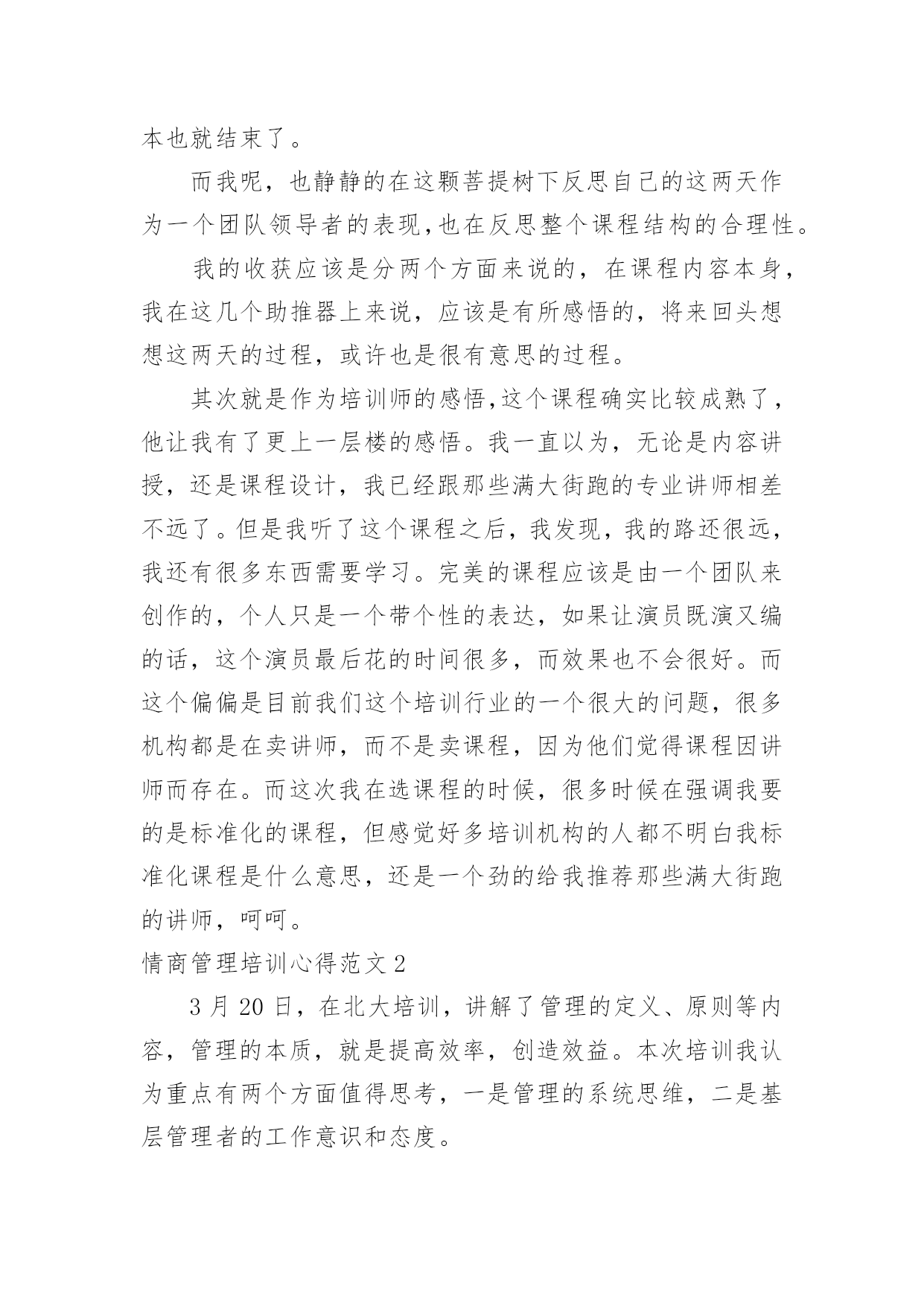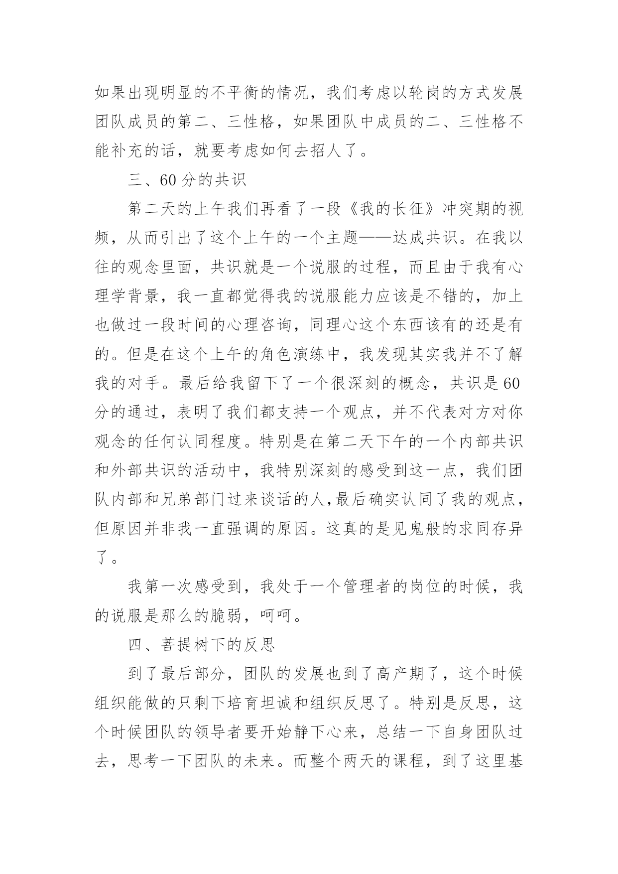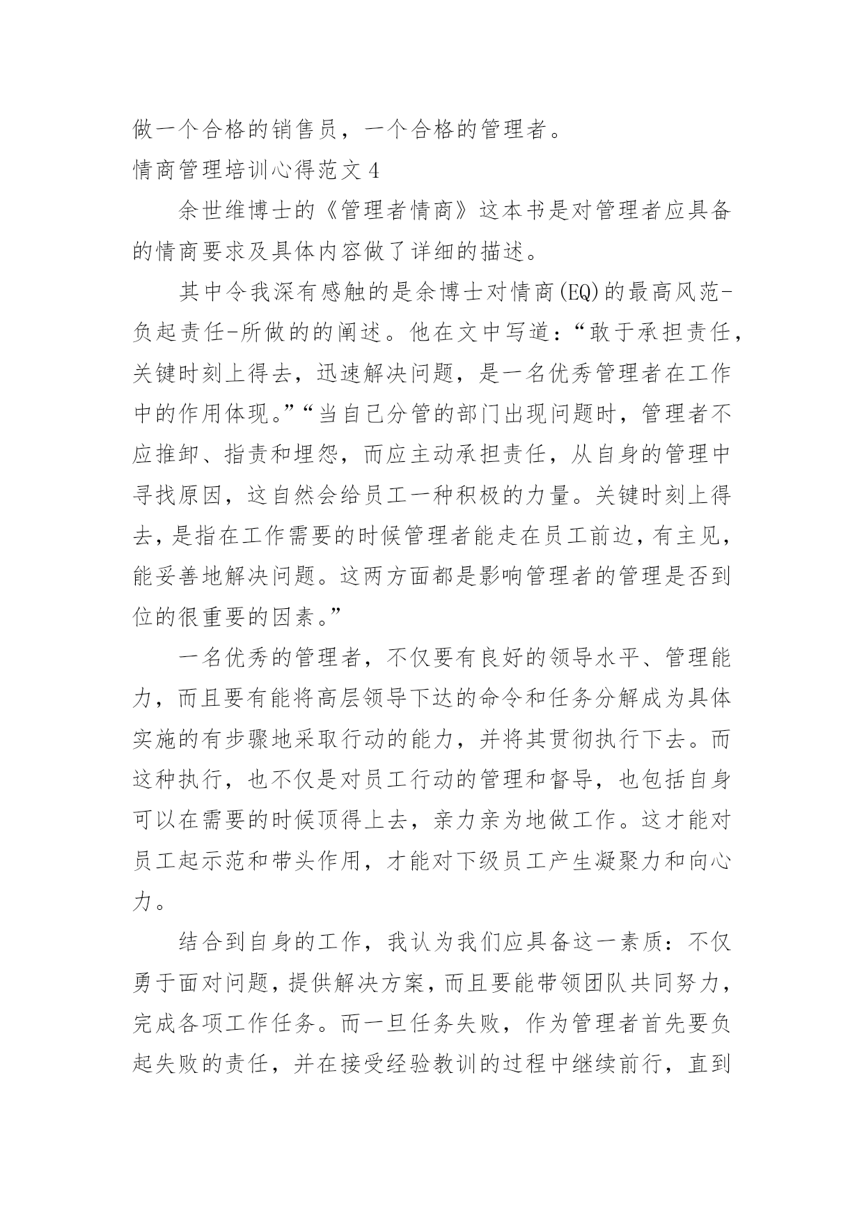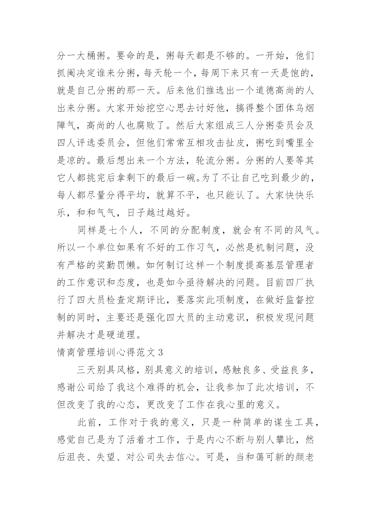 情商管理培训心得情商管理培训心得范文从某件事情上得到收获以后,常常可以将它们写成一篇心得体会,这么做能够提升我们的书面表达能力。那么好的心得体会都具备一些什么特点呢?下面是小编为大家整理的情商管理培训心得范文,欢迎大家借鉴与参考,希望对大家有所帮助。情商管理培训心得范文1一、突如其来的Leader由于公司计划做一个中层系列的课程,为了更好的选择这次的供应商,我自然少不了到处去试下“菜”了。在8月16、17两日,我参加了AMA在广州举办的题为《团队领导力》的一个课程。以前也多少听过一些团队、领导力之类的课程,感觉都是务虚的居多,而且一些培训机构的朋友听说我要去试听这个课,都说我去被人忽悠去了。我呢,也是怀着我不入地狱谁入地狱的决心去一趟,打算反正听起来感觉不好,那第二天就消失了。由于参训的多是一些企业的中高层,大部分人姗姗来迟,结果本来9点开始的课程,延续到了9点半才开始,在这期间,讲师要求我们填了个《团队发展阶段测评》,边填边等。讲师简单的介绍了一下他自己,然后就从自己在做野外拓展的经验开始引入团队管理的问题了。根据讲师的介绍,我们整个为期两天的培训,是以两个团队为红线来展开:一个是实实在在的团队,就是我们这些参训的学员;另一个就是一个虚拟的团队——崔永元弄的一个纪录片《我的长征》里面的团队。而培训也就以我们组建现实团队开始了,我们这一组6个人,有一个迟到,实到5个,除了我以外,剩下4个都是移动的中层,所以他们都不想做组长,最后弄了个抽签,而也天随人愿,刚好抽到我这个圈外人。于是我这个经验最浅的人,便突如其来的变成了这个团队的Leader了。做了就做了,反正大姑娘上轿,总要有那么一回,就算是提前体验一下生活吧。我们这个课程,从目录上看是三部分,其实严格意义上是4部分,不过由于按照金字塔结构和信息呈现的技巧,做成一个引子,三个主题,跟我平常备课的习惯也是一样的。当然,AMA这个课比我的课成熟多了,里面设计了很多跟主题相关的体验活动,这也是我要好好看齐的地方。不过这个课程虽然是典型的4部曲,但是明显的感受到一点,头尾比较轻,中间非常重,其实这个课程的头尾都是非常重要的,头是课程的导入的源头,而尾是我们整个课程如何落地,如何把学到的东西用出来。可惜的是头开得还好,中间呢也很充实,就是尾结得有点仓促,或许到了最后时刻,从学员到讲师都希望早点收工,导致了这么重要的一环,被一带而过。这是整个两天课程中非常重要的一个败笔。讲师讲了一些团队定义、团队领导重点、团队发模式这些内容后,便组织了第一个团体活动Belbin活动。这是一个由9个小活动组成的大活动。也是这个“头”开得好的关键所在。我在讲师那里拿到了整套东西之后,便开始了这个队长任上的第一项工作——工作分配了。由于整个队伍的成员都是老江湖了,加上也不了解大家在那些方面有特长,分配是很难的,于是我就让大家自己选任务了。从事后的情况来看,这样子有好,有不好,好的地方在于各展所长,不好的地方,剩下没有人选的任务,自然出现了“被选择”的局面了。第一天上午也就是在这个历时一个小时的活动中结束了,胜负不足论,留下的是很多的反思。当一个团队领导人遇到一个新的团队,他应该做点什么呢?而这个反思刚好就可以让我们导入到这个课程的第一部分:如何从团队形成期过渡到风暴期?二、个人岂有完美,团队可臻至善在反思的上午的游戏之后,课程正式走进了依托团队发展两个维度4个阶段的6个助推器了。我个人感觉助推器这个词好像不是很符合中国人的语言习惯,最起码,我不能直接反应过来,感觉是直接从英语翻译过来的。感觉改成6把钥匙、6把梯子、6根救命稻草之类好一点,呵呵。伴随着上午游戏的反思,我们看了第一段《我的.长征》的片段。这段视频是由三段视频剪切而成,分别表现了第一任队长林健在刚组建团队时的愉悦与磨合期团队的冲突。如果换了我来剪片的话,我应该不会这样剪。最起码我不会把这个视频剪到一起,可以分开,先看愉悦的,然后稍作讲解,再播出后面的,从而过渡到下一部分的内容。在这一部分讲师根据AMA的模型,介绍了两个过渡的工具,分别是赏识特质和明确任务。在赏识特质这个问题上,讲师介绍了传统的西游团队,进而给我们做了一个团队角色测试。关于这个团队特质或者性格源头在荣格的性格理论,后来延伸出了一个四型的人格模型,现在在大陆搞这个最起劲的就是之前在非诚勿扰里面的那个乐嘉,盗用了人家的知识,还说是自己原创,还弄个什么注册,现在到处以大师的面孔出现,个人感觉这个人跟那个神道李一是一丘之貉。当然,这也是目前中国培训行业、心理行业、宗教养生行业非常悲哀的一点,好好的一个行业被这些害群之马搞得浑浊不堪,成为了少数人谋利的工具。做了测试之后,我们看了一下结果,跟以往的也大同小异了。在这一块当时我问了一个问题,我说我明白自己的优点在那里,也明白我的缺点在那里,我到