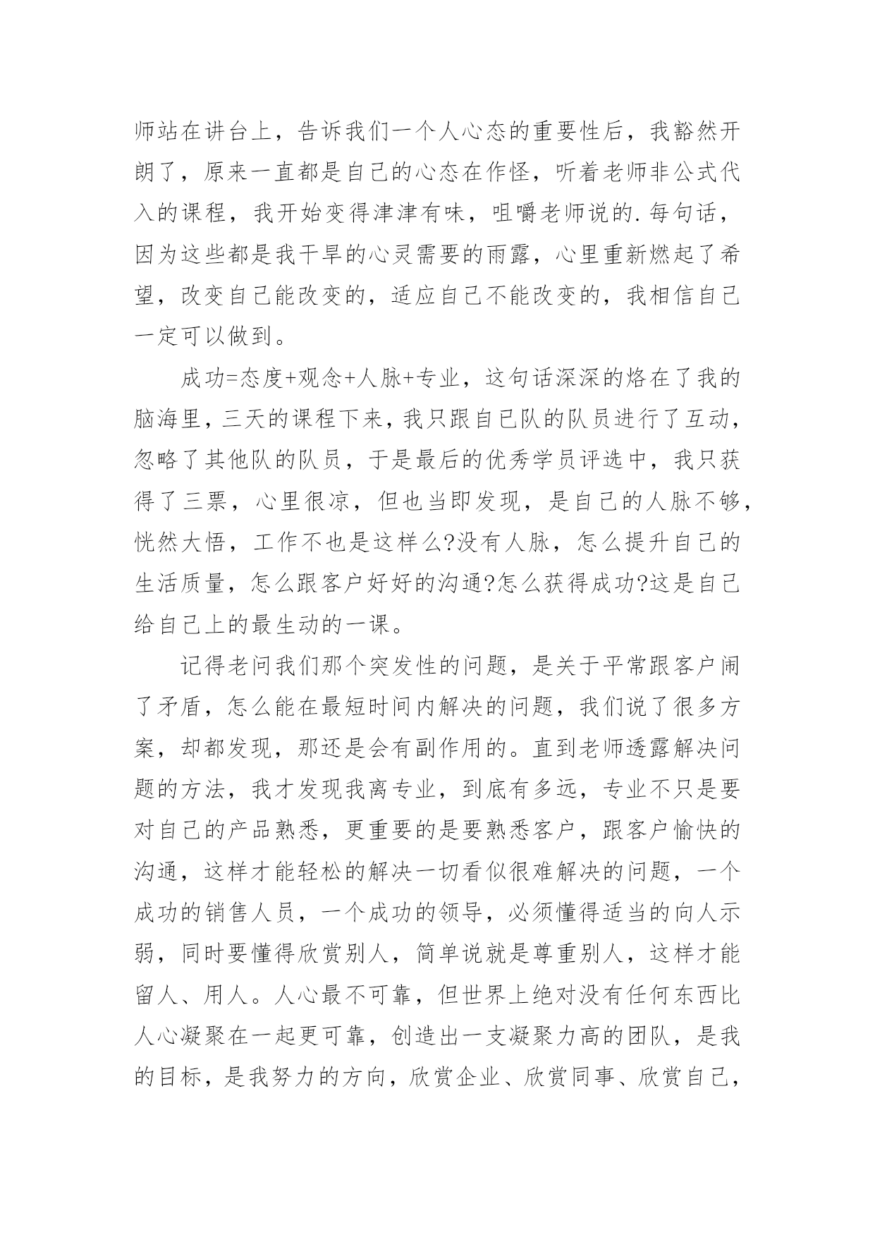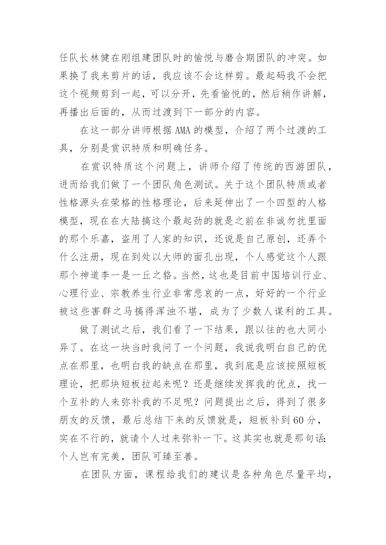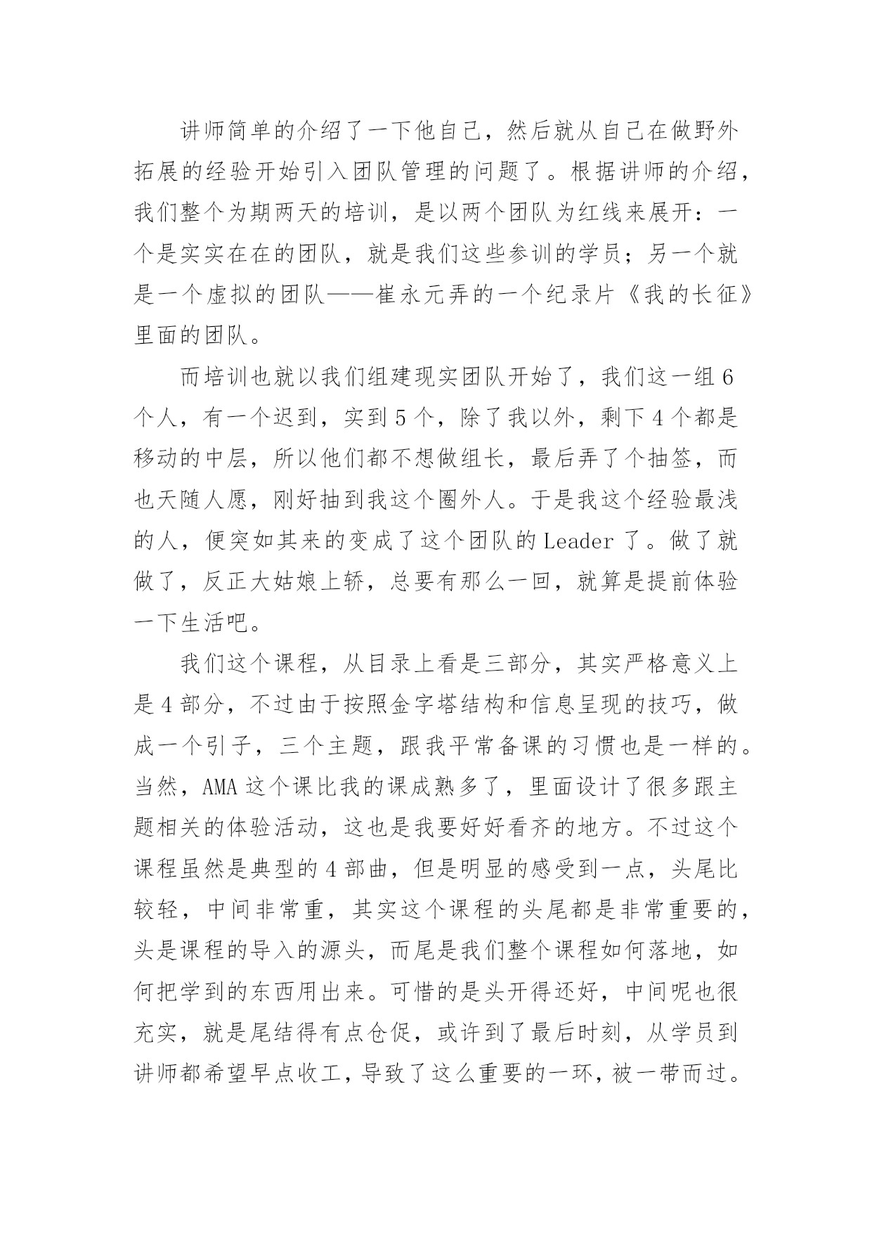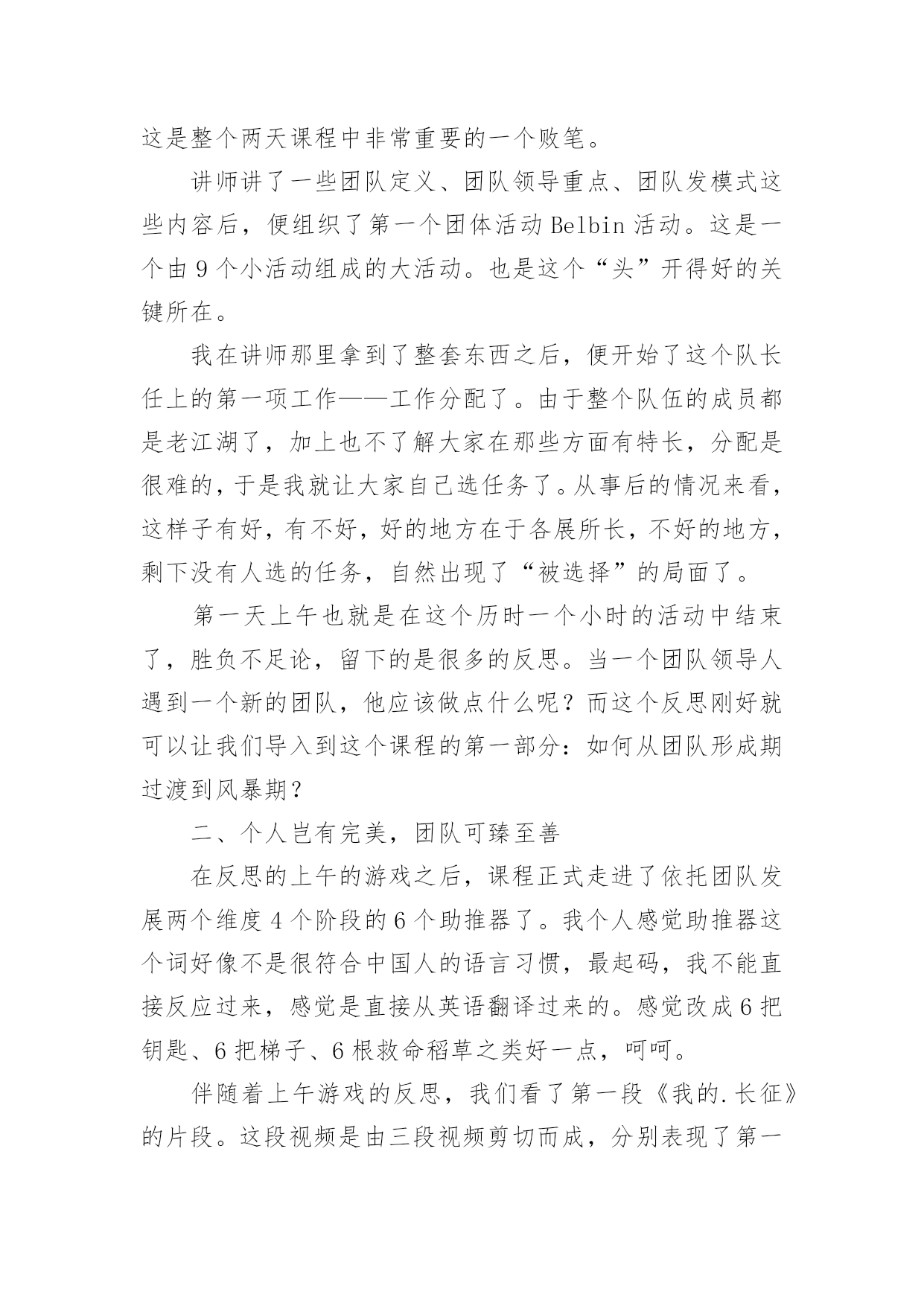 情商管理培训心得情商管理培训心得范文从某件事情上得到收获以后,常常可以将它们写成一篇心得体会,这么做能够提升我们的书面表达能力。那么好的心得体会都具备一些什么特点呢?下面是小编为大家整理的情商管理培训心得范文,欢迎大家借鉴与参考,希望对大家有所帮助。情商管理培训心得范文1一、突如其来的Leader由于公司计划做一个中层系列的课程,为了更好的选择这次的供应商,我自然少不了到处去试下“菜”了。在8月16、17两日,我参加了AMA在广州举办的题为《团队领导力》的一个课程。以前也多少听过一些团队、领导力之类的课程,感觉都是务虚的居多,而且一些培训机构的朋友听说我要去试听这个课,都说我去被人忽悠去了。我呢,也是怀着我不入地狱谁入地狱的决心去一趟,打算反正听起来感觉不好,那第二天就消失了。由于参训的多是一些企业的中高层,大部分人姗姗来迟,结果本来9点开始的课程,延续到了9点半才开始,在这期间,讲师要求我们填了个《团队发展阶段测评》,边填边等。讲师简单的介绍了一下他自己,然后就从自己在做野外拓展的经验开始引入团队管理的问题了。根据讲师的介绍,我们整个为期两天的培训,是以两个团队为红线来展开:一个是实实在在的团队,就是我们这些参训的学员;另一个就是一个虚拟的团队——崔永元弄的一个纪录片《我的长征》里面的团队。而培训也就以我们组建现实团队开始了,我们这一组6个人,有一个迟到,实到5个,除了我以外,剩下4个都是移动的中层,所以他们都不想做组长,最后弄了个抽签,而也天随人愿,刚好抽到我这个圈外人。于是我这个经验最浅的人,便突如其来的变成了这个团队的Leader了。做了就做了,反正大姑娘上轿,总要有那么一回,就算是提前体验一下生活吧。我们这个课程,从目录上看是三部分,其实严格意义上是4部分,不过由于按照金字塔结构和信息呈现的技巧,做成一个引子,三个主题,跟我平常备课的习惯也是一样的。当然,AMA这个课比我的课成熟多了,里面设计了很多跟主题相关的体验活动,这也是我要好好看齐的地方。不过这个课程虽然是典型的4部曲,但是明显的感受到一点,头尾比较轻,中间非常重,其实这个课程的头尾都是非常重要的,头是课程的导入的源头,而尾是我们整个课程如何落地,如何把学到的东西用出来。可惜的是头开得还好,中间呢也很充实,就是尾结得有点仓促,或许到了最后时刻,从学员到讲师都希望早点收工,导致了这么重要的一环,被一带而过。这是整个两天课程中非常重要的一个败笔。讲师讲了一些团队定义、团队领导重点、团队发模式这些内容后,便组织了第一个团体活动Belbin活动。这是一个由9个小活动组成的大活动。也是这个“头”开得好的关键所在。我在讲师那里拿到了整套东西之后,便开始了这个队长任上的第一项工作——工作分配了。由于整个队伍的成员都是老江湖了,加上也不了解大家在那些方面有特长,分配是很难的,于是我就让大家自己选任务了。从事后的情况来看,这样子有好,有不好,好的地方在于各展所长,不好的地方,剩下没有人选的任务,自然出现了“被选择”的局面了。第一天上午也就是在这个历时一个小时的活动中结束了,胜负不足论,留下的是很多的反思。当一个团队领导人遇到一个新的团队,他应该做点什么呢?而这个反思刚好就可以让我们导入到这个课程的第一部分:如何从团队形成期过渡到风暴期?二、个人岂有完美,团队可臻至善在反思的上午的游戏之后,课程正式走进了依托团队发展两个维度4个阶段的6个助推器了。我个人感觉助推器这个词好像不是很符合中国人的语言习惯,最起码,我不能直接反应过来,感觉是直接从英语翻译过来的。感觉改成6把钥匙、6把梯子、6根救命稻草之类好一点,呵呵。伴随着上午游戏的反思,我们看了第一段《我的.长征》的片段。这段视频是由三段视频剪切而成,分别表现了第一任队长林健在刚组建团队时的愉悦与磨合期团队的冲突。如果换了我来剪片的话,我应该不会这样剪。最起码我不会把这个视频剪到一起,可以分开,先看愉悦的,然后稍作讲解,再播出后面的,从而过渡到下一部分的内容。在这一部分讲师根据AMA的模型,介绍了两个过渡的工具,分别是赏识特质和明确任务。在赏识特质这个问题上,讲师介绍了传统的西游团队,进而给我们做了一个团队角色测试。关于这个团队特质或者性格源头在荣格的性格理论,后来延伸出了一个四型的人格模型,现在在大陆搞这个最起劲的就是之前在非诚勿扰里面的那个乐嘉,盗用了人家的知识,还说是自己原创,还弄个什么注册,现在到处以大师的面孔出现,个人感觉这个人跟那个神道李一是一丘之貉。当然,这也是目前中国培训行业、心理行业、宗教养生行业非常悲哀的一点,好好的一个行业被这些害群之马搞得浑浊不堪,成为了少数人谋利的工具。做了测试之后,我们看了一下结果,跟以往的也大同小异了。在这一块当时我问了一个问题,我说我明白自己的优点在那里,也明白我的缺点在那里,我到