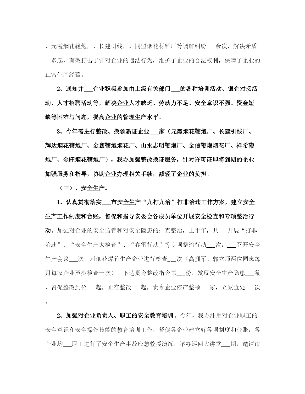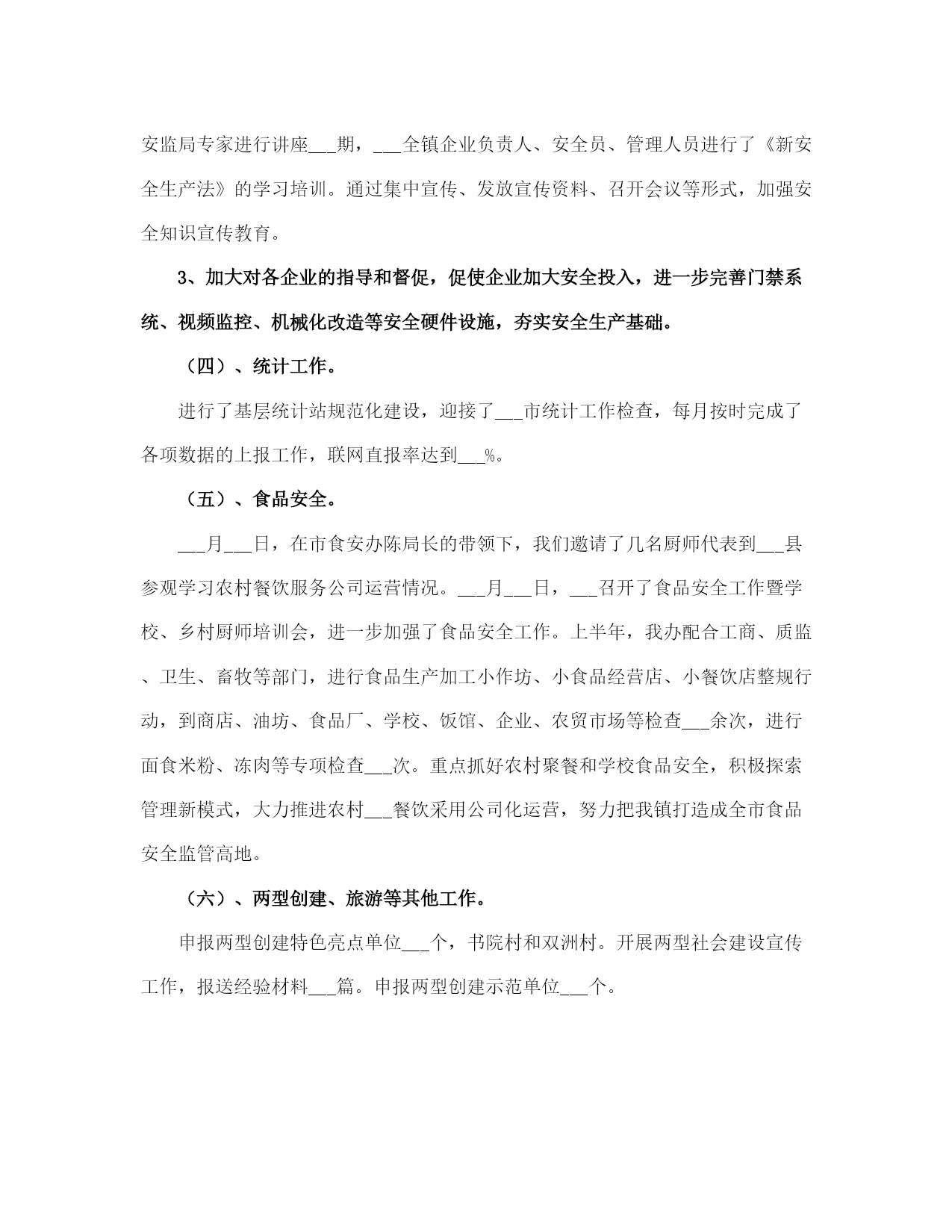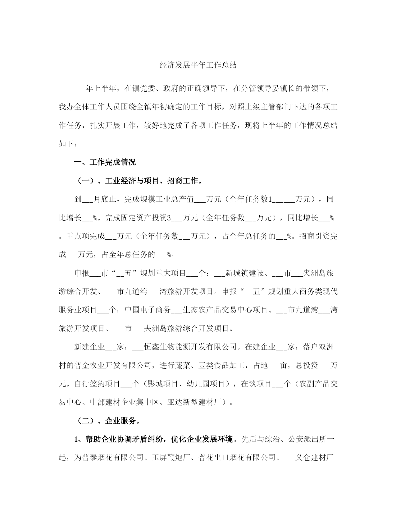 经济发展半年工作总结(完整版)文档资料可直接使用,可编辑,欢迎下载经济发展半年工作总结___年上半年,在镇党委、政府的正确领导下,在分管领导晏镇长的带领下,我办全体工作人员围绕全镇年初确定的工作目标,对照上级主管部门下达的各项工作任务,扎实开展工作,较好地完成了各项工作任务,现将上半年的工作情况总结如下:一、工作完成情况(一)、工业经济与项目、招商工作。到___月底止,完成规模工业总产值___万元(全年任务数1______万元),同比增长___%。完成固定资产投资3___万元(全年任务数___万元),同比增长___%。重点项完成___万元(全年任务数___万元),占全年总任务的___%。招商引资完成___万元,占全年总任务的___%。申报___市“__五”规划重大项目___个:___新城镇建设、___市___夹洲岛旅游综合开发、___市九道湾___湾旅游开发项目。申报“__五”规划重大商务类现代服务业项目___个:中国电子商务___生态农产品交易中心项目、___市九道湾___湾旅游开发项目、___市___夹洲岛旅游综合开发项目。新建企业___家:___恒鑫生物能源开发有限公司。在建企业___家:落户双洲村的普金农业开发有限公司,进行蔬菜、豆类食品加工,占地___亩,总投资___万元。自行签约项目___个(影城项目、幼儿园项目),在谈项目___个(农副产品交易中心、中部建材企业集中区、亚达新型建材厂)。(二)、企业服务。1、帮助企业协调矛盾纠纷,优化企业发展环境。先后与综治、公安派出所一起,为普泰烟花有限公司、玉屏鞭炮厂、普花出口烟花有限公司、___义仓建材厂、元霞烟花鞭炮厂、长建引线厂、同盟烟花材料厂等调解纠纷___余次,解决矛盾___多起,有效打击了针对企业的违法行为,维护了企业的合法权利,保障了企业的正常生产经营。2、通知并___企业积极参加由上级有关部门___的各种培训活动、银企对接活动、人才招聘活动等,解决企业人才缺乏、劳动力不足、安全意识不强、资金短缺等困难与问题,提高企业的管理生产水平。3、今年需进行整改、换领新证企业___家(元霞烟花鞭炮厂、长建引线厂、辉达烟花鞭炮厂、金鑫鞭炮烟花厂、山水志明鞭炮厂、金信鞭炮烟花厂、祥希鞭炮厂、金旺烟花鞭炮厂),我办加强整改换证服务,针对许可证即将到期的企业加强服务和指导,协助企业办理相关手续,减轻了企业的负担。(三)、安全生产。1、认真贯彻落实___市安全生产“九打九治”打非治违工作方案,建立安全生产工作制度和台账,督促和指导安委会各成员单位开展安全检查和专项整治行动。加强对企业的安全监管和对安全隐患的排查整治,上半年,共___开展“打非治违”、“安全生产大检查”、“春雷行动”等专项整治行动___次,___召开安全生产会议___次,对烟花爆竹生产企业进行检查___次(高拥军、郭立师两位同志每月每家企业至少检查一次),下达责令整改指令书___份,发现安全生产隐患___条,督促整改到位___起,正在整改___起,责令企业停产整顿___家,立案查处___次。2、加强对企业负责人、职工的安全教育培训。今年,我办注重对企业职工的安全意识和安全操作技能的教育培训工作,督促各企业建立好各项制度和台账,各企业均___职工进行了安全生产事故应急救援演练。举办巡回大讲堂___期,邀请市安监局专家进行讲座___期,___全镇企业负责人、安全员、管理人员进行了《新安全生产法》的学习培训。通过集中宣传、发放宣传资料、召开会议等形式,加强安全知识宣传教育。3、加大对各企业的指导和督促,促使企业加大安全投入,进一步完善门禁系统、视频监控、机械化改造等安全硬件设施,夯实安全生产基础。(四)、统计工作。进行了基层统计站规范化建设,迎接了___市统计工作检查,每月按时完成了各项数据的上报工作,联网直报率达到___%。(五)、食品安全。___月___日,在市食安办陈局长的带领下,我们邀请了几名厨师代表到___县参观学习农村餐饮服务公司运营情况。___月___日,___召开了食品安全工作暨学校、乡村厨师培训会,进一步加强了食品安全工作。上半年,我办配合工商、质监、卫生、畜牧等部门,进行食品生产加工小作坊、小食品经营店、小餐饮店整规行动,到商店、油坊、食品厂、学校、饭馆、企业、农贸市场等检查___余次,进行面食米粉、冻肉等专项检查___次。重点抓好农村聚餐和学校食品安全,积极探索管理新模式,大力推进农村___餐饮采用公司化运营,努力把我镇打造成全市食品安全监管高地。(六)、两型创建、旅游等其他工作。申报两型创建特色亮点单位___个,书院村和双洲村。开展两型社会建设宣传工作,报送经验材料___篇。申报两型创建示范单位___个。___年旅游工作因无项目建设扣了分,今年,在镇党委