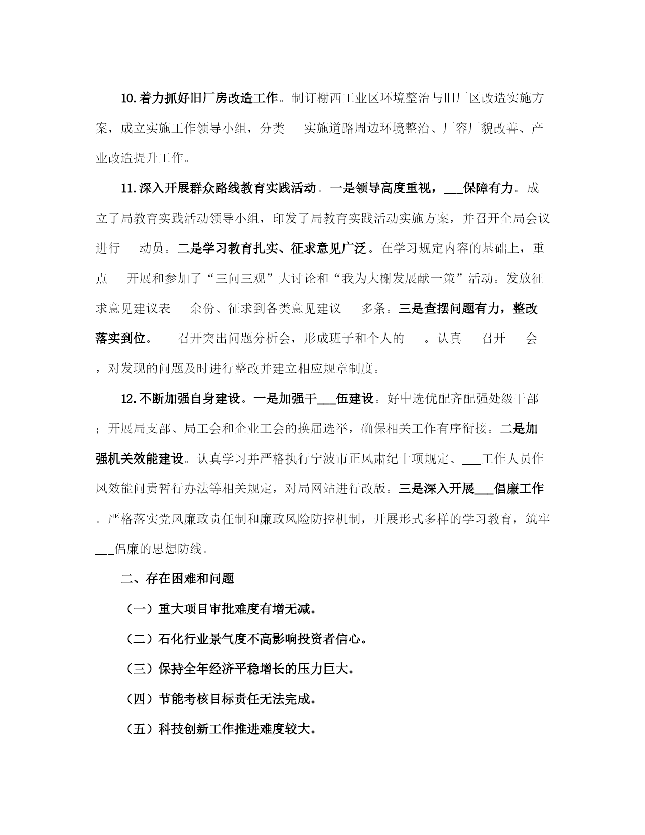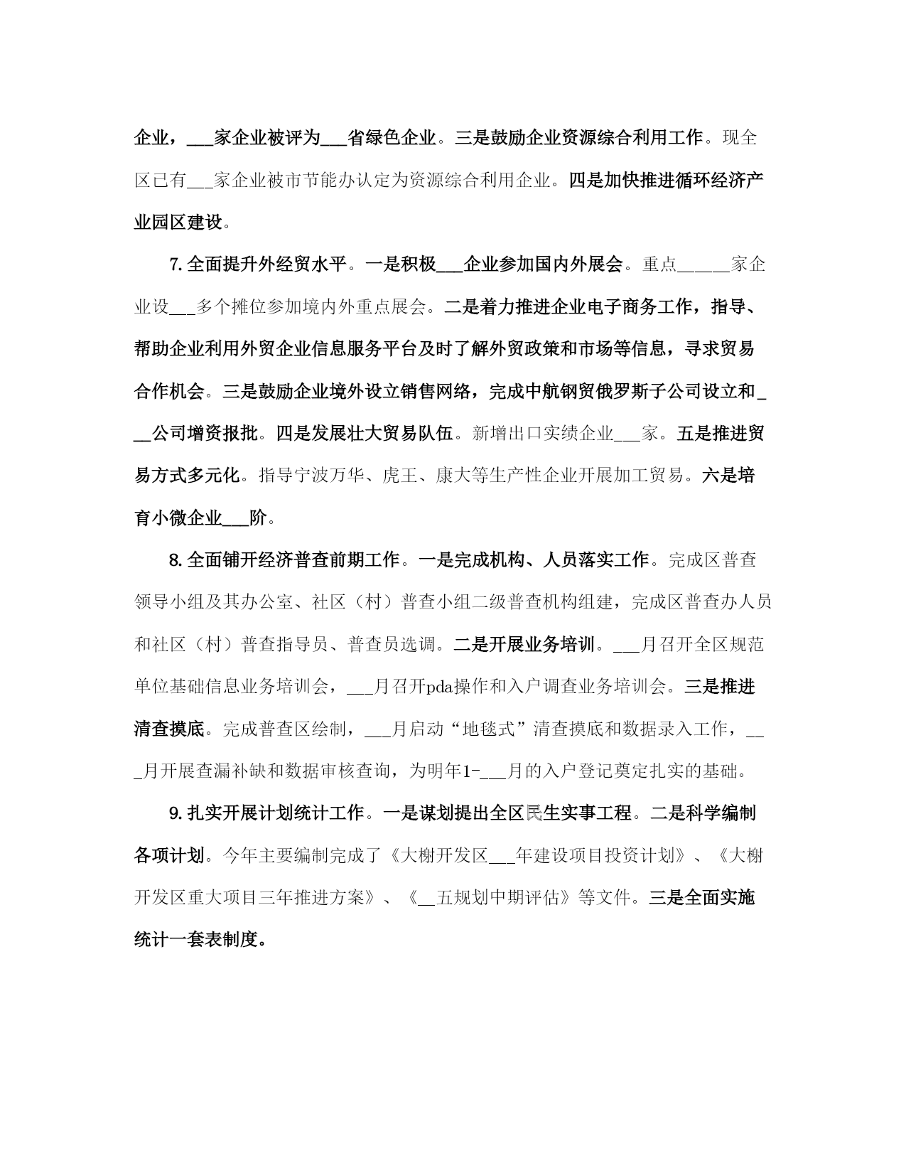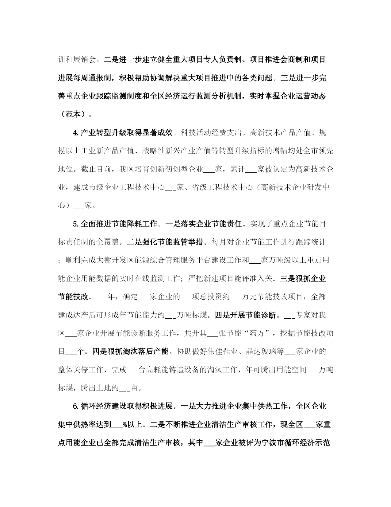 经济发展半年工作总结(完整版)文档资料可直接使用,可编辑,欢迎下载经济发展半年工作总结___年上半年,在镇党委、政府的正确领导下,在分管领导晏镇长的带领下,我办全体工作人员围绕全镇年初确定的工作目标,对照上级主管部门下达的各项工作任务,扎实开展工作,较好地完成了各项工作任务,现将上半年的工作情况总结如下:一、工作完成情况(一)、工业经济与项目、招商工作。到___月底止,完成规模工业总产值___万元(全年任务数1______万元),同比增长___%。完成固定资产投资3___万元(全年任务数___万元),同比增长___%。重点项完成___万元(全年任务数___万元),占全年总任务的___%。招商引资完成___万元,占全年总任务的___%。申报___市“__五”规划重大项目___个:___新城镇建设、___市___夹洲岛旅游综合开发、___市九道湾___湾旅游开发项目。申报“__五”规划重大商务类现代服务业项目___个:中国电子商务___生态农产品交易中心项目、___市九道湾___湾旅游开发项目、___市___夹洲岛旅游综合开发项目。新建企业___家:___恒鑫生物能源开发有限公司。在建企业___家:落户双洲村的普金农业开发有限公司,进行蔬菜、豆类食品加工,占地___亩,总投资___万元。自行签约项目___个(影城项目、幼儿园项目),在谈项目___个(农副产品交易中心、中部建材企业集中区、亚达新型建材厂)。(二)、企业服务。1、帮助企业协调矛盾纠纷,优化企业发展环境。先后与综治、公安派出所一起,为普泰烟花有限公司、玉屏鞭炮厂、普花出口烟花有限公司、___义仓建材厂、元霞烟花鞭炮厂、长建引线厂、同盟烟花材料厂等调解纠纷___余次,解决矛盾___多起,有效打击了针对企业的违法行为,维护了企业的合法权利,保障了企业的正常生产经营。2、通知并___企业积极参加由上级有关部门___的各种培训活动、银企对接活动、人才招聘活动等,解决企业人才缺乏、劳动力不足、安全意识不强、资金短缺等困难与问题,提高企业的管理生产水平。3、今年需进行整改、换领新证企业___家(元霞烟花鞭炮厂、长建引线厂、辉达烟花鞭炮厂、金鑫鞭炮烟花厂、山水志明鞭炮厂、金信鞭炮烟花厂、祥希鞭炮厂、金旺烟花鞭炮厂),我办加强整改换证服务,针对许可证即将到期的企业加强服务和指导,协助企业办理相关手续,减轻了企业的负担。(三)、安全生产。1、认真贯彻落实___市安全生产“九打九治”打非治违工作方案,建立安全生产工作制度和台账,督促和指导安委会各成员单位开展安全检查和专项整治行动。加强对企业的安全监管和对安全隐患的排查整治,上半年,共___开展“打非治违”、“安全生产大检查”、“春雷行动”等专项整治行动___次,___召开安全生产会议___次,对烟花爆竹生产企业进行检查___次(高拥军、郭立师两位同志每月每家企业至少检查一次),下达责令整改指令书___份,发现安全生产隐患___条,督促整改到位___起,正在整改___起,责令企业停产整顿___家,立案查处___次。2、加强对企业负责人、职工的安全教育培训。今年,我办注重对企业职工的安全意识和安全操作技能的教育培训工作,督促各企业建立好各项制度和台账,各企业均___职工进行了安全生产事故应急救援演练。举办巡回大讲堂___期,邀请市安监局专家进行讲座___期,___全镇企业负责人、安全员、管理人员进行了《新安全生产法》的学习培训。通过集中宣传、发放宣传资料、召开会议等形式,加强安全知识宣传教育。3、加大对各企业的指导和督促,促使企业加大安全投入,进一步完善门禁系统、视频监控、机械化改造等安全硬件设施,夯实安全生产基础。(四)、统计工作。进行了基层统计站规范化建设,迎接了___市统计工作检查,每月按时完成了各项数据的上报工作,联网直报率达到___%。(五)、食品安全。___月___日,在市食安办陈局长的带领下,我们邀请了几名厨师代表到___县参观学习农村餐饮服务公司运营情况。___月___日,___召开了食品安全工作暨学校、乡村厨师培训会,进一步加强了食品安全工作。上半年,我办配合工商、质监、卫生、畜牧等部门,进行食品生产加工小作坊、小食品经营店、小餐饮店整规行动,到商店、油坊、食品厂、学校、饭馆、企业、农贸市场等检查___余次,进行面食米粉、冻肉等专项检查___次。重点抓好农村聚餐和学校食品安全,积极探索管理新模式,大力推进农村___餐饮采用公司化运营,努力把我镇打造成全市食品安全监管高地。(六)、两型创建、旅游等其他工作。申报两型创建特色亮点单位___个,书院村和双洲村。开展两型社会建设宣传工作,报送经验材料___篇。申报两型创建示范单位___个。___年旅游工作因无项目建设扣了分,今年,在镇党委