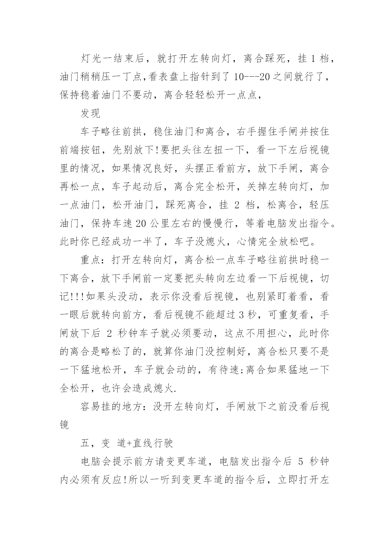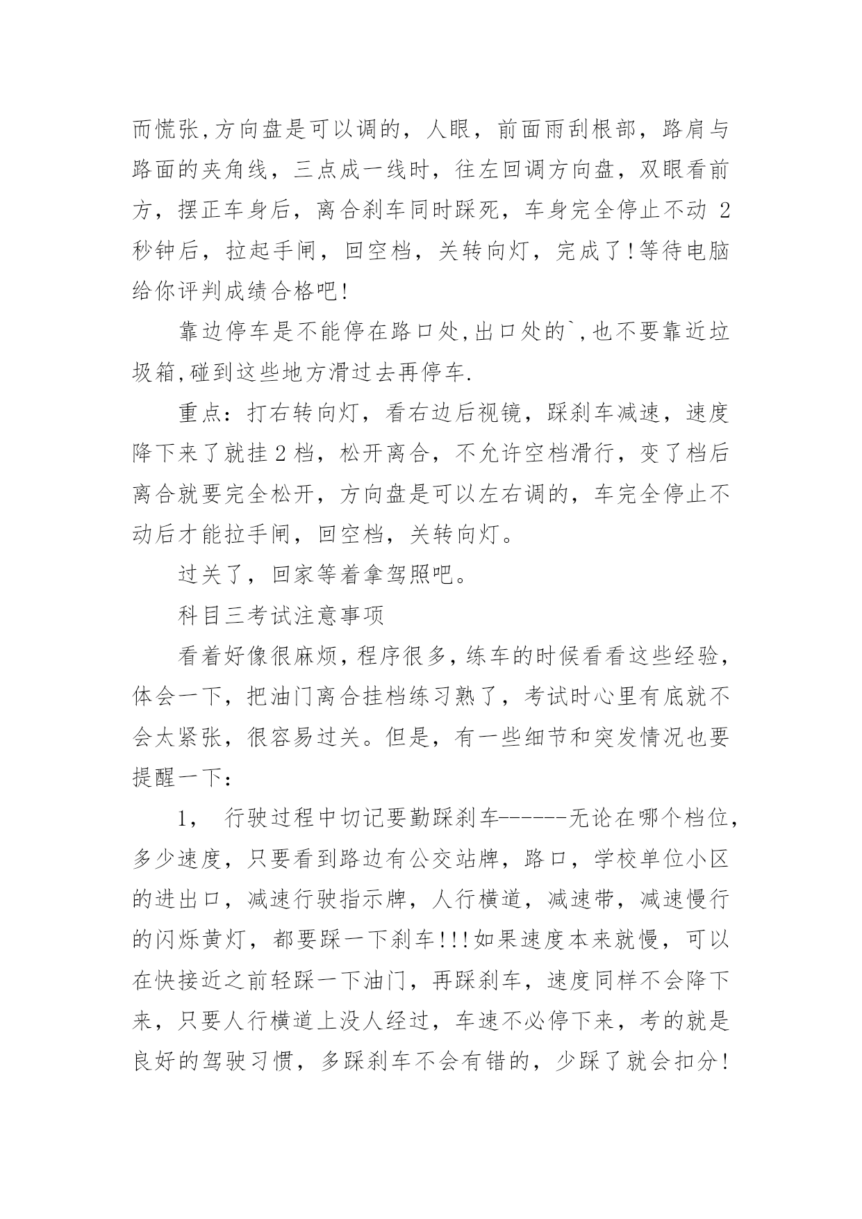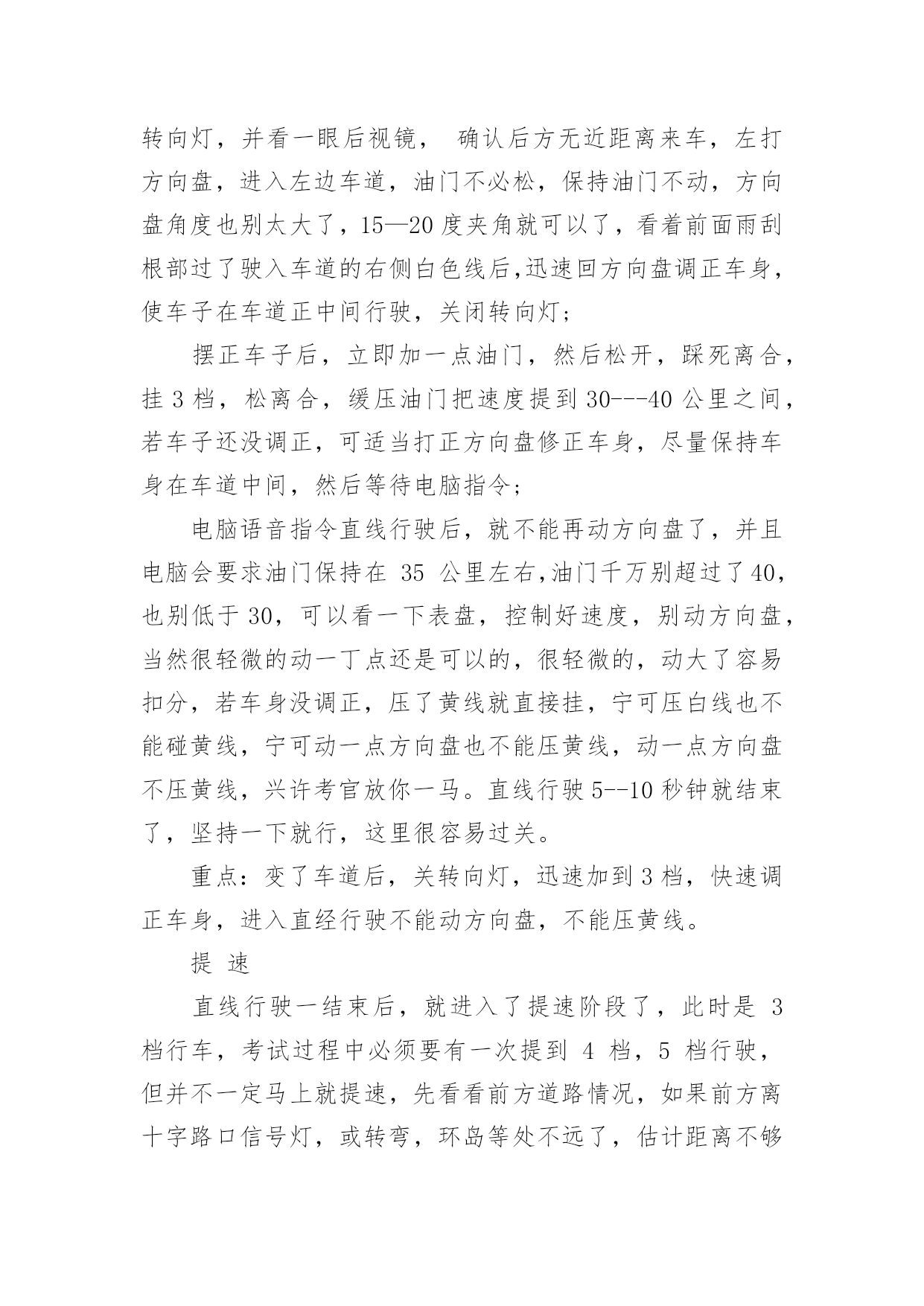 科目三考试技巧及细节科目三考试技巧及细节科目三,是机动车驾驶人考试中道路驾驶技能和安全文明驾驶常识考试科目的简称。下面是小编分享的科目三考试技巧及细节,欢迎大家参考!一,上车科目三考试上车前无论是哪个座位,从必须从车头前方绕到驾驶位。车子启动前必须要检查车况,从车头前方绕过,表示你完成了这个步骤,如果没从车前经过,就要扣分。重点:车头前方经过二,调整打开车门上车前,记住先喊:“报告考官,学员XXX请求考试!”,声音大一点,不用管考官听没听见,他只要示意你上车了,你就打开车门,坐到位子上,调整好座椅,系上安全带,并看看表盘上灯光有没有都关掉,防止你前面考试的人挂了忘了关车灯!考官会让你录指纹,录完后,先深呼吸一下让自已别太紧张,接下来就会进行模拟夜间灯光的考试。重点:喊报告,调整座椅,系安全带,看灯光是否都关闭三,灯光录完指纹后,开始灯光考试,按照电脑的语音指令,5秒内做出正确的灯光操作,灯光其实很简单,考试有两次机会,如果灯光错了一次,就等于说车子没动你就挂了一次,如果灯光过关,那你后面还有两次考试机会,因为灯光错了而挂的,大有人在,估计多半是因为紧张,灯光很简单,只会用到五种灯光:近光灯,远光灯,示宽灯,应急灯,雾灯。听清电脑语音指令就行。科目二灯光考试详细如下:夜间在没有路灯,照明不良条件下行驶----近光灯夜间同方向近距离跟车行驶----近光灯夜间在较窄路与非机动车会车----近光灯夜间与机动车会车----近光灯请将前照灯变换远光----远光灯雾天行驶----开雾灯,并开应急灯夜间在道路上发生故障,妨碍交通又难以移动----开示宽灯,并开应急灯夜间通过急弯,坡路,拱桥,人行横道,或没有交通信号灯控制的路口---交替使用远近光灯(拨两下即可)请关闭所有灯光----先关应急灯,后关雾灯或示宽灯,最后关前照灯模拟夜间考试完成请关闭所有灯光,请起步继续完成考试。(打开左转向灯,免得一紧张忘了)四,起步接下来就要起步,这里比较重要,很多人在这里挂了。不要慌,一步一步来:灯光一结束后,就打开左转向灯,离合踩死,挂1档,油门稍稍压一丁点,看表盘上指针到了10---20之间就行了,保持稳着油门不要动,离合轻轻松开一点点,发现车子略往前拱,稳住油门和离合,右手握住手闸并按住前端按钮,先别放下!要把头往左扭一下,看一下左后视镜里的情况,如果情况良好,头摆正看前方,放下手闸,离合再松一点,车子起动后,离合完全松开,关掉左转向灯,加一点油门,松开油门,踩死离合,挂2档,松离合,轻压油门,保持车速20公里左右的慢慢行,等着电脑发出指令。此时你已经成功一半了,车子没熄火,心情完全放松吧。重点:打开左转向灯,离合松一点车子略往前拱时稳一下离合,放下手闸前一定要把头转向左边看一下后视镜,切记!!!如果头没动,表示你没看后视镜,也别紧盯着看,看一眼后就转向前方,看后视镜不能超过3秒,可重复看,手闸放下后2秒钟车子就必须要动,这点不用担心,此时你的离合是略松了的,就算你油门没控制好,离合松只要不是一下猛地松开,车子就会动的,有待速;离合如果猛地一下全松开,也许会造成熄火.容易挂的地方:没开左转向灯,手闸放下之前没看后视镜五,变道+直线行驶电脑会提示前方请变更车道,电脑发出指令后5秒钟内必须有反应!所以一听到变更车道的指令后,立即打开左转向灯,并看一眼后视镜,确认后方无近距离来车,左打方向盘,进入左边车道,油门不必松,保持油门不动,方向盘角度也别太大了,15—20度夹角就可以了,看着前面雨刮根部过了驶入车道的右侧白色线后,迅速回方向盘调正车身,使车子在车道正中间行驶,关闭转向灯;摆正车子后,立即加一点油门,然后松开,踩死离合,挂3档,松离合,缓压油门把速度提到30---40公里之间,若车子还没调正,可适当打正方向盘修正车身,尽量保持车身在车道中间,然后等待电脑指令;电脑语音指令直线行驶后,就不能再动方向盘了,并且电脑会要求油门保持在35公里左右,油门千万别超过了40,也别低于30,可以看一下表盘,控制好速度,别动方向盘,当然很轻微的动一丁点还是可以的,很轻微的,动大了容易扣分,若车身没调正,压了黄线就直接挂,宁可压白线也不能碰黄线,宁可动一点方向盘也不能压黄线,动一点方向盘不压黄线,兴许考官放你一马。直线行驶5--10秒钟就结束了,坚持一下就行,这里很容易过关。重点:变了车道后,关转向灯,迅速加到3档,快速调正车身,进入直经行驶不能动方向盘,不能压黄线。提速直线行驶一结束后,就进入了提速阶段了,此时是3档行车,考试过程中必须要有一次提到4档,5档行驶,但并不一定马上就提速,先看看前方道路情况,如果前方离十字路口信号灯,或转弯,环岛等处不远了,估计距离不够了,就先不用加档,也加不到5档,加了反而又要减档,没必要把自已搞的手忙脚乱容易出错,离考试结束过关及格