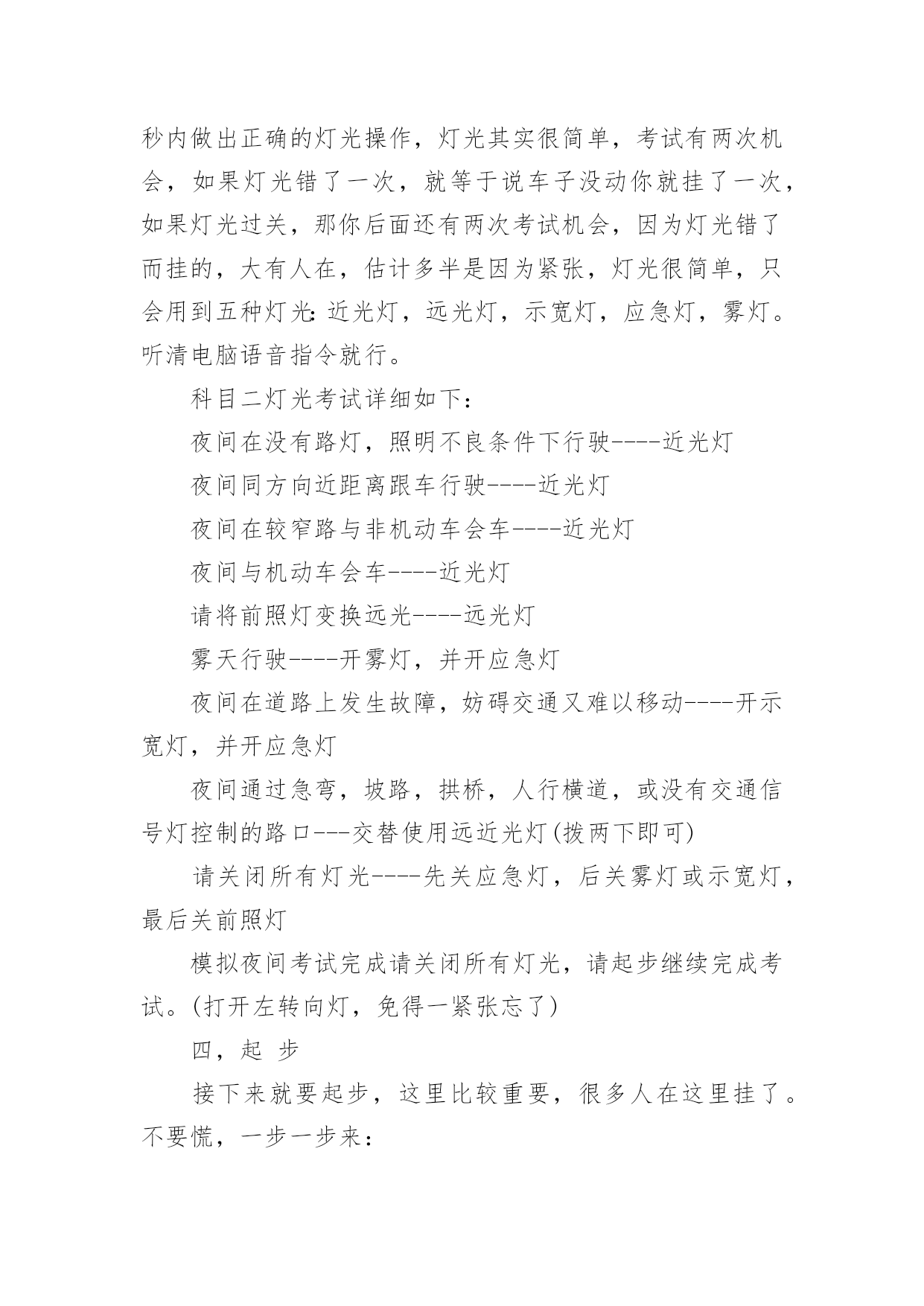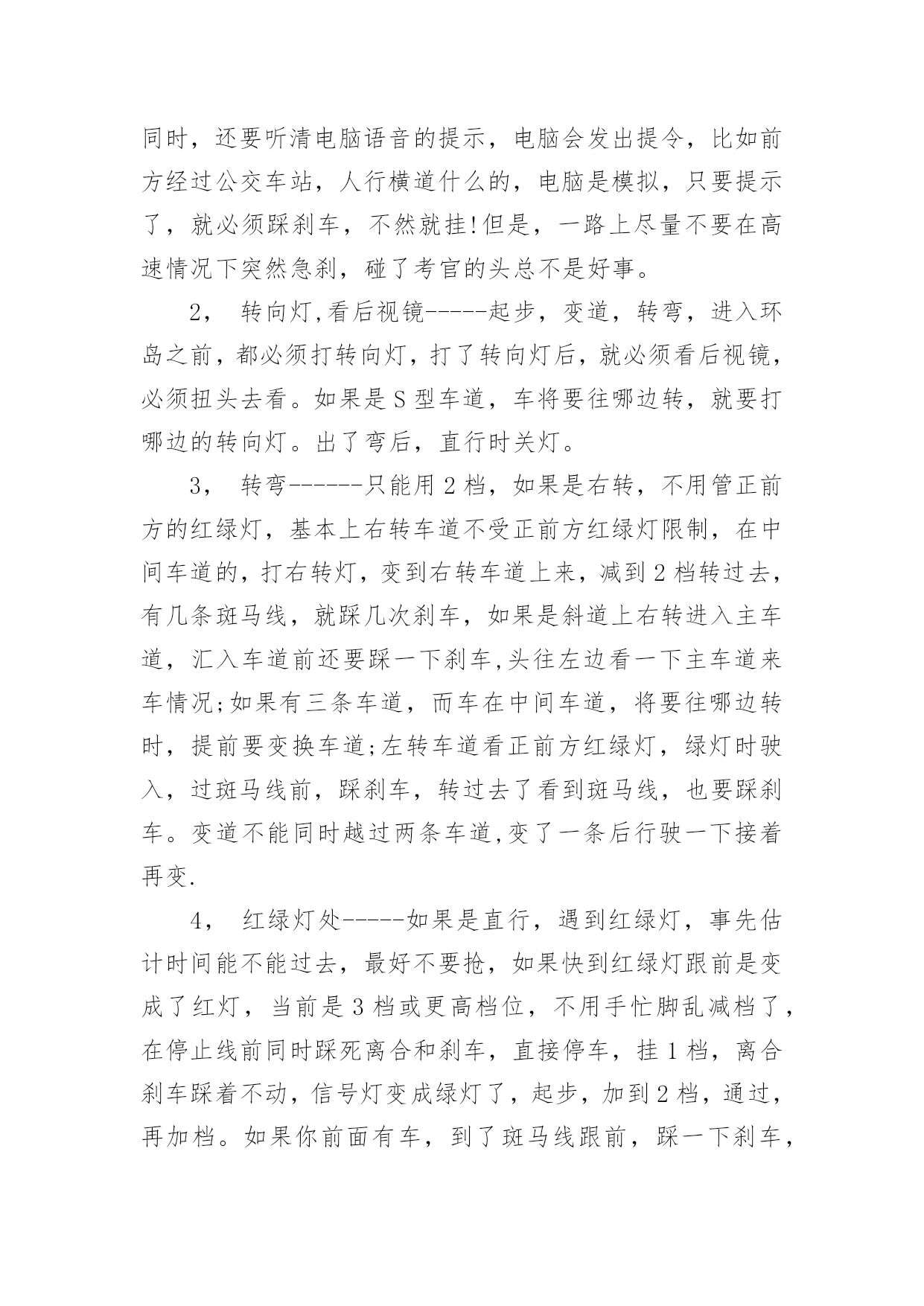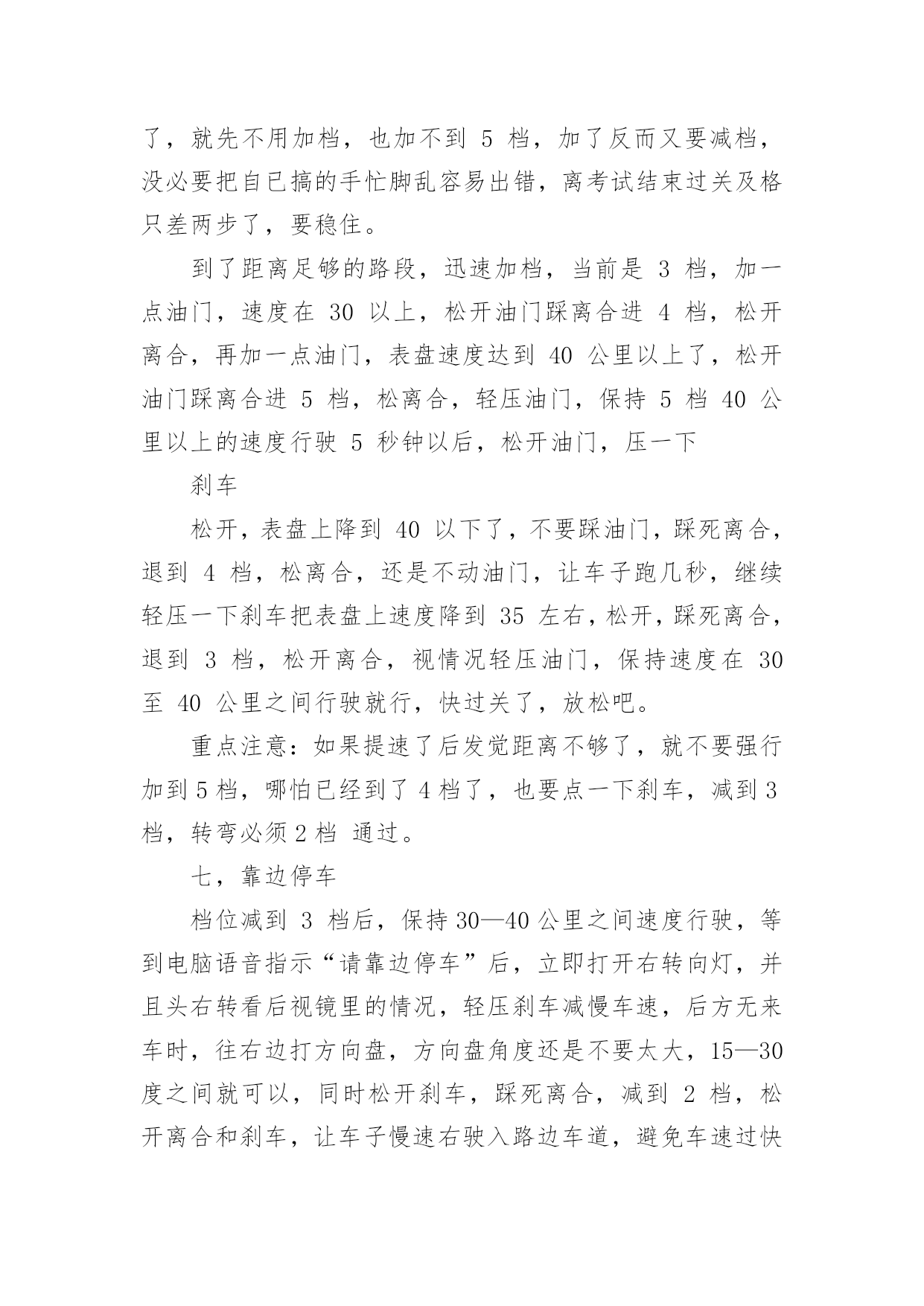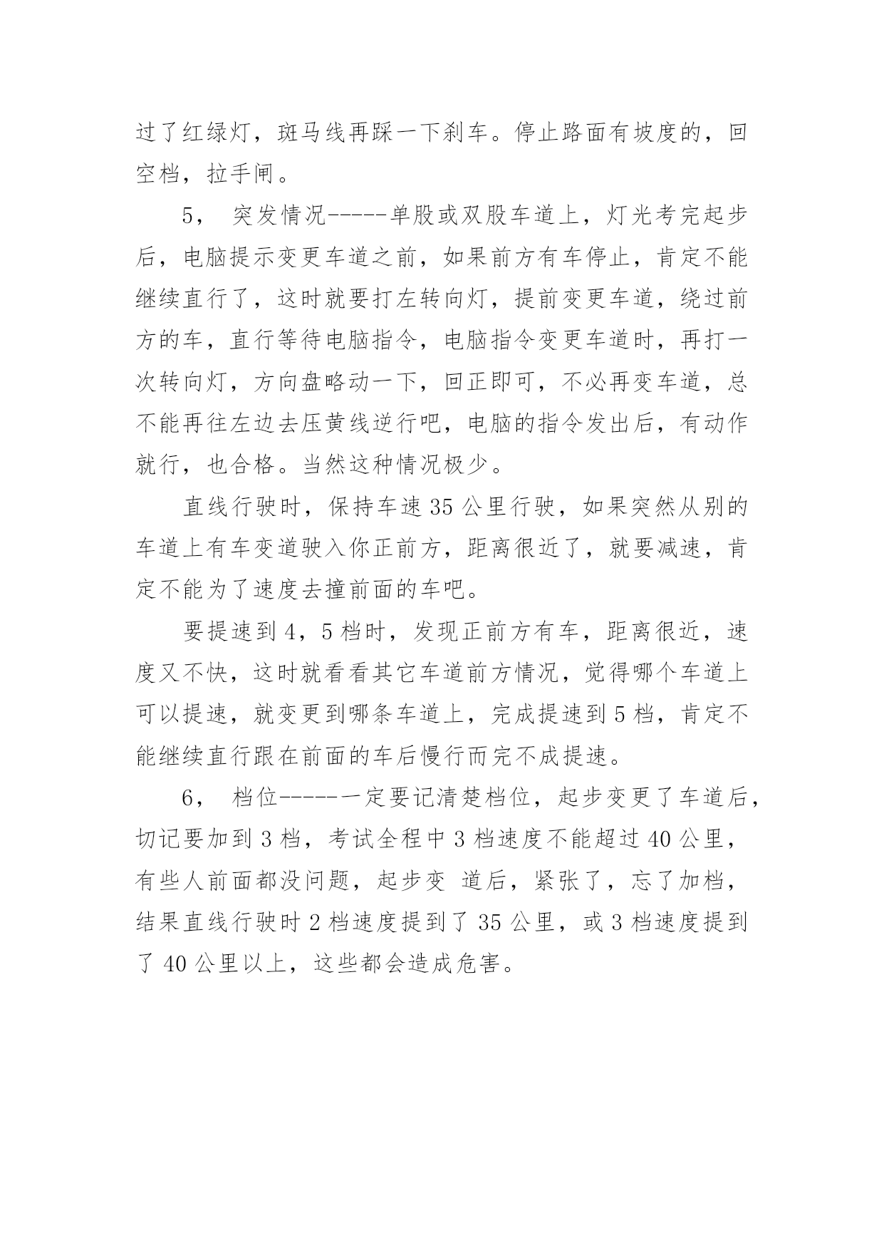 科目三考试技巧及细节科目三考试技巧及细节科目三,是机动车驾驶人考试中道路驾驶技能和安全文明驾驶常识考试科目的简称。下面是小编分享的科目三考试技巧及细节,欢迎大家参考!一,上车科目三考试上车前无论是哪个座位,从必须从车头前方绕到驾驶位。车子启动前必须要检查车况,从车头前方绕过,表示你完成了这个步骤,如果没从车前经过,就要扣分。重点:车头前方经过二,调整打开车门上车前,记住先喊:“报告考官,学员XXX请求考试!”,声音大一点,不用管考官听没听见,他只要示意你上车了,你就打开车门,坐到位子上,调整好座椅,系上安全带,并看看表盘上灯光有没有都关掉,防止你前面考试的人挂了忘了关车灯!考官会让你录指纹,录完后,先深呼吸一下让自已别太紧张,接下来就会进行模拟夜间灯光的考试。重点:喊报告,调整座椅,系安全带,看灯光是否都关闭三,灯光录完指纹后,开始灯光考试,按照电脑的语音指令,5秒内做出正确的灯光操作,灯光其实很简单,考试有两次机会,如果灯光错了一次,就等于说车子没动你就挂了一次,如果灯光过关,那你后面还有两次考试机会,因为灯光错了而挂的,大有人在,估计多半是因为紧张,灯光很简单,只会用到五种灯光:近光灯,远光灯,示宽灯,应急灯,雾灯。听清电脑语音指令就行。科目二灯光考试详细如下:夜间在没有路灯,照明不良条件下行驶----近光灯夜间同方向近距离跟车行驶----近光灯夜间在较窄路与非机动车会车----近光灯夜间与机动车会车----近光灯请将前照灯变换远光----远光灯雾天行驶----开雾灯,并开应急灯夜间在道路上发生故障,妨碍交通又难以移动----开示宽灯,并开应急灯夜间通过急弯,坡路,拱桥,人行横道,或没有交通信号灯控制的路口---交替使用远近光灯(拨两下即可)请关闭所有灯光----先关应急灯,后关雾灯或示宽灯,最后关前照灯模拟夜间考试完成请关闭所有灯光,请起步继续完成考试。(打开左转向灯,免得一紧张忘了)四,起步接下来就要起步,这里比较重要,很多人在这里挂了。不要慌,一步一步来:灯光一结束后,就打开左转向灯,离合踩死,挂1档,油门稍稍压一丁点,看表盘上指针到了10---20之间就行了,保持稳着油门不要动,离合轻轻松开一点点,发现车子略往前拱,稳住油门和离合,右手握住手闸并按住前端按钮,先别放下!要把头往左扭一下,看一下左后视镜里的情况,如果情况良好,头摆正看前方,放下手闸,离合再松一点,车子起动后,离合完全松开,关掉左转向灯,加一点油门,松开油门,踩死离合,挂2档,松离合,轻压油门,保持车速20公里左右的慢慢行,等着电脑发出指令。此时你已经成功一半了,车子没熄火,心情完全放松吧。重点:打开左转向灯,离合松一点车子略往前拱时稳一下离合,放下手闸前一定要把头转向左边看一下后视镜,切记!!!如果头没动,表示你没看后视镜,也别紧盯着看,看一眼后就转向前方,看后视镜不能超过3秒,可重复看,手闸放下后2秒钟车子就必须要动,这点不用担心,此时你的离合是略松了的,就算你油门没控制好,离合松只要不是一下猛地松开,车子就会动的,有待速;离合如果猛地一下全松开,也许会造成熄火.容易挂的地方:没开左转向灯,手闸放下之前没看后视镜五,变道+直线行驶电脑会提示前方请变更车道,电脑发出指令后5秒钟内必须有反应!所以一听到变更车道的指令后,立即打开左转向灯,并看一眼后视镜,确认后方无近距离来车,左打方向盘,进入左边车道,油门不必松,保持油门不动,方向盘角度也别太大了,15—20度夹角就可以了,看着前面雨刮根部过了驶入车道的右侧白色线后,迅速回方向盘调正车身,使车子在车道正中间行驶,关闭转向灯;摆正车子后,立即加一点油门,然后松开,踩死离合,挂3档,松离合,缓压油门把速度提到30---40公里之间,若车子还没调正,可适当打正方向盘修正车身,尽量保持车身在车道中间,然后等待电脑指令;电脑语音指令直线行驶后,就不能再动方向盘了,并且电脑会要求油门保持在35公里左右,油门千万别超过了40,也别低于30,可以看一下表盘,控制好速度,别动方向盘,当然很轻微的动一丁点还是可以的,很轻微的,动大了容易扣分,若车身没调正,压了黄线就直接挂,宁可压白线也不能碰黄线,宁可动一点方向盘也不能压黄线,动一点方向盘不压黄线,兴许考官放你一马。直线行驶5--10秒钟就结束了,坚持一下就行,这里很容易过关。重点:变了车道后,关转向灯,迅速加到3档,快速调正车身,进入直经行驶不能动方向盘,不能压黄线。提速直线行驶一结束后,就进入了提速阶段了,此时是3档行车,考试过程中必须要有一次提到4档,5档行驶,但并不一定马上就提速,先看看前方道路情况,如果前方离十字路口信号灯,或转弯,环岛等处不远了,估计距离不够了,就先不用加档,也加不到5档,加了反而又要减档,没必要把自已搞的手忙脚乱容易出错,离考试结束过关及格
