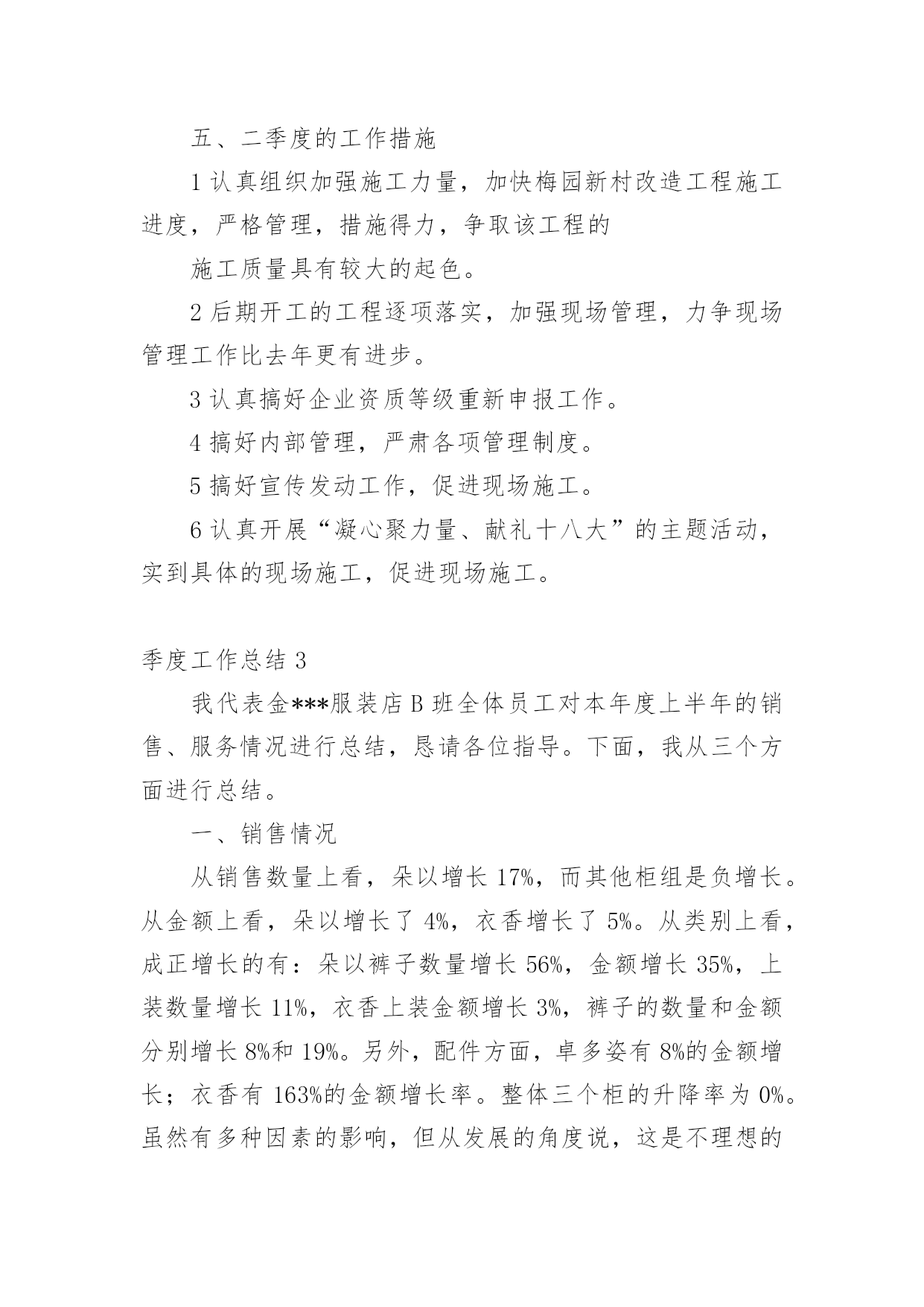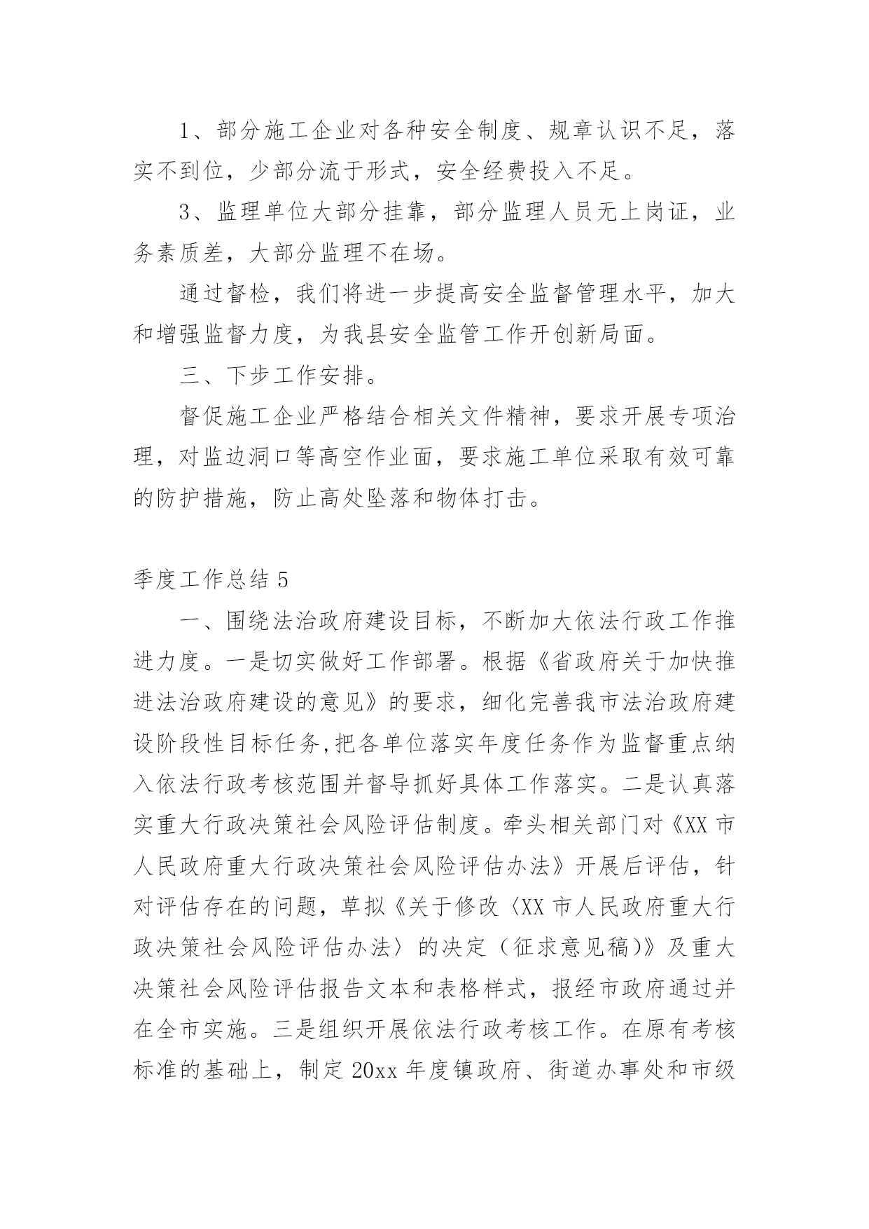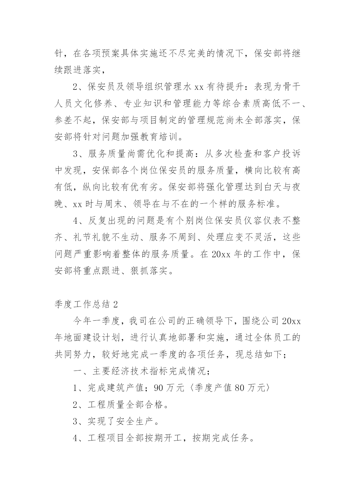 季度工作总结季度工作总结(精选15篇)总结就是对一个时期的学习、工作或其完成情况进行一次全面系统的回顾和分析的书面材料,它可以提升我们发现问题的能力,不如我们来制定一份总结吧。总结一般是怎么写的呢?以下是小编为大家收集的季度工作总结,欢迎大家借鉴与参考,希望对大家有所帮助。季度工作总结1一、发挥优势管理,狠抓基层建设1、优质服务、赢得信赖。公司通过引进新昌品牌管理,强化管理准则,加强管理人员的现场督导和质量检查,逐步完善安全岗位的窗口形象,不断提高自身的优质服务水准,得到了园区业主好评,赢得了业主的信赖,受业主委托物业安全管理部协助公司完成的接待工作上百次,其中xx团2次,全国xx领导3次,知名企业合作会6次,由于接待工作完成出色,安全管理部获得业主优质服务的赞誉。2、预防为主、重点布控在公司总部的关心指导下,项目部通过制定各项安全等项消防预案,贯彻落实防火、防盗等“六防”措施,全年未发生一件意外安全事故。项目经理每天召开部门经理反馈会,通报情况提出要求。安全部安排干部员工勤于巡查、严密防控,在相关部门的配合下,实行群防、群检、群治,以确保园区万无一失。针对特别区域实行重点监控,在自行车场盗窃高发区实行严密布防,抓获盗窃者3人,为业主挽回直接损失数千元。由于完美时空园区安全管理的出色,因此被海淀区评为社会治安综合治理先进单位。3、完善设施、有备无患通过公司领导亲临现场指导,安保部将园区消防预案、设备设施、消防器材检查维护等各项工作,进行了不断的完善。制定园区消防设施设备维修保养计划,使园区消防设施设备不但做到正常运行而且延长使用年限。今年已对园区3656个光电探测器,进行了专业性检测,严格检查消防设施设备,提前对烟感系统报警点不准确进行专业性检测。保障线路畅通、正常使用,对大厅内应急疏散灯、安全出口进行补装和更换。同时对消防器材实行分区管理、检查、维护并落实到人。按照北京市xx及公司要求,组织园区业主进行消防演xx,消防演xx的成功演练,得到了国家相关部门及广大业主的好评。二、严格管理、提升品质,改变观念、创新管理1、按照项目年初制定的安全培训计划,安保部参照行业规范对保安员进行32次专题培训,重点讲解管理素质、服务意识、礼貌待客、专业技能、消防知识、突发事件分析等,通过讲解、点评、交流使保安员在思想认识和日常工作中皆有不同程度的感悟与提升。2、安全管理部按照各月计划对保安员进行岗位培训,对保安一线岗位做好培训工作。做到实际工作培训,分阶段、分内容进行考评,通过培训保安员整体素质提升了、服务水xx提高了、业主满意度提高了,通过培训提高了保安员整体思想素质,服务态度和业务技能。3、在思想工作是一切工作的生命线的方针指引下,结合项目管理服务特点,按照项目部的要求,针对保安部的实际情况,引导保安员与时俱进、提升素质、转变观念。,安保部教育安保人员要有紧迫感、应具有上进心、培养精气神、物业的管理服务不是高科技,没有什么深奥的学问。关键在人的主观能动性和责任心,是对公司的忠诚度和敬业精神、是对管理与服务内涵的`真谛的理解及运用。安保部通过树立优秀标兵,激发大家积极进取,在完]成项目给的管理工作和服务工作的过程中体现自身价值,并感受人生乐趣。通过思想教育工作,提升了保安员思想道德品质,涌现出多个拾金不昧的好保安,受到了业主的书面赞扬。通过工作实践的摸索,安保部还创作出“物业保安员应知应会”的规范准则并上交公司总部在全公司推广,不但使子海理想的每位一线保安员在为业主和客户服务时品质显著提升,而且使其他兄弟项目受益。三、安全管理部通过对xx年工作进行回顾和总结,总结过去、展望未来,整改不足之处并制定新一年的提升服务目标,以利于xx年安全管理部各项工作更好的全面展开。以下几项工作是保安部20xx年的工作重点及提升项:1、我们将始终贯彻落实“安全第一、预防为主”的方针,在各项预案具体实施还不尽完美的情况下,保安部将继续跟进落实,2、保安员及领导组织管理水xx有待提升:表现为骨干人员文化修养、专业知识和管理能力等综合素质高低不一、参差不起,保安部与项目制定的管理规范尚未全部落实,保安部将针对问题加强教育培训。3、服务质量尚需优化和提高:从多次检查和客户投诉中发现,安保部各个岗位保安员的服务质量,横向比较有高有低,纵向比较有优有劣。保安部将强化管理达到白天与夜晚、xx时与周末、领导在与不在的一个样的服务标准。4、反复出现的问题是有个别岗位保安员仪容仪表不整齐、礼节礼貌不生动、服务不周到、处理应变不灵活,这些问题严重影响着整体的服务质量。在20xx年的工作中,保安部将重点跟进、狠抓落实。季度工作总结2今年一季度,我司在公司的正确领导下,围绕公司20xx年地面建设计划,进行认真地部署和实施,通过全体员工的共同努力,较好地完成一季度的各项任务,现总结如