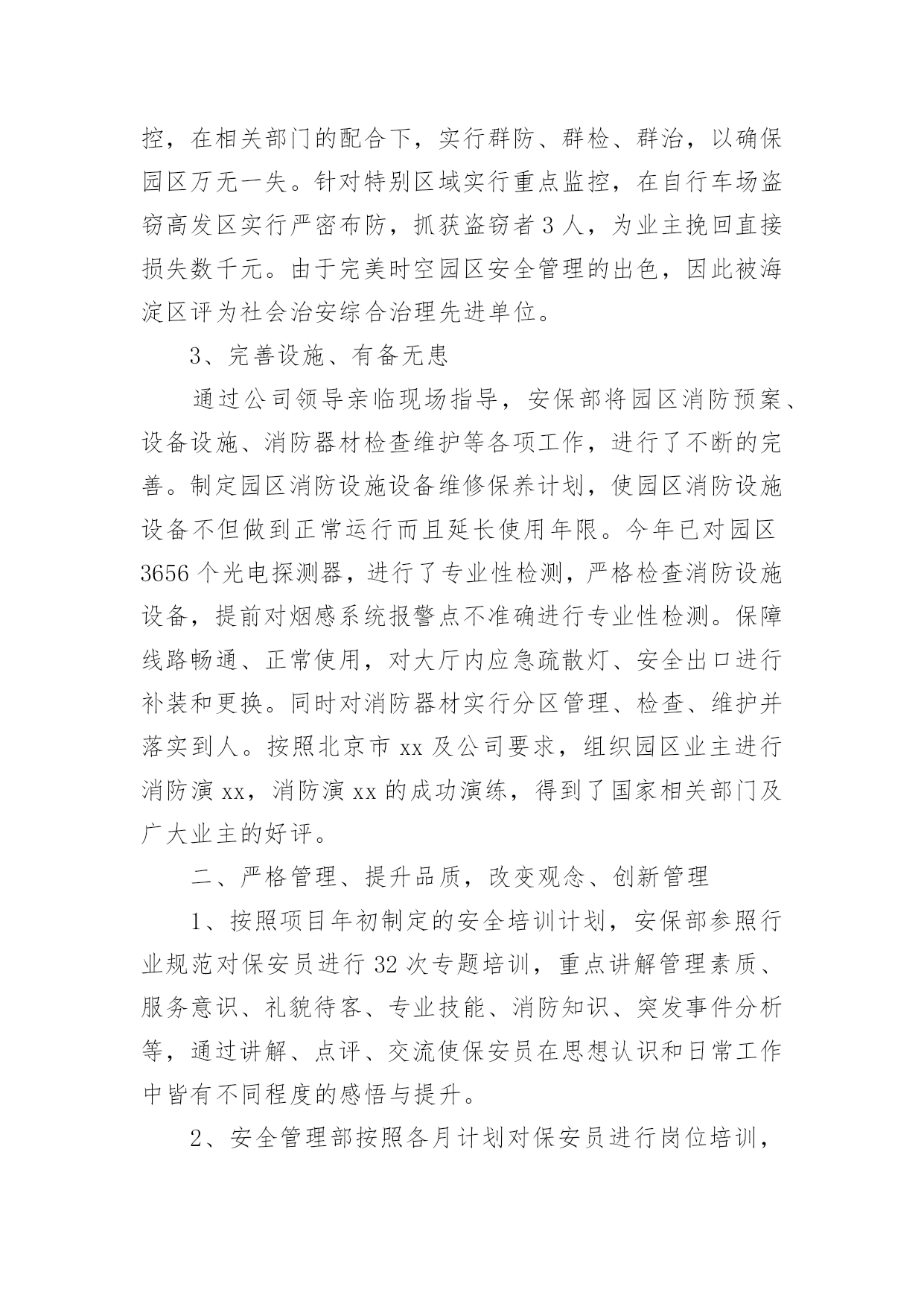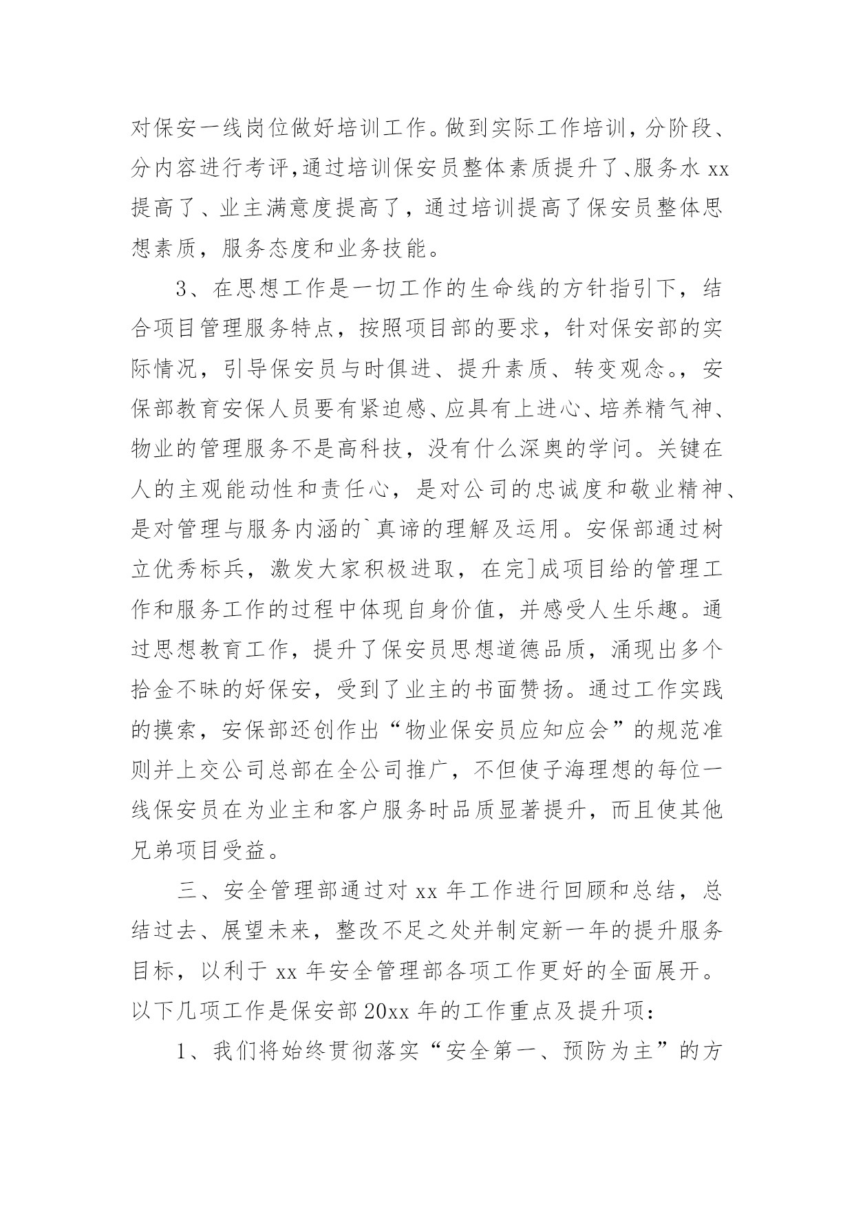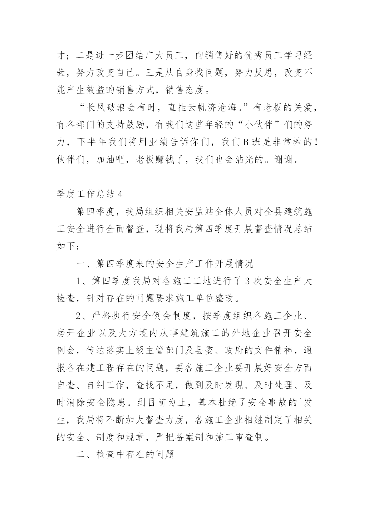 季度工作总结季度工作总结(精选15篇)总结就是对一个时期的学习、工作或其完成情况进行一次全面系统的回顾和分析的书面材料,它可以提升我们发现问题的能力,不如我们来制定一份总结吧。总结一般是怎么写的呢?以下是小编为大家收集的季度工作总结,欢迎大家借鉴与参考,希望对大家有所帮助。季度工作总结1一、发挥优势管理,狠抓基层建设1、优质服务、赢得信赖。公司通过引进新昌品牌管理,强化管理准则,加强管理人员的现场督导和质量检查,逐步完善安全岗位的窗口形象,不断提高自身的优质服务水准,得到了园区业主好评,赢得了业主的信赖,受业主委托物业安全管理部协助公司完成的接待工作上百次,其中xx团2次,全国xx领导3次,知名企业合作会6次,由于接待工作完成出色,安全管理部获得业主优质服务的赞誉。2、预防为主、重点布控在公司总部的关心指导下,项目部通过制定各项安全等项消防预案,贯彻落实防火、防盗等“六防”措施,全年未发生一件意外安全事故。项目经理每天召开部门经理反馈会,通报情况提出要求。安全部安排干部员工勤于巡查、严密防控,在相关部门的配合下,实行群防、群检、群治,以确保园区万无一失。针对特别区域实行重点监控,在自行车场盗窃高发区实行严密布防,抓获盗窃者3人,为业主挽回直接损失数千元。由于完美时空园区安全管理的出色,因此被海淀区评为社会治安综合治理先进单位。3、完善设施、有备无患通过公司领导亲临现场指导,安保部将园区消防预案、设备设施、消防器材检查维护等各项工作,进行了不断的完善。制定园区消防设施设备维修保养计划,使园区消防设施设备不但做到正常运行而且延长使用年限。今年已对园区3656个光电探测器,进行了专业性检测,严格检查消防设施设备,提前对烟感系统报警点不准确进行专业性检测。保障线路畅通、正常使用,对大厅内应急疏散灯、安全出口进行补装和更换。同时对消防器材实行分区管理、检查、维护并落实到人。按照北京市xx及公司要求,组织园区业主进行消防演xx,消防演xx的成功演练,得到了国家相关部门及广大业主的好评。二、严格管理、提升品质,改变观念、创新管理1、按照项目年初制定的安全培训计划,安保部参照行业规范对保安员进行32次专题培训,重点讲解管理素质、服务意识、礼貌待客、专业技能、消防知识、突发事件分析等,通过讲解、点评、交流使保安员在思想认识和日常工作中皆有不同程度的感悟与提升。2、安全管理部按照各月计划对保安员进行岗位培训,对保安一线岗位做好培训工作。做到实际工作培训,分阶段、分内容进行考评,通过培训保安员整体素质提升了、服务水xx提高了、业主满意度提高了,通过培训提高了保安员整体思想素质,服务态度和业务技能。3、在思想工作是一切工作的生命线的方针指引下,结合项目管理服务特点,按照项目部的要求,针对保安部的实际情况,引导保安员与时俱进、提升素质、转变观念。,安保部教育安保人员要有紧迫感、应具有上进心、培养精气神、物业的管理服务不是高科技,没有什么深奥的学问。关键在人的主观能动性和责任心,是对公司的忠诚度和敬业精神、是对管理与服务内涵的`真谛的理解及运用。安保部通过树立优秀标兵,激发大家积极进取,在完]成项目给的管理工作和服务工作的过程中体现自身价值,并感受人生乐趣。通过思想教育工作,提升了保安员思想道德品质,涌现出多个拾金不昧的好保安,受到了业主的书面赞扬。通过工作实践的摸索,安保部还创作出“物业保安员应知应会”的规范准则并上交公司总部在全公司推广,不但使子海理想的每位一线保安员在为业主和客户服务时品质显著提升,而且使其他兄弟项目受益。三、安全管理部通过对xx年工作进行回顾和总结,总结过去、展望未来,整改不足之处并制定新一年的提升服务目标,以利于xx年安全管理部各项工作更好的全面展开。以下几项工作是保安部20xx年的工作重点及提升项:1、我们将始终贯彻落实“安全第一、预防为主”的方针,在各项预案具体实施还不尽完美的情况下,保安部将继续跟进落实,2、保安员及领导组织管理水xx有待提升:表现为骨干人员文化修养、专业知识和管理能力等综合素质高低不一、参差不起,保安部与项目制定的管理规范尚未全部落实,保安部将针对问题加强教育培训。3、服务质量尚需优化和提高:从多次检查和客户投诉中发现,安保部各个岗位保安员的服务质量,横向比较有高有低,纵向比较有优有劣。保安部将强化管理达到白天与夜晚、xx时与周末、领导在与不在的一个样的服务标准。4、反复出现的问题是有个别岗位保安员仪容仪表不整齐、礼节礼貌不生动、服务不周到、处理应变不灵活,这些问题严重影响着整体的服务质量。在20xx年的工作中,保安部将重点跟进、狠抓落实。季度工作总结2今年一季度,我司在公司的正确领导下,围绕公司20xx年地面建设计划,进行认真地部署和实施,通过全体员工的共同努力,较好地完成一季度的各项任务,现总结如