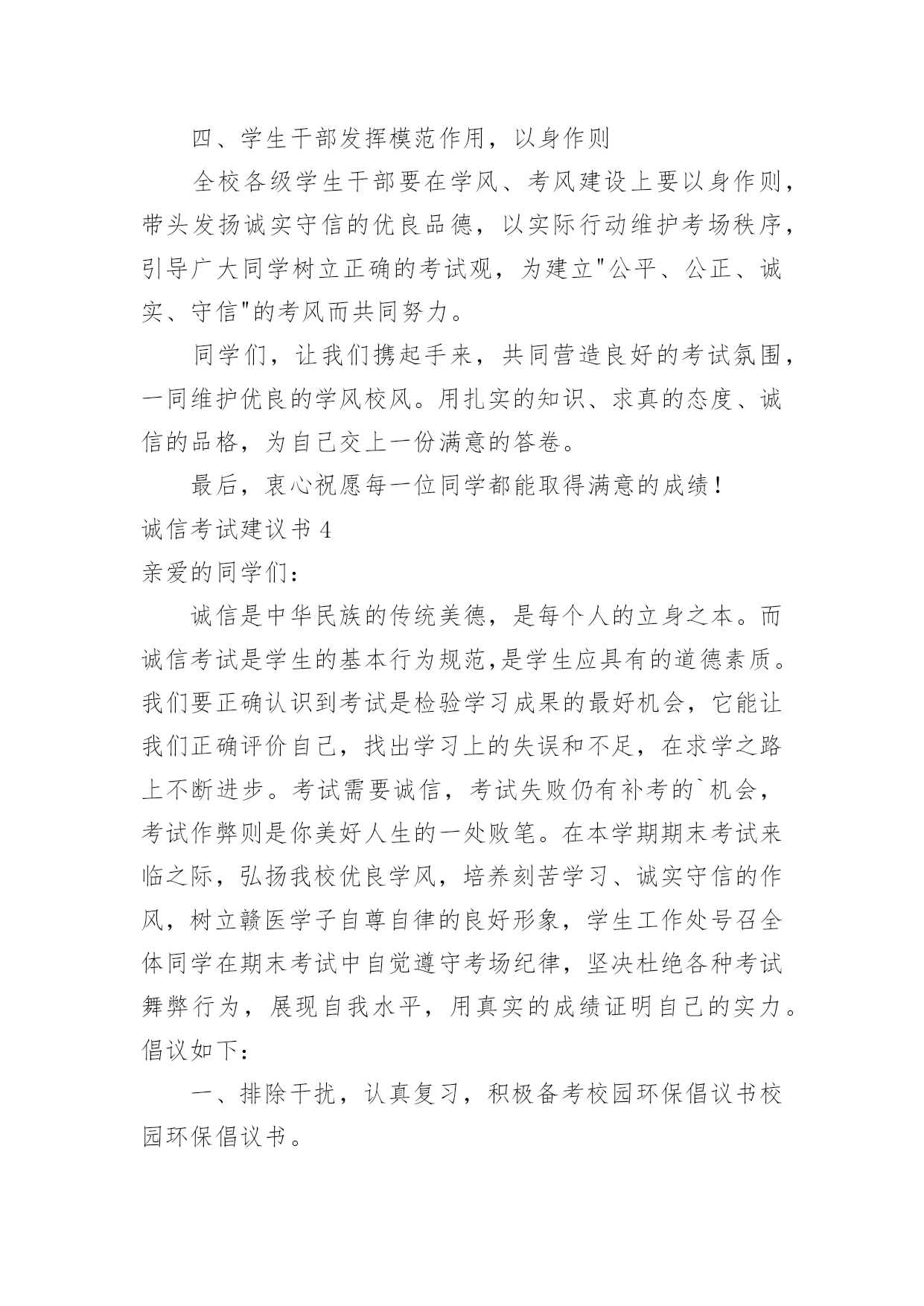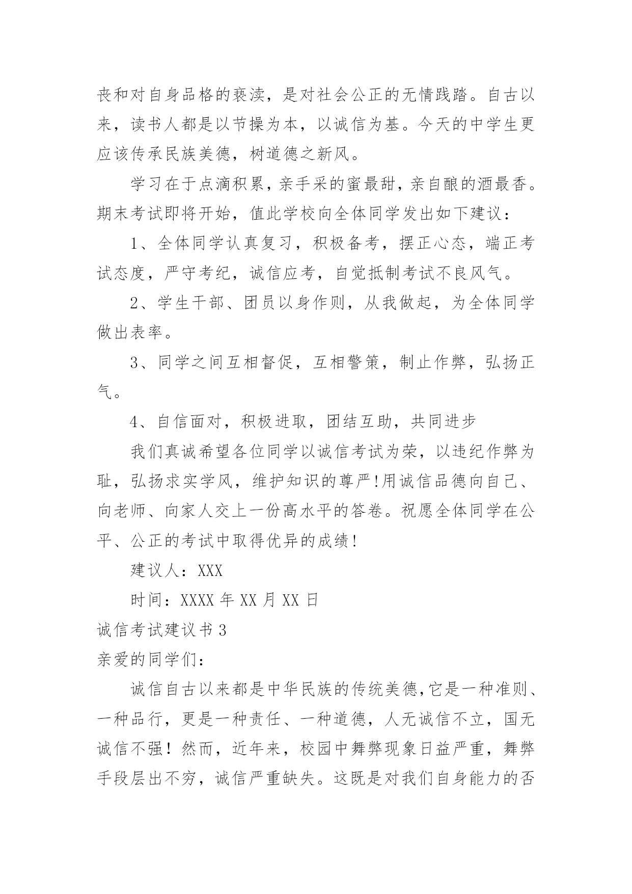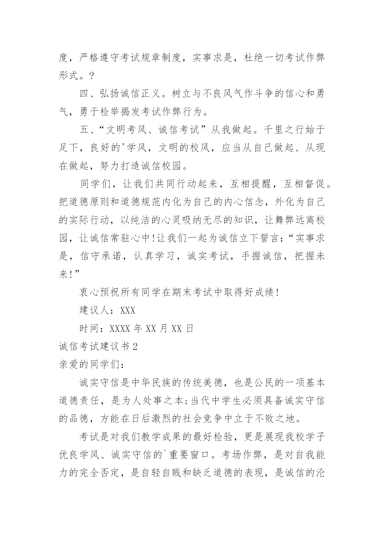 诚信考试建议书诚信考试建议书在充满活力,日益开放的今天,越来越多人会去使用建议书,当建议书是面对领导和有关部门时,可以中肯地提出自己对对方工作的意见和自己的建议。那么问题来了,到底应如何写一份恰当的建议书呢?下面是小编精心整理的诚信考试建议书,欢迎大家借鉴与参考,希望对大家有所帮助。诚信考试建议书1青年朋友们,同志们:诚实守信自古以来就是中华民族的优良传统,也是公民的基本道德要求之一。严谨求实的求学态度更是商务的光荣传统和立学之本,也是我们诚信作风最直接的体现。本学期期末考试即将开始,我们要面临的既是一次学习成果的检阅,更是一场道德与诚信的考验。在此,院团委特别向广大同学发出以下建议:一、排除外界干扰,正确认识考试对评价自己的重要性。充分利用一切时间,认真复习,满怀信心地迎接考试。二、提高自身修养,做一名诚信学生。请同学们切记:“分数诚可贵,奖励价更高,若为诚信故,两者皆可抛”。我们要以诚信的态度对待每一场考试,考出真实水平。三、在考试过程中尊重监考老师,端正学习与考试的态度,严格遵守考试规章制度,实事求是,杜绝一切考试作弊形式。?四、弘扬诚信正义。树立与不良风气作斗争的信心和勇气,勇于检举揭发考试作弊行为。五、“文明考风、诚信考试”从我做起。千里之行始于足下,良好的'学风,文明的校风,应当从自己做起、从现在做起,努力打造诚信校园。同学们,让我们共同行动起来,互相提醒,互相督促。把道德原则和道德规范内化为自己的内心信念,外化为自己的实际行动,以纯洁的心灵吸纳无尽的知识,让舞弊远离校园,让诚信常驻心中!让我们一起为诚信立下誓言:“实事求是,信守承诺,认真学习,诚实考试,手握诚信,把握未来!”衷心预祝所有同学在期末考试中取得好成绩!建议人:XXX时间:XXXX年XX月XX日诚信考试建议书2亲爱的同学们:诚实守信是中华民族的传统美德,也是公民的一项基本道德责任,是为人处事之本;当代中学生必须具备诚实守信的品德,方能在日后激烈的社会竞争中立于不败之地。考试是对我们教学成果的最好检验,更是展现我校学子优良学风、诚实守信的`重要窗口。考场作弊,是对自我能力的完全否定,是自轻自贱和缺乏道德的表现,是诚信的沦丧和对自身品格的亵渎,是对社会公正的无情践踏。自古以来,读书人都是以节操为本,以诚信为基。今天的中学生更应该传承民族美德,树道德之新风。学习在于点滴积累,亲手采的蜜最甜,亲自酿的酒最香。期末考试即将开始,值此学校向全体同学发出如下建议:1、全体同学认真复习,积极备考,摆正心态,端正考试态度,严守考纪,诚信应考,自觉抵制考试不良风气。2、学生干部、团员以身作则,从我做起,为全体同学做出表率。3、同学之间互相督促,互相警策,制止作弊,弘扬正气。4、自信面对,积极进取,团结互助,共同进步我们真诚希望各位同学以诚信考试为荣,以违纪作弊为耻,弘扬求实学风,维护知识的尊严!用诚信品德向自己、向老师、向家人交上一份高水平的答卷。祝愿全体同学在公平、公正的考试中取得优异的成绩!建议人:XXX时间:XXXX年XX月XX日诚信考试建议书3亲爱的同学们:诚信自古以来都是中华民族的传统美德,它是一种准则、一种品行,更是一种责任、一种道德,人无诚信不立,国无诚信不强!然而,近年来,校园中舞弊现象日益严重,舞弊手段层出不穷,诚信严重缺失。这既是对我们自身能力的否定和蔑视,也是对我校良好学风、校风的亵渎。大学生作为祖国的脊梁、民族的未来,是精神文明的传播者,是社会诚信的倡导者,在推广诚信,发扬美德方面理应做好表率作用。因此,在英语四六级考试及期末考试临近之际,为号召同学们发扬诚信美德,创建良好的学风、校风,为考试创造一个公平公正、和谐有序的环境,校团委、校学生会特向全校同学发出如下倡议:一、提高自身修养,端正考试态度考试不仅是对我们能力的一次检验,也是对自身素质的一次考验。树立社会主义道德新风尚,加强自身思想道德修养,是一名合格的大学生义不容辞的责任。只有加强自身素养,诚实做人、踏实做事,端正考试态度,严肃对待考试,才能真正地检验自己的'水平,提高自己的能力,才能在以后的竞争中立于不败之地。二、认真复习,积极备考成功是留给有准备的人的,作弊不是考试得胜之道,只有真正的武装自己,用自己实际的能力去对待考试,才能取得最终的胜利。同学们应抓紧时间,认真复习,用积极的心态去对待考试。三、文明考风,端正考纪同学们既要自律,严格遵守考场纪律,尊重监考老师,服从管理,又要勇于检举和揭发其他同学的作弊行为,大胆同违纪行为作斗争,用自己的实际行动自觉抵制一切作弊行为,共同营造公平公正的考试氛围。四、学生干部发挥模范作用,以身作则全校各级学生干部要在学风、考风建设上要以身作则,带头发扬诚实守信的优良品德,以实际行动维护考场秩序,引导广大同学树立正确的考试观,为建立"公平、公正、诚实、
