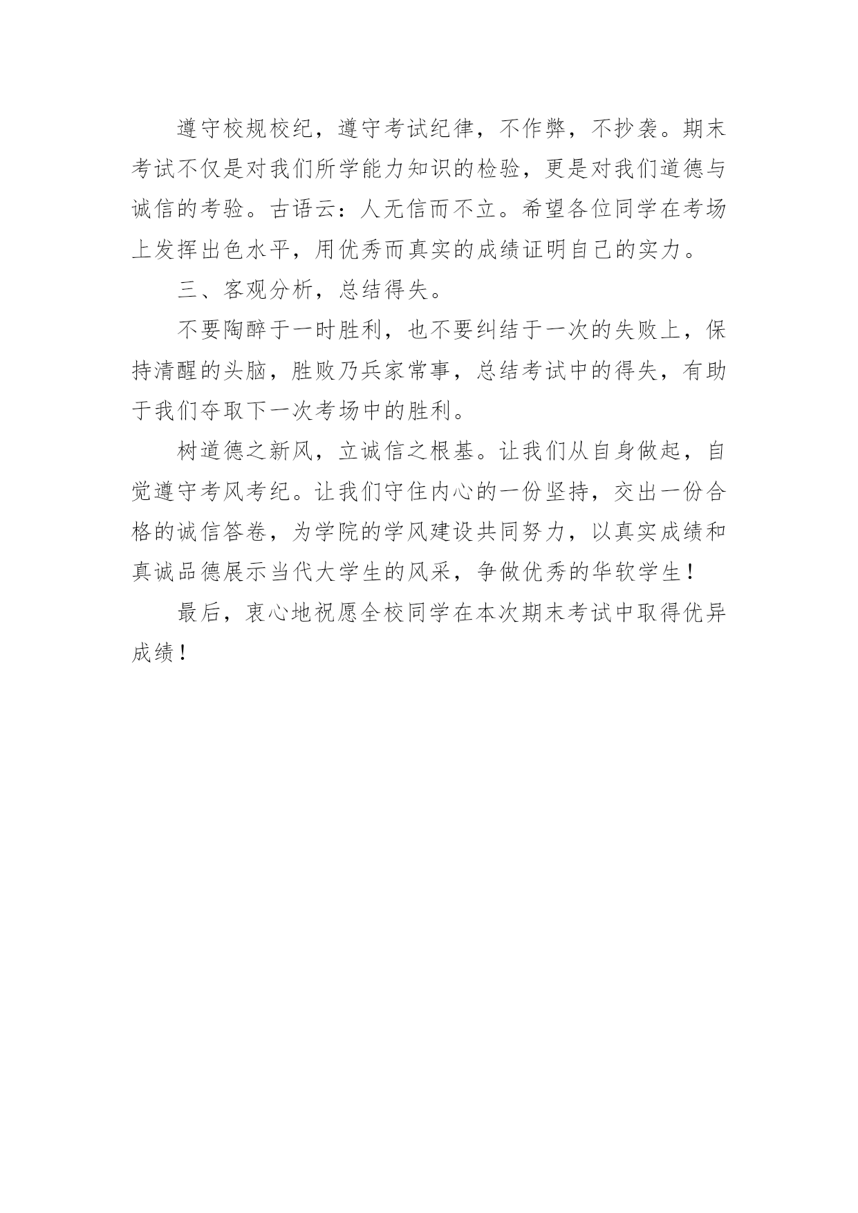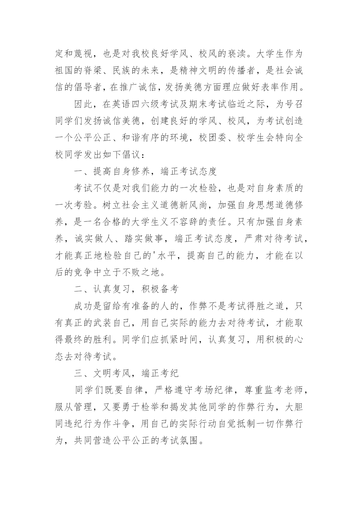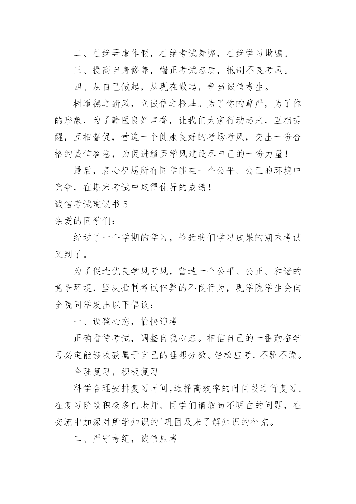 诚信考试建议书诚信考试建议书在充满活力,日益开放的今天,越来越多人会去使用建议书,当建议书是面对领导和有关部门时,可以中肯地提出自己对对方工作的意见和自己的建议。那么问题来了,到底应如何写一份恰当的建议书呢?下面是小编精心整理的诚信考试建议书,欢迎大家借鉴与参考,希望对大家有所帮助。诚信考试建议书1青年朋友们,同志们:诚实守信自古以来就是中华民族的优良传统,也是公民的基本道德要求之一。严谨求实的求学态度更是商务的光荣传统和立学之本,也是我们诚信作风最直接的体现。本学期期末考试即将开始,我们要面临的既是一次学习成果的检阅,更是一场道德与诚信的考验。在此,院团委特别向广大同学发出以下建议:一、排除外界干扰,正确认识考试对评价自己的重要性。充分利用一切时间,认真复习,满怀信心地迎接考试。二、提高自身修养,做一名诚信学生。请同学们切记:“分数诚可贵,奖励价更高,若为诚信故,两者皆可抛”。我们要以诚信的态度对待每一场考试,考出真实水平。三、在考试过程中尊重监考老师,端正学习与考试的态度,严格遵守考试规章制度,实事求是,杜绝一切考试作弊形式。?四、弘扬诚信正义。树立与不良风气作斗争的信心和勇气,勇于检举揭发考试作弊行为。五、“文明考风、诚信考试”从我做起。千里之行始于足下,良好的'学风,文明的校风,应当从自己做起、从现在做起,努力打造诚信校园。同学们,让我们共同行动起来,互相提醒,互相督促。把道德原则和道德规范内化为自己的内心信念,外化为自己的实际行动,以纯洁的心灵吸纳无尽的知识,让舞弊远离校园,让诚信常驻心中!让我们一起为诚信立下誓言:“实事求是,信守承诺,认真学习,诚实考试,手握诚信,把握未来!”衷心预祝所有同学在期末考试中取得好成绩!建议人:XXX时间:XXXX年XX月XX日诚信考试建议书2亲爱的同学们:诚实守信是中华民族的传统美德,也是公民的一项基本道德责任,是为人处事之本;当代中学生必须具备诚实守信的品德,方能在日后激烈的社会竞争中立于不败之地。考试是对我们教学成果的最好检验,更是展现我校学子优良学风、诚实守信的`重要窗口。考场作弊,是对自我能力的完全否定,是自轻自贱和缺乏道德的表现,是诚信的沦丧和对自身品格的亵渎,是对社会公正的无情践踏。自古以来,读书人都是以节操为本,以诚信为基。今天的中学生更应该传承民族美德,树道德之新风。学习在于点滴积累,亲手采的蜜最甜,亲自酿的酒最香。期末考试即将开始,值此学校向全体同学发出如下建议:1、全体同学认真复习,积极备考,摆正心态,端正考试态度,严守考纪,诚信应考,自觉抵制考试不良风气。2、学生干部、团员以身作则,从我做起,为全体同学做出表率。3、同学之间互相督促,互相警策,制止作弊,弘扬正气。4、自信面对,积极进取,团结互助,共同进步我们真诚希望各位同学以诚信考试为荣,以违纪作弊为耻,弘扬求实学风,维护知识的尊严!用诚信品德向自己、向老师、向家人交上一份高水平的答卷。祝愿全体同学在公平、公正的考试中取得优异的成绩!建议人:XXX时间:XXXX年XX月XX日诚信考试建议书3亲爱的同学们:诚信自古以来都是中华民族的传统美德,它是一种准则、一种品行,更是一种责任、一种道德,人无诚信不立,国无诚信不强!然而,近年来,校园中舞弊现象日益严重,舞弊手段层出不穷,诚信严重缺失。这既是对我们自身能力的否定和蔑视,也是对我校良好学风、校风的亵渎。大学生作为祖国的脊梁、民族的未来,是精神文明的传播者,是社会诚信的倡导者,在推广诚信,发扬美德方面理应做好表率作用。因此,在英语四六级考试及期末考试临近之际,为号召同学们发扬诚信美德,创建良好的学风、校风,为考试创造一个公平公正、和谐有序的环境,校团委、校学生会特向全校同学发出如下倡议:一、提高自身修养,端正考试态度考试不仅是对我们能力的一次检验,也是对自身素质的一次考验。树立社会主义道德新风尚,加强自身思想道德修养,是一名合格的大学生义不容辞的责任。只有加强自身素养,诚实做人、踏实做事,端正考试态度,严肃对待考试,才能真正地检验自己的'水平,提高自己的能力,才能在以后的竞争中立于不败之地。二、认真复习,积极备考成功是留给有准备的人的,作弊不是考试得胜之道,只有真正的武装自己,用自己实际的能力去对待考试,才能取得最终的胜利。同学们应抓紧时间,认真复习,用积极的心态去对待考试。三、文明考风,端正考纪同学们既要自律,严格遵守考场纪律,尊重监考老师,服从管理,又要勇于检举和揭发其他同学的作弊行为,大胆同违纪行为作斗争,用自己的实际行动自觉抵制一切作弊行为,共同营造公平公正的考试氛围。四、学生干部发挥模范作用,以身作则全校各级学生干部要在学风、考风建设上要以身作则,带头发扬诚实守信的优良品德,以实际行动维护考场秩序,引导广大同学树立正确的考试观,为建立"公平、公正、诚实、
