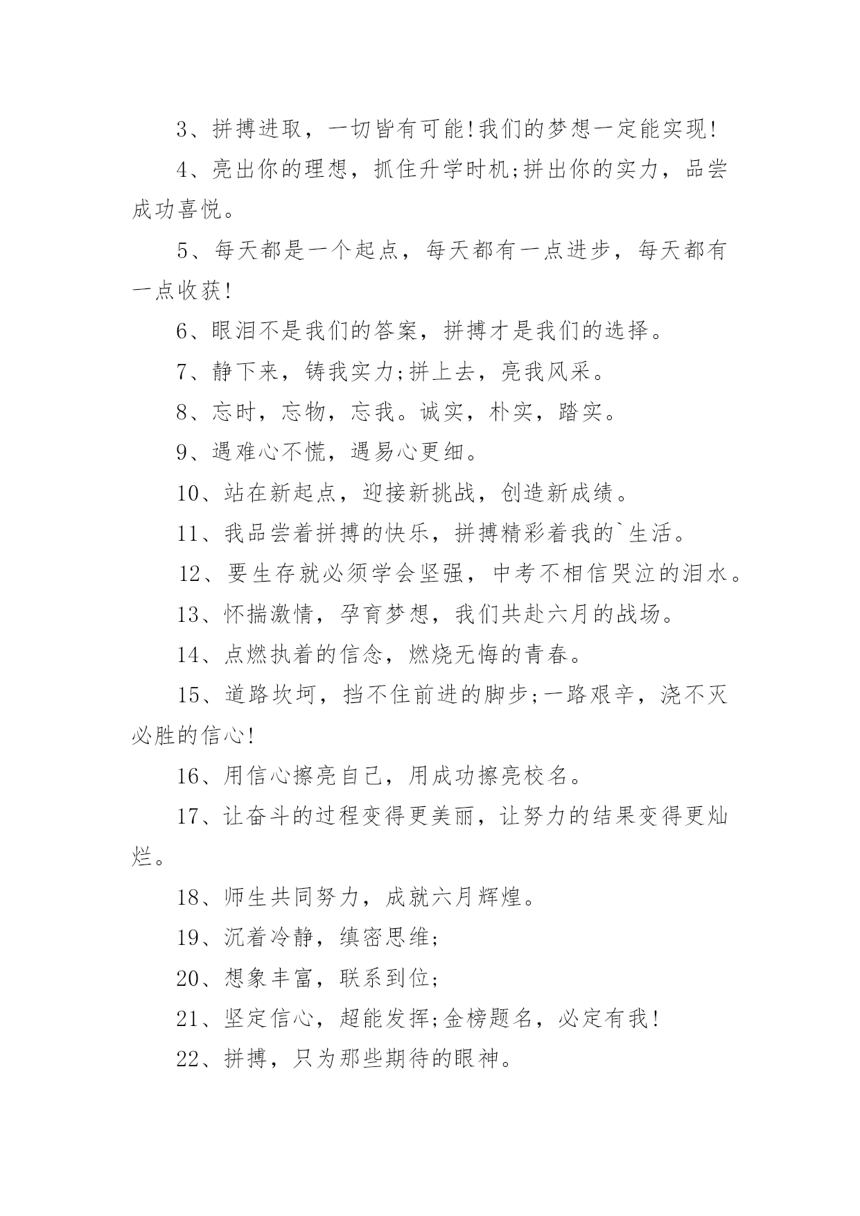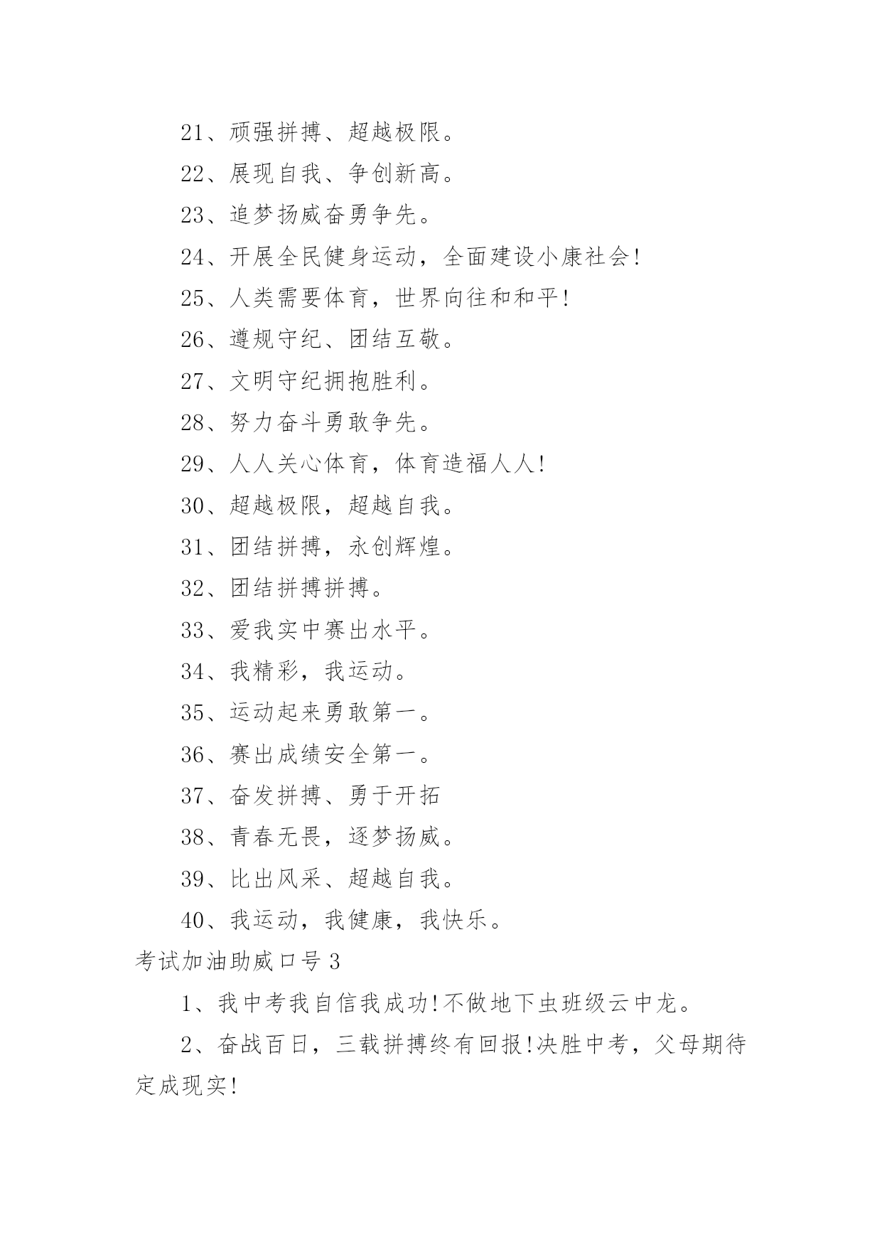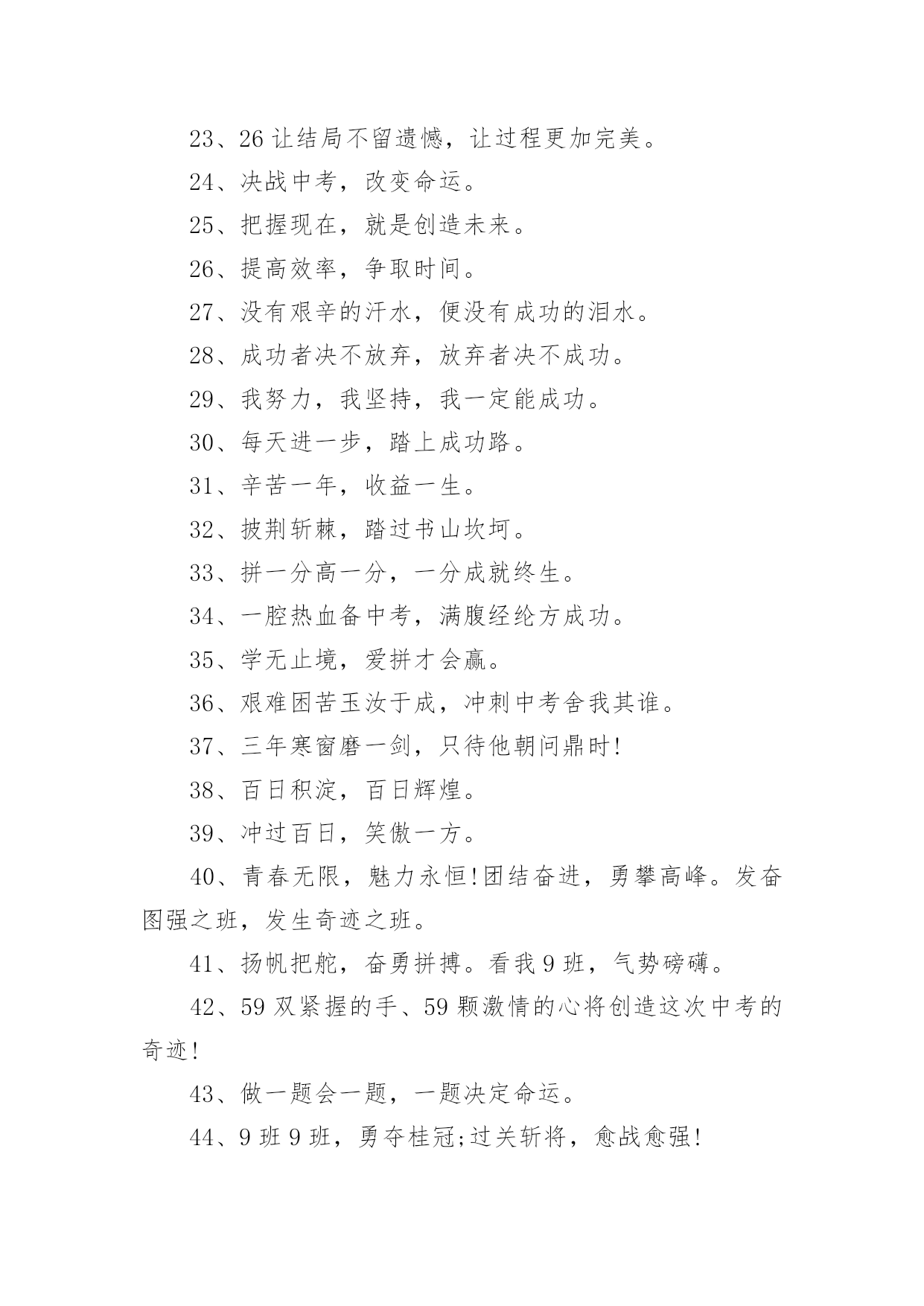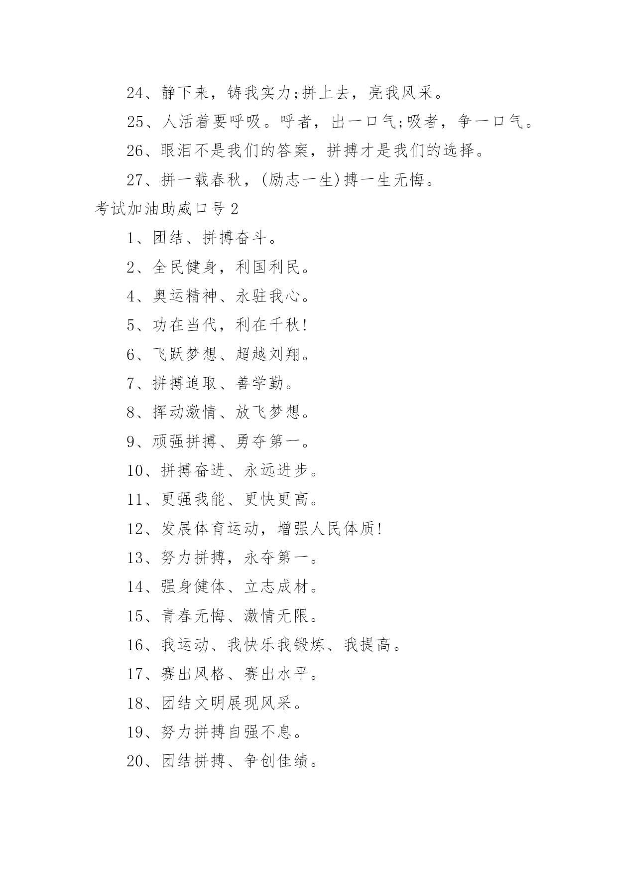 考试加油助威口号考试加油助威口号在日常学习、工作和生活中,大家都看到过口号吧,口号既有公文语体准确、简洁的特点,又有政论语体严谨性、鼓动性的特点。口号的类型多样,你所见过的口号是什么样的呢?以下是小编为大家整理的考试加油助威口号,仅供参考,希望能够帮助到大家。考试加油助威口号11、我中考我自信我成功!不做地下虫班级云中龙。2、奋战百日,三载拼搏终有回报!决胜中考,父母期待定成现实!3、拼搏进取,一切皆有可能!我们的梦想一定能实现!4、亮出你的理想,抓住升学时机;拼出你的实力,品尝成功喜悦。5、每天都是一个起点,每天都有一点进步,每天都有一点收获!6、眼泪不是我们的答案,拼搏才是我们的选择。7、静下来,铸我实力;拼上去,亮我风采。8、忘时,忘物,忘我。诚实,朴实,踏实。9、遇难心不慌,遇易心更细。10、站在新起点,迎接新挑战,创造新成绩。11、初三十一,所向披靡,奋战百天,共创佳绩!12、咬定学习不放松,立根原在努力中。千磨万击还奋斗,任尔20xx中考风!13、今天所做之事勿候明天,自己所做之事勿候他人。14、我品尝着拼搏的快乐,拼搏精彩着我的生活。15、要生存就必须学会坚强,中考不相信哭泣的泪水。16、怀揣激情,孕育梦想,我们共赴六月的战场。17、点燃执着的信念,燃烧无悔的青春。18、道路坎坷,挡不住前进的脚步;一路艰辛,浇不灭必胜的'信心!19、用信心擦亮自己,用成功擦亮校名。20、让奋斗的过程变得更美丽,让努力的结果变得更灿烂。21、师生共同努力,成就六月辉煌。22、沉着冷静,缜密思维;23、想象丰富,联系到位;24、坚定信心,超能发挥;金榜题名,必定有我!25、拼搏,只为那些期待的眼神。26让结局不留遗憾,让过程更加完美。27、决战中考,改变命运。28、把握现在,就是创造未来。29、提高效率,争取时间。30、没有艰辛的汗水,便没有成功的泪水。31、成功者决不放弃,放弃者决不成功。32、我努力,我坚持,我一定能成功。33、每天进一步,踏上成功路。34、辛苦一年,收益一生。35、披荆斩棘,踏过书山坎坷。36、拼一分高一分,一分成就终生。34、一腔热血备中考,满腹经纶方成功。35、学无止境,爱拼才会赢。36、艰难困苦玉汝于成,冲刺中考舍我其谁。37、三年寒窗磨一剑,只待他朝问鼎时!38、百日积淀,百日辉煌。39、冲过百日,笑傲一方。40、青春无限,魅力永恒!团结奋进,勇攀高峰。发奋图强之班,发生奇迹之班。41、扬帆把舵,奋勇拼搏。看我9班,气势磅礴。42、59双紧握的手、59颗激情的心将创造这次中考的奇迹!43、做一题会一题,一题决定命运。44、9班9班,勇夺桂冠;过关斩将,愈战愈强!45、努力拼搏磨砺意志,团结友爱坚持到底。46、9班必胜,永不落后,向前奋战,鹤立鸡群。47、超越梦想,展翅高飞一班无敌,秒杀同级;齐心协力,永创佳绩。48、要成功,先发疯,下定决心往前冲!49、拧成一股绳,搏尽一份力,狠下一条心,共圆一个梦。50、贵在坚持、难在坚持、成在坚持。51、挑战极限,超越自我,上下齐心,背水一战!52、凤起舞,龙飞扬,我们二班就是强;测也好,考也好,二班大旗永不倒!53、脚踏实地山让路,持之以恒海可移,师生协力铸辉煌,奋力拼搏创奇迹!54、三年磨剑为一得,六月试锋现真我,曾经沧海难为水,还看今朝终须搏!55、十年磨剑,励志凌绝顶;百日竞渡,破浪展雄风!56、中考硝烟战场,成绩辉煌无疆,初三六班,意志更坚,备战中考,无悔初三!57、初三七班,中考备战,努力是帆,理想是船,冲向彼岸,定能夺冠!58、八班八班,不鸣则已,一鸣惊人!59、初三九班,豪气冲天,傲然挺立,成功之巅,壮志雄心,百日争先,同舟共济,勇往直前!60、九年磨砺此剑,百日小试牛刀,志存高远,一飞冲天,初三十班,当仁不让,育华之光,永创辉煌!1、健康是基础,勤奋是前提,方法是关键,优秀学风是条件,良好心理是保证。2、信心来自实力,实力来自勤奋。最困难的时候,也是离成功不远的时候。3、勇攀书山逐群雄实现心中梦想。4、泛游学海定乾坤赢得似锦前程。5、惜光阴百日犹短,细安排一刻也长。6、平日从严,高考坦然。7、脚踏实地,珍惜分秒。紧跟老师,夯实基础。8、拼一分高一分,一分成就终生。9、做一题会一题,一题决定命运。10、贵在坚持、难在坚持、成在坚持11、不苦不累,高三无味;不拼不搏,等于白活。12、忘时,忘物,忘我。诚实,朴实,踏实。13、遇难心不慌,遇易心更细。14、每天都是一个起点,每天都有一点进步,每天都有一点收获!15、要成功,先发疯,下定决心往前冲!16、站在新起点,迎接新挑战,创造新成绩。17、摒弃侥幸之念,必取百炼成钢;厚积分秒之功,始得一鸣惊人。18、抢时间,抓基础,勤演练定有收获;树自信,誓拼搏,升大学回报父母。19、披星戴月时书香盈耳含英咀华建